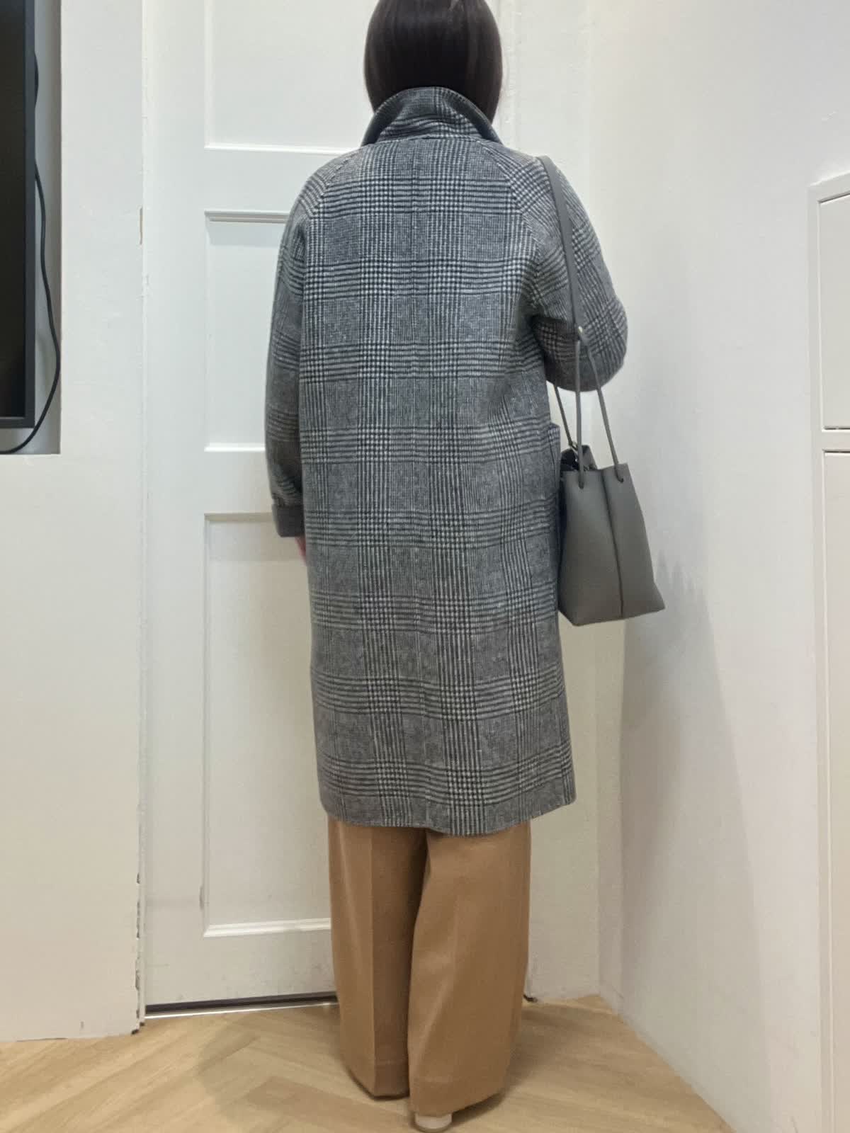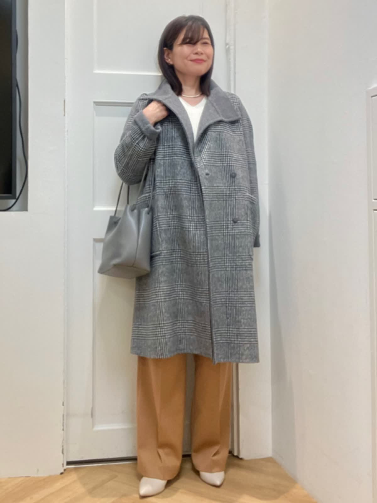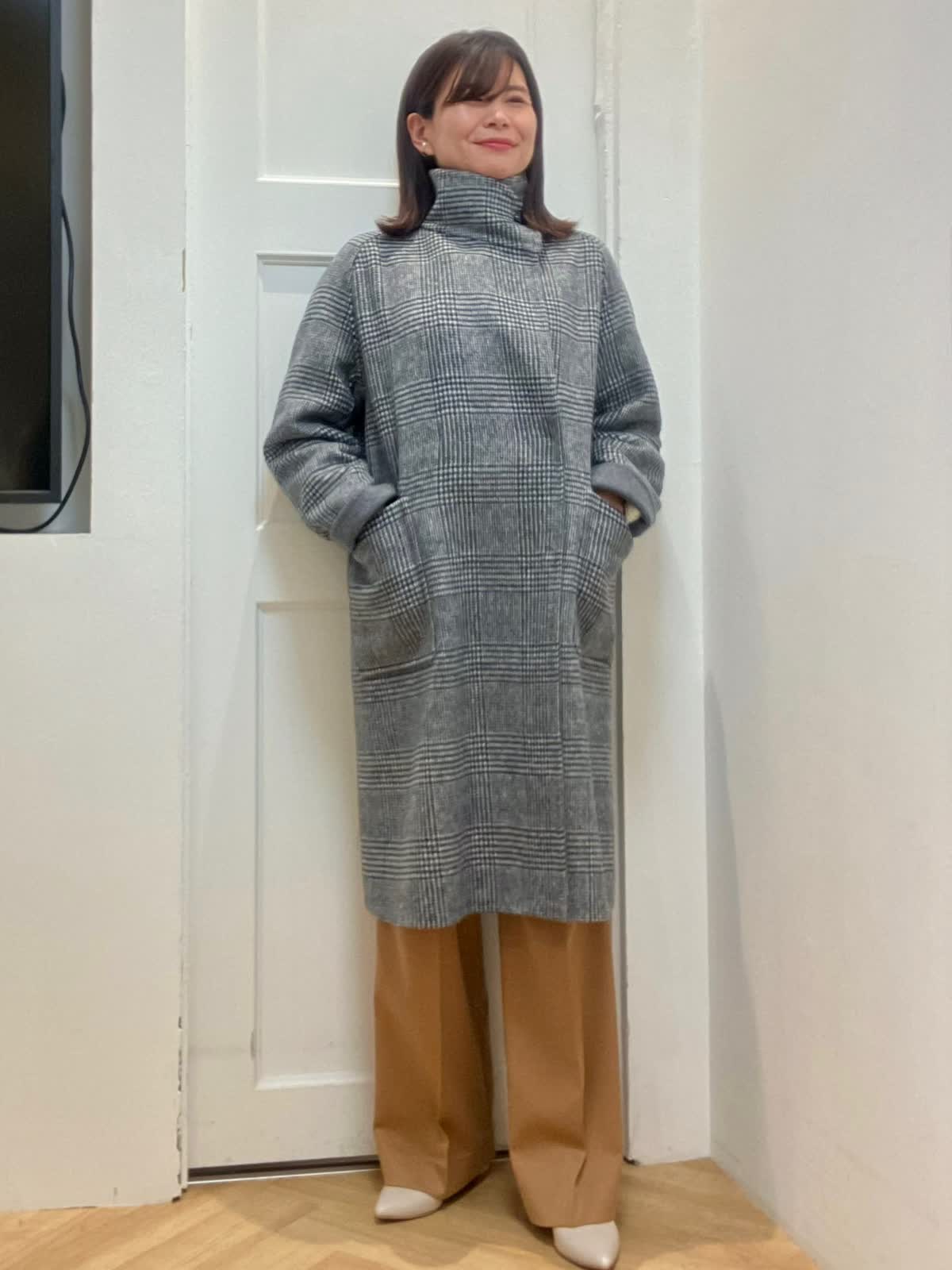 【着用サイズ】全て9号 【着用カラー】コート:チャコールグレー ニット:オフホワイト パンツ:キャメル コートはリバー仕立てでとにかく軽い着心地!チェックは内側がグレー単色なので、開けた時や袖口を折り返してもポイントになります。 ニットは柔らかい着心地で、Vネックと編み模様でゆとりがありながらもスッキリ見えします。 パンツは裏地無しでも安心のほどよい厚みの素材感。ツータックと落ち感もあり、美脚シルエットです。