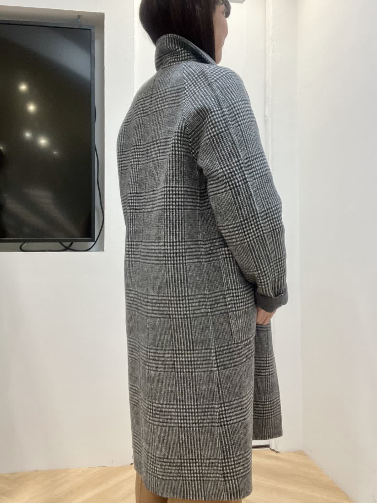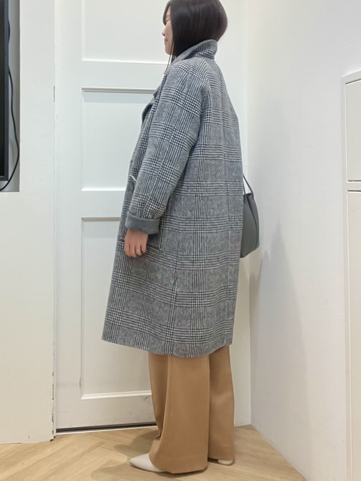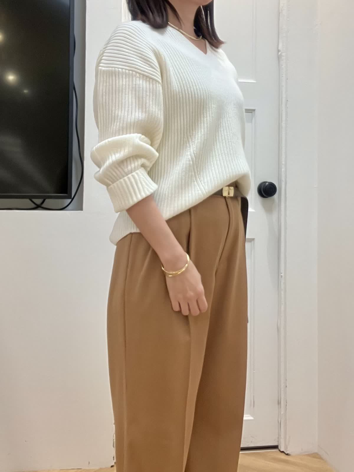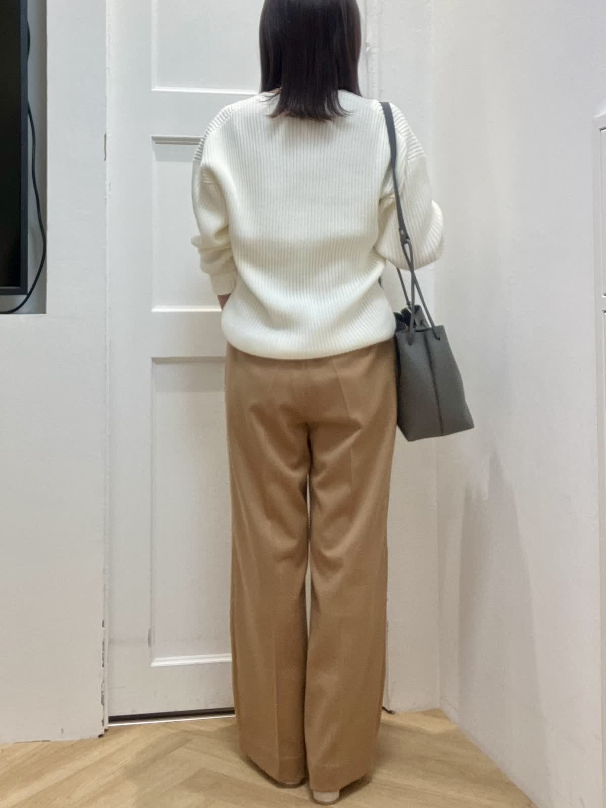 【着用サイズ】全て9号 【着用カラー】コート:チャコールグレー ニット:オフホワイト パンツ:キャメル コートはリバー仕立てでとにかく軽い着心地!チェックは内側がグレー単色なので、開けた時や袖口を折り返してもポイントになります。 ニットは柔らかい着心地で、Vネックと編み模様でゆとりがありながらもスッキリ見えします。 パンツは裏地無しでも安心のほどよい厚みの素材感。ツータックと落ち感もあり、美脚シルエットです。