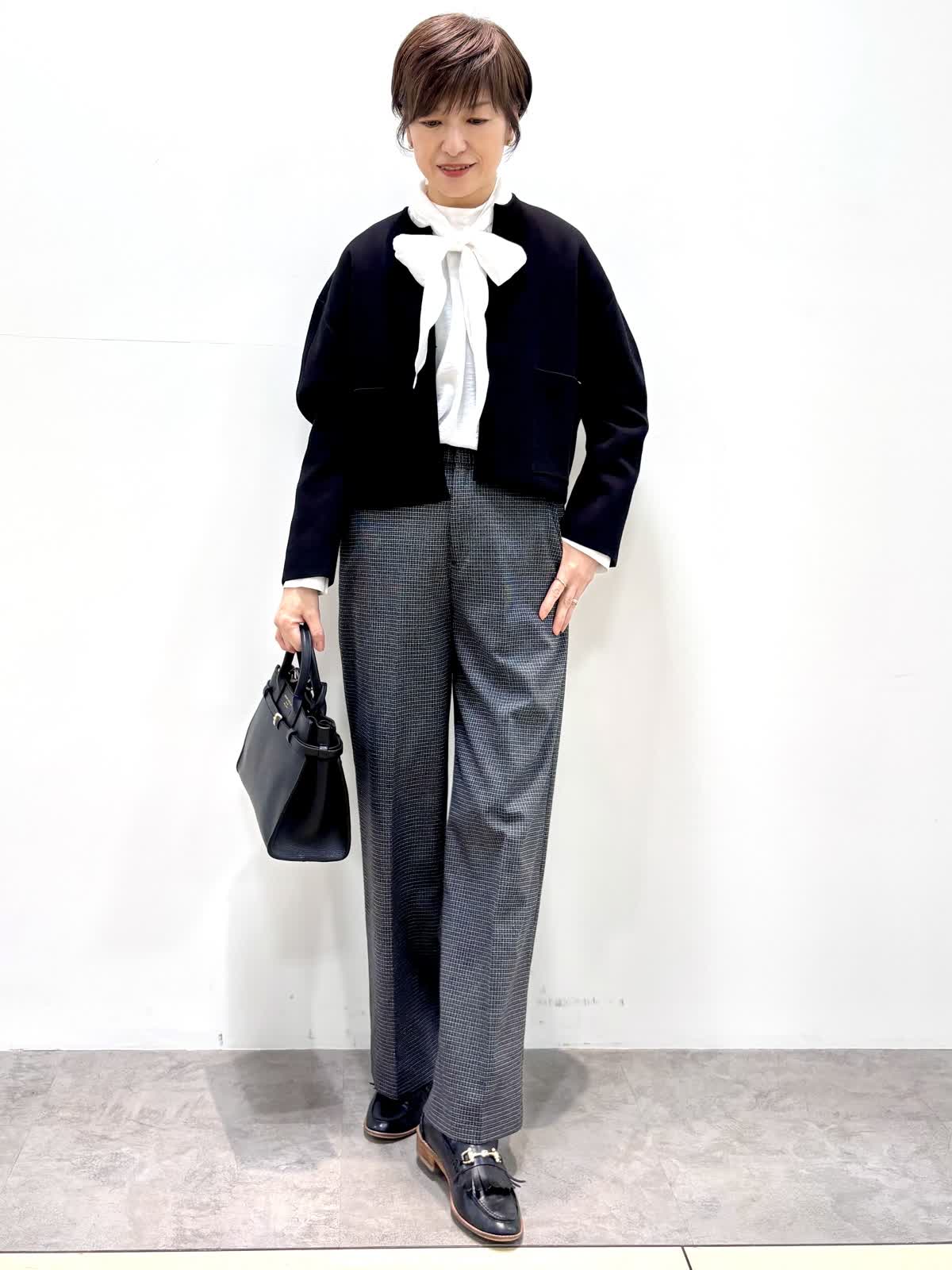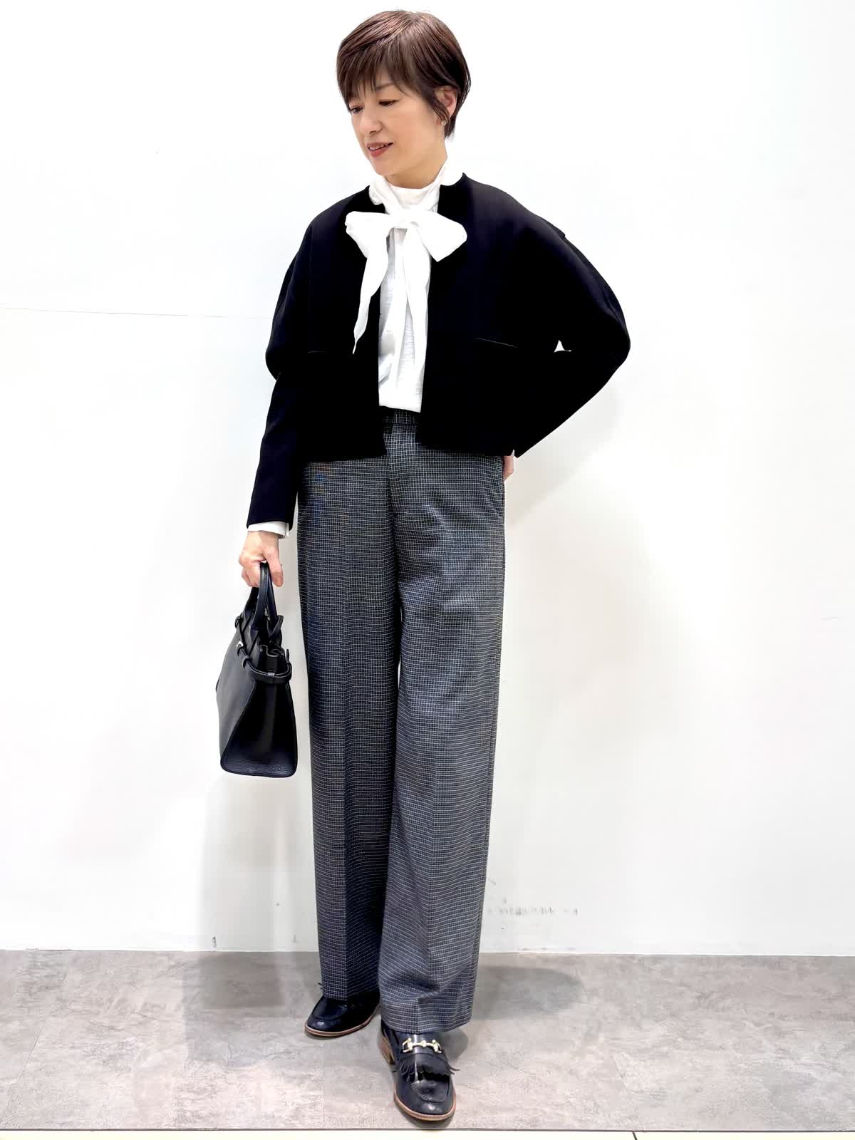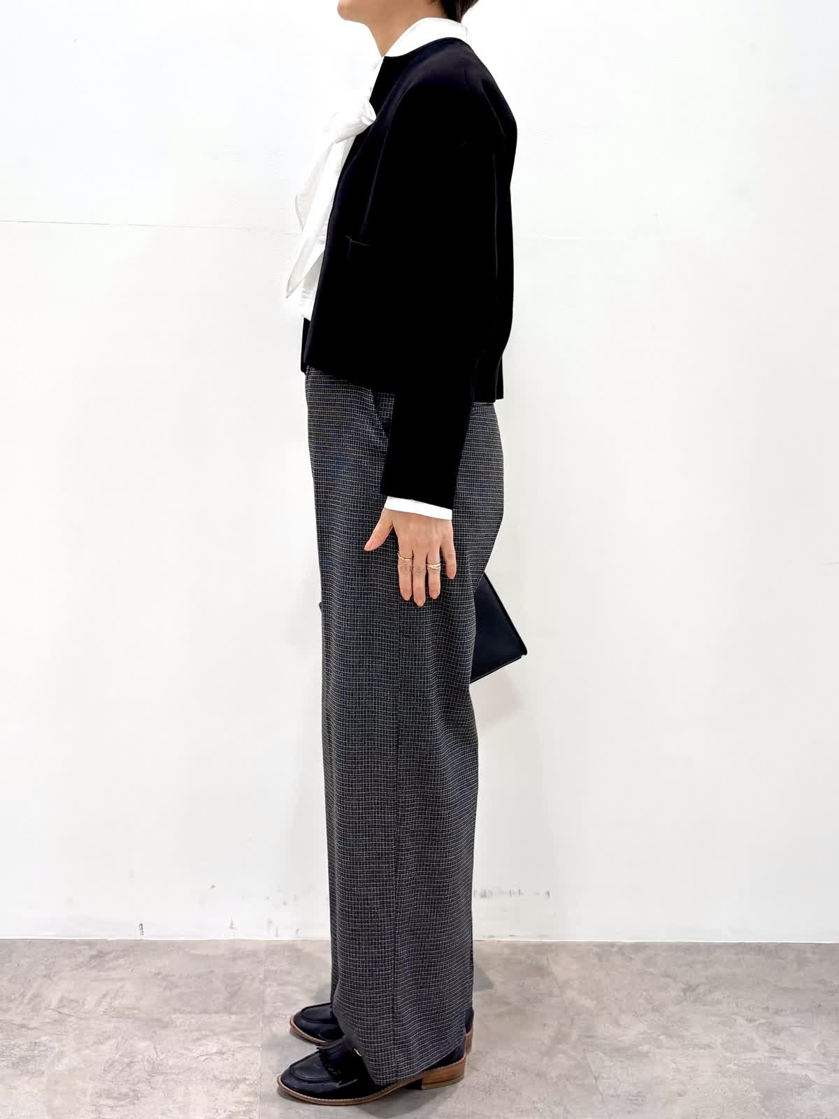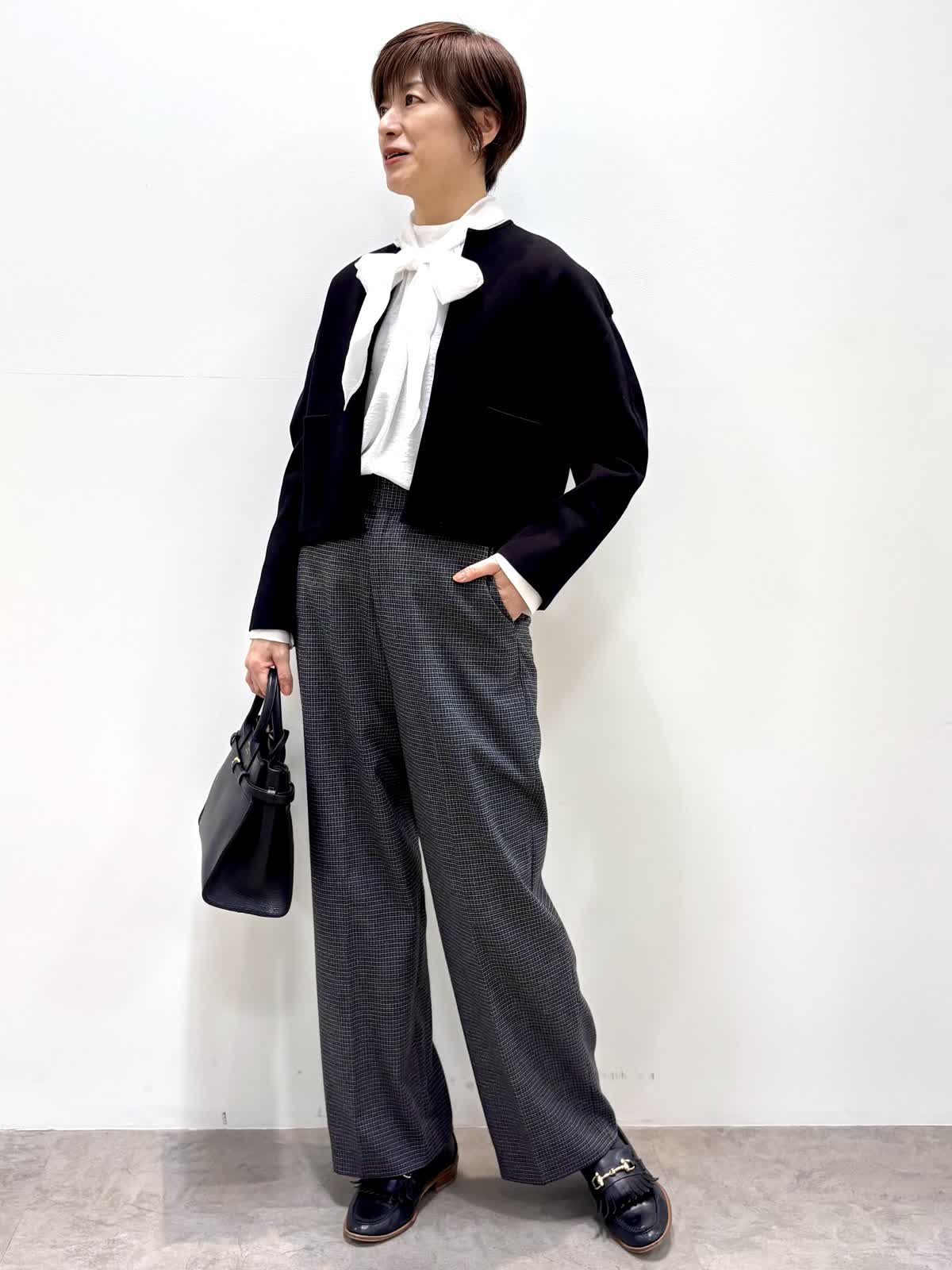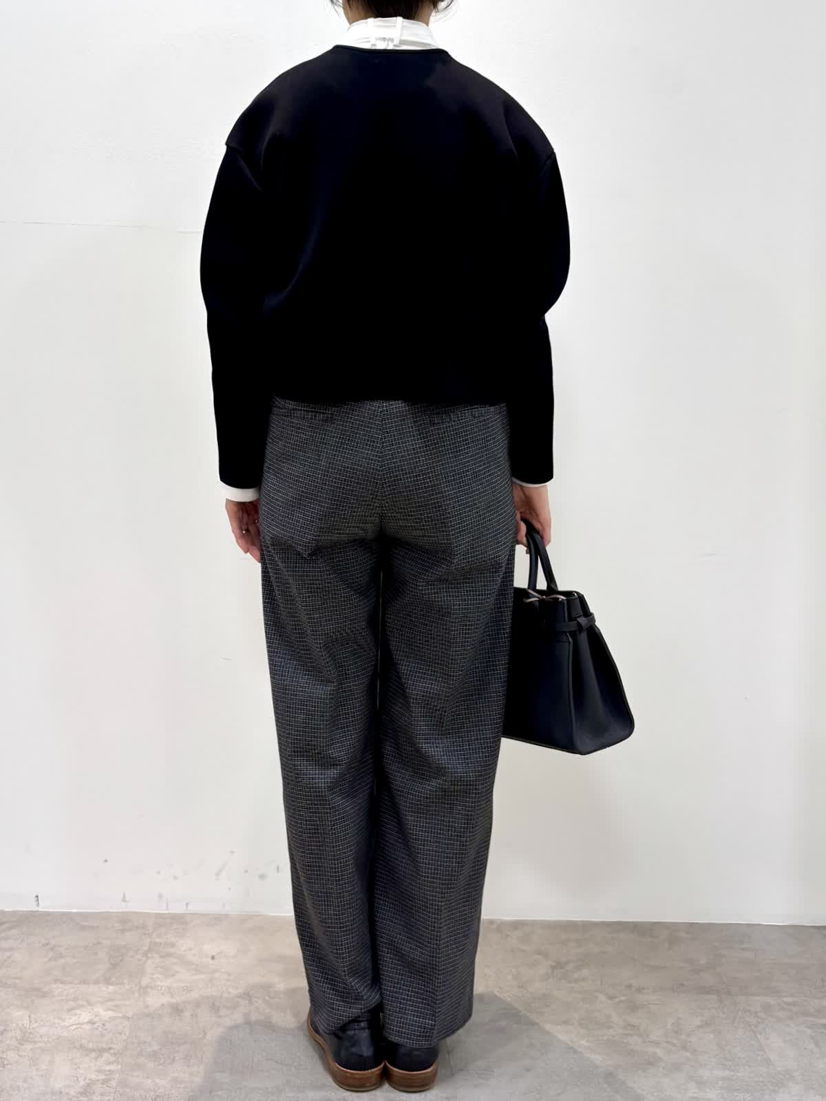 [着用サイズ]ニット:フリー ブラウス:9号 パンツ:9号 [着用カラー]ニット:ブラック ブラウス:ホワイト パンツ:チェック ミラノリブのカーディガンジャケットはサラッとした肌触りで着やすいです。立体的なフォルムでジャケットのようなキチっと感もあり季節の変わり目に重宝します。 ウールのような温かみのあるパンツはポリエステルレーヨンの素材でお手入れも簡単です。冬のワードローブに欠かせない1枚です。