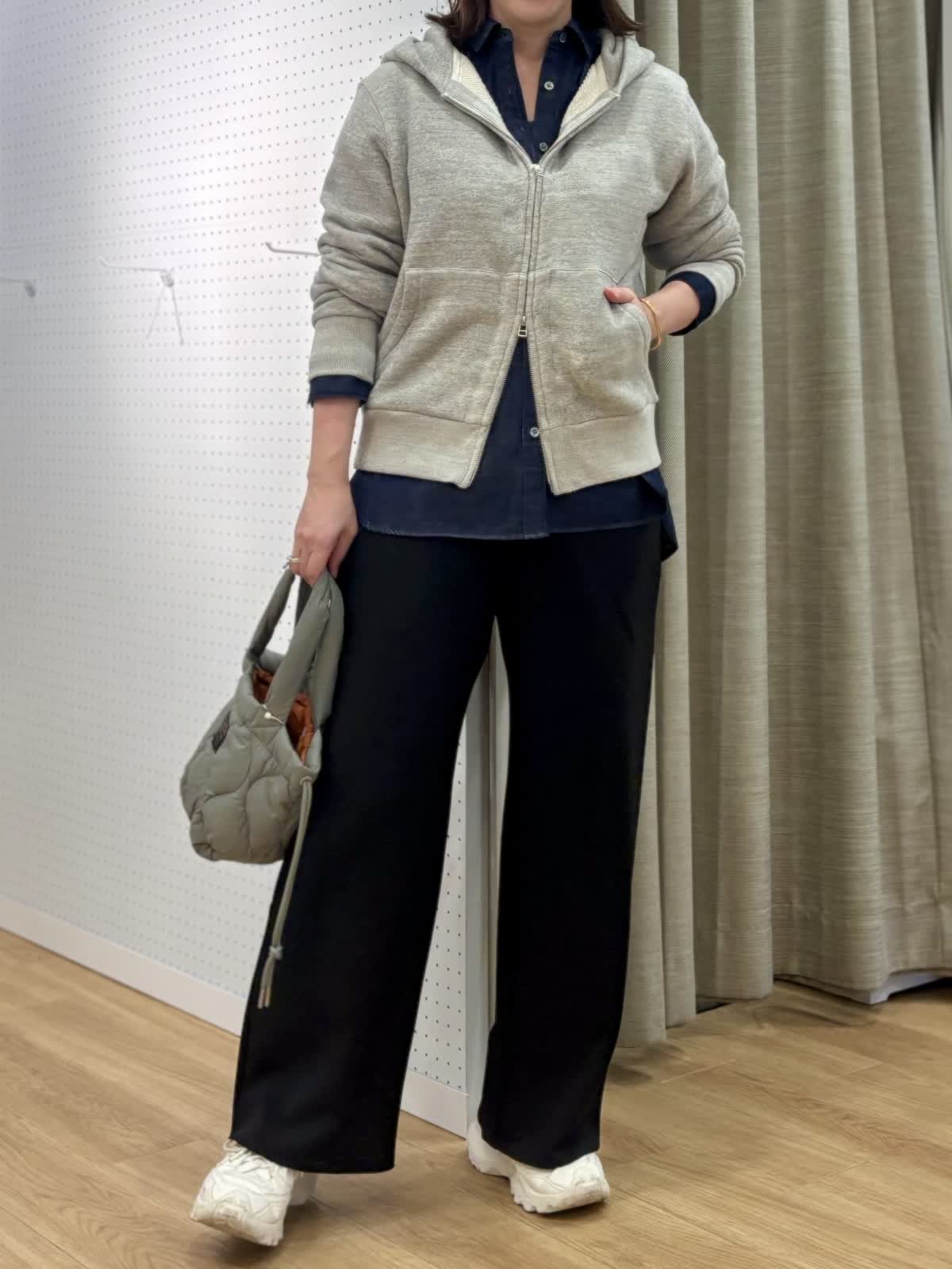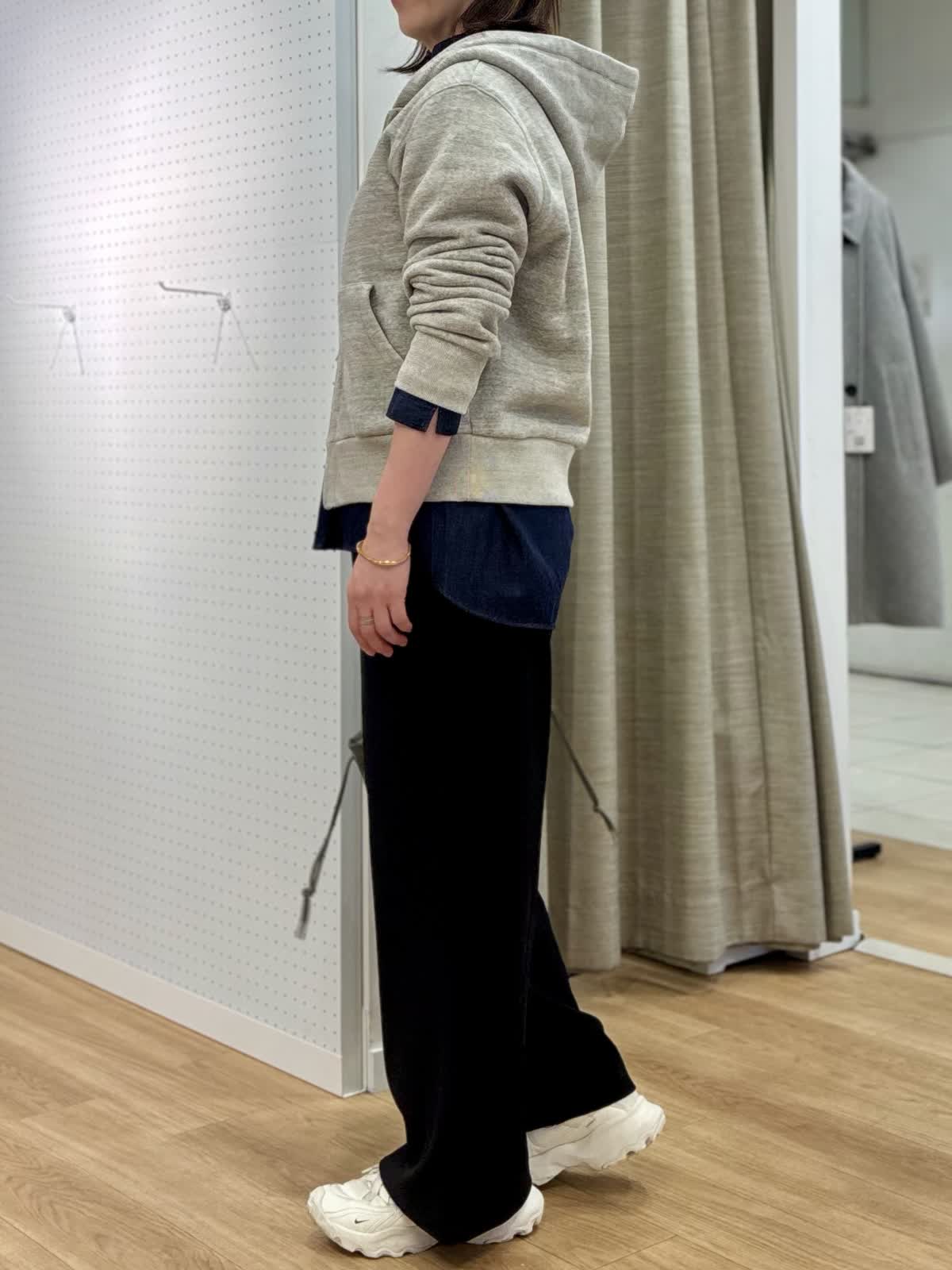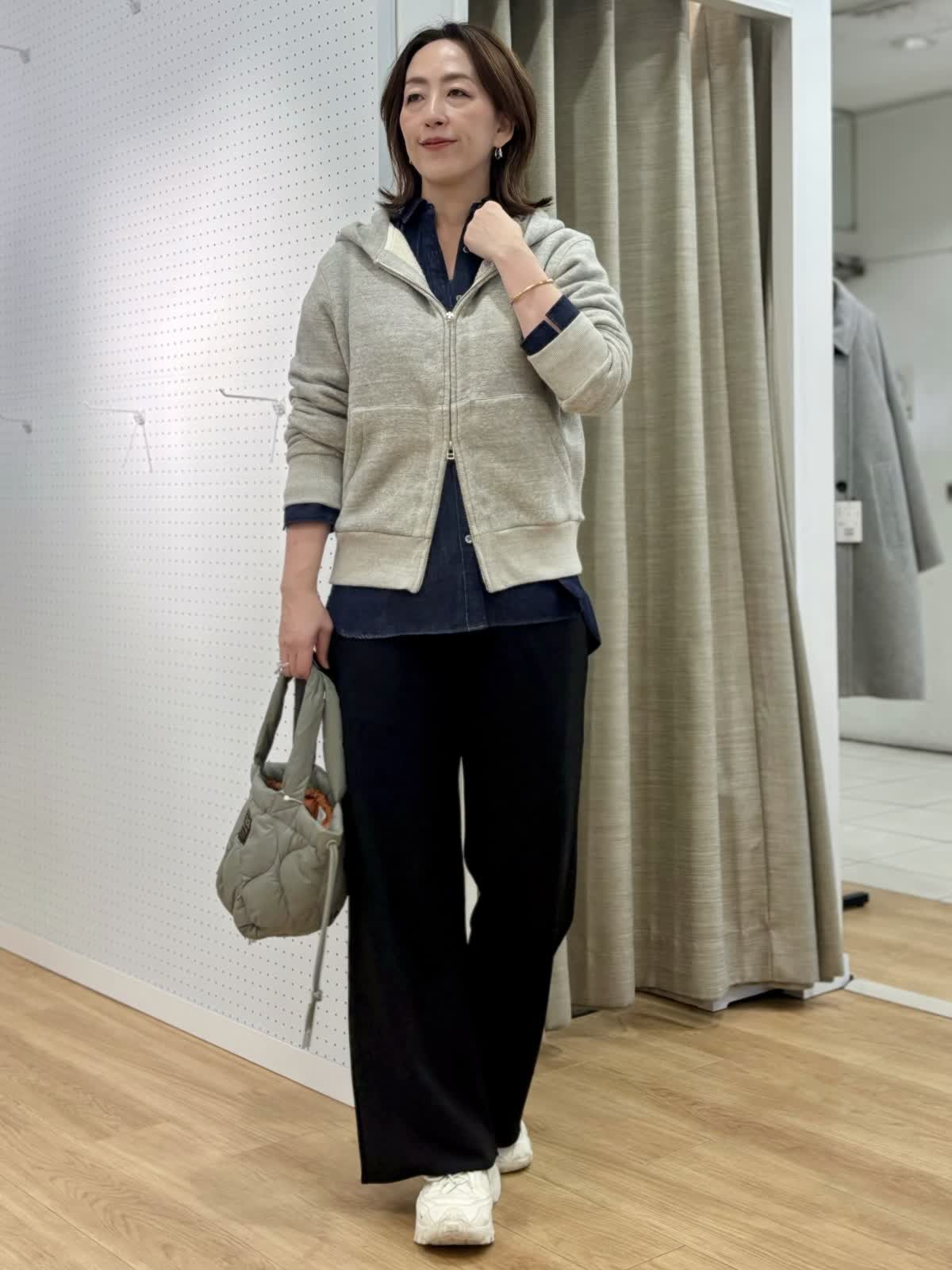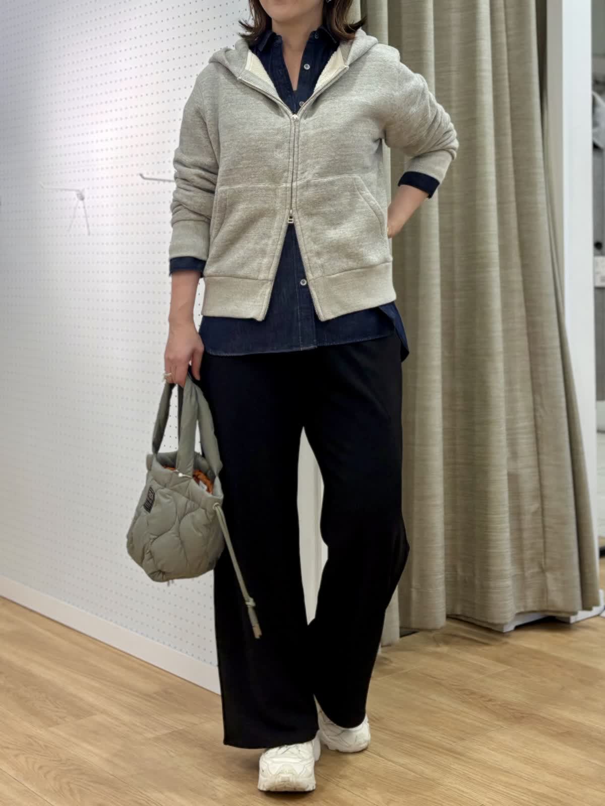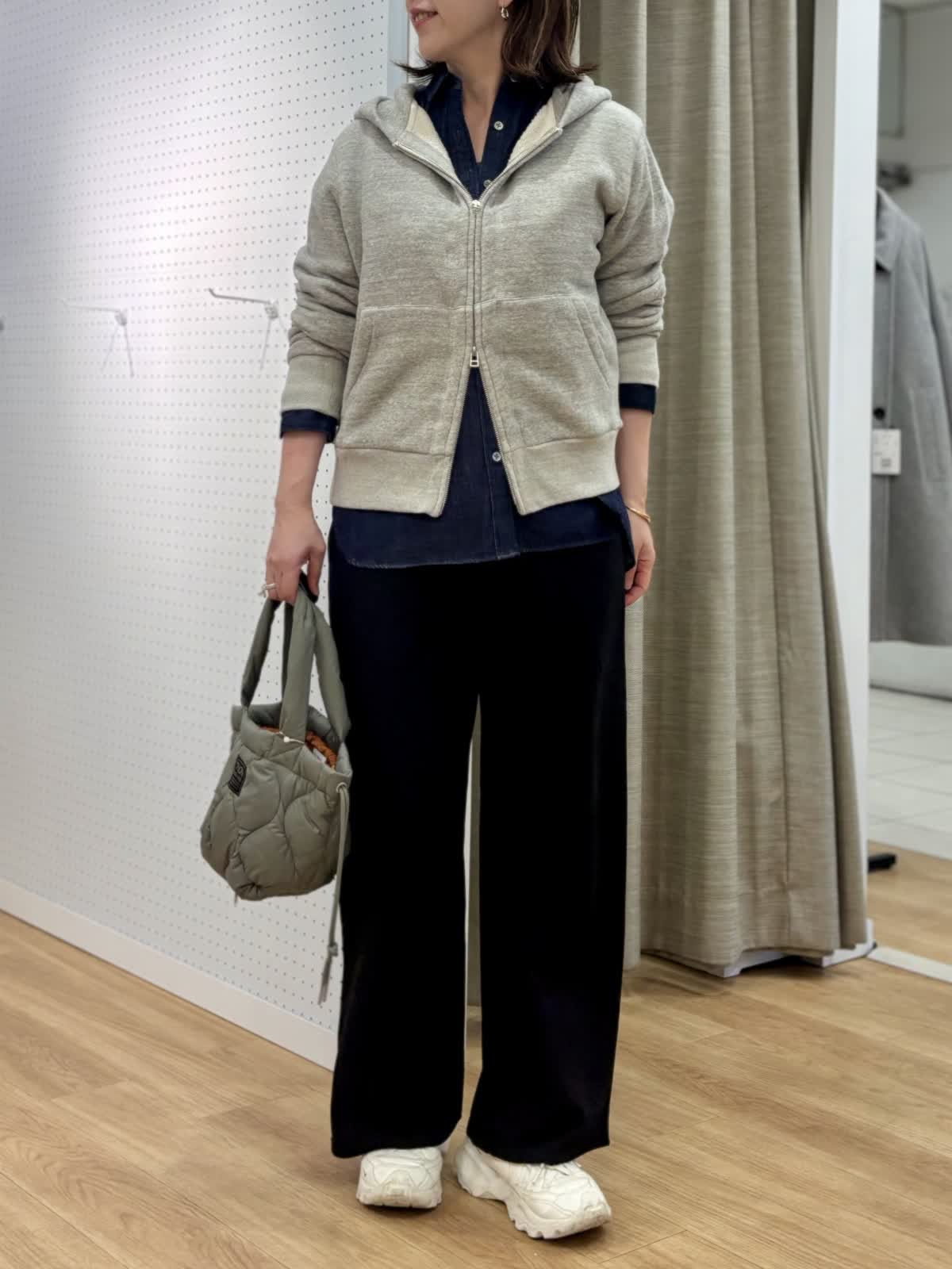 【着用カラー/サイズ】 パーカー:グレー/11号 シャツ:インディゴ/フリー パンツ:ブラック/フリー ご近所散歩コーデ。着心地も120%のパーカーは1時間に1Mしか編まない機械で作られたスローヴィンテージの拘りの1着です。ふわふわもちもちしていて柔らかいだけじゃなく真冬でもコットン100%でも薄手のモノと重ねるだけでも非常に暖かさもあり優秀です。インディゴのデニムシャツは重ねても羽織りにしても使えて万能です。反応染めデニムという色落ちしずらい方法で作られているので擦れても安心です。