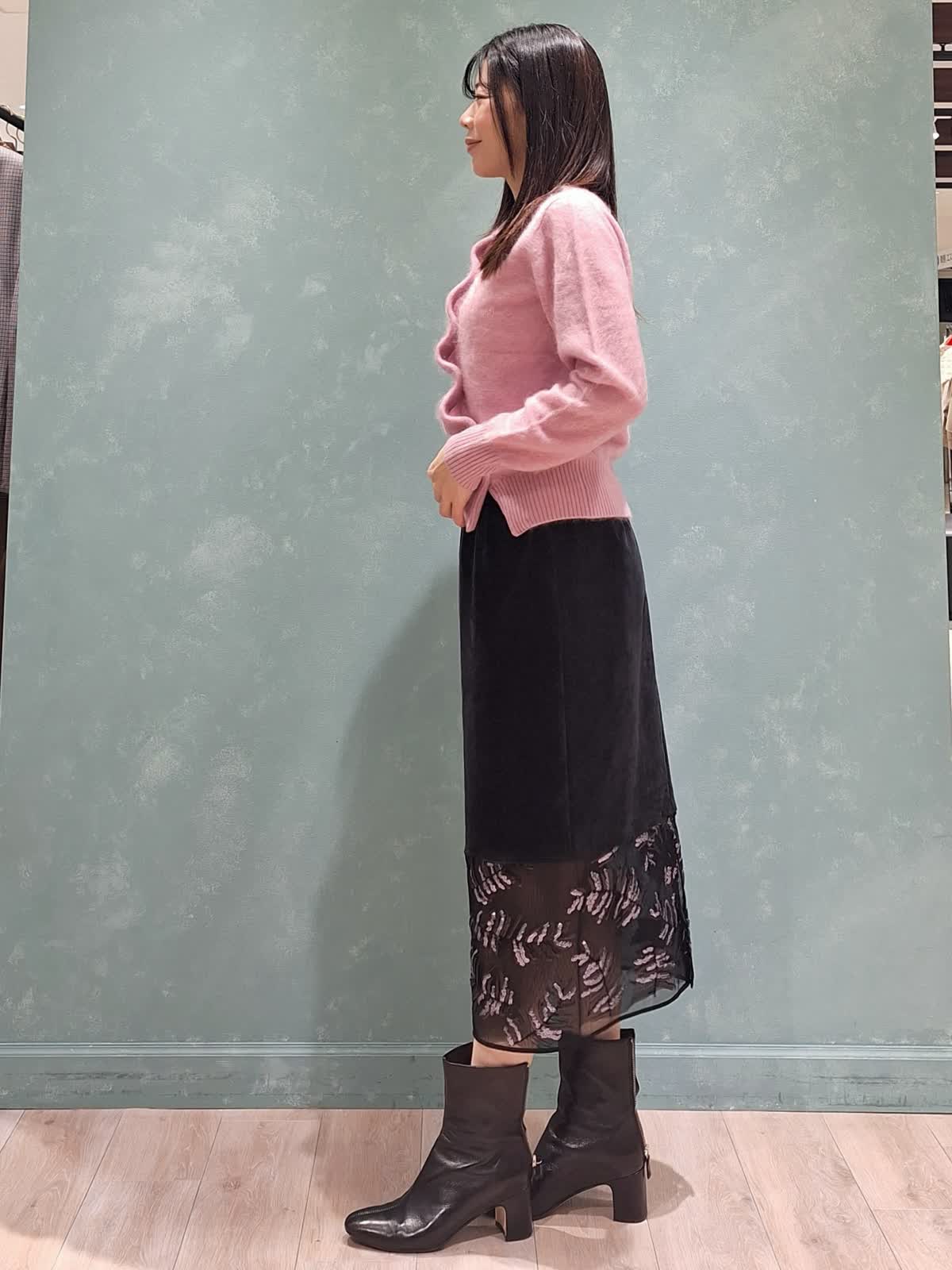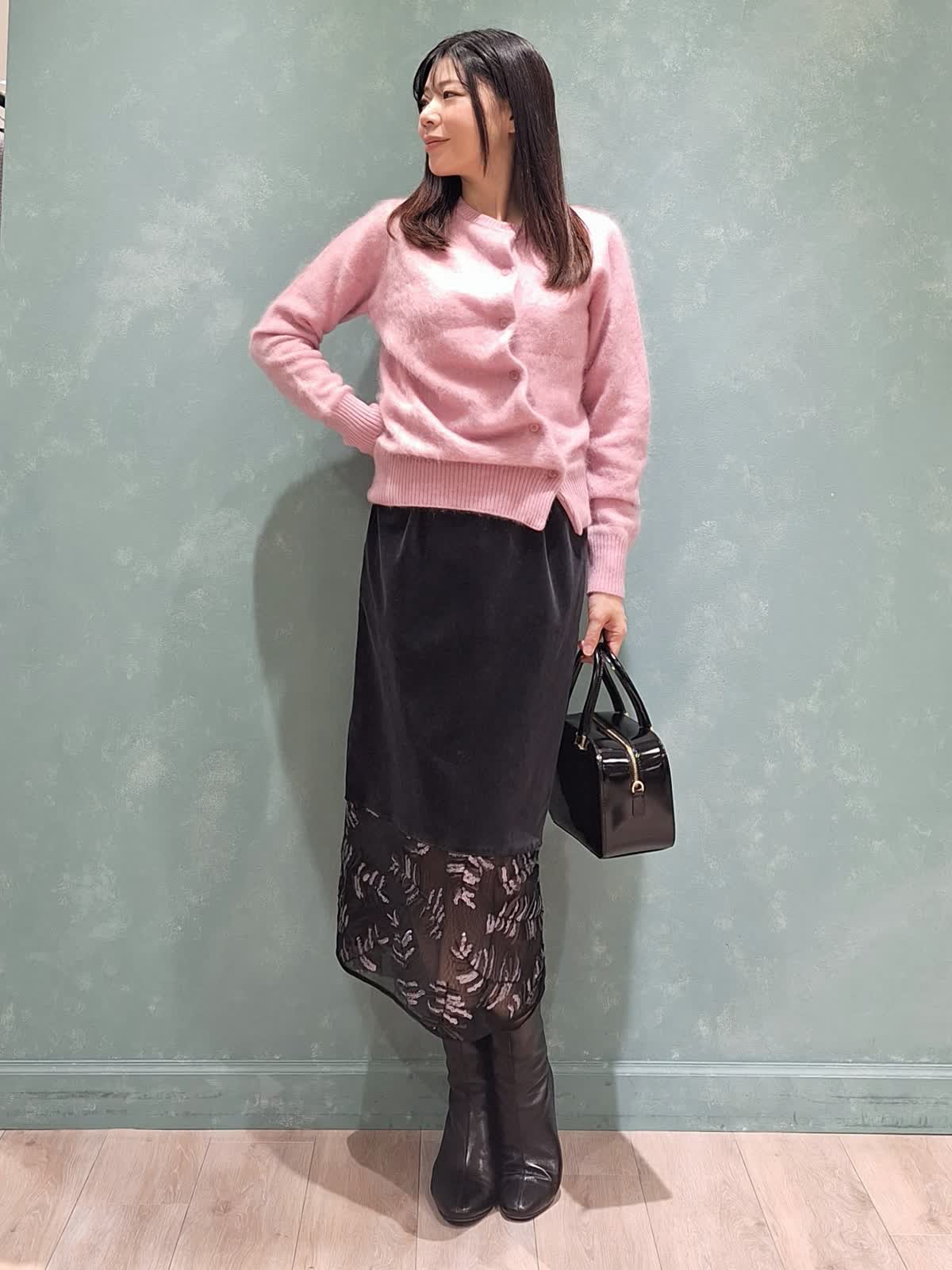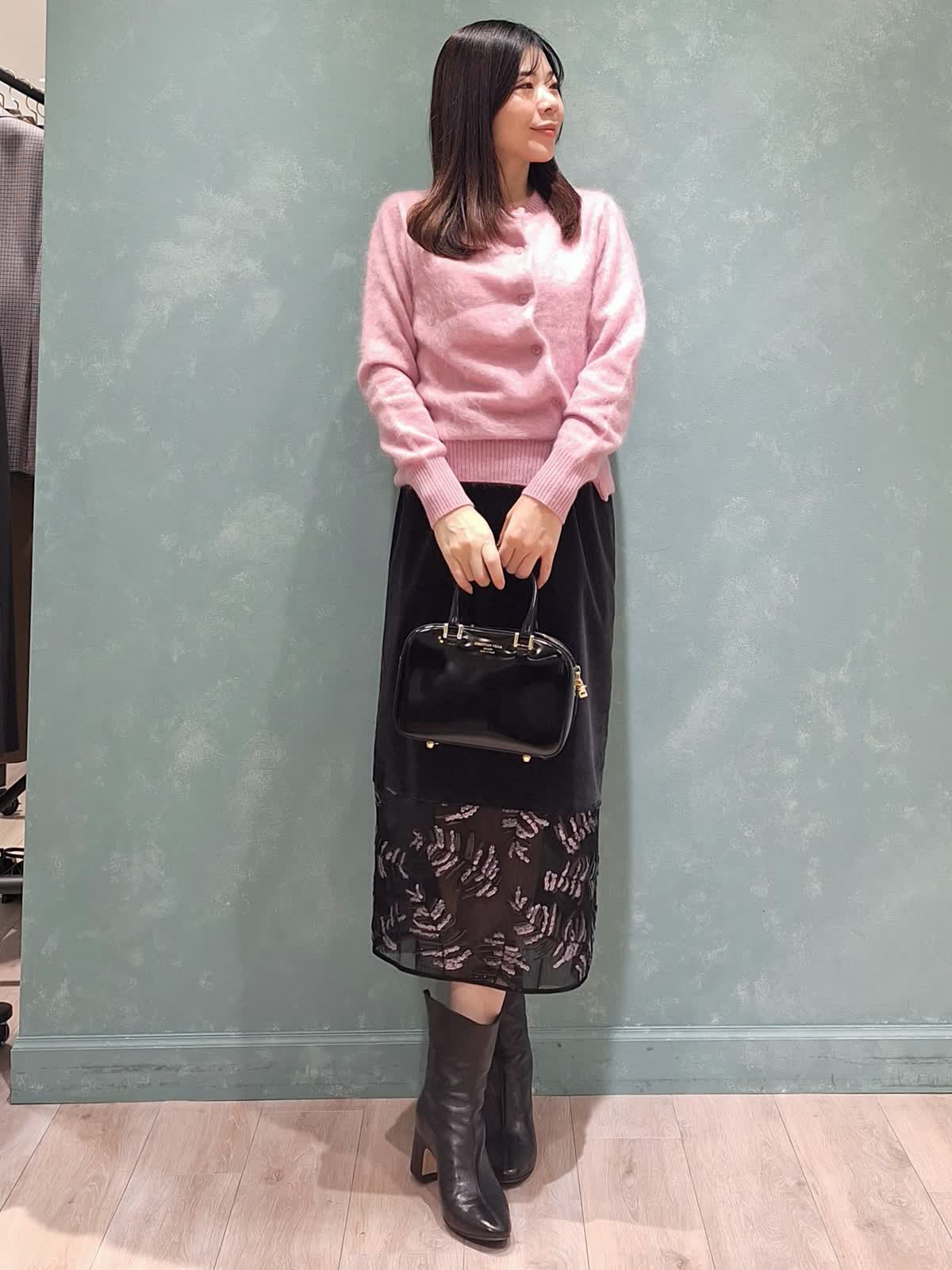【着用サイズ、カラー】カーディガン:9号、ピンク スカート:7号、ブラック トップスはla veilleのカシミヤアシンメトリーカーディガン。ドレイプ感がでるボタンの位置がお洒落ポイント?カシミヤ100%の編地にファー加工を施しふわふわな質感で高級感があり優しい雰囲気でお召しいただけます。もちろん着心地も最高です!ボトムは、la veilleのベルベットスカート。裾のチュールにスパンコール刺繍が施されたお洒落デザイン♪タイトシルエットで女性らしくお召しいただけます。バックにはスリットがあり、足さばきも問題なし。ウエストはグログランゴム仕様で伸び感がありラクな着心地です。ちょっと気合いを入れたデートや女子会にお勧めのコーディネートです。