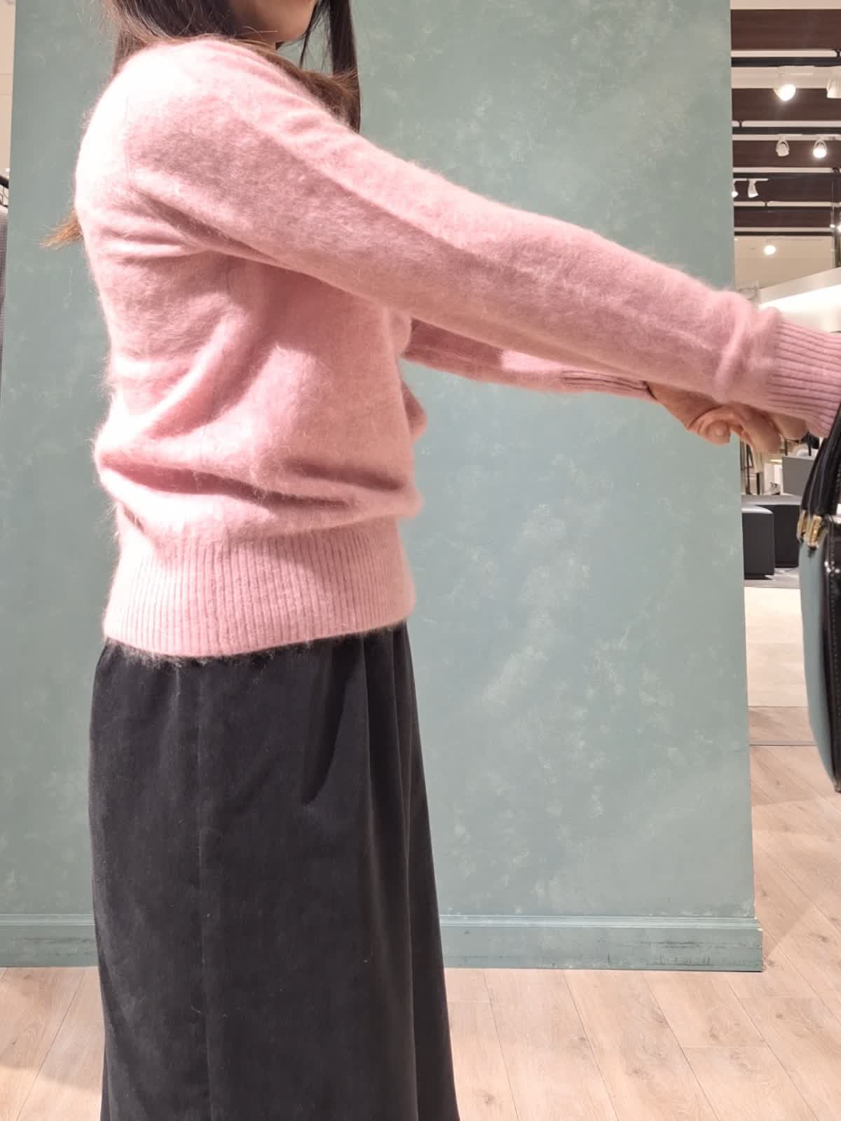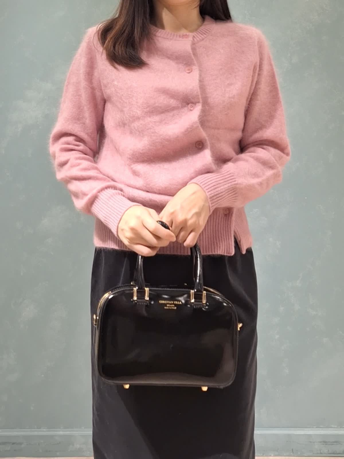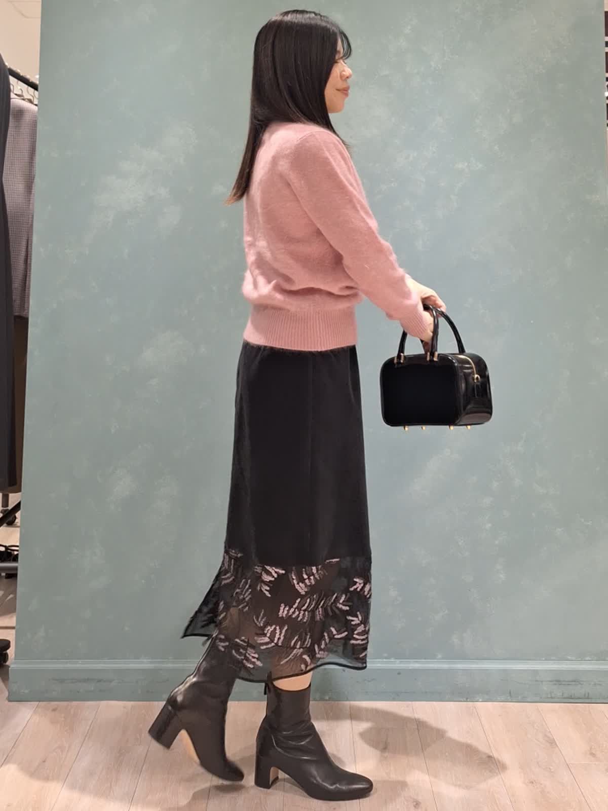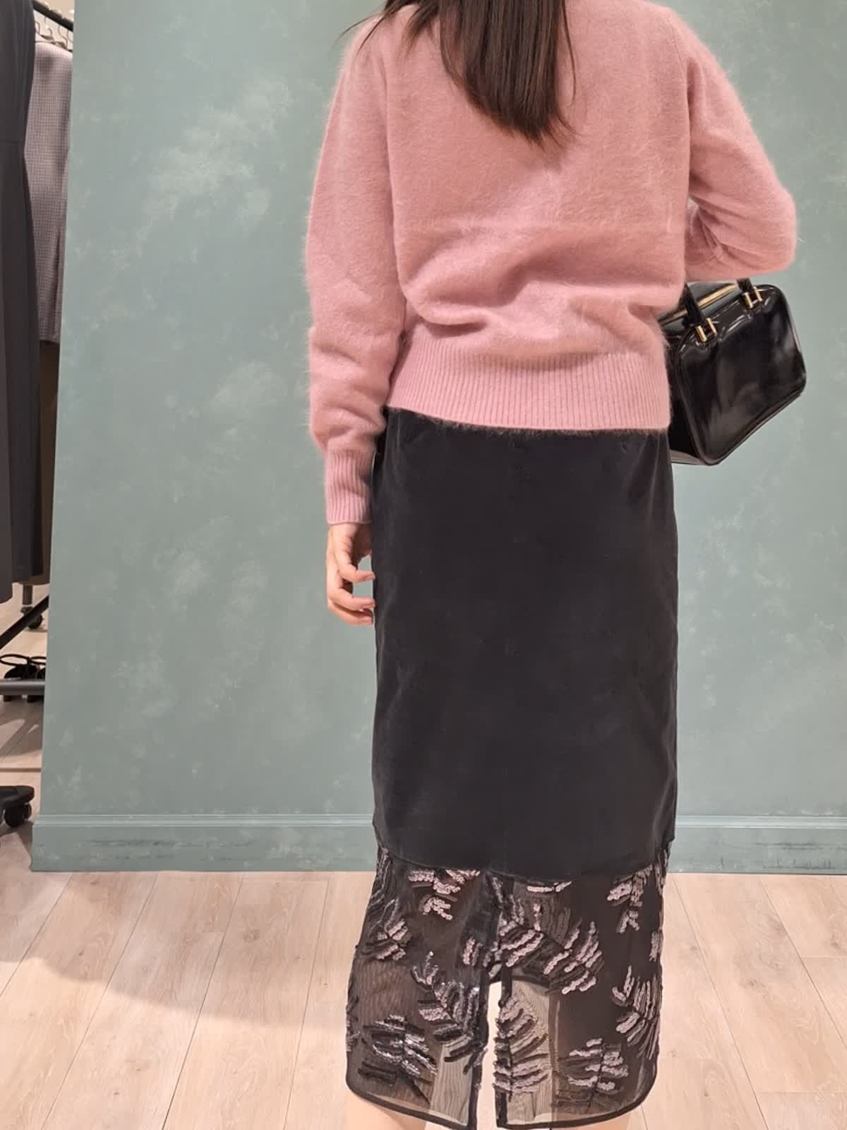 【着用サイズ、カラー】カーディガン:9号、ピンク スカート:7号、ブラック トップスはla veilleのカシミヤアシンメトリーカーディガン。ドレイプ感がでるボタンの位置がお洒落ポイント?カシミヤ100%の編地にファー加工を施しふわふわな質感で高級感があり優しい雰囲気でお召しいただけます。もちろん着心地も最高です!ボトムは、la veilleのベルベットスカート。裾のチュールにスパンコール刺繍が施されたお洒落デザイン♪タイトシルエットで女性らしくお召しいただけます。バックにはスリットがあり、足さばきも問題なし。ウエストはグログランゴム仕様で伸び感がありラクな着心地です。ちょっと気合いを入れたデートや女子会にお勧めのコーディネートです。