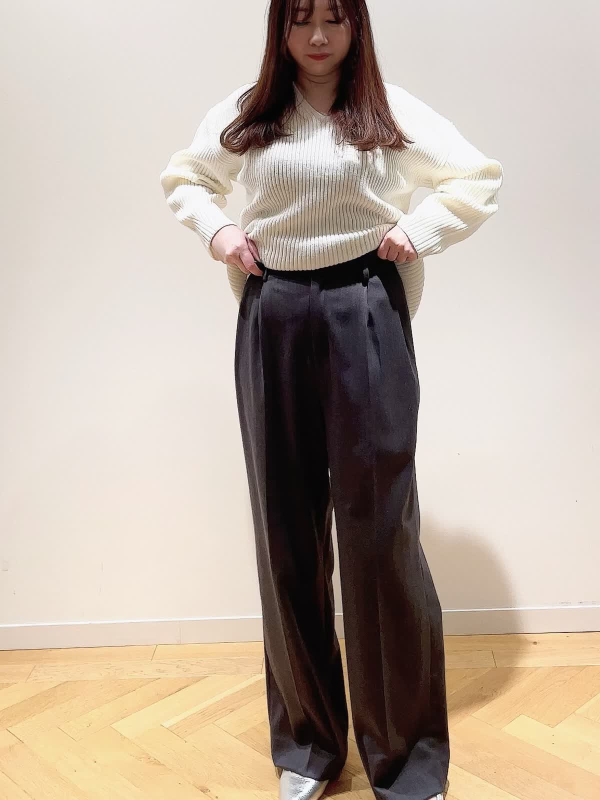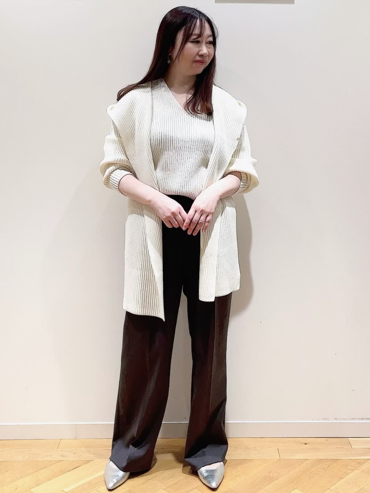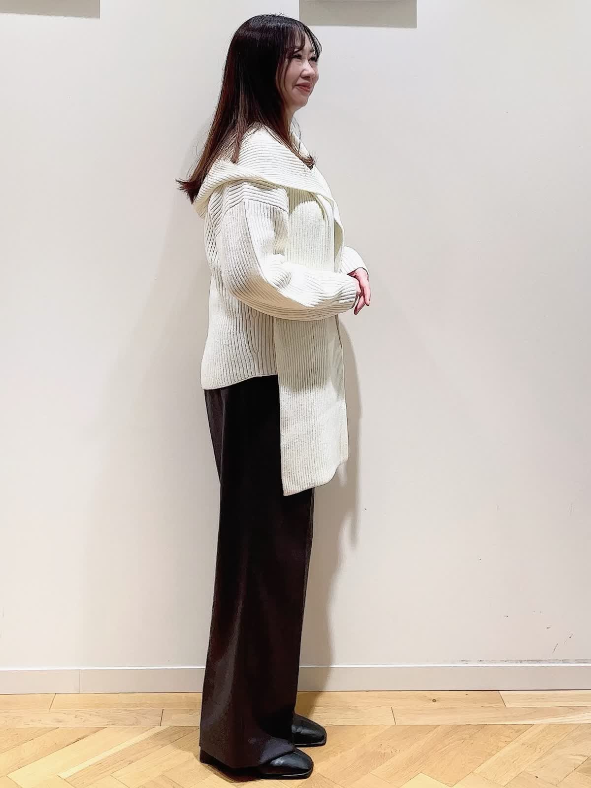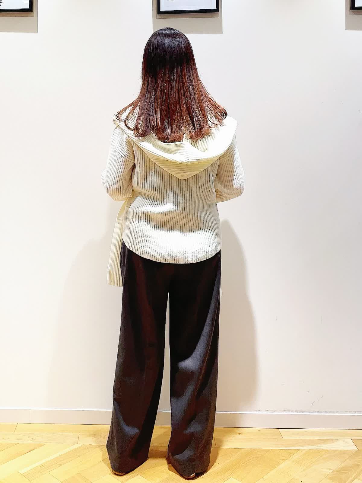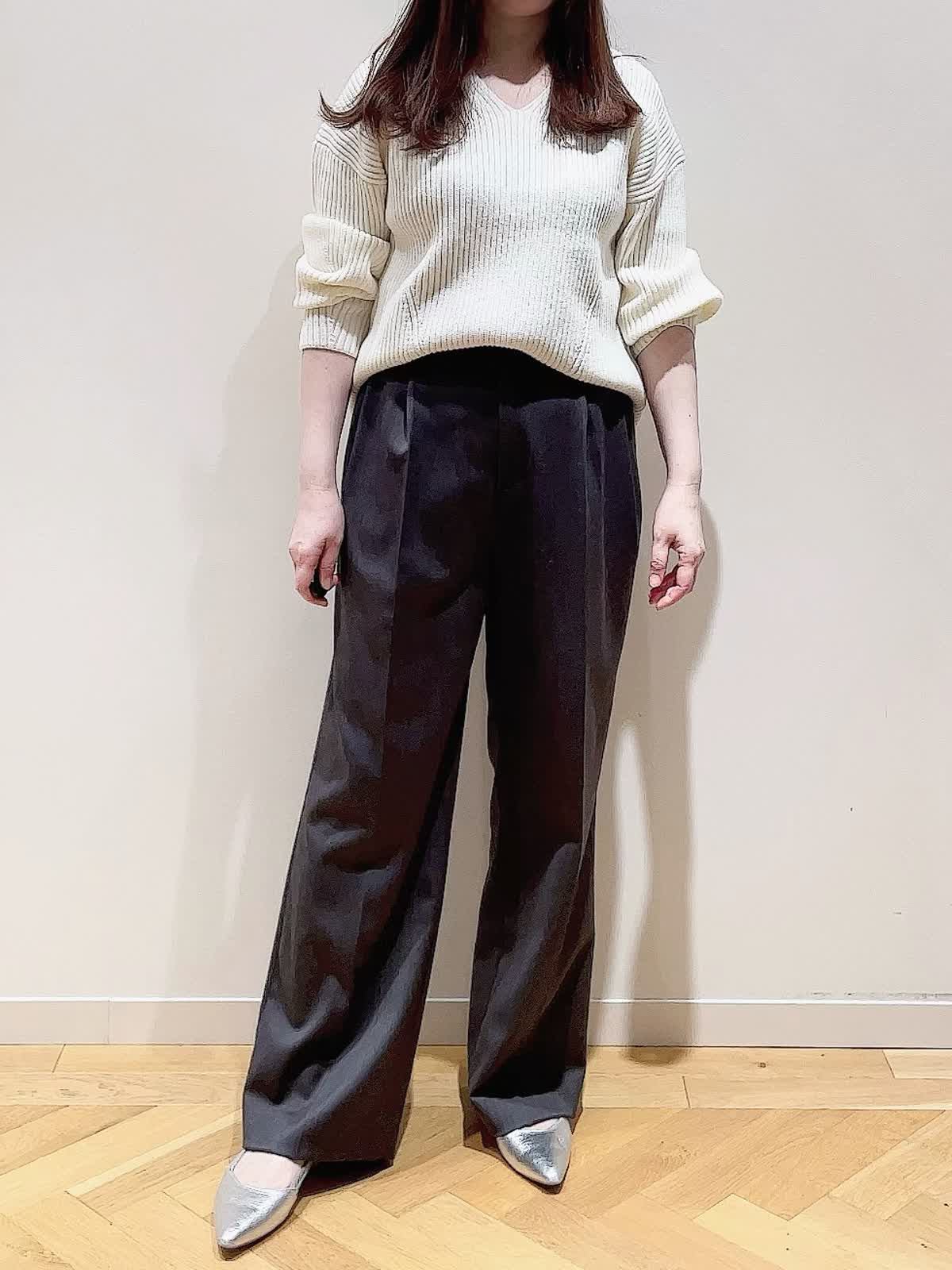【着用サイズ】全て9号【着用カラー】ニット:オフホワイト マフラー:オフホワイト パンツ:チャコールグレー シンプルVネックニットに同素材のフーデットマフラーを合わせた休日スタイルです。マフラーを合わせるだけでコーディネートのアクセントに。ジレ風に羽織ったり寒い時は首に巻いても◎ニットはデコルテが綺麗に見えるVネック。ややゆったり目のサイズでアウトでもフロントインでもバランスのいい着丈です。パンツはタック入りのセミワイドシルエット。フラットシューズでもスッキリ見えて美脚が叶います。少し光沢がありお仕事でもスニーカーあわせでカジュアルにも使える万能のパンツです。