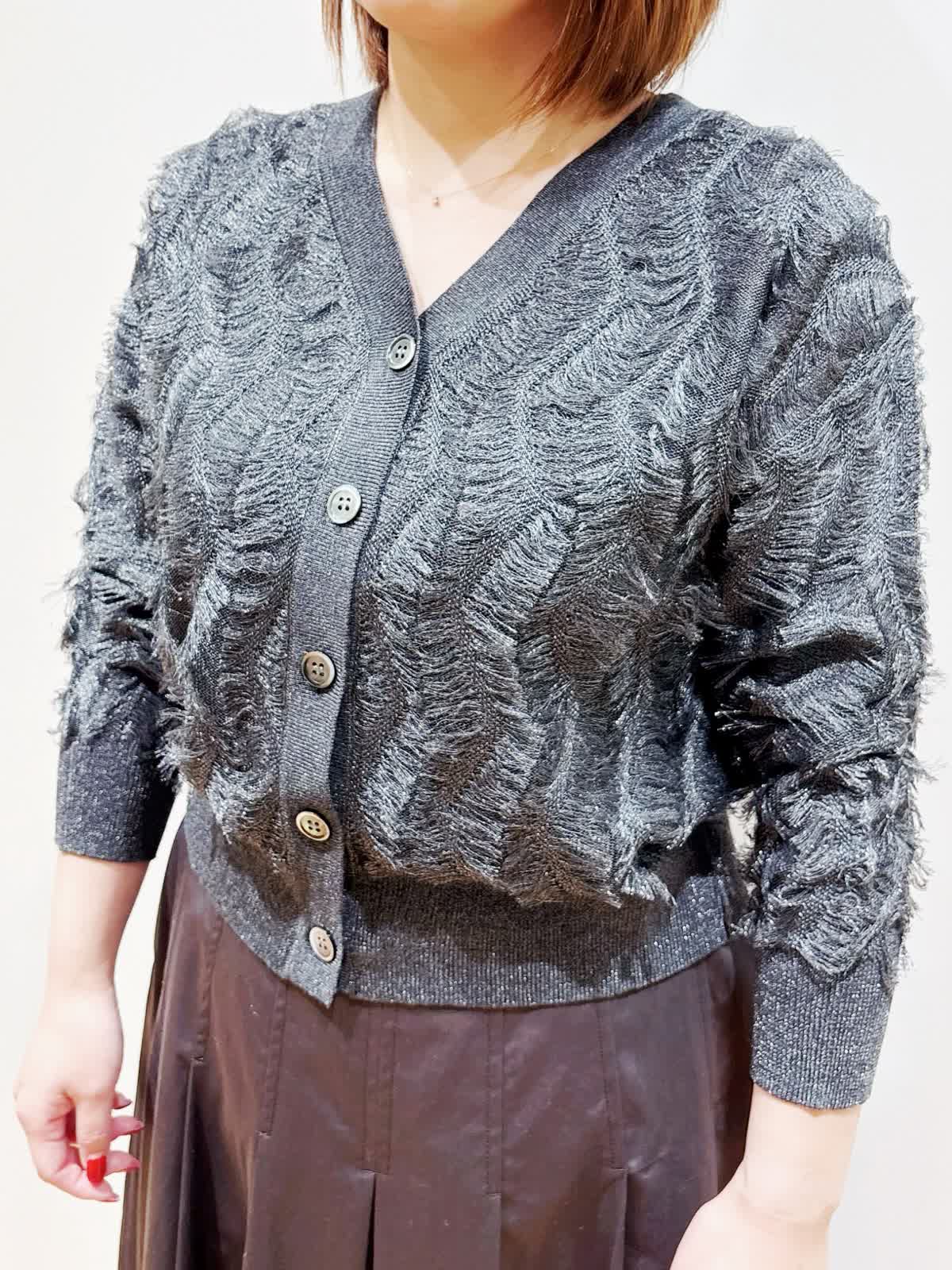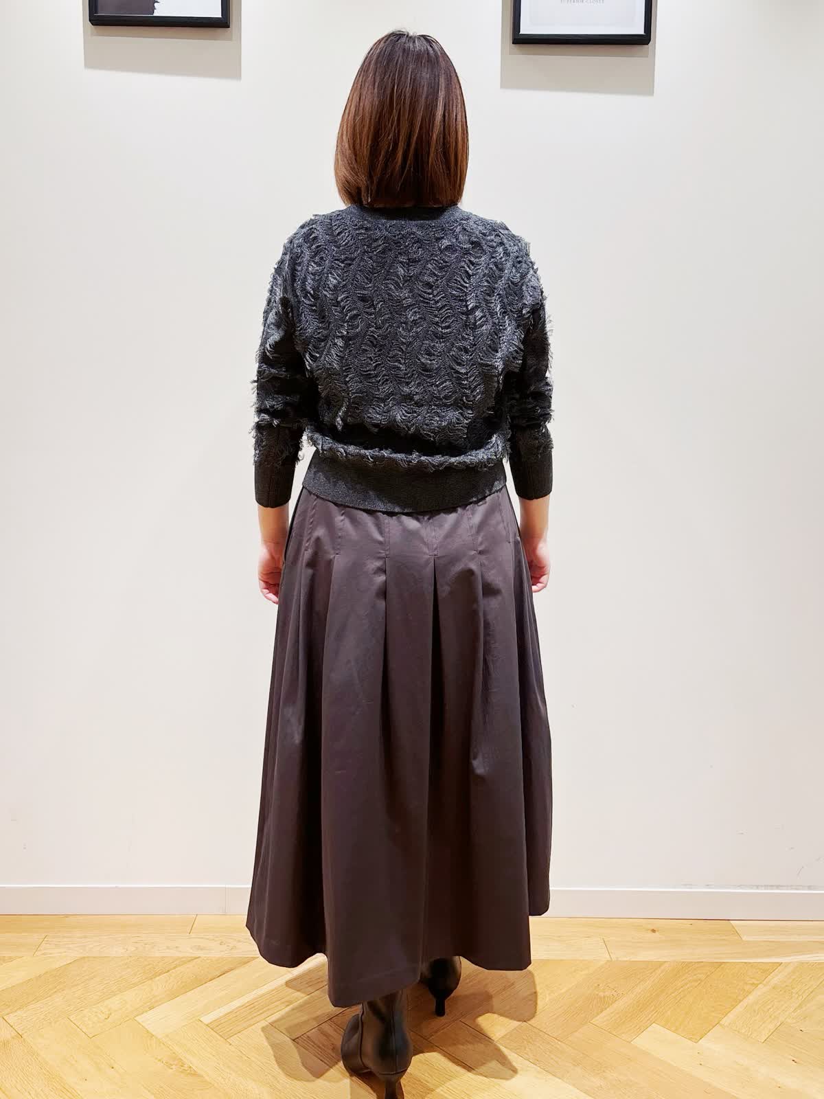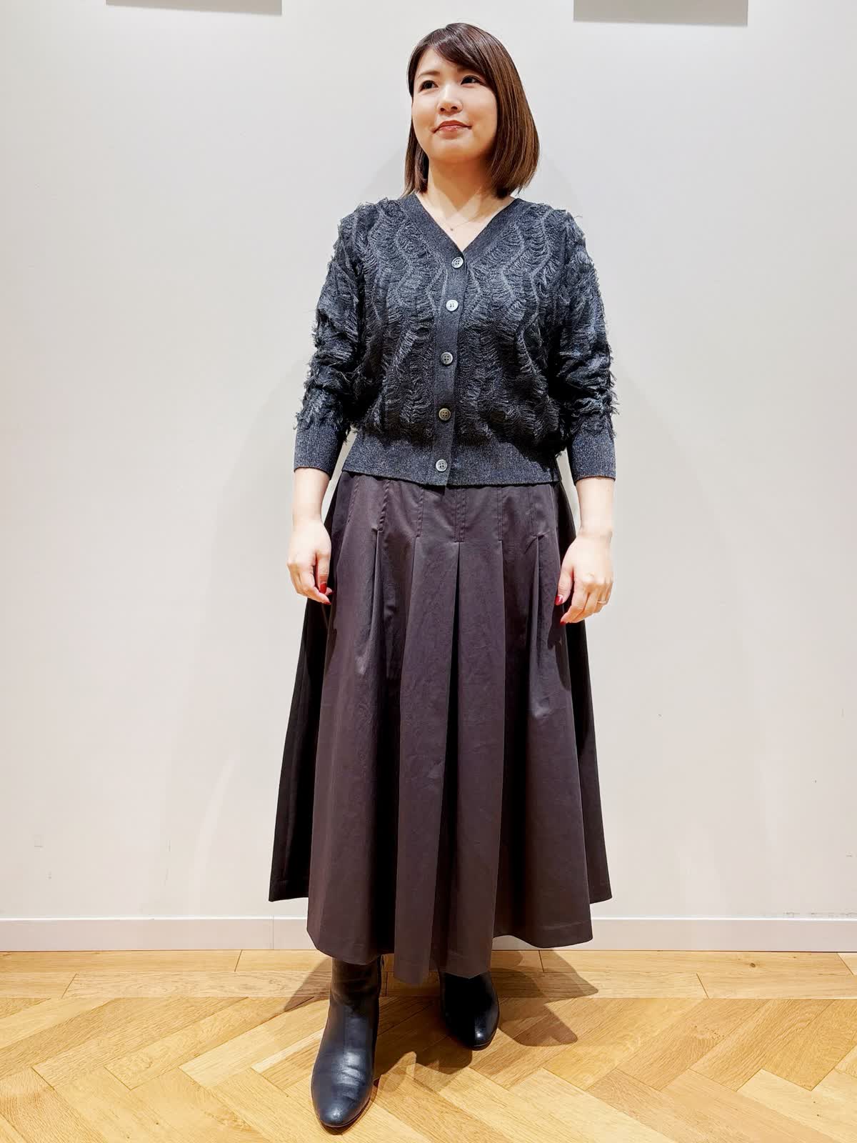 【着用サイズ】全て9号 【着用カラー】カーディガン:チャコールグレースカート:チャコールグレー お出掛けコーディネート。フリンジをあしらった華やかなニットカーディガンです。着るだけでおしゃれな印象になります。Vネックの深さでデコルテが美しく見えるのがポイントです。スカートは腰回りが広がらないのでボリュームが出過ぎずトップスとバランスよく着ていただけます。
