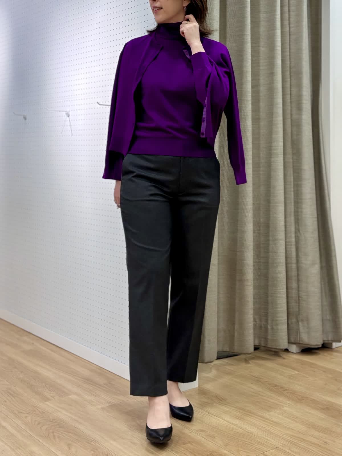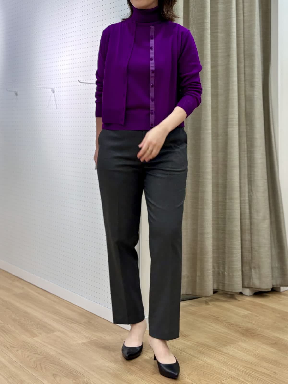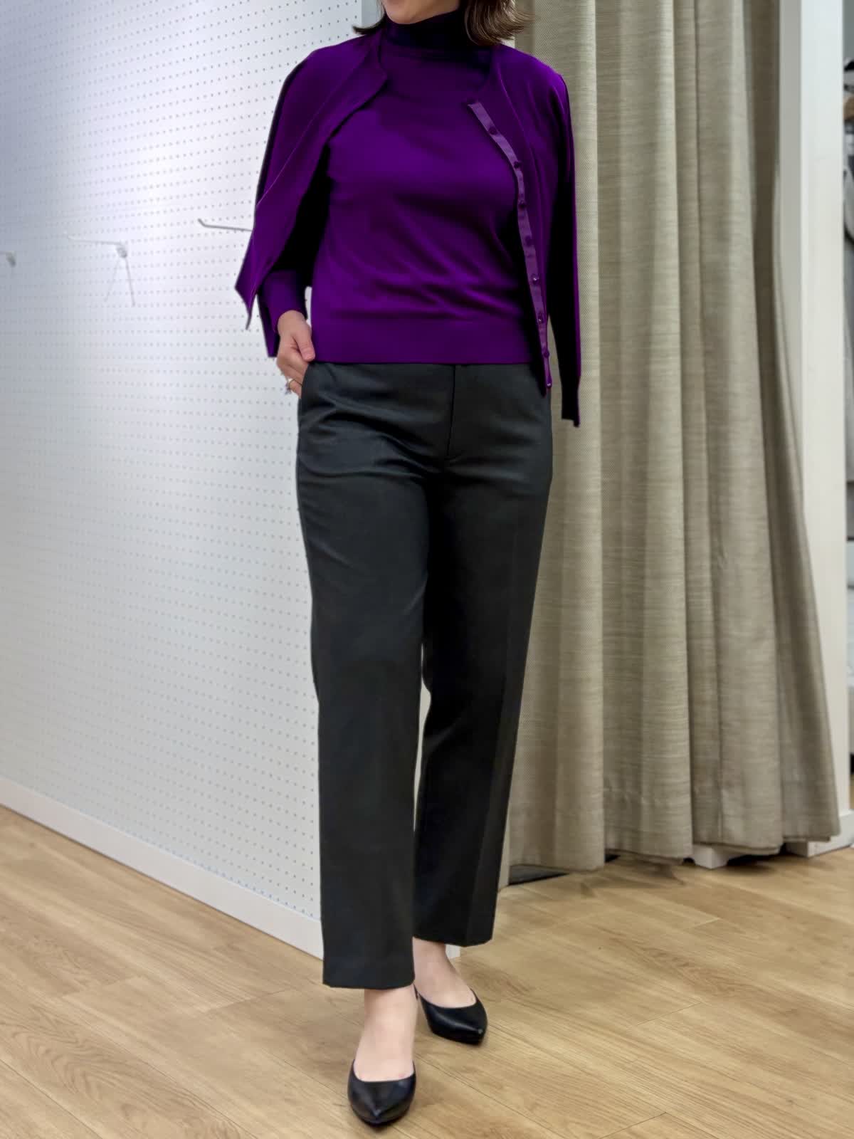 【着用カラー/サイズ】 ニット:パープル/9号 カーディガン:パープル/9号 パンツ:チャコールグレー/13号 オフィスカジュアルコーデ。発色が綺麗なニットはwool100%とは思えないサラッとした素材です。共布のカーディガンは縁にグログランのテープであつらえているので丈夫で見た目も綺麗です。アンサンブルであると安心です。美シルエットなパンツはウエストゴムでお腹周りも安心。裏が起毛で秋冬の足入れがしやすいです。