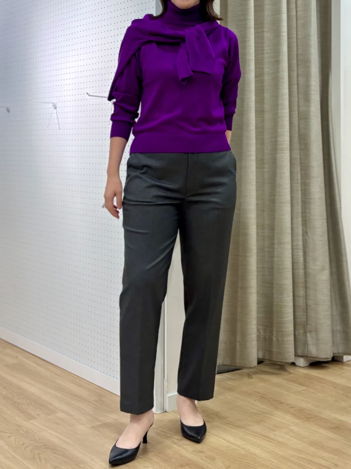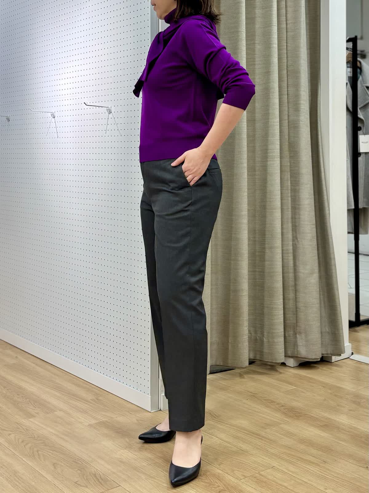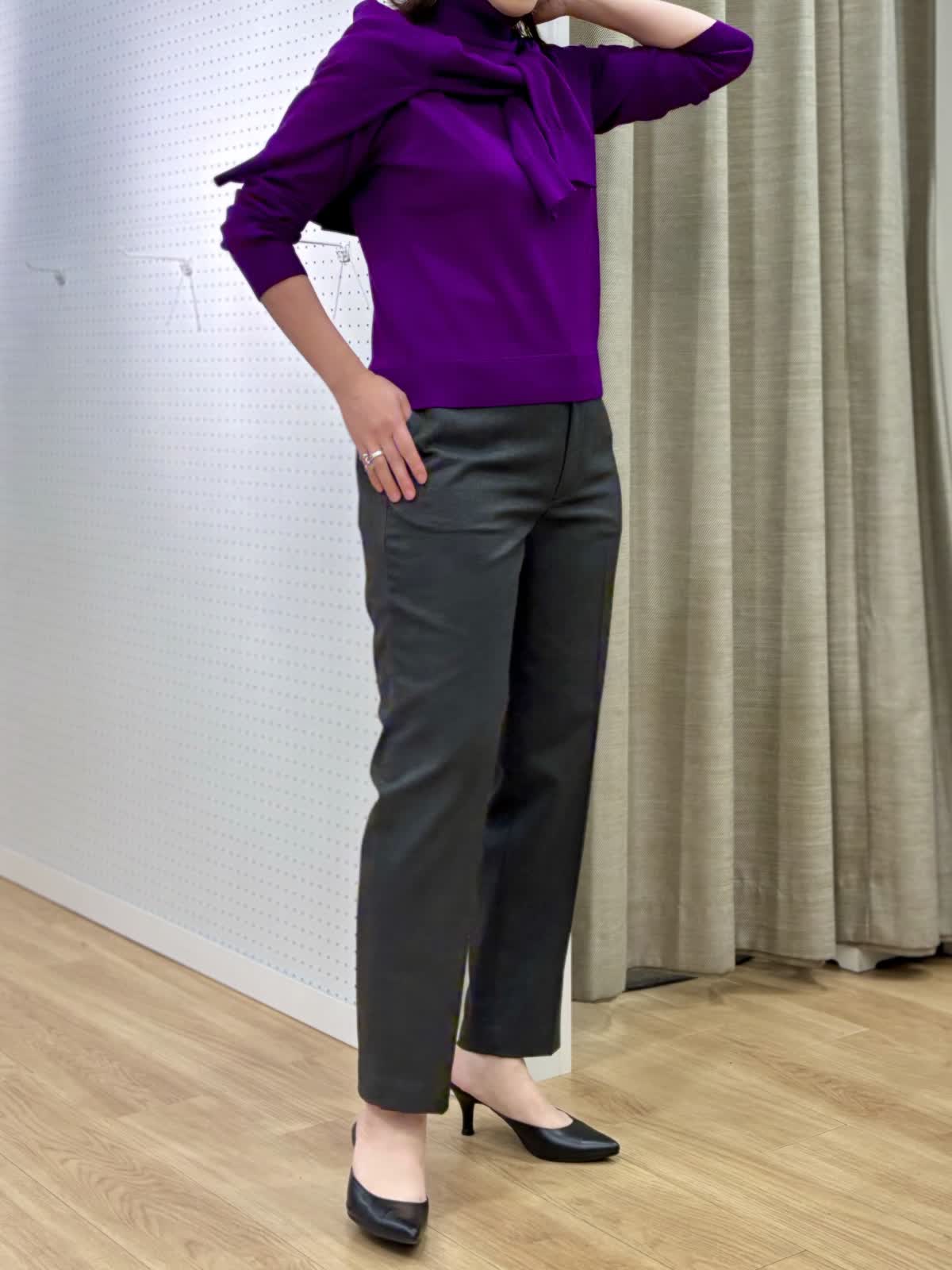 【着用カラー/サイズ】 ニット:パープル/9号 カーディガン:パープル/9号 パンツ:チャコールグレー/13号 オフィスカジュアルコーデ。発色が綺麗なニットはwool100%とは思えないサラッとした素材です。共布のカーディガンは縁にグログランのテープであつらえているので丈夫で見た目も綺麗です。アンサンブルであると安心です。美シルエットなパンツはウエストゴムでお腹周りも安心。裏が起毛で秋冬の足入れがしやすいです。
