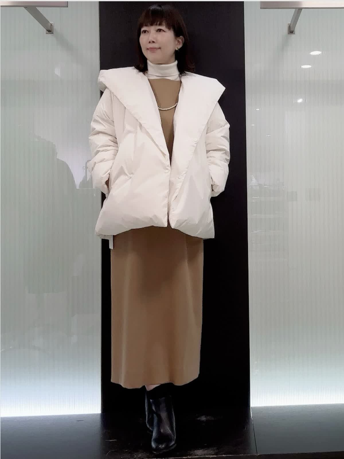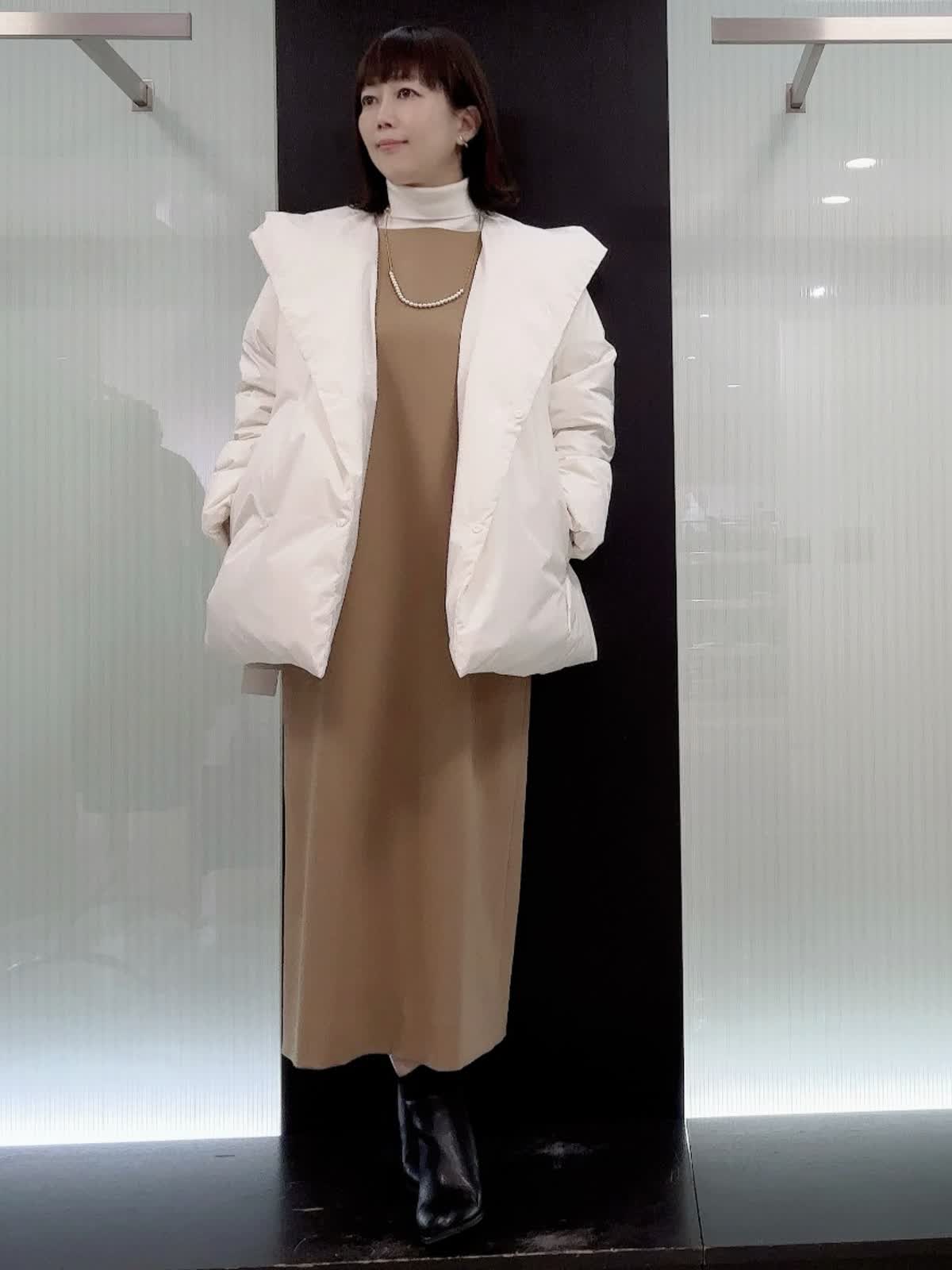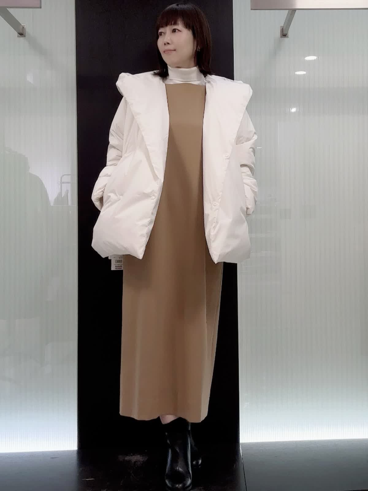 【着用サイズ】全て9号 【着用カラー】ダウン アイボリー ニット オフホワイト ワンピースキャメル 腰が隠れる丈で体を包み込む防寒仕様。ややゆったりとしたオーバーシルエットです。とても軽くて暖かいです。ワンピースは、ストレートラインで程よくゆったり着れるサイズ感です 。