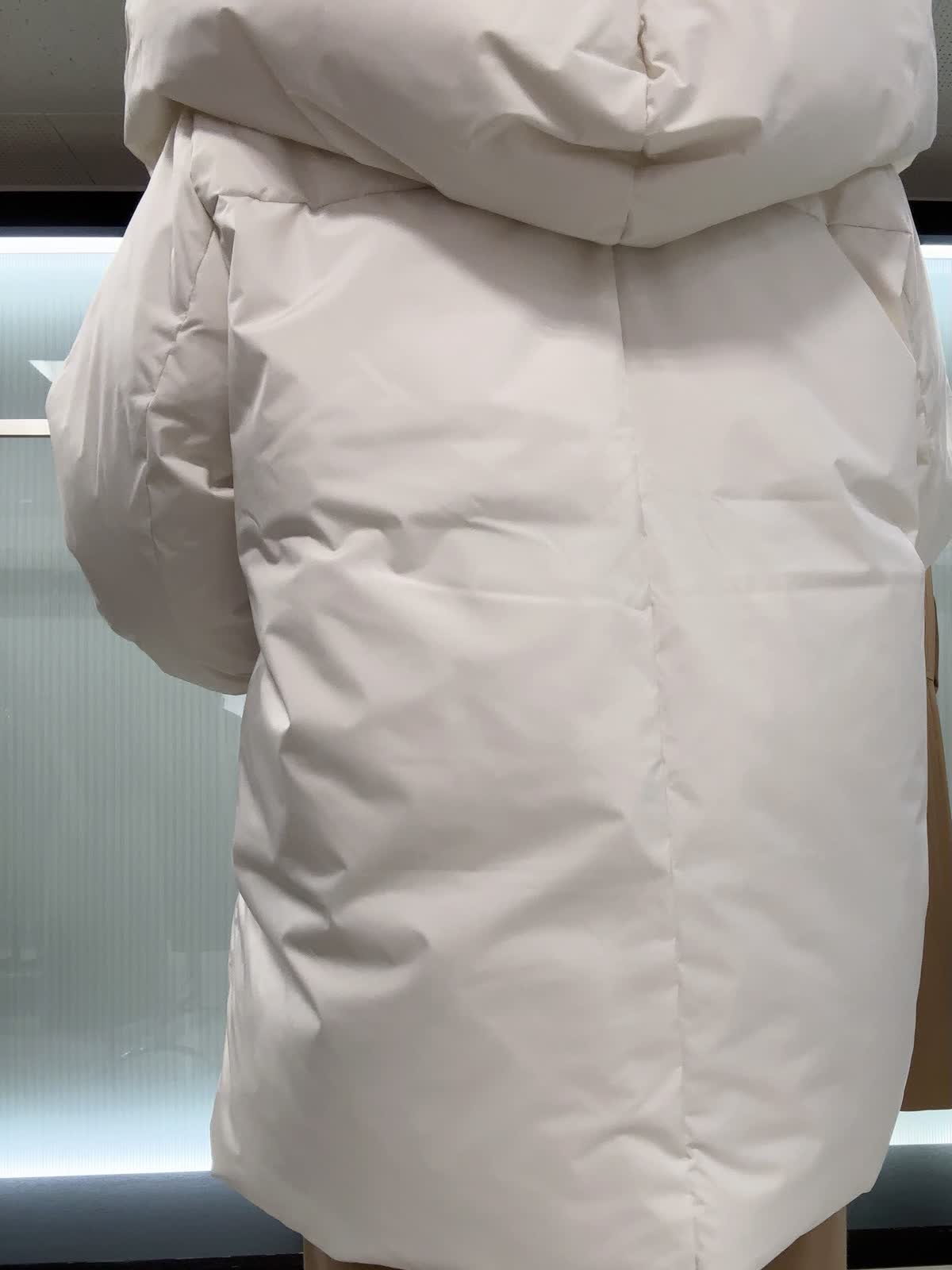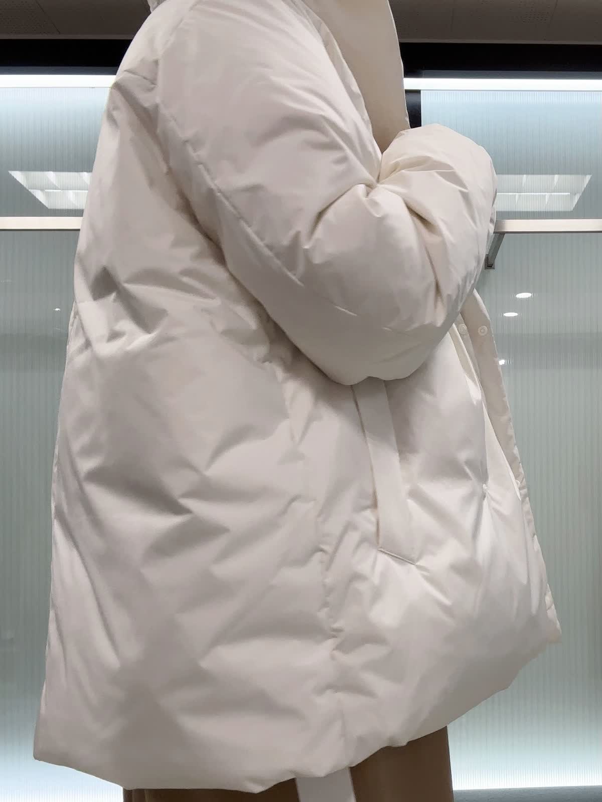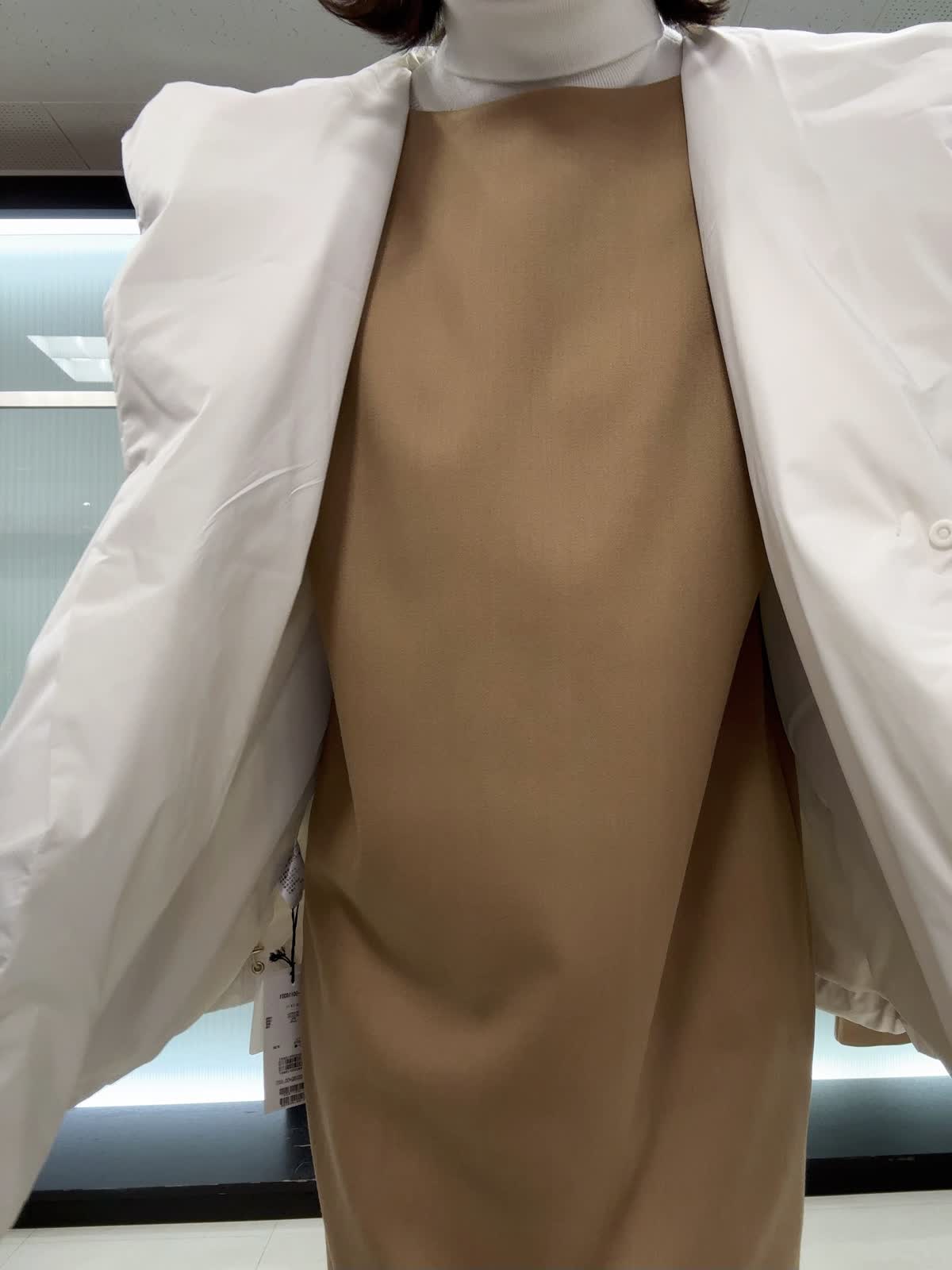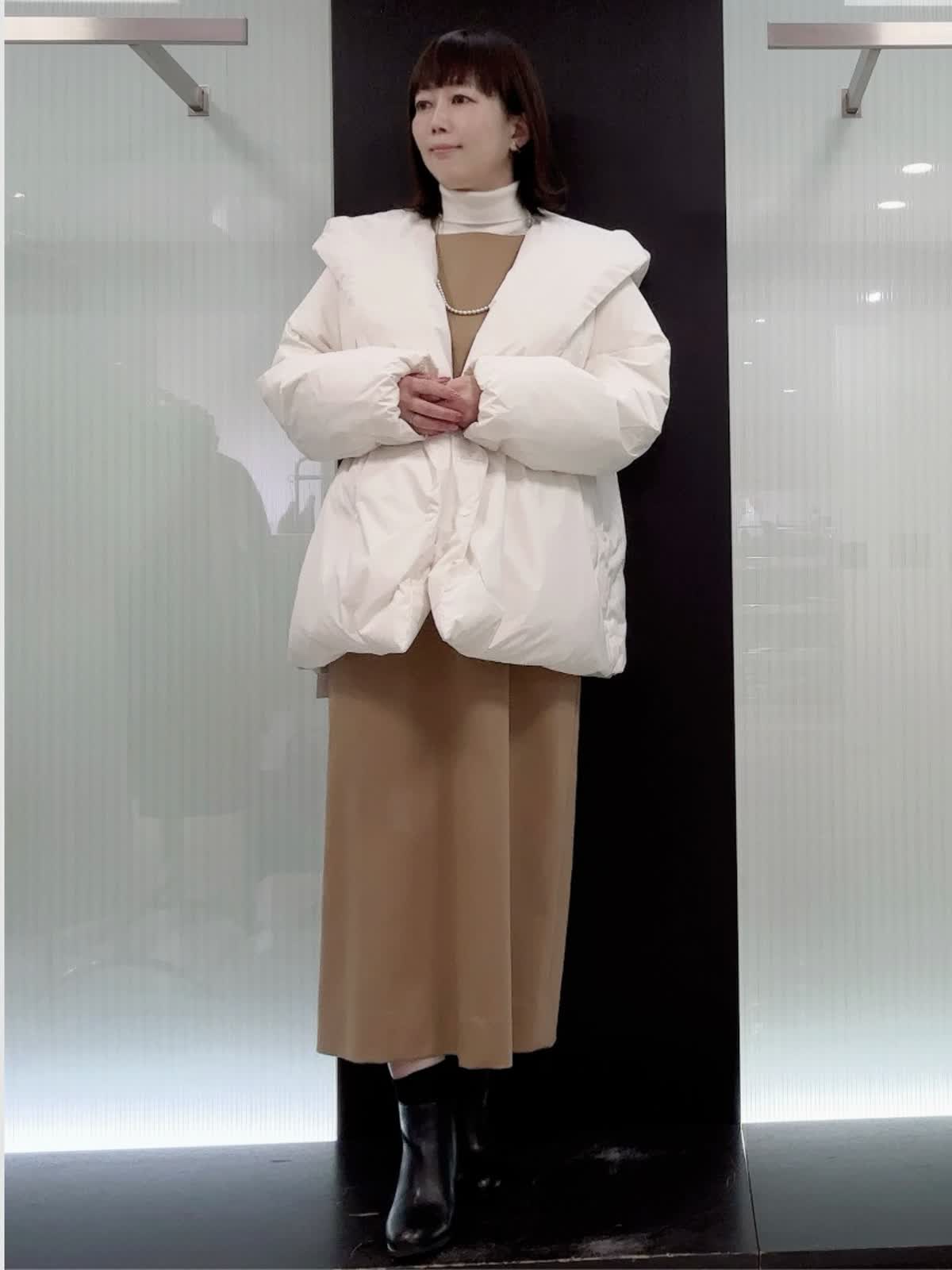 【着用サイズ】全て9号 【着用カラー】ダウン アイボリー ニット オフホワイト ワンピースキャメル 腰が隠れる丈で体を包み込む防寒仕様。ややゆったりとしたオーバーシルエットです。とても軽くて暖かいです。ワンピースは、ストレートラインで程よくゆったり着れるサイズ感です 。