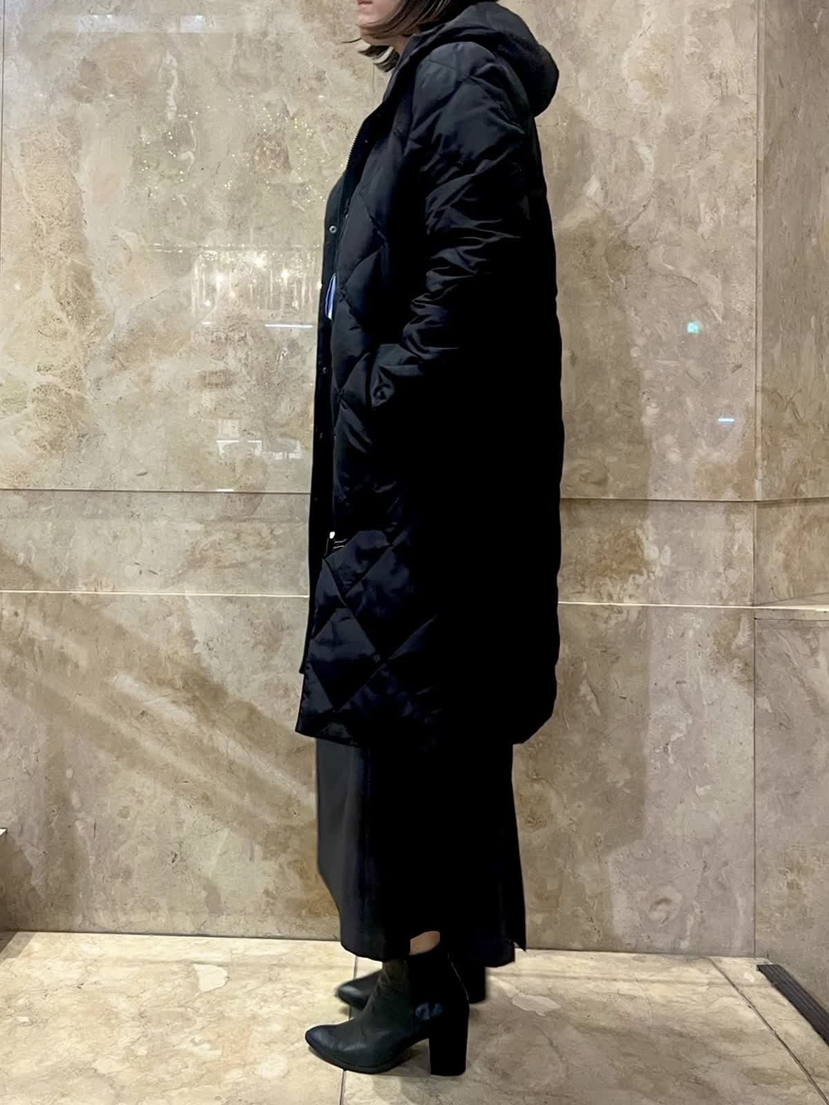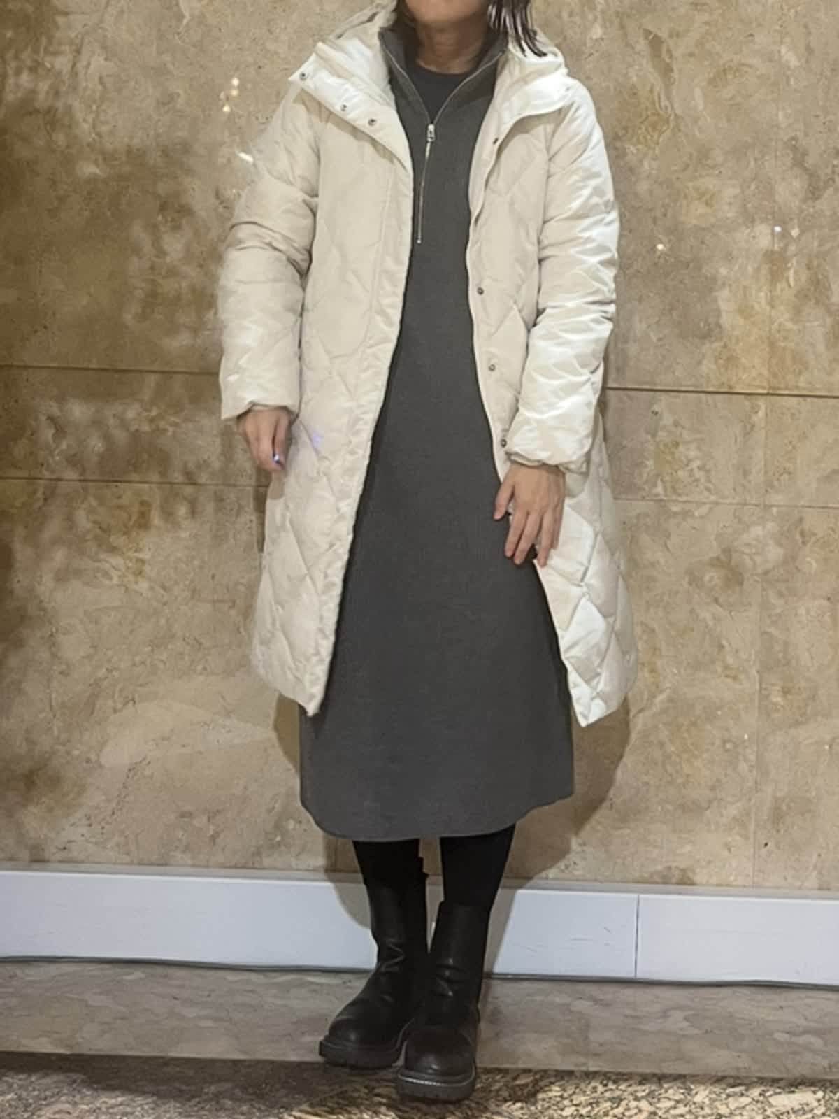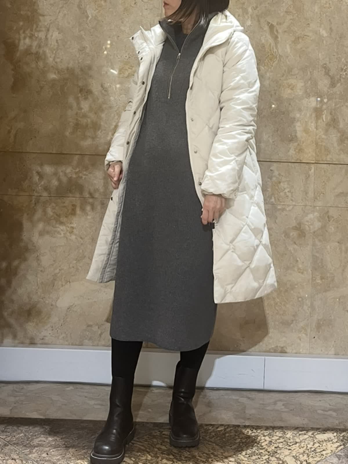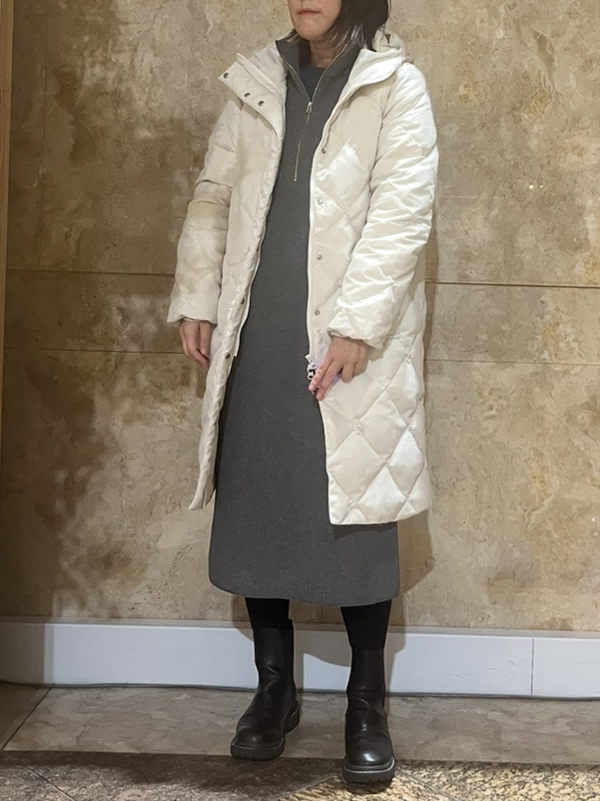 【着用サイズ/カラー】ダウンコート:9号/グレーベージュ・ブラック ニットワンピース:フリーサイズ/チャコールグレー TAIONコラボレーションコートは新たに加わったフードタイプ。カジュアルにもキレイ目にもご利用いただける今年イチオシのアウターです。(フード取外し不可)