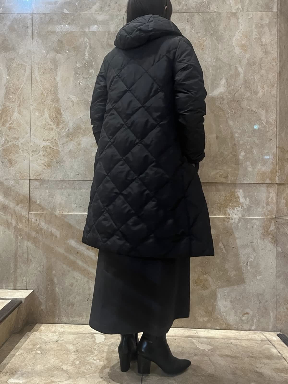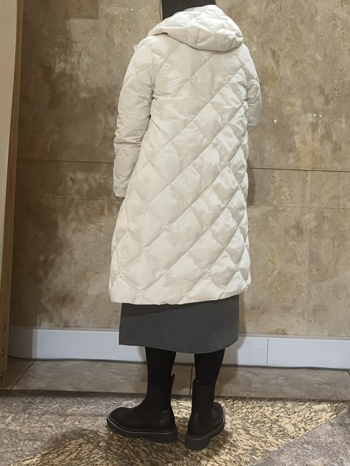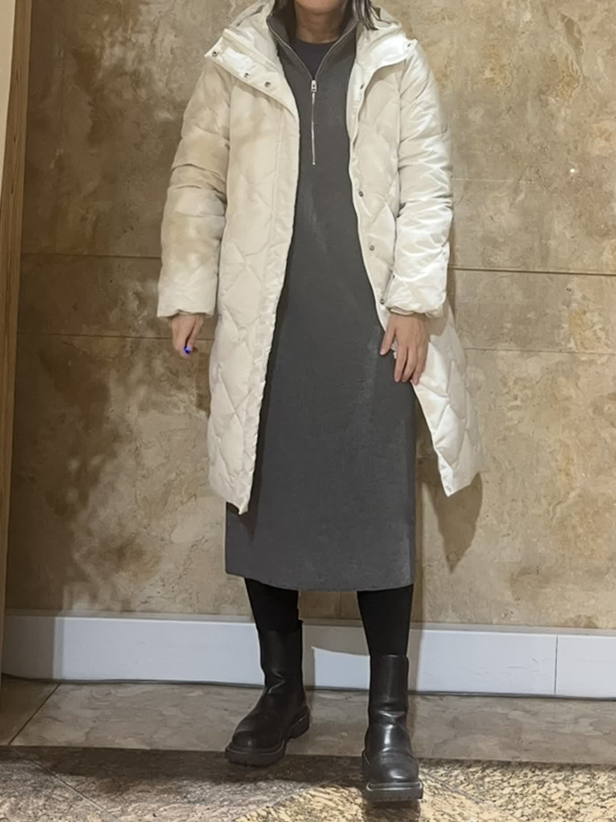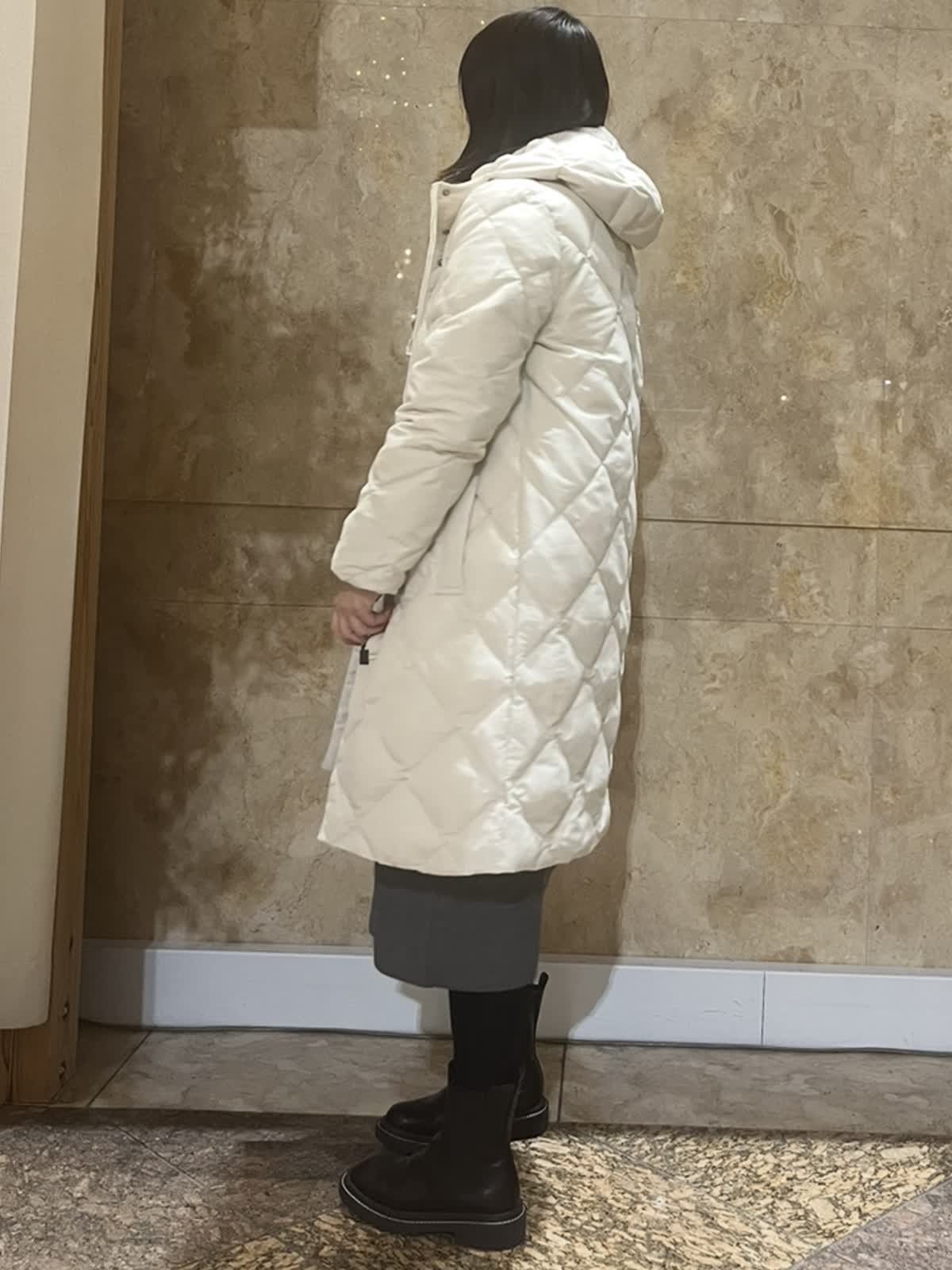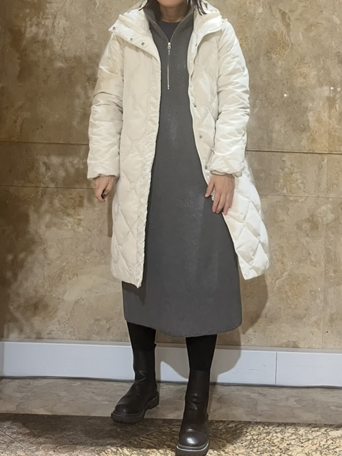 【着用サイズ/カラー】ダウンコート:9号/グレーベージュ・ブラック ニットワンピース:フリーサイズ/チャコールグレー TAIONコラボレーションコートは新たに加わったフードタイプ。カジュアルにもキレイ目にもご利用いただける今年イチオシのアウターです。(フード取外し不可)