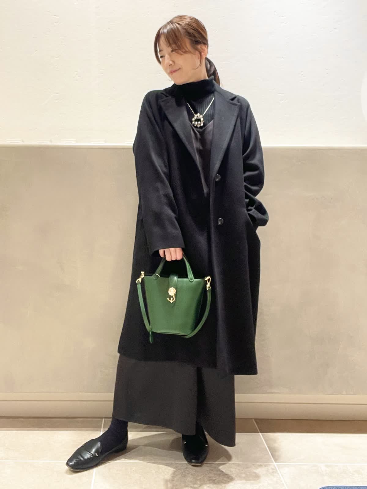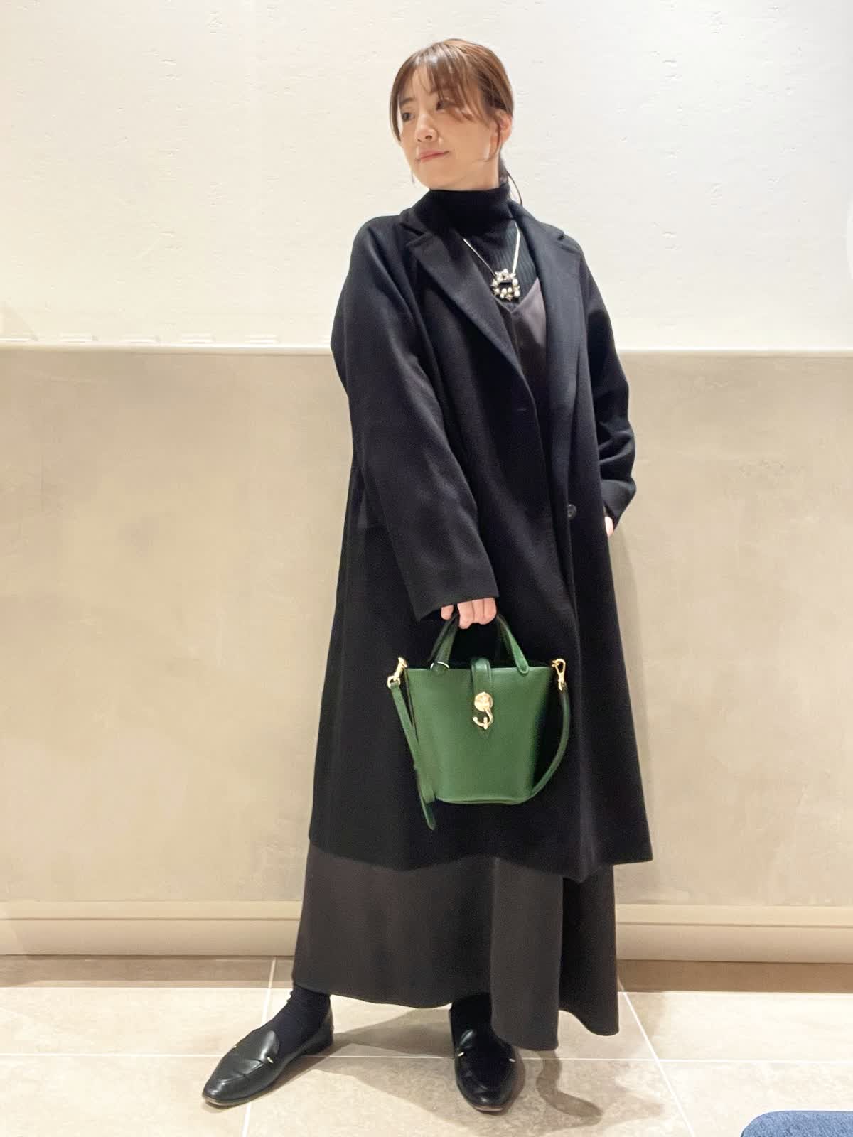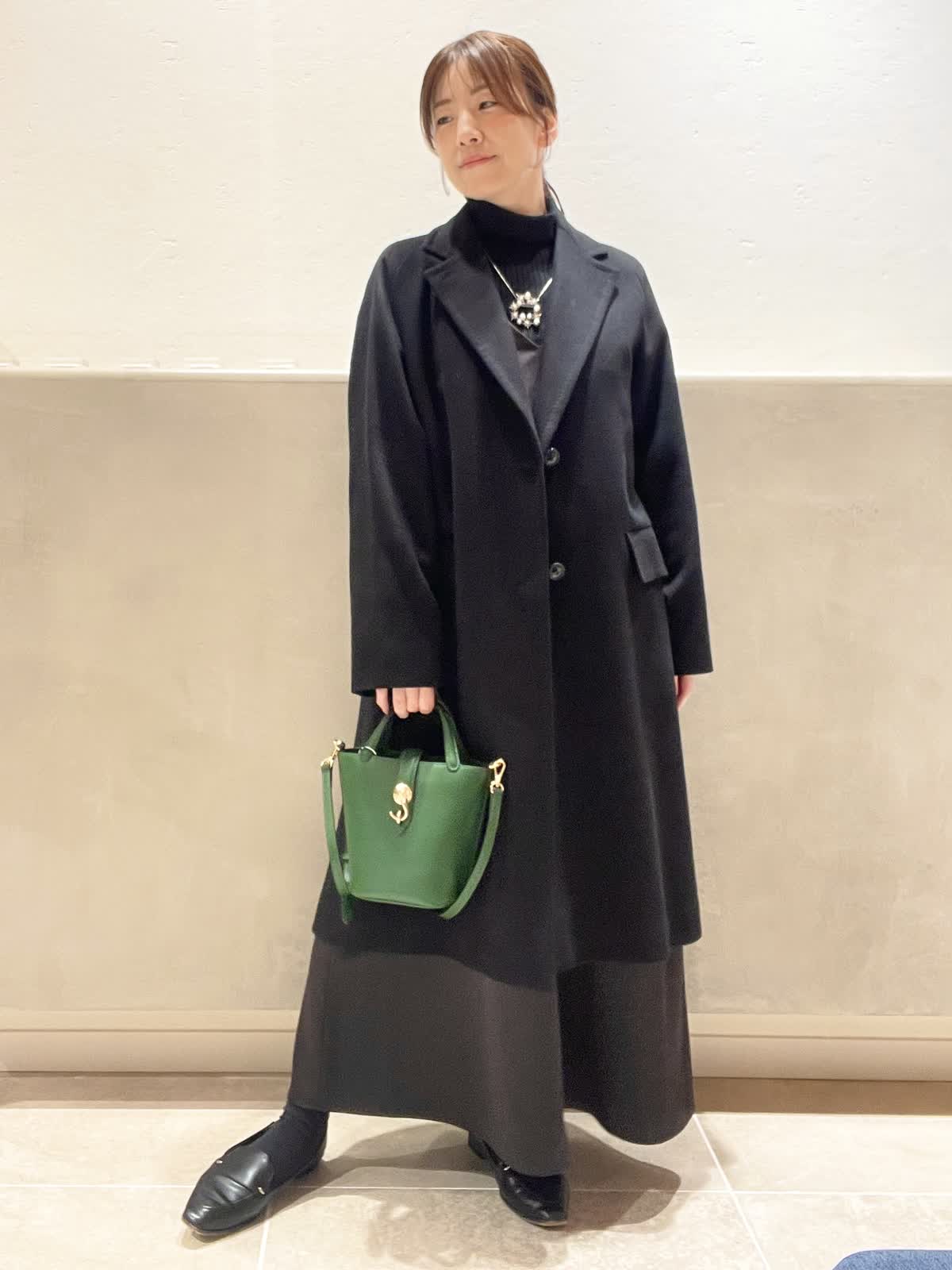 【着用アイテム:カラー/サイズ】 コート:ブラック/9号 タートル:ブラック/9号 ワンピース:ブラック/7号 バッグ:グリーン ネックレス:シルバー 上質なCOLOMBOのチェスターコートのスタイル。シンプルで程よい緩さがデイリーにも着やすいコートです。バッグは、光沢のあるカシミヤの黒を引き立ててくれる、DELLESTのグリーンのミニトートを合わせました。