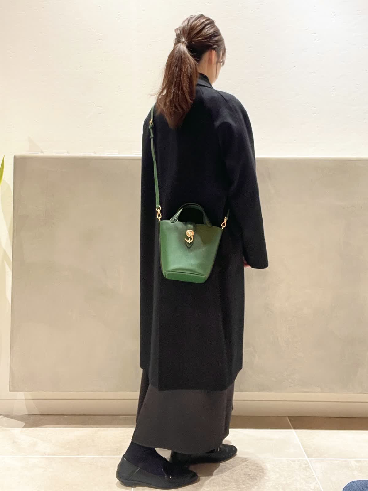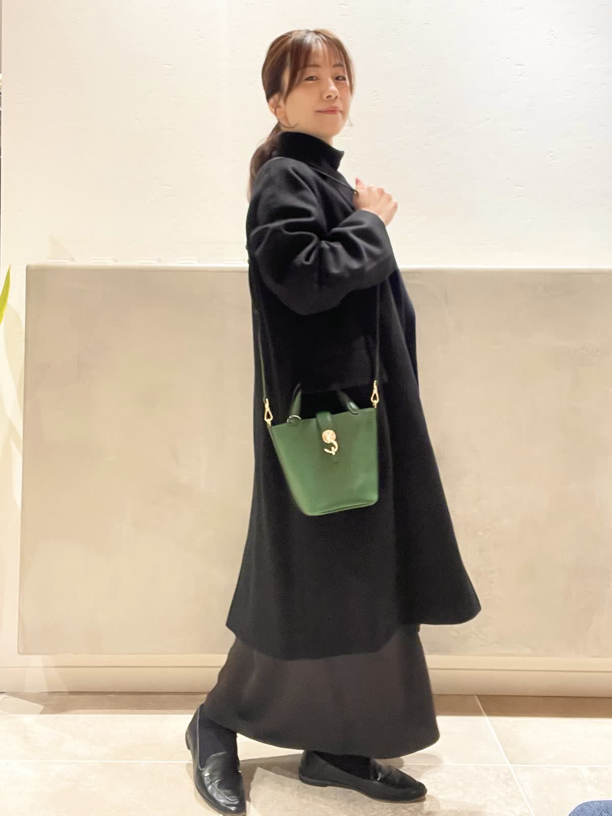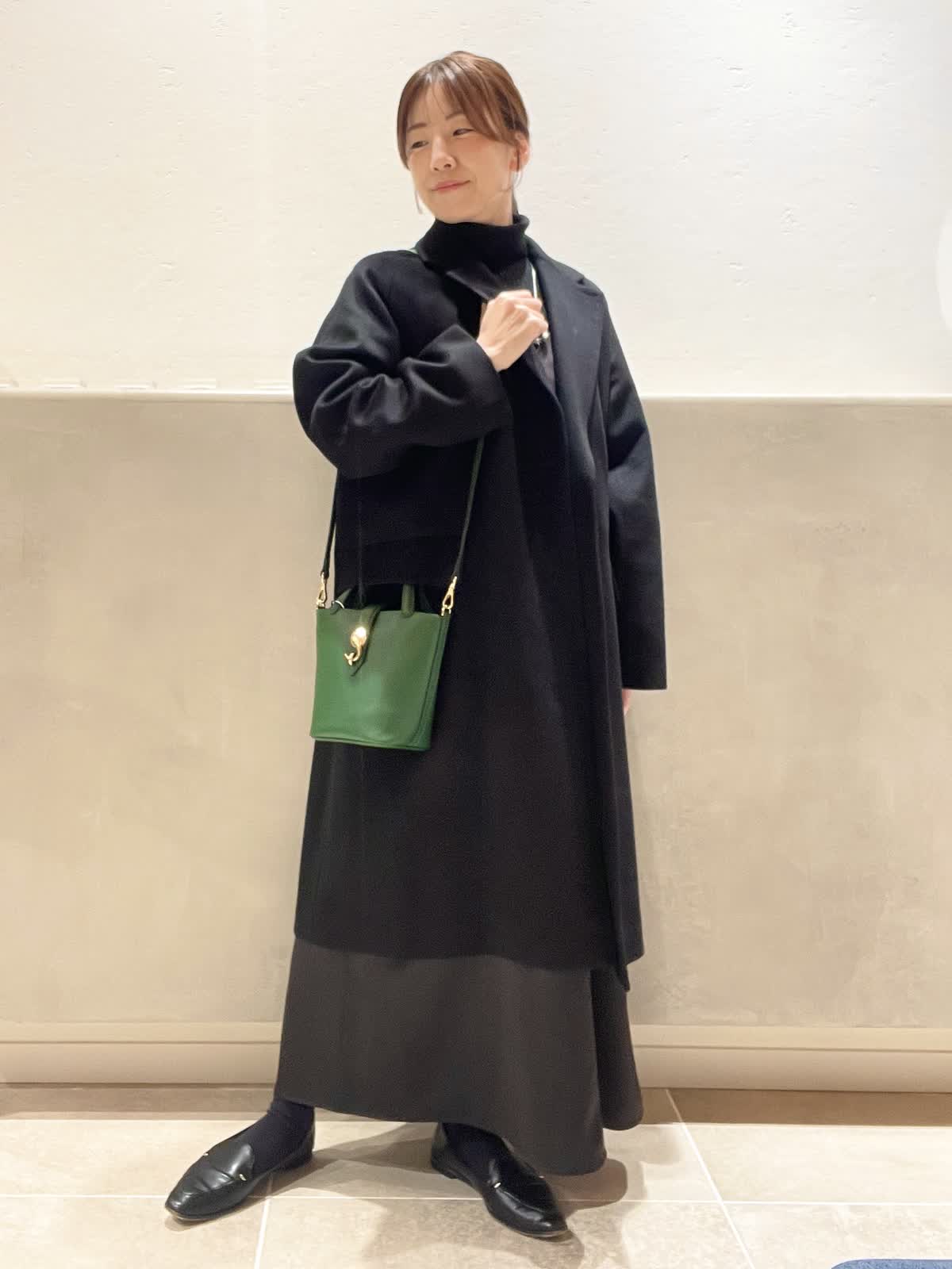 【着用アイテム:カラー/サイズ】 コート:ブラック/9号 タートル:ブラック/9号 ワンピース:ブラック/7号 バッグ:グリーン ネックレス:シルバー 上質なCOLOMBOのチェスターコートのスタイル。シンプルで程よい緩さがデイリーにも着やすいコートです。バッグは、光沢のあるカシミヤの黒を引き立ててくれる、DELLESTのグリーンのミニトートを合わせました。