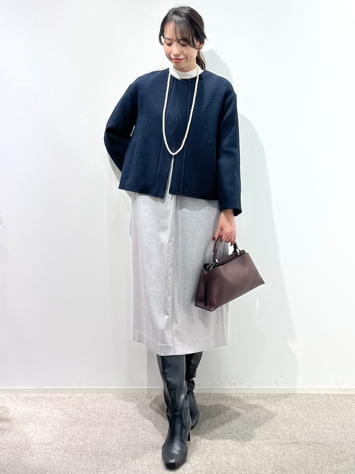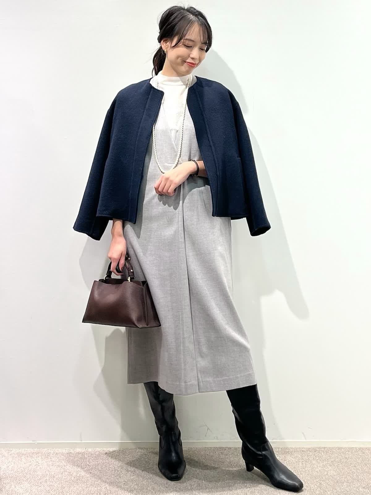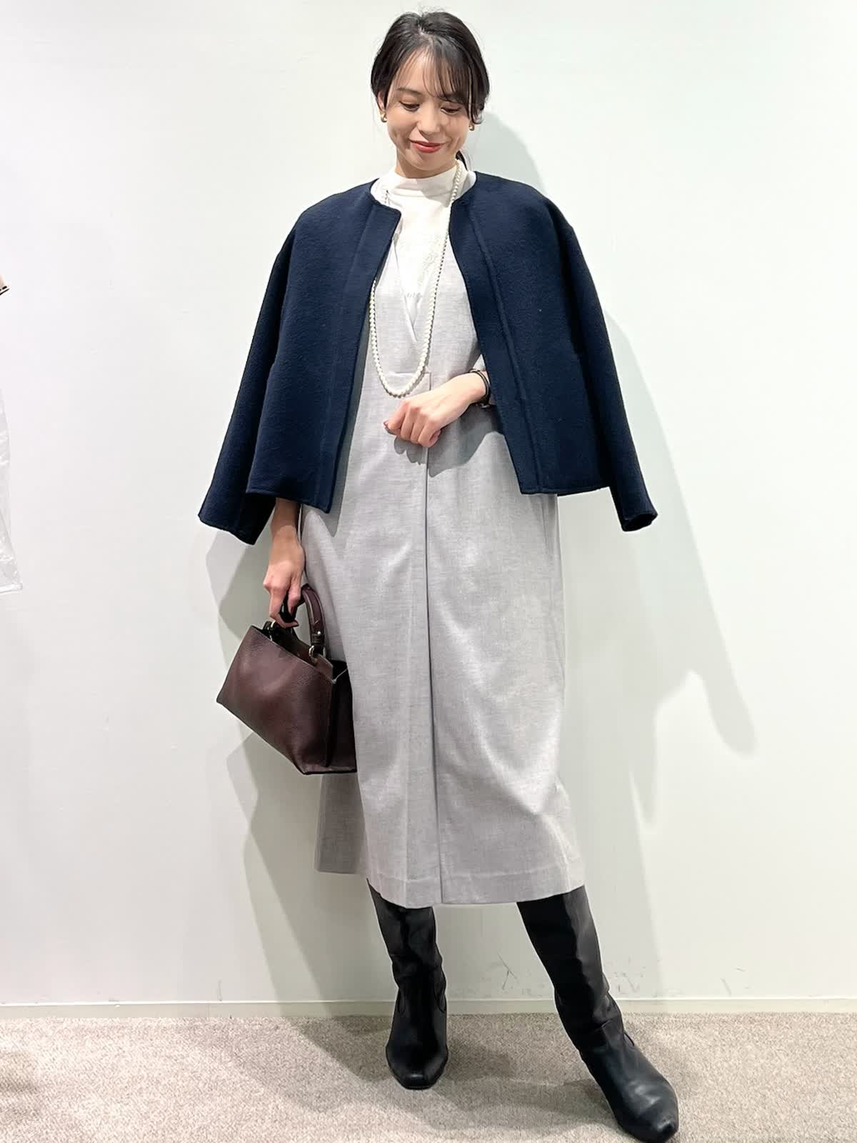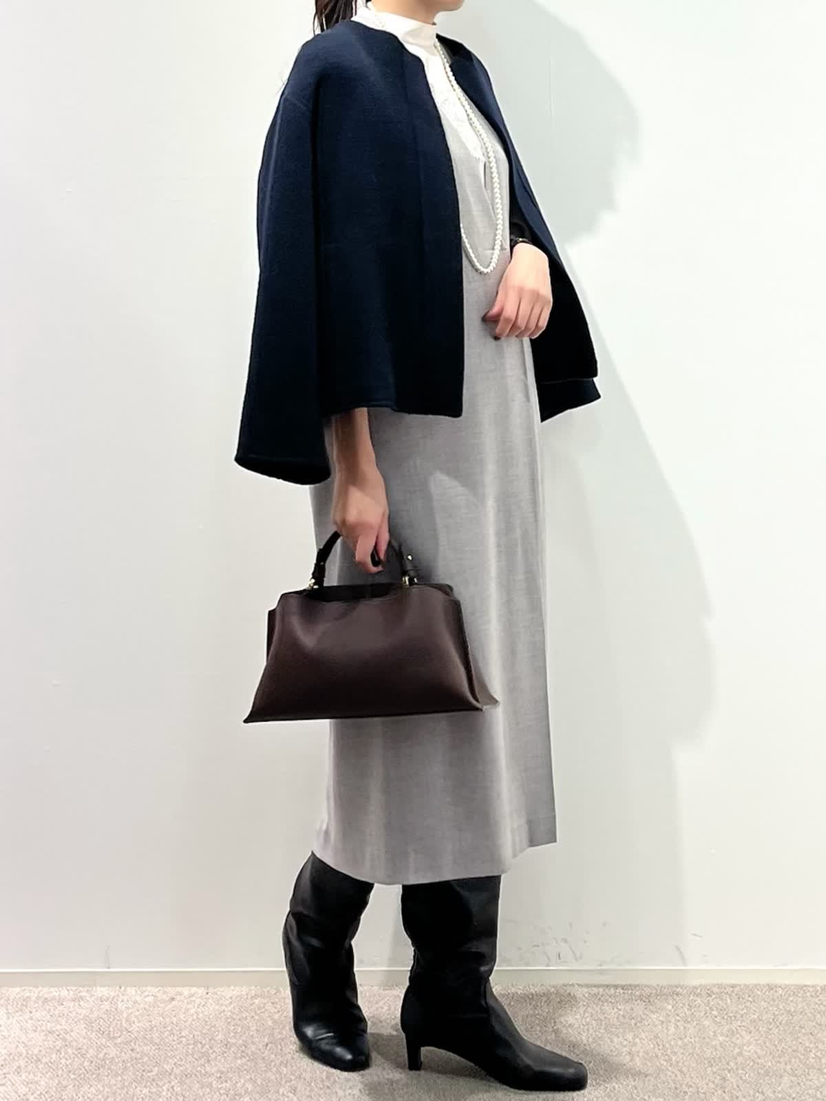 【着用サイズ】コート:9号 ブラウス:9号 ワンピース:9号 【着用カラー】コート:ネイビー ブラウス:ピンク ワンピース:グレー バッグ:ダークブラウン 「上品なモノトーンクラシックコーデ」 上品な艶感のコクーンワンピース。深めなVネックで、シャープに着こなせるデザイン。インナーは、ブラウスやニットなどレイヤードでシーズン長く活用できるアイテム。綺麗めに組み合わせたレースブラウスをプラスしたお出かけスタイルの完成。軽さのあるリバーショートコートで、バランス良く着こなせる冬のお出かけおすすめコーデです。