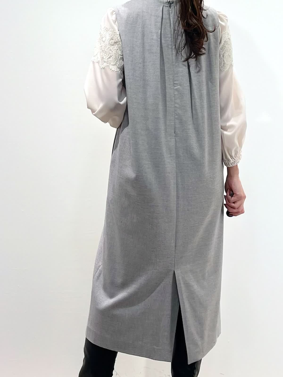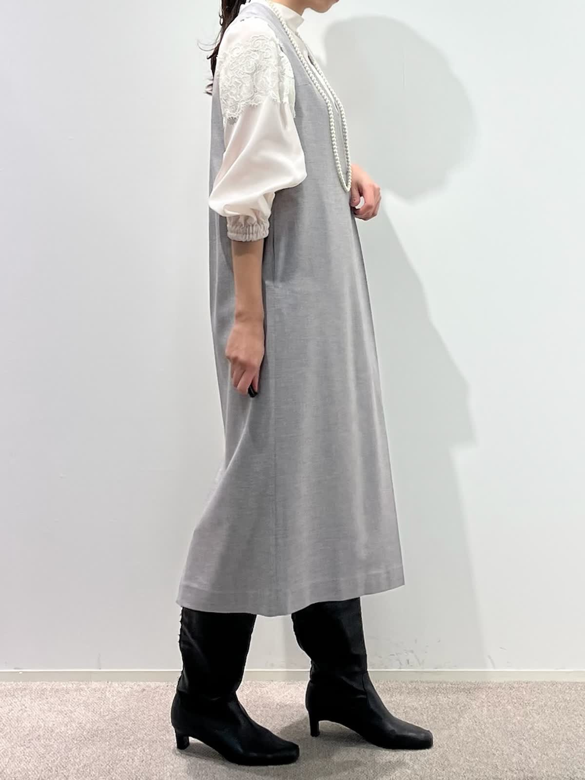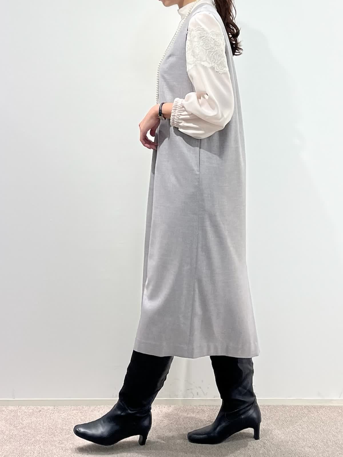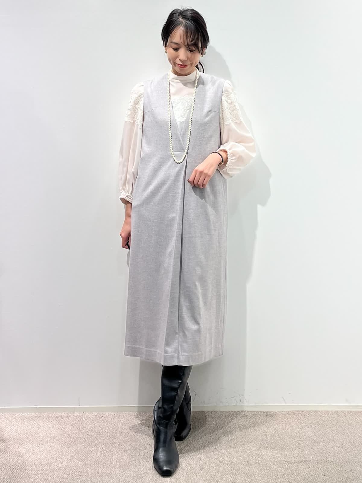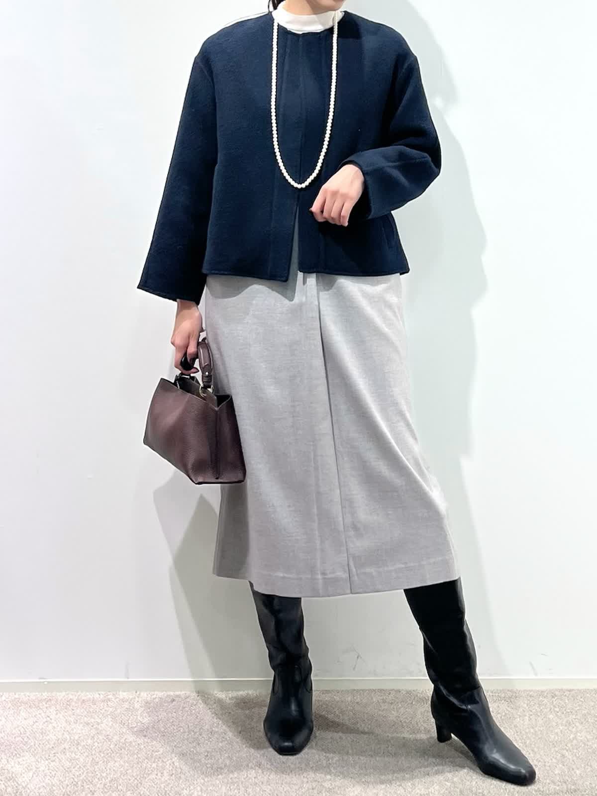 【着用サイズ】コート:9号 ブラウス:9号 ワンピース:9号 【着用カラー】コート:ネイビー ブラウス:ピンク ワンピース:グレー バッグ:ダークブラウン 「上品なモノトーンクラシックコーデ」 上品な艶感のコクーンワンピース。深めなVネックで、シャープに着こなせるデザイン。インナーは、ブラウスやニットなどレイヤードでシーズン長く活用できるアイテム。綺麗めに組み合わせたレースブラウスをプラスしたお出かけスタイルの完成。軽さのあるリバーショートコートで、バランス良く着こなせる冬のお出かけおすすめコーデです。