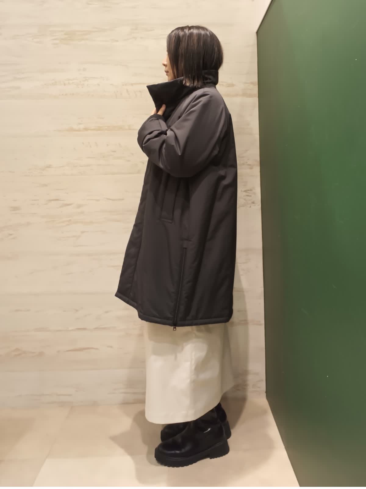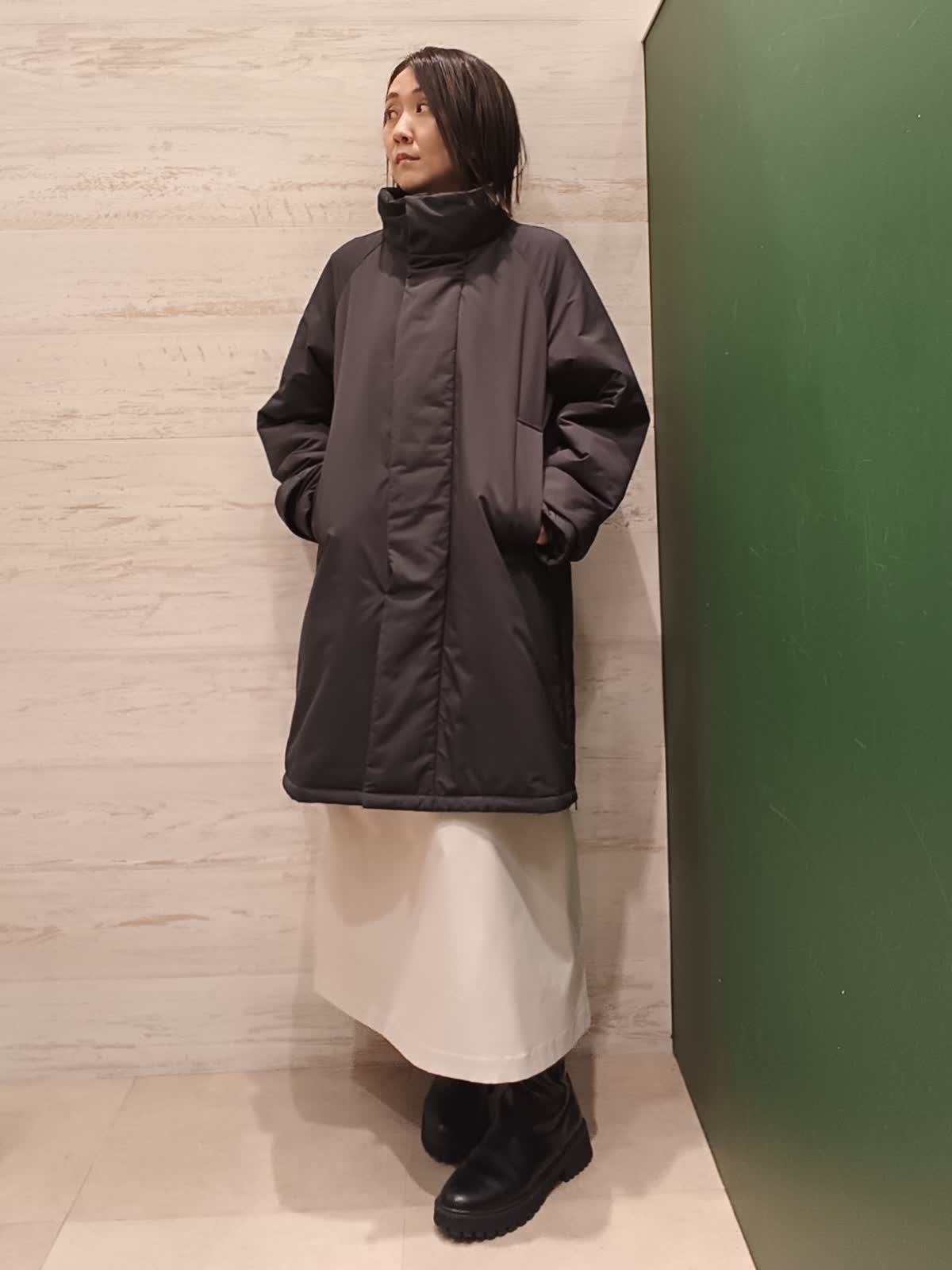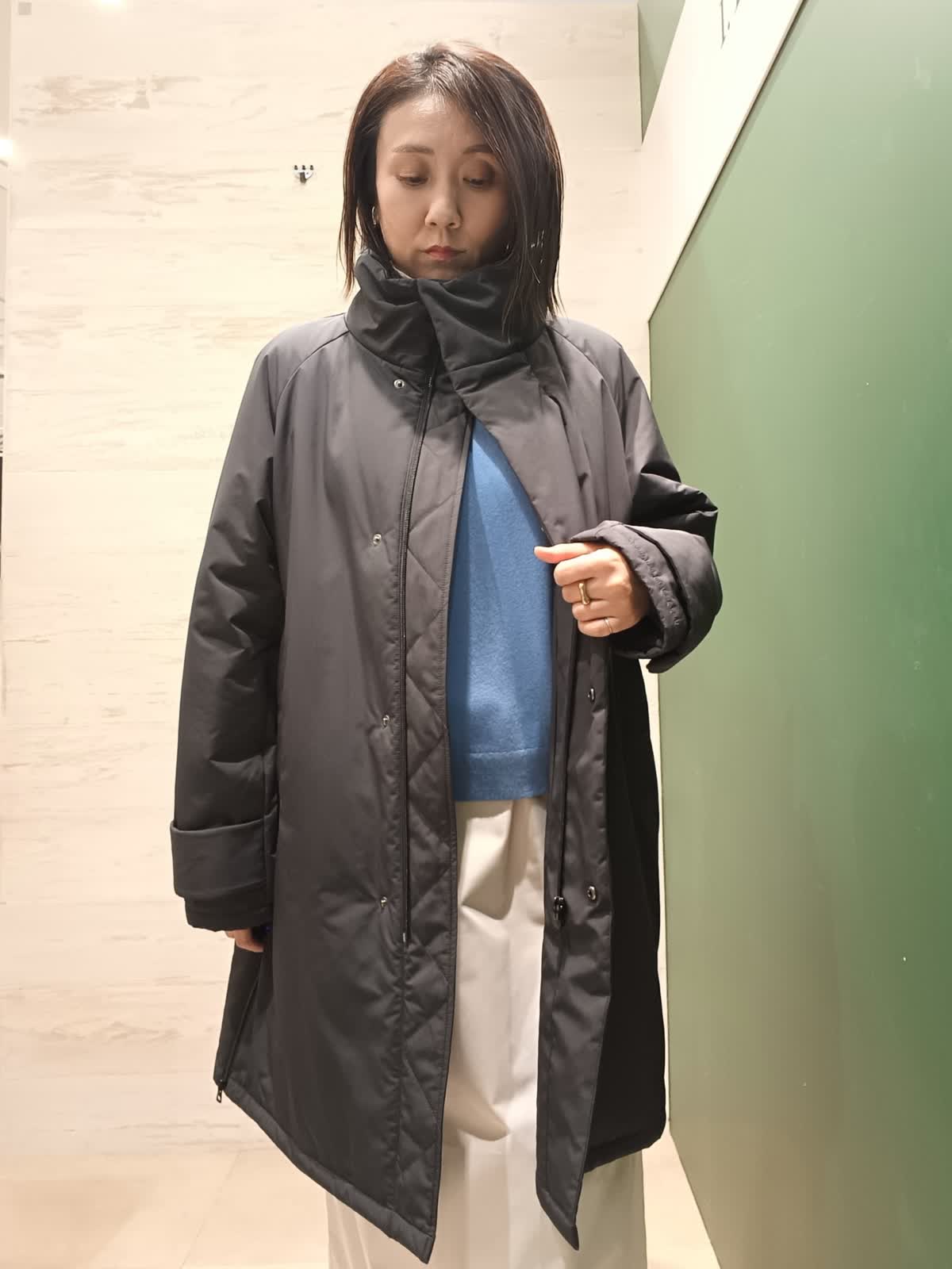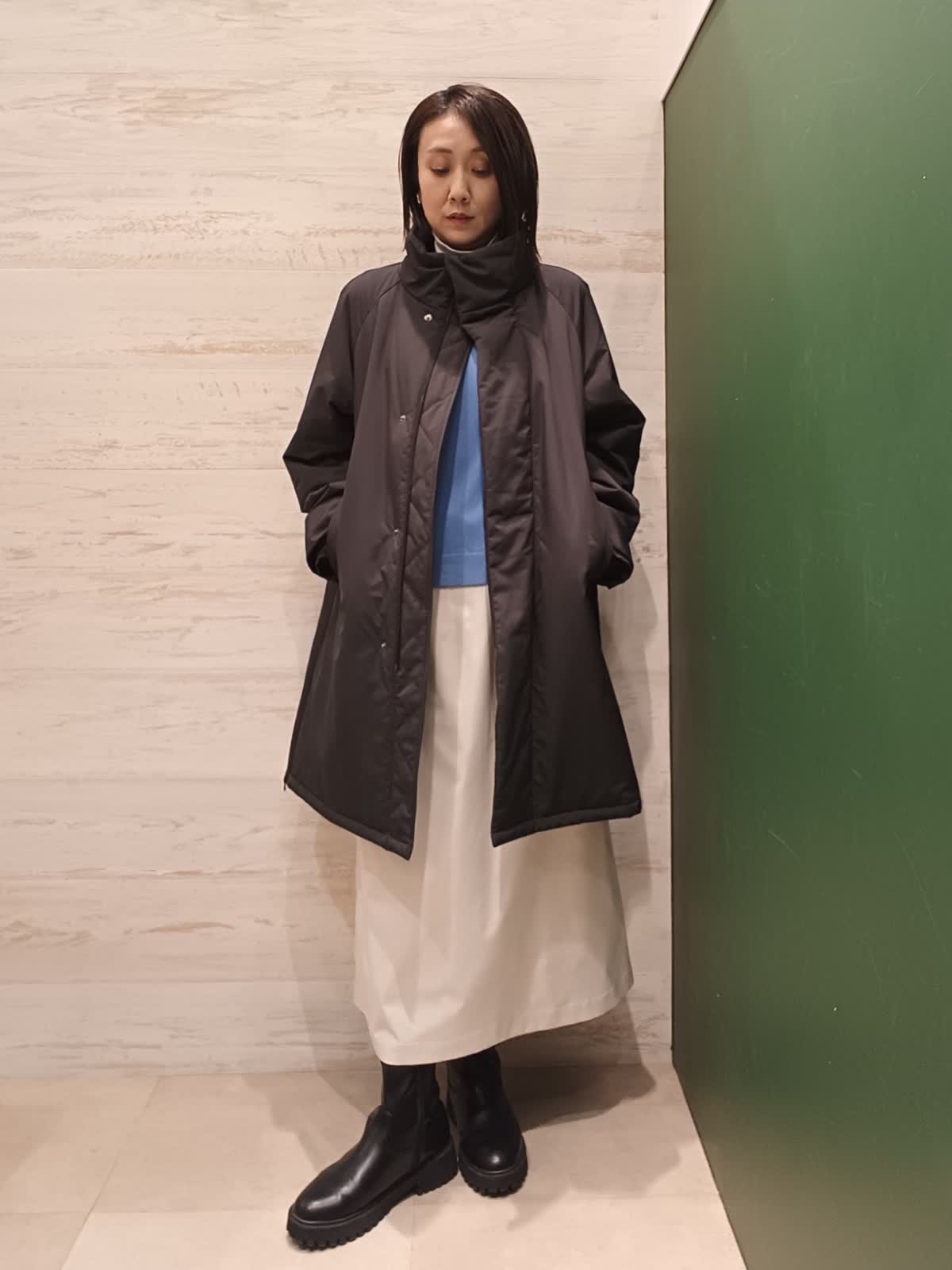 【着用カラー/サイズ】コート:ブラック/フリー ニット:ブルー/フリー スタンドカラーの中綿コートはパウダータッチでマットな質感です。Aラインのシルエットで両サイドファスナーでスリットデザインになっています。差し色でキレイめカジュアルにもおすすめです。