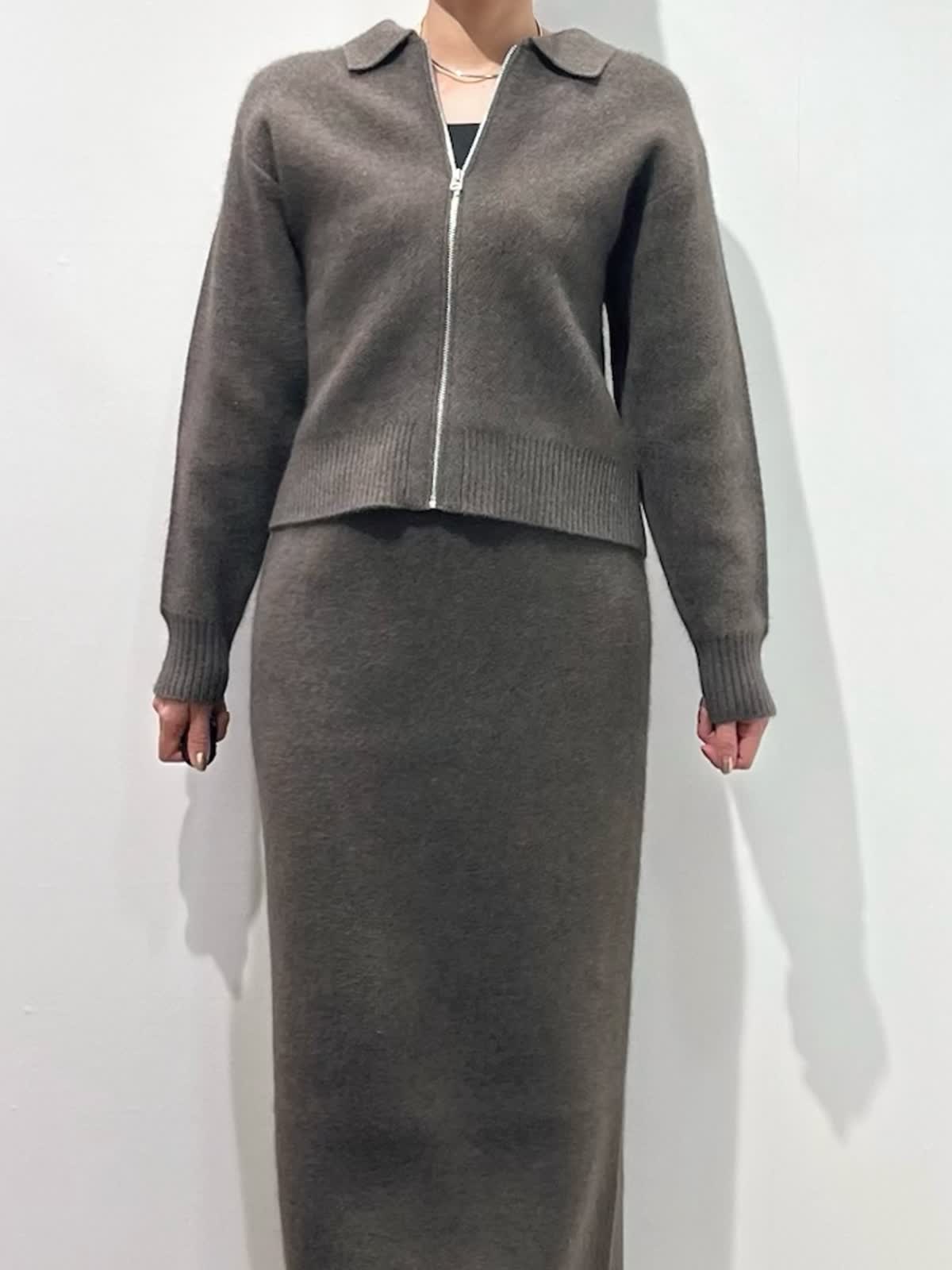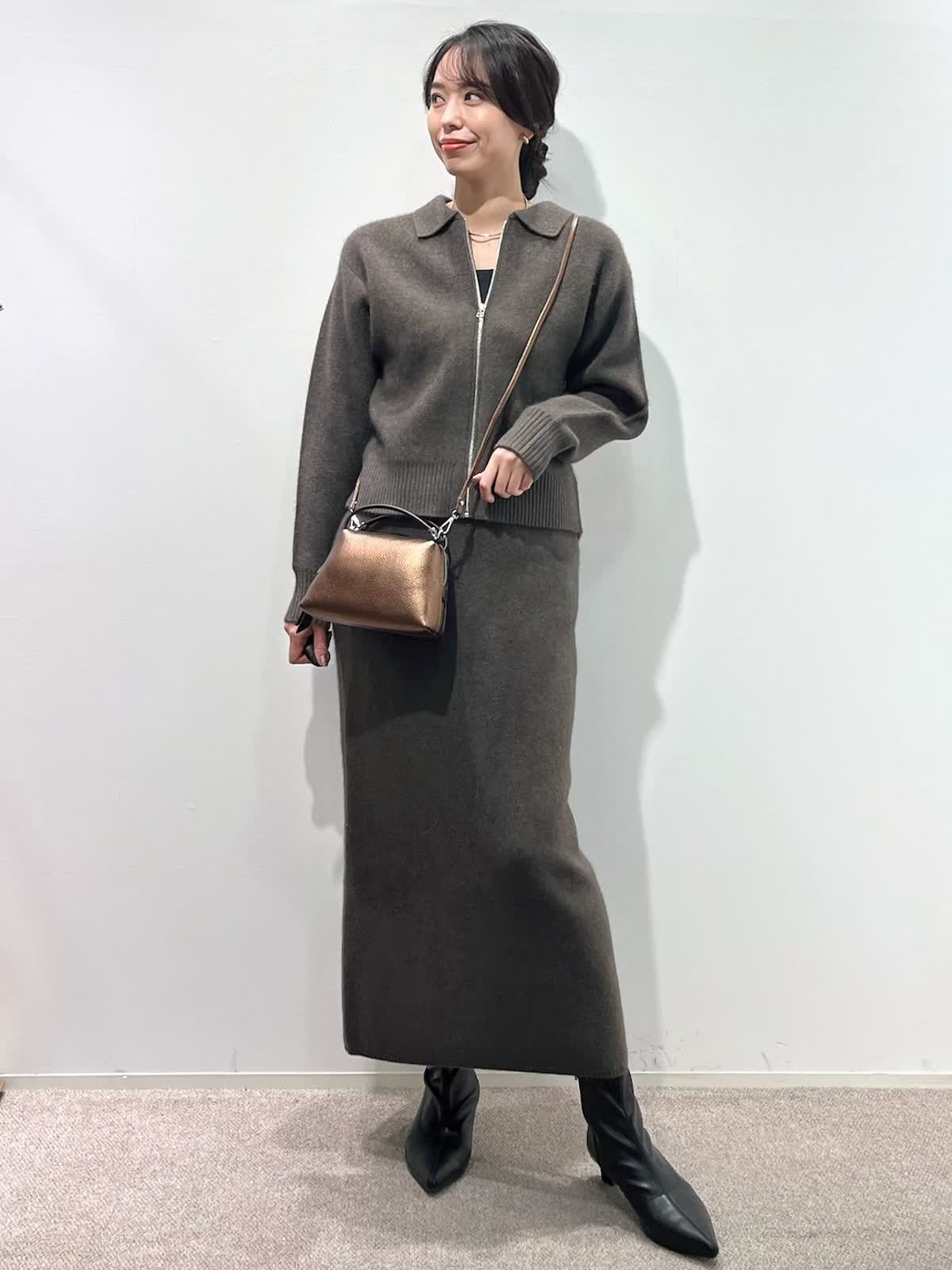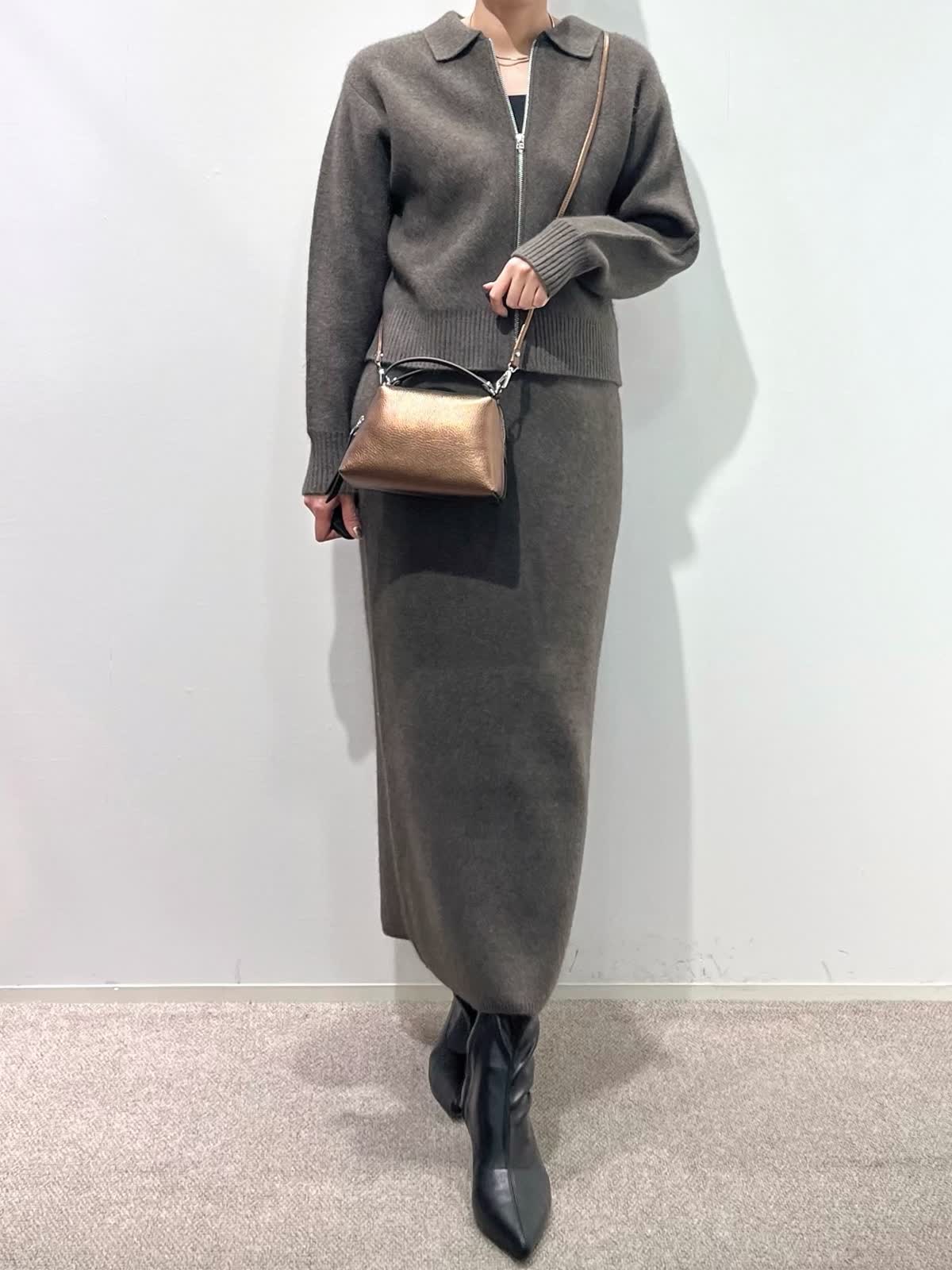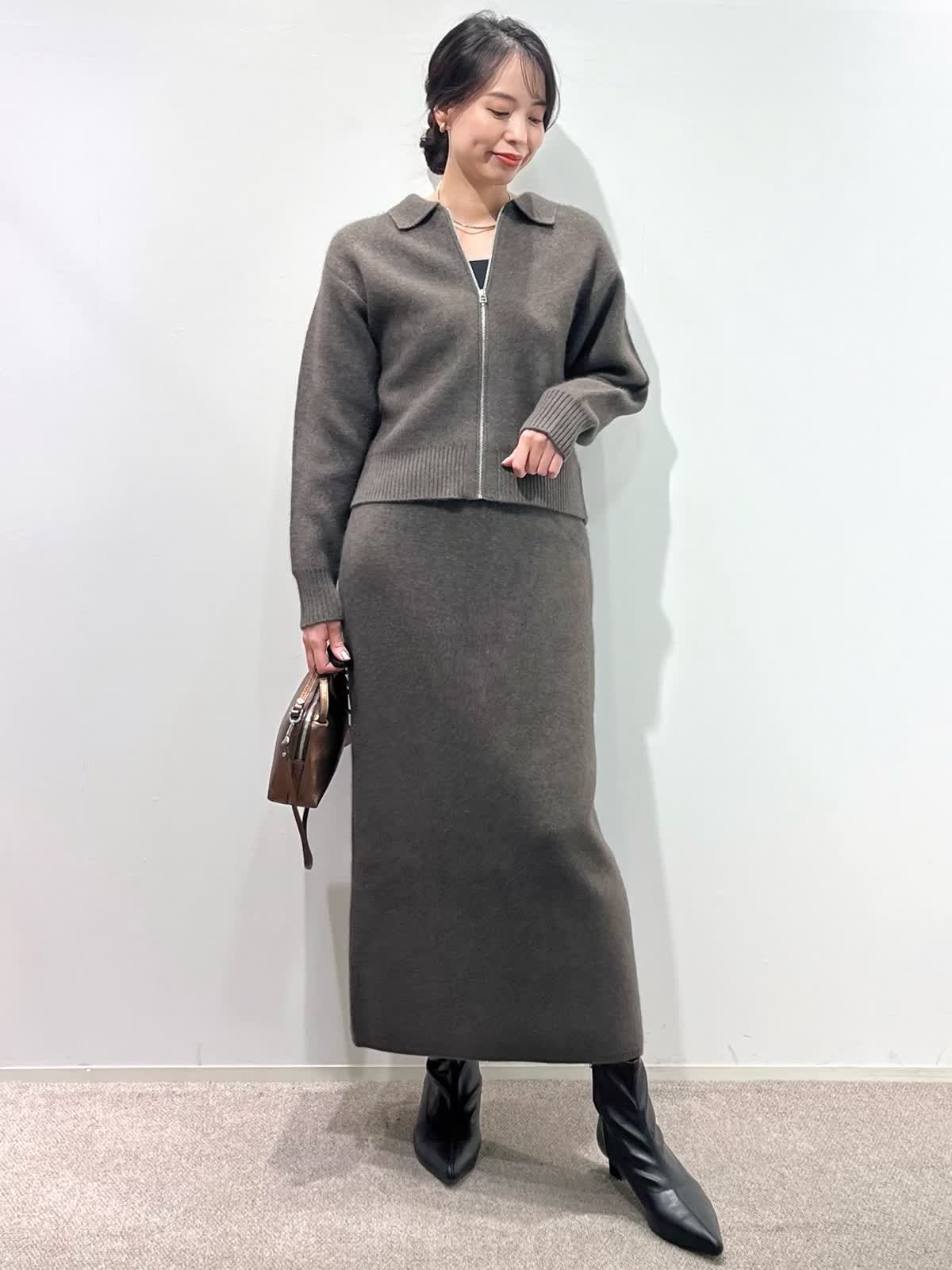 【着用サイズ】カーディガン:9号 カットソー: スカート:9号 【着用カラー】カーディガン:ブラウン カットソー:ブラック スカート:ブラウン バッグ:キンチャ 「冬の上質フォックスのニットアップコーデ」 フォックスブレンドの上質素材のニットアップ。ジップカーディガンは、1枚着や羽織りにもなる万能デザイン。小さめな衿元と、すっきりしたサイズ感で、ブラウンカラーが上品に着こなせるアイテム。同素材のスカートのセットアップがおすすめ。スカートは、体のラインを拾わず、柔らかくふわふわな素材感で、楽に着用できるデザインです。今年のトレンドカラーのブラウンで仕上げた、着るだけでサマになるおすすめのニットアップコーデ。