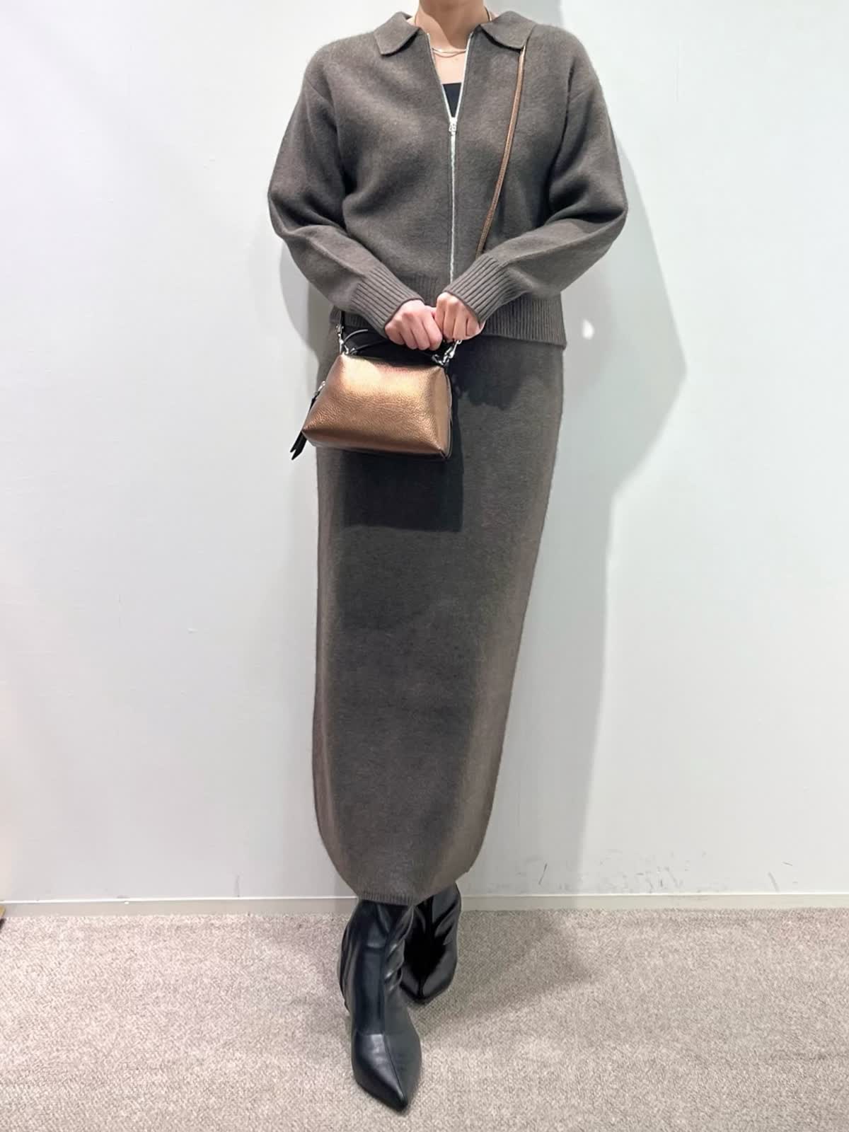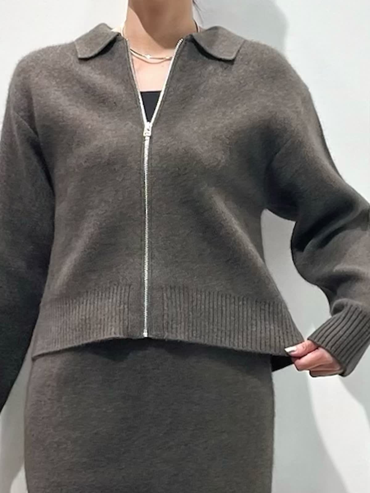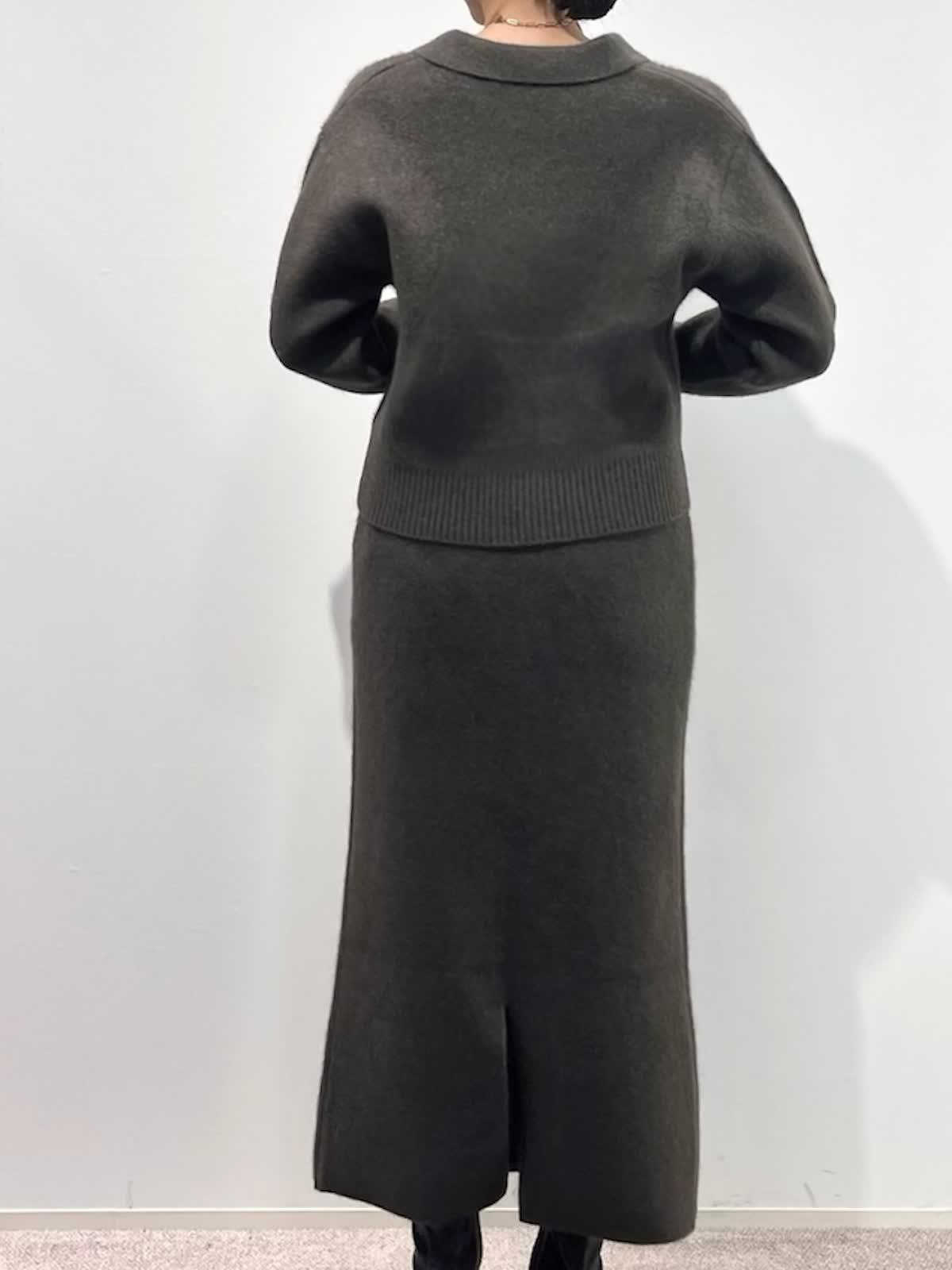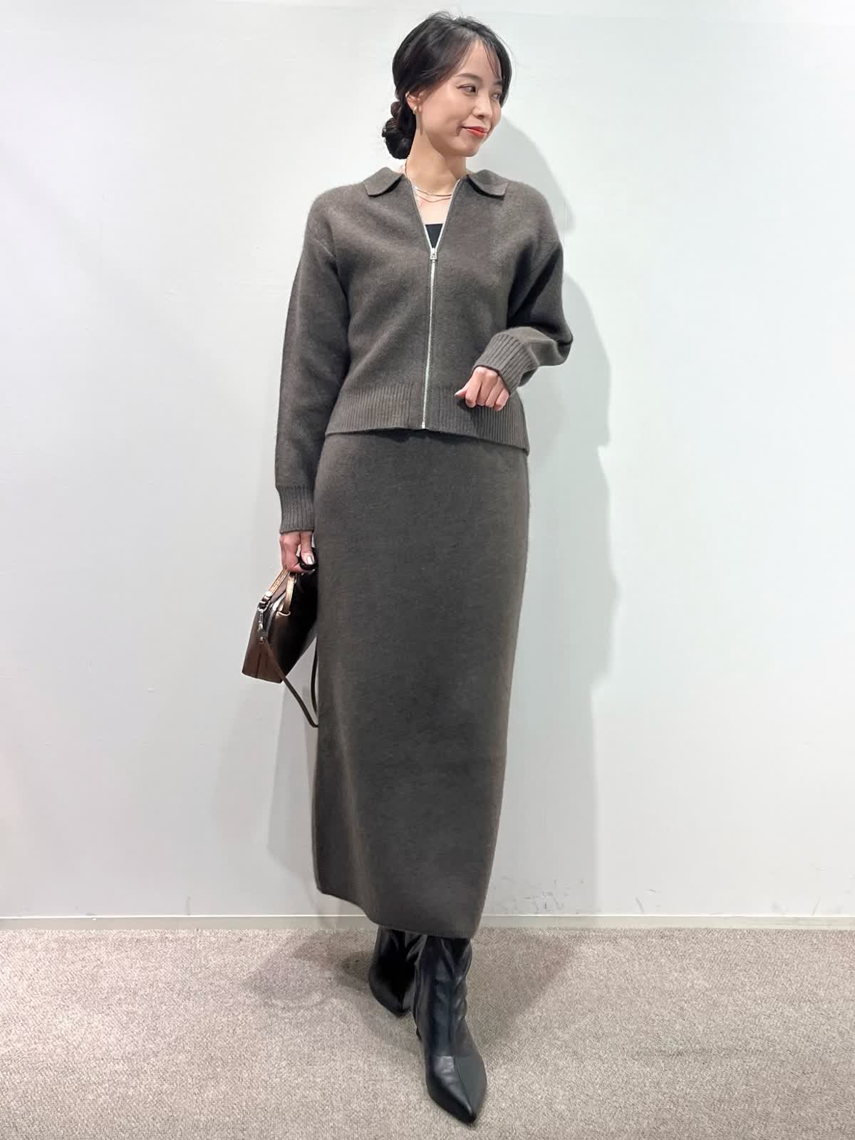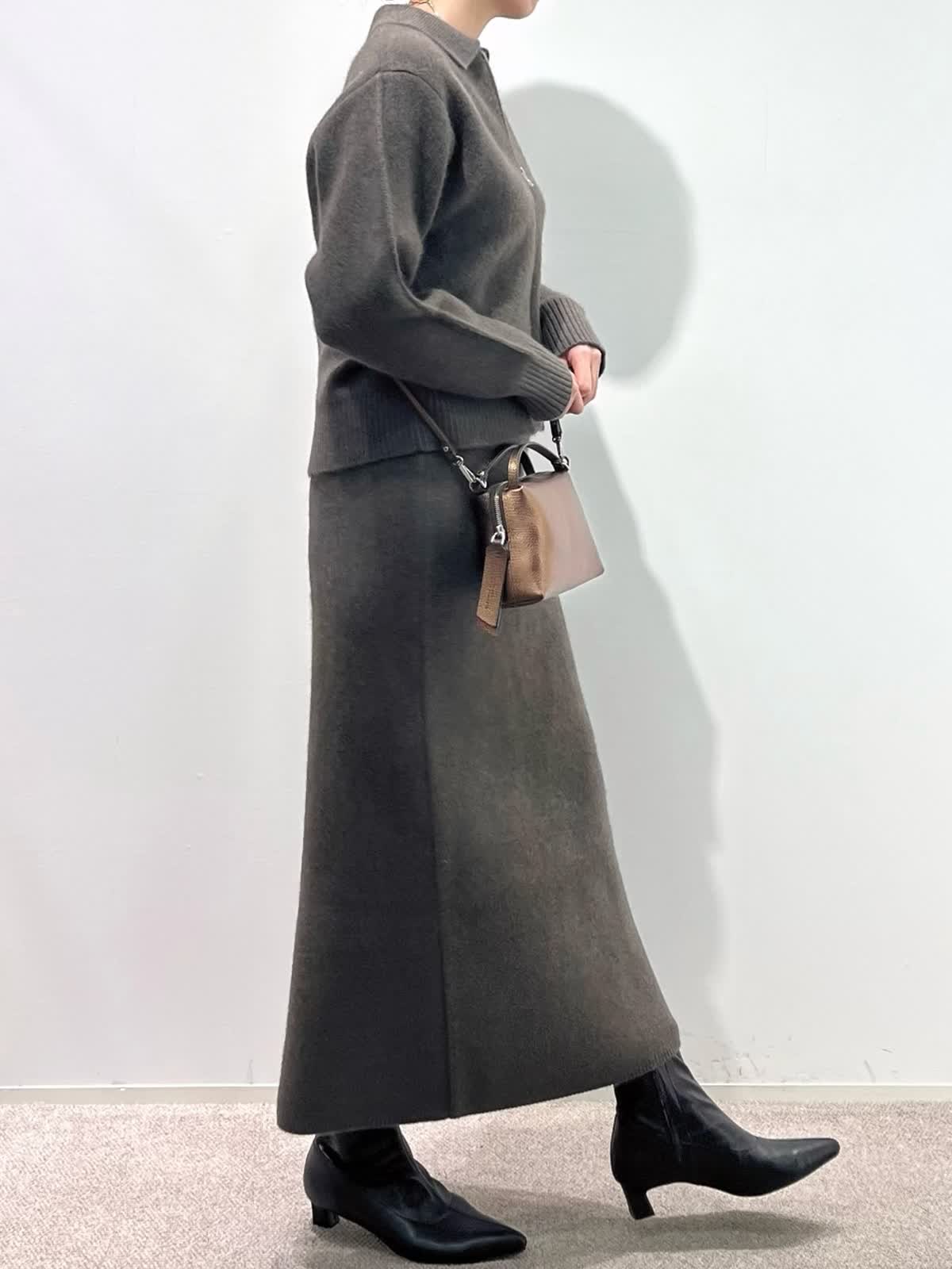 【着用サイズ】カーディガン:9号 カットソー: スカート:9号 【着用カラー】カーディガン:ブラウン カットソー:ブラック スカート:ブラウン バッグ:キンチャ 「冬の上質フォックスのニットアップコーデ」 フォックスブレンドの上質素材のニットアップ。ジップカーディガンは、1枚着や羽織りにもなる万能デザイン。小さめな衿元と、すっきりしたサイズ感で、ブラウンカラーが上品に着こなせるアイテム。同素材のスカートのセットアップがおすすめ。スカートは、体のラインを拾わず、柔らかくふわふわな素材感で、楽に着用できるデザインです。今年のトレンドカラーのブラウンで仕上げた、着るだけでサマになるおすすめのニットアップコーデ。