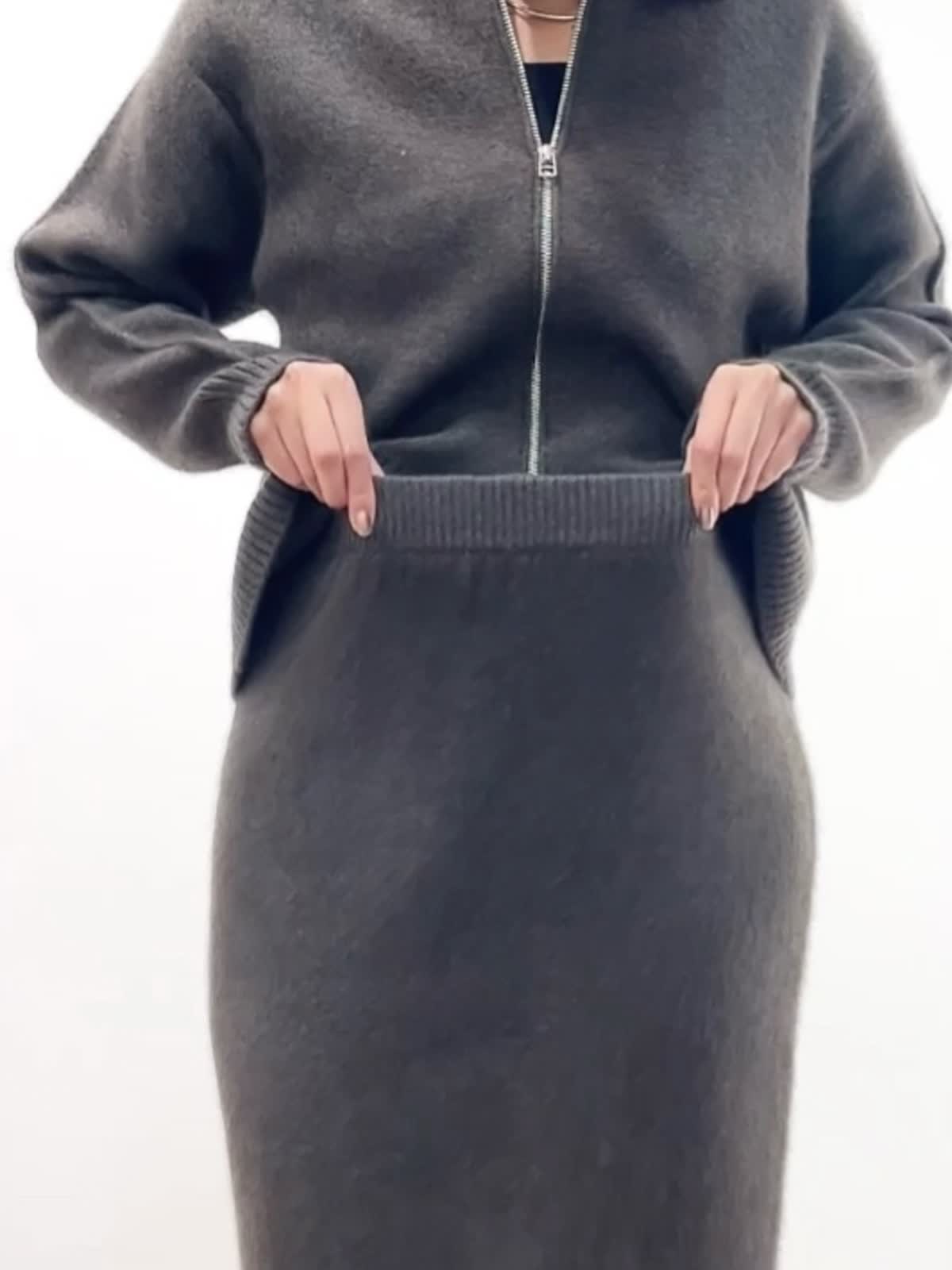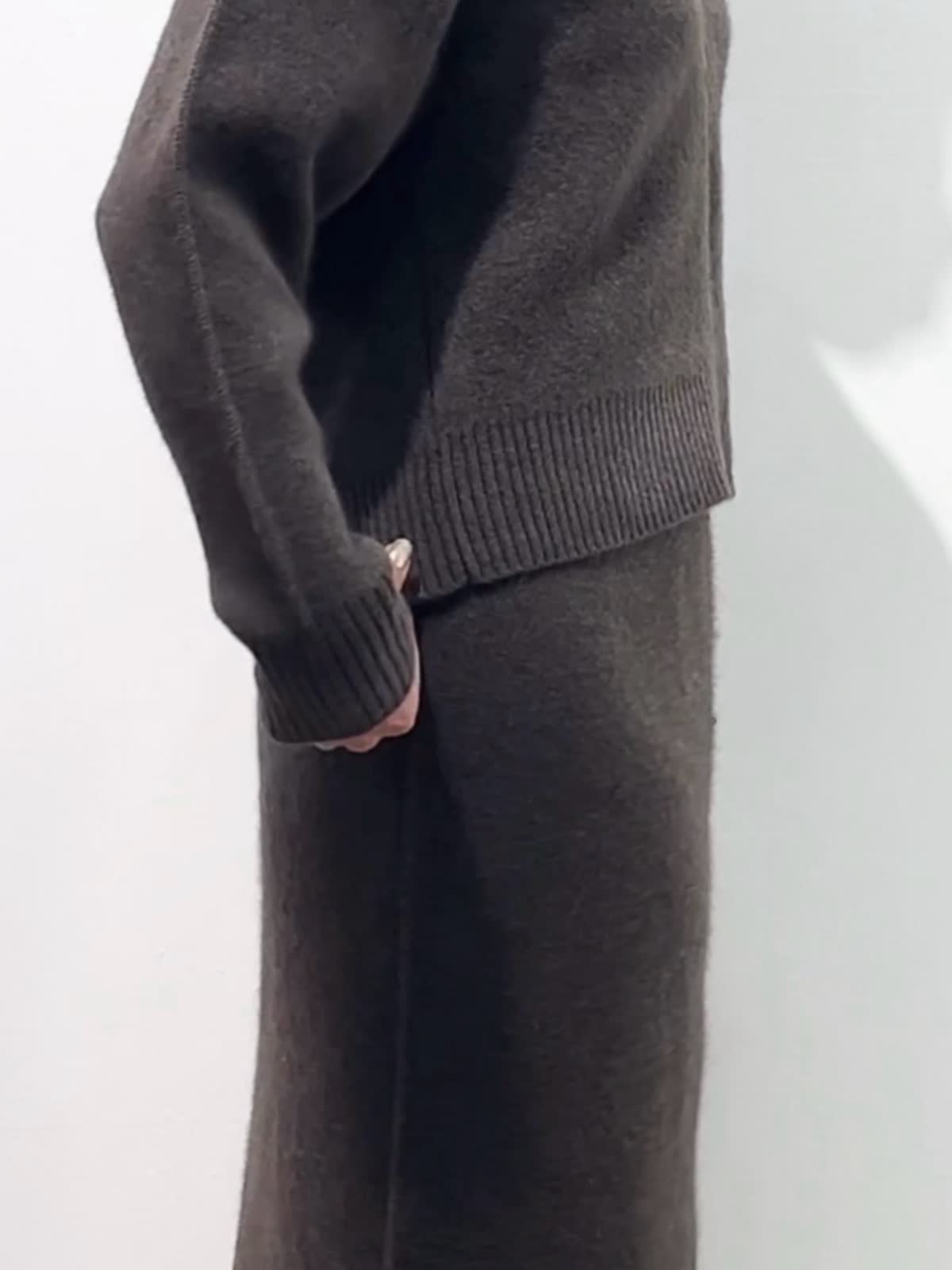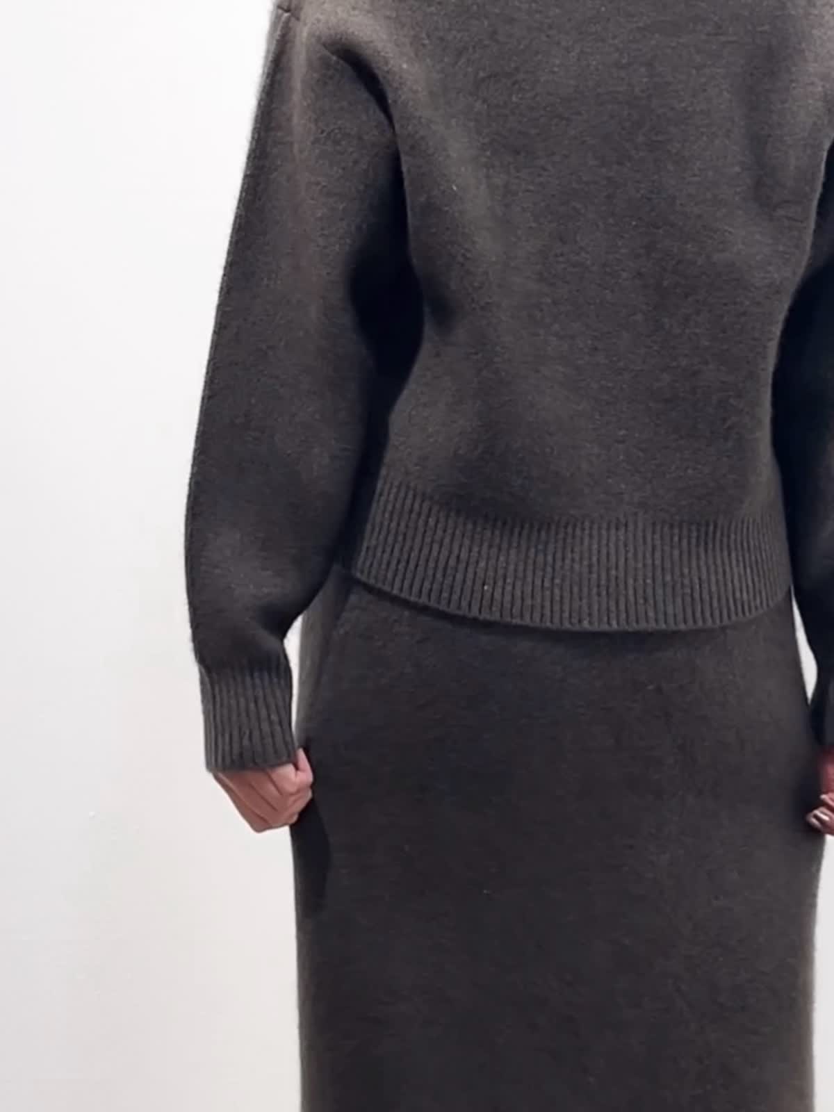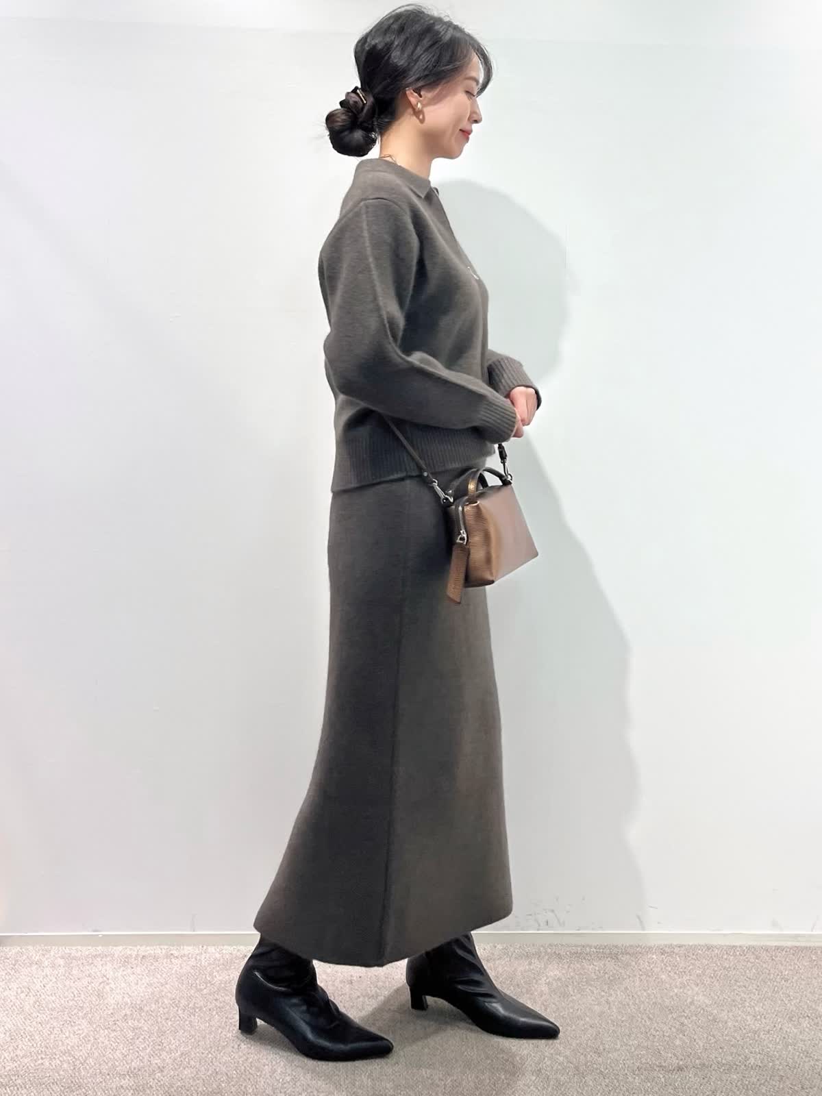 【着用サイズ】カーディガン:9号 カットソー: スカート:9号 【着用カラー】カーディガン:ブラウン カットソー:ブラック スカート:ブラウン バッグ:キンチャ 「冬の上質フォックスのニットアップコーデ」 フォックスブレンドの上質素材のニットアップ。ジップカーディガンは、1枚着や羽織りにもなる万能デザイン。小さめな衿元と、すっきりしたサイズ感で、ブラウンカラーが上品に着こなせるアイテム。同素材のスカートのセットアップがおすすめ。スカートは、体のラインを拾わず、柔らかくふわふわな素材感で、楽に着用できるデザインです。今年のトレンドカラーのブラウンで仕上げた、着るだけでサマになるおすすめのニットアップコーデ。