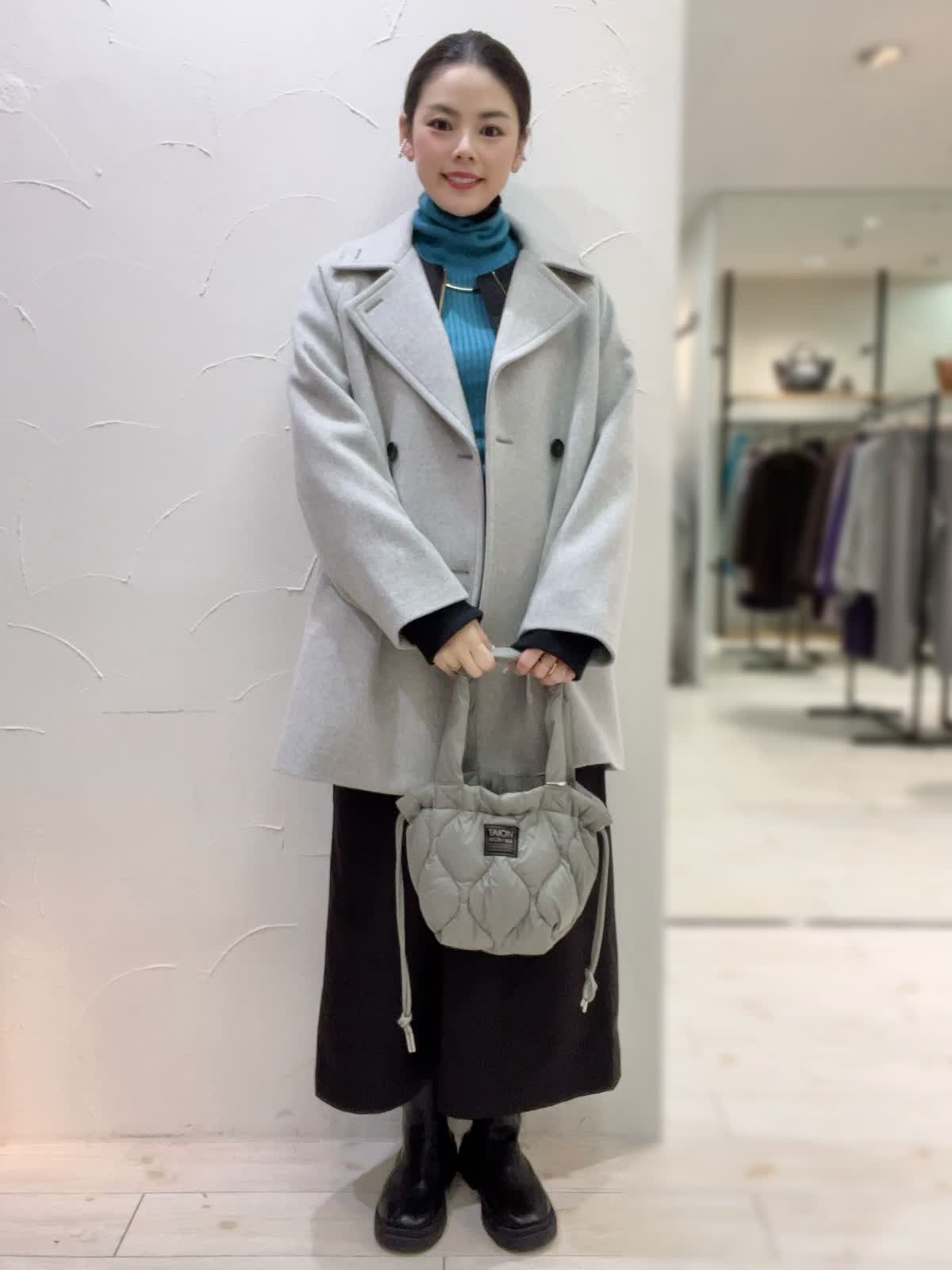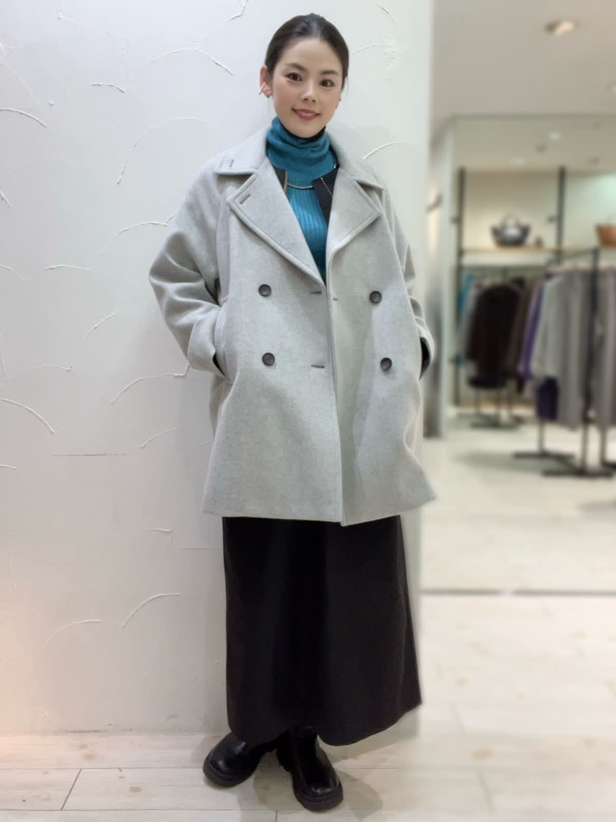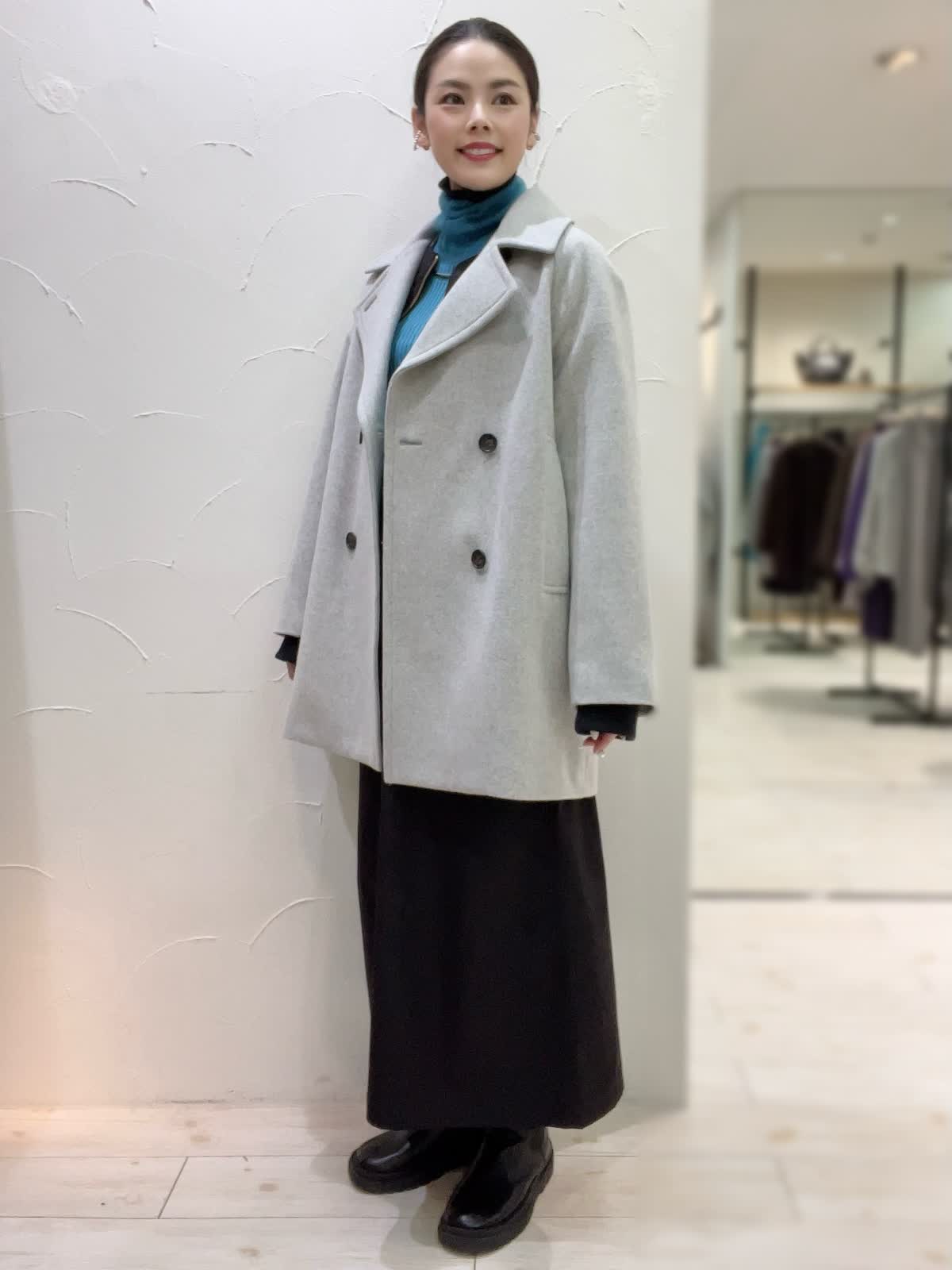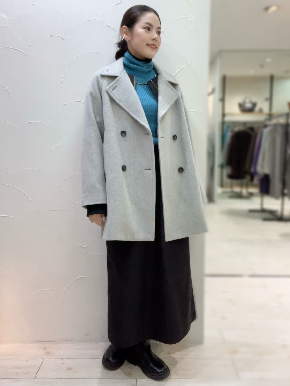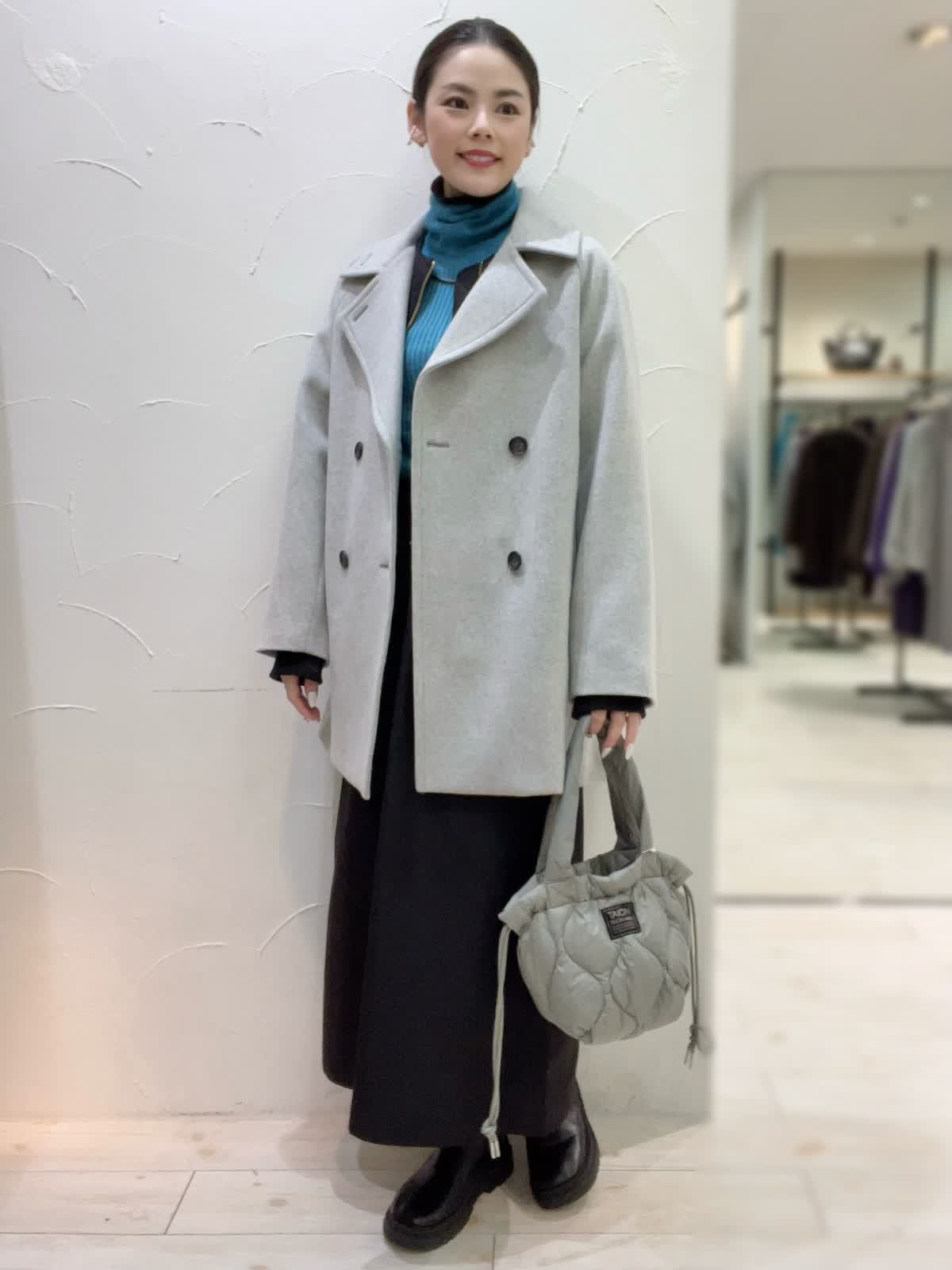 【着用サイズ】全て9号orフリーサイズ 【着用カラー】コート:グレー ブルゾン:ブラック ニット:ターコイズブルー スカート:ブラック 冬のお出かけコーディネート。ライトアウターのブルゾンの上にも羽織れるゆるっとしたサイジングのPコート。軽い素材で肩のこらない素材です。カジュアルスタイルにはもちろん、きちんとしたスタイリングに合わせても◎