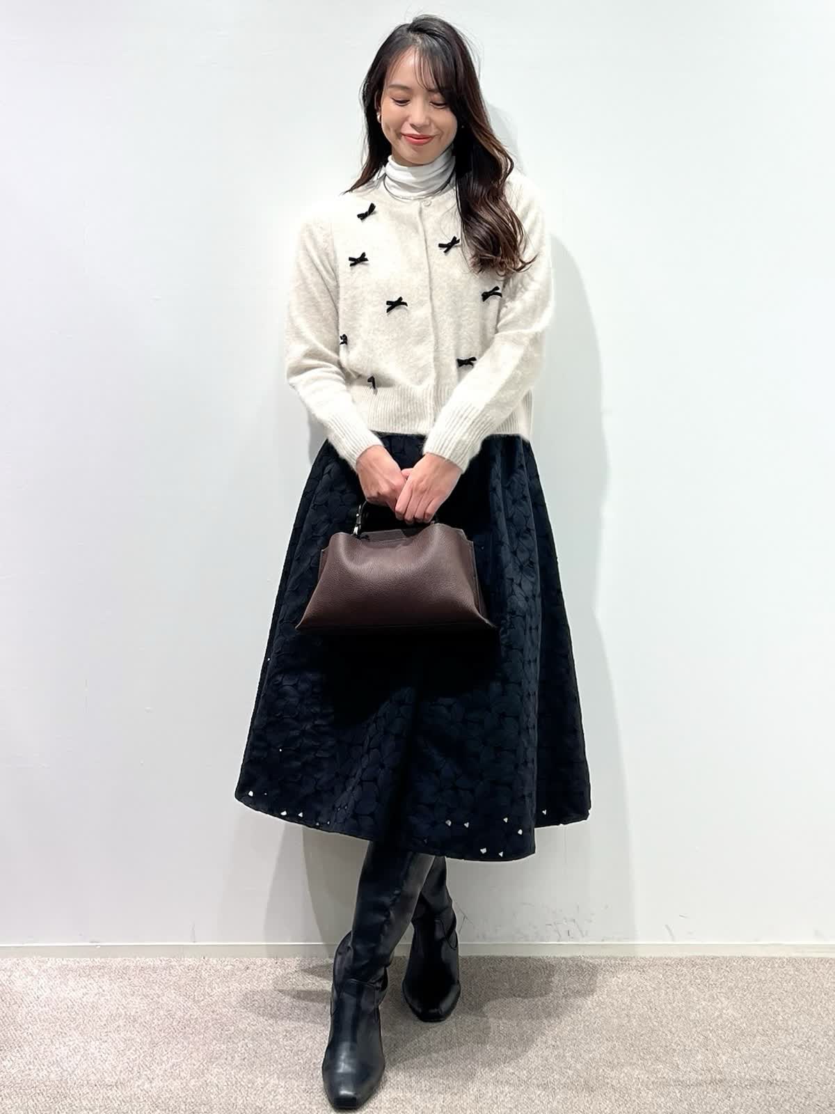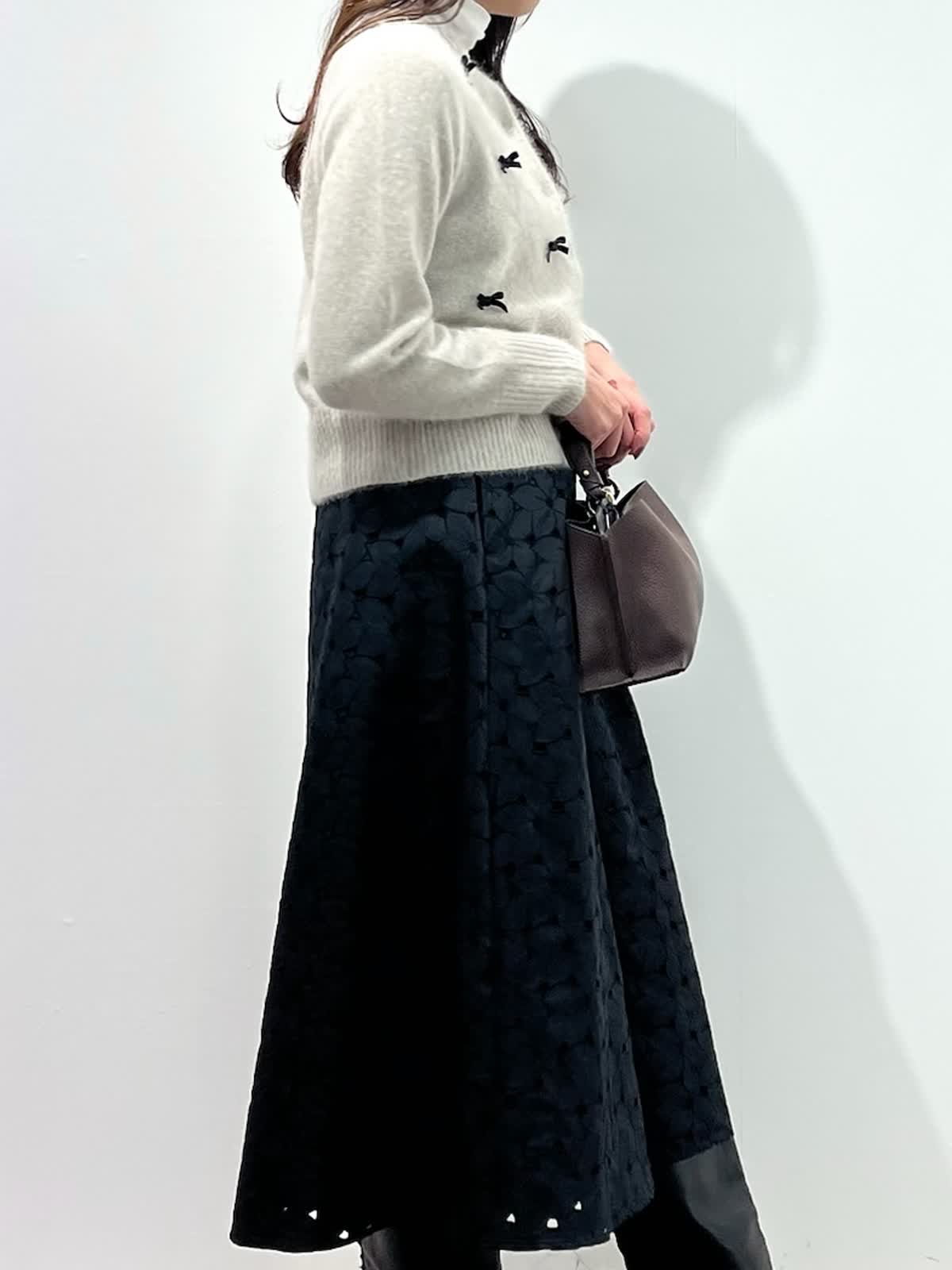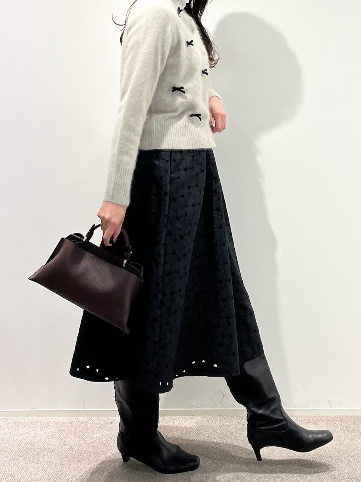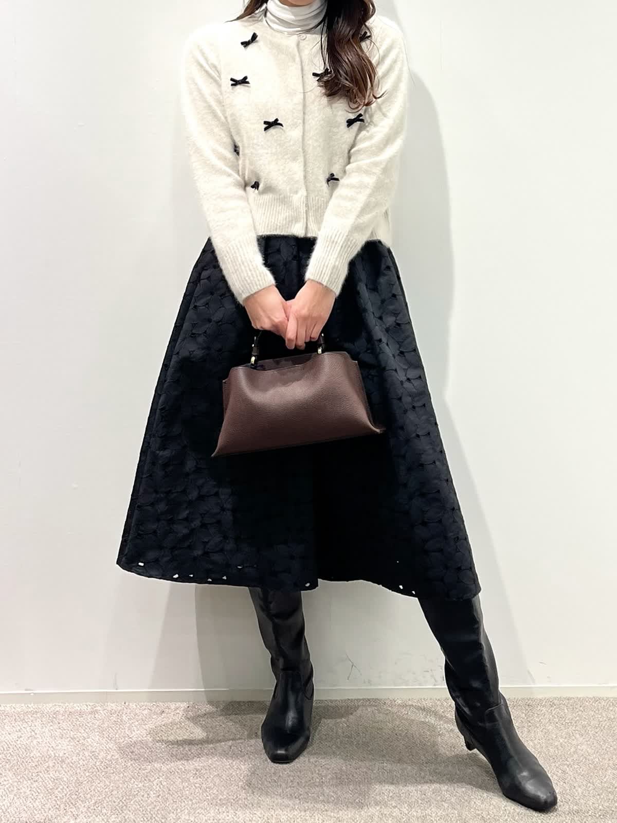 【着用サイズ】カーディガン:9号 カットソー:9号 スカート:9号 【着用カラー】カーディガン:グレーベージュ カットソー:オフホワイト スカート:ブラック バッグ:ダークブラウン 「王道フェミニン冬のお出かけコーデ」 配色のベロアリボンがポイントのフェミニンカーディガン。あたたかく、軽くて柔らかいフォックスにシルク混を合わせた上質な素材。スカートやワンピースに羽織るだけで、華やかさがプラスされるデザインです。ボトムは、フラワー刺繍タックスカートで、エレガントな印象に着こなせます。花柄の刺繍と、大きめなタックが、美シルエットに揺れるデザイン。フォックスニットとのスタイリングでおすすめな王道フェミニンコーデです。