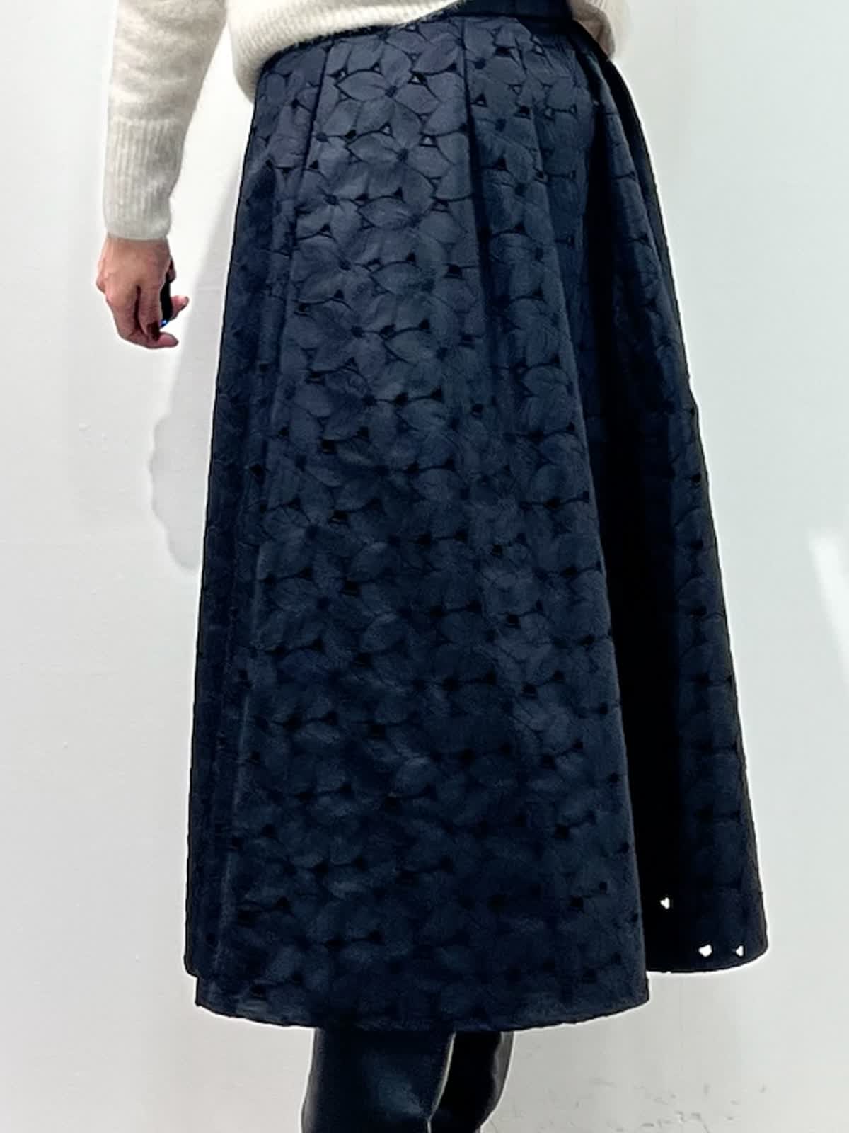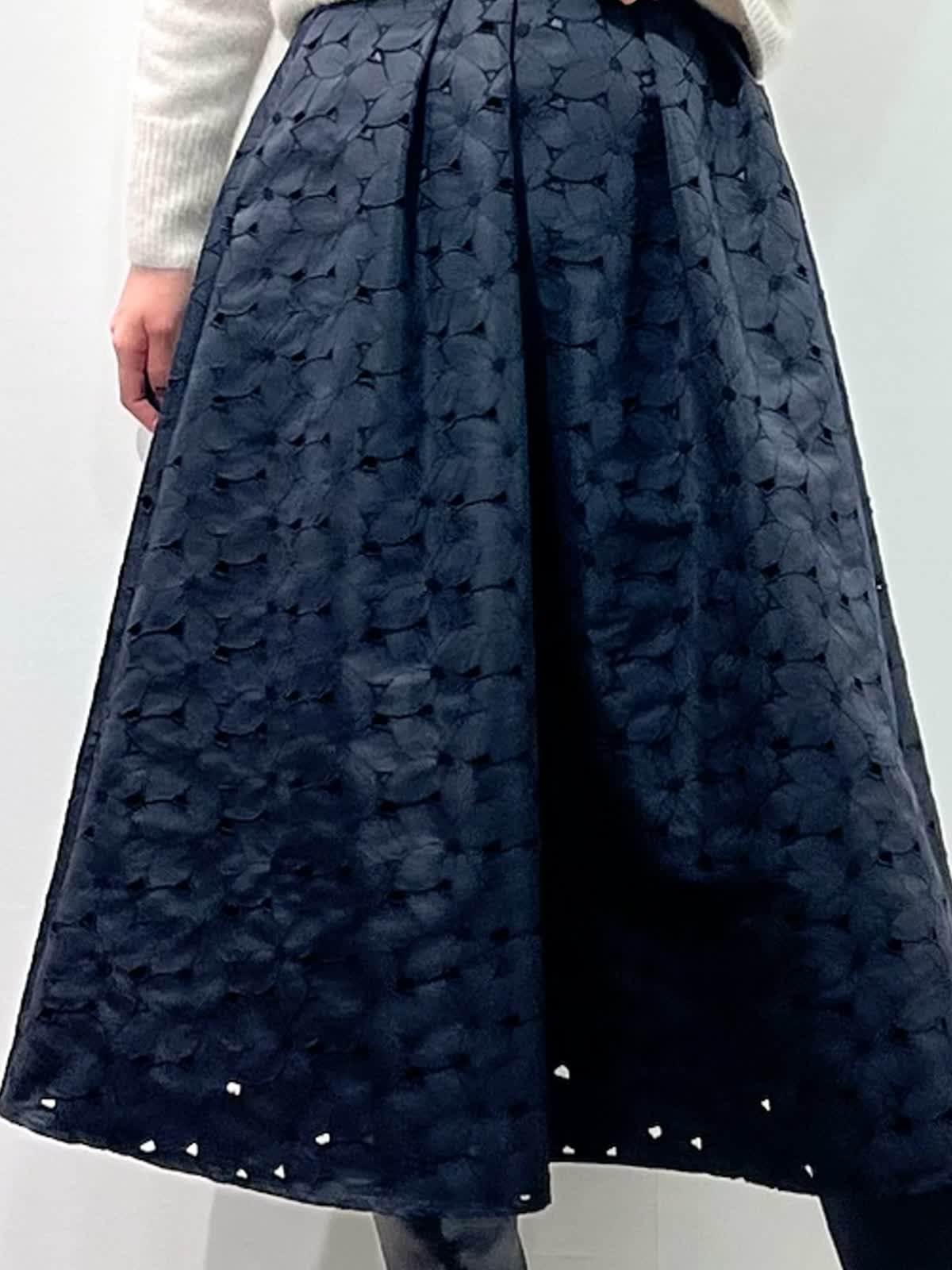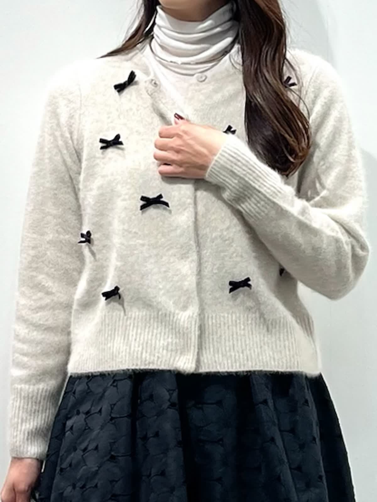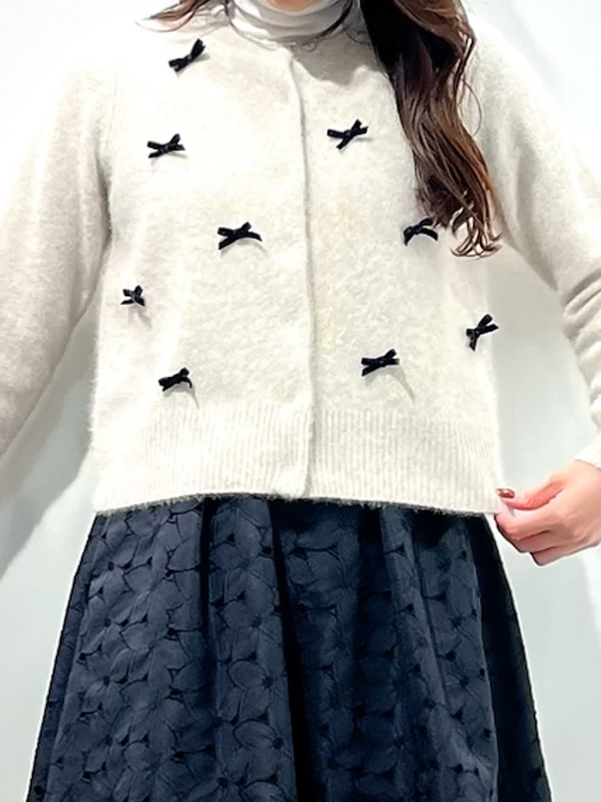 【着用サイズ】カーディガン:9号 カットソー:9号 スカート:9号 【着用カラー】カーディガン:グレーベージュ カットソー:オフホワイト スカート:ブラック バッグ:ダークブラウン 「王道フェミニン冬のお出かけコーデ」 配色のベロアリボンがポイントのフェミニンカーディガン。あたたかく、軽くて柔らかいフォックスにシルク混を合わせた上質な素材。スカートやワンピースに羽織るだけで、華やかさがプラスされるデザインです。ボトムは、フラワー刺繍タックスカートで、エレガントな印象に着こなせます。花柄の刺繍と、大きめなタックが、美シルエットに揺れるデザイン。フォックスニットとのスタイリングでおすすめな王道フェミニンコーデです。