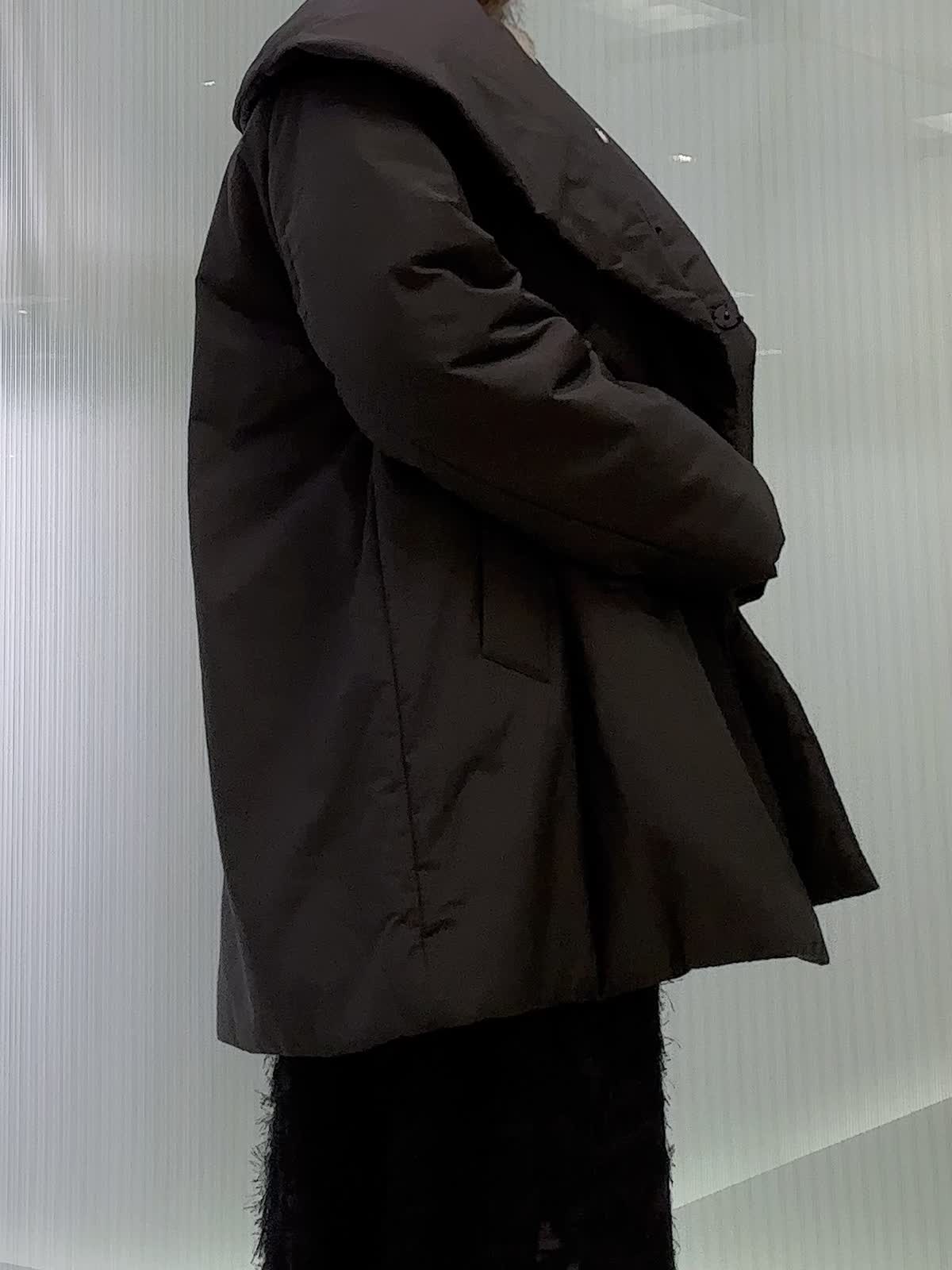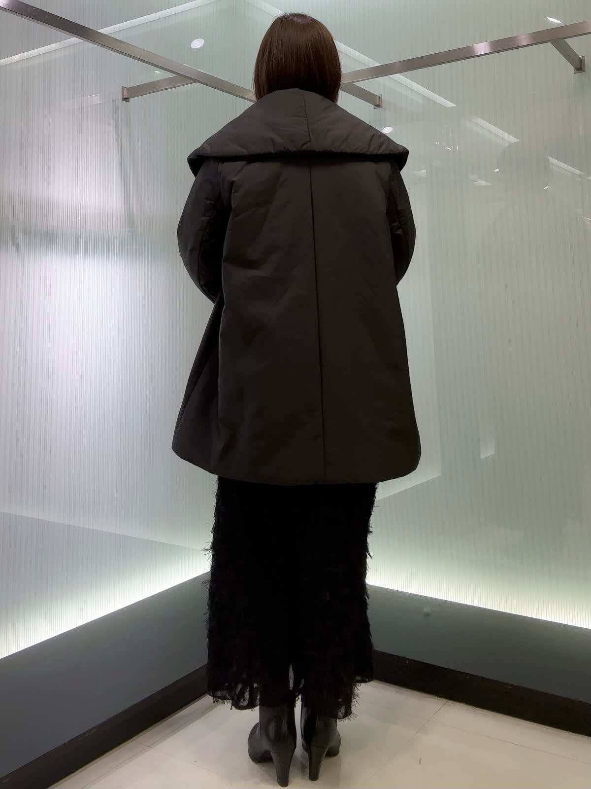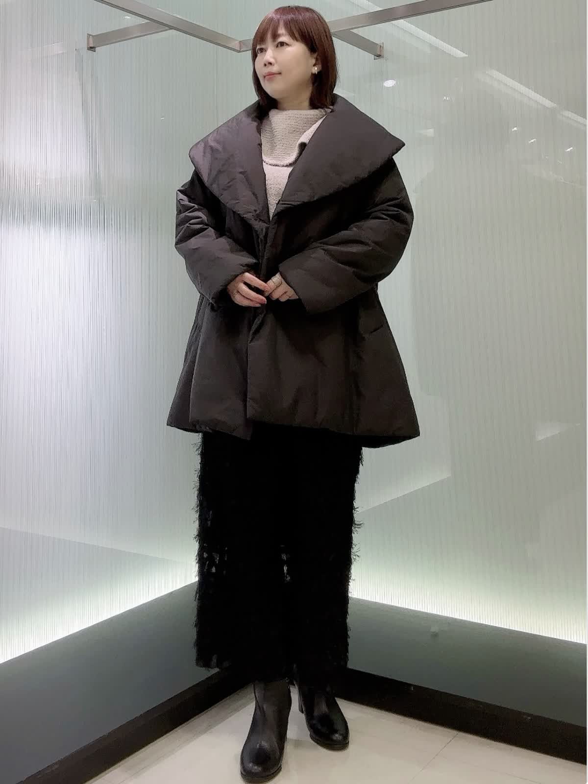 【着用サイズ】全て9号 【着用カラー】アウター.スカート ブラック 大きめのショールカラーが印象的な中綿コートです。撥水機能を備え、急な天候の変化にも対応できます。