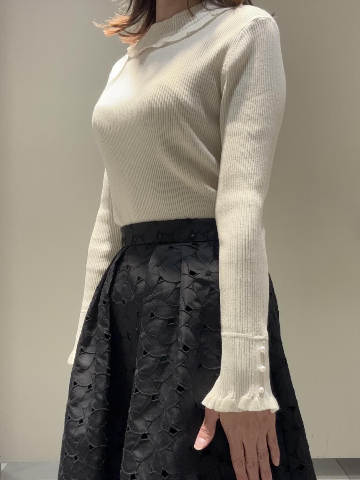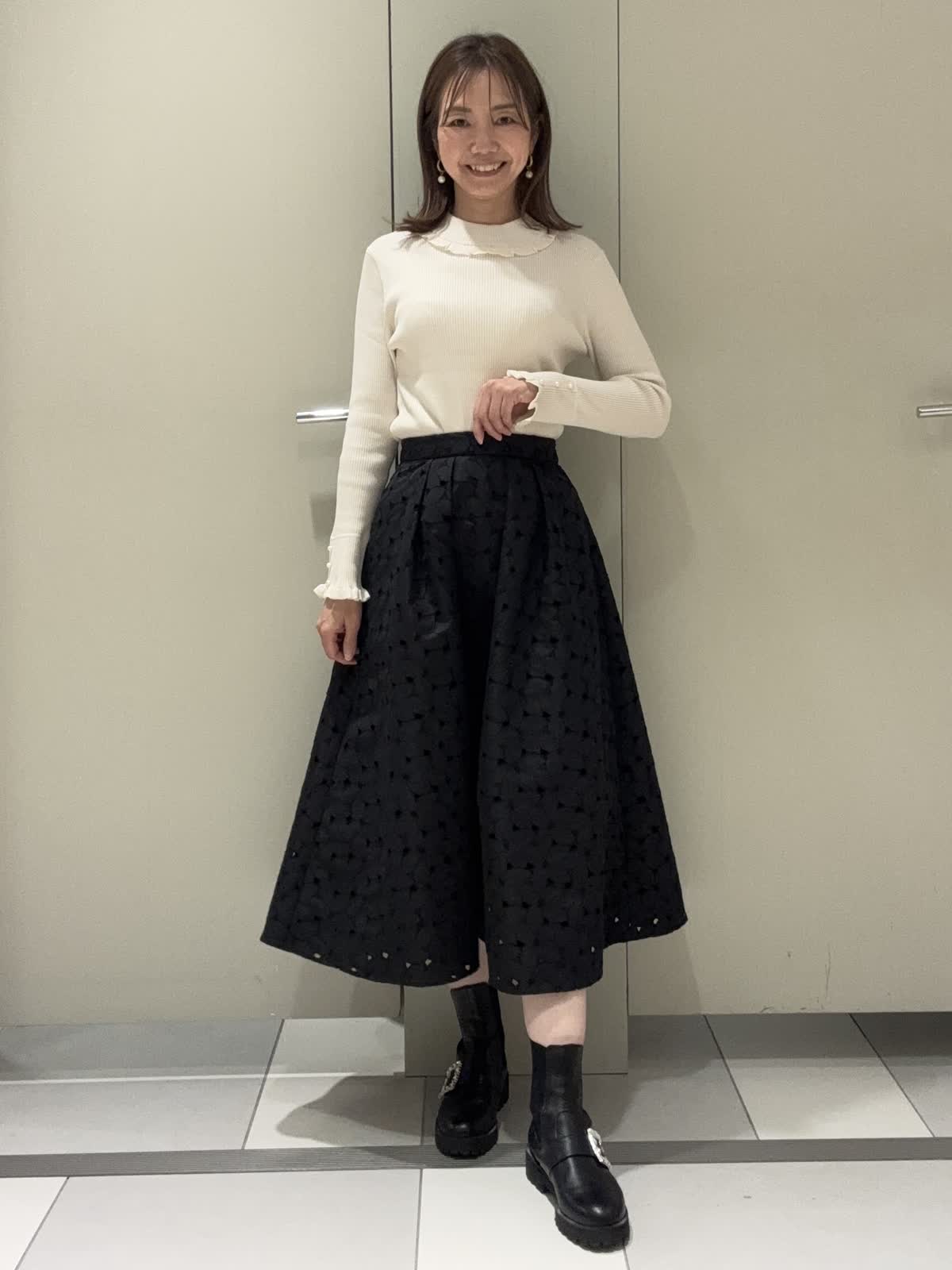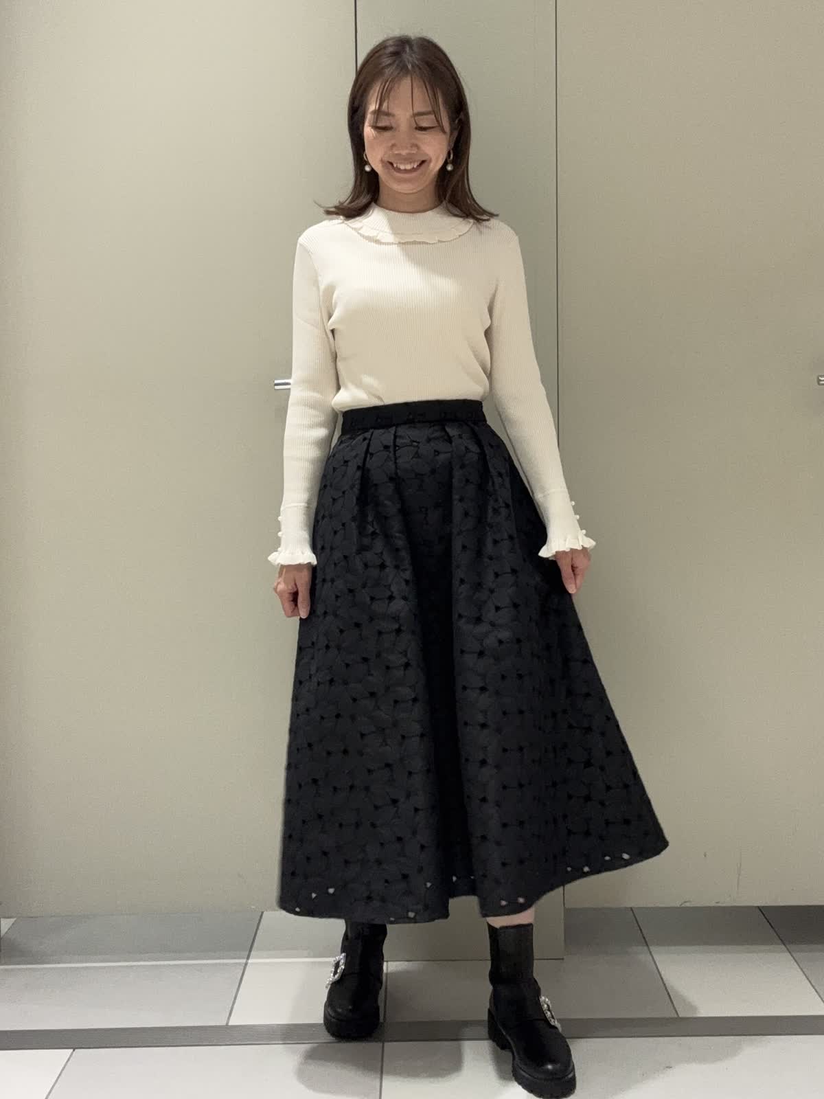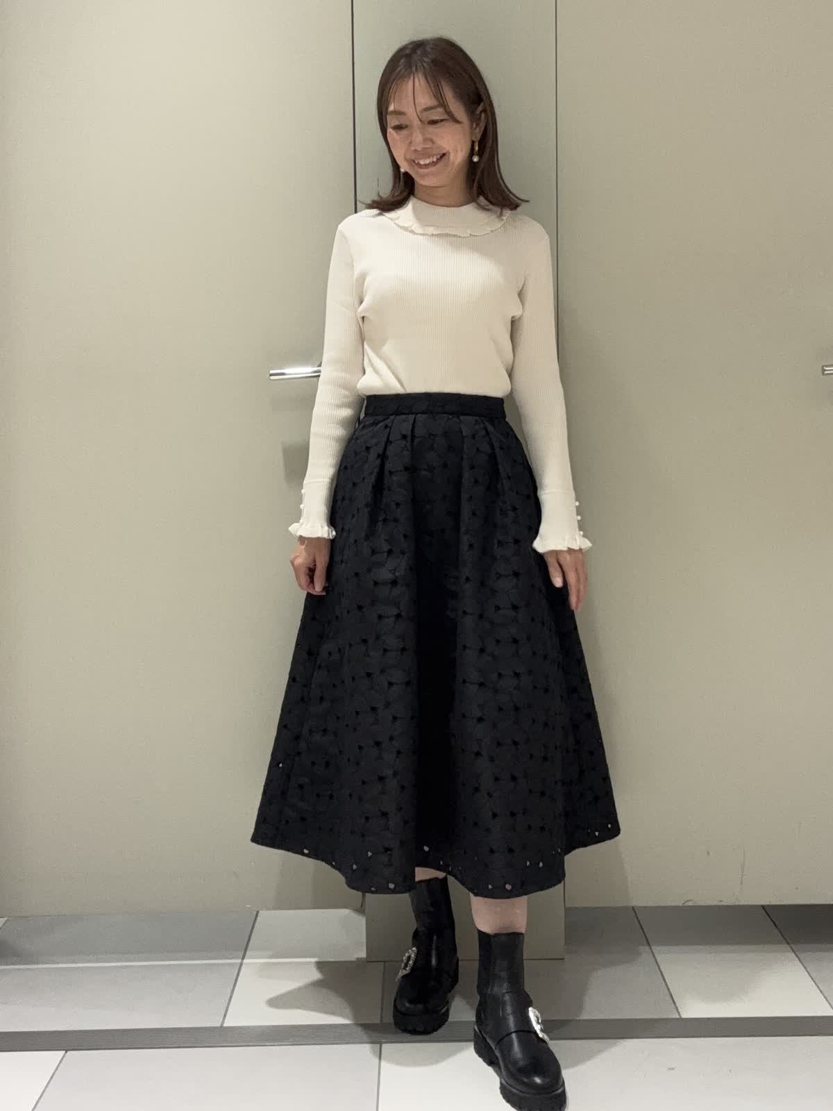 【着用サイズ/カラー】ニット:9号/オフホワイト スカート:9号/ブラック 昨年大人気だったリブニットの新作とレーススカートでモノトーンコーディネート リブニットは伸縮性があり着心地が良く、1枚でも重ね着にもオススメのニットです。合わせたスカートは張り感がありますが、広がりすぎないラインになってます。後ろゴムでいつものサイズで大丈夫です。