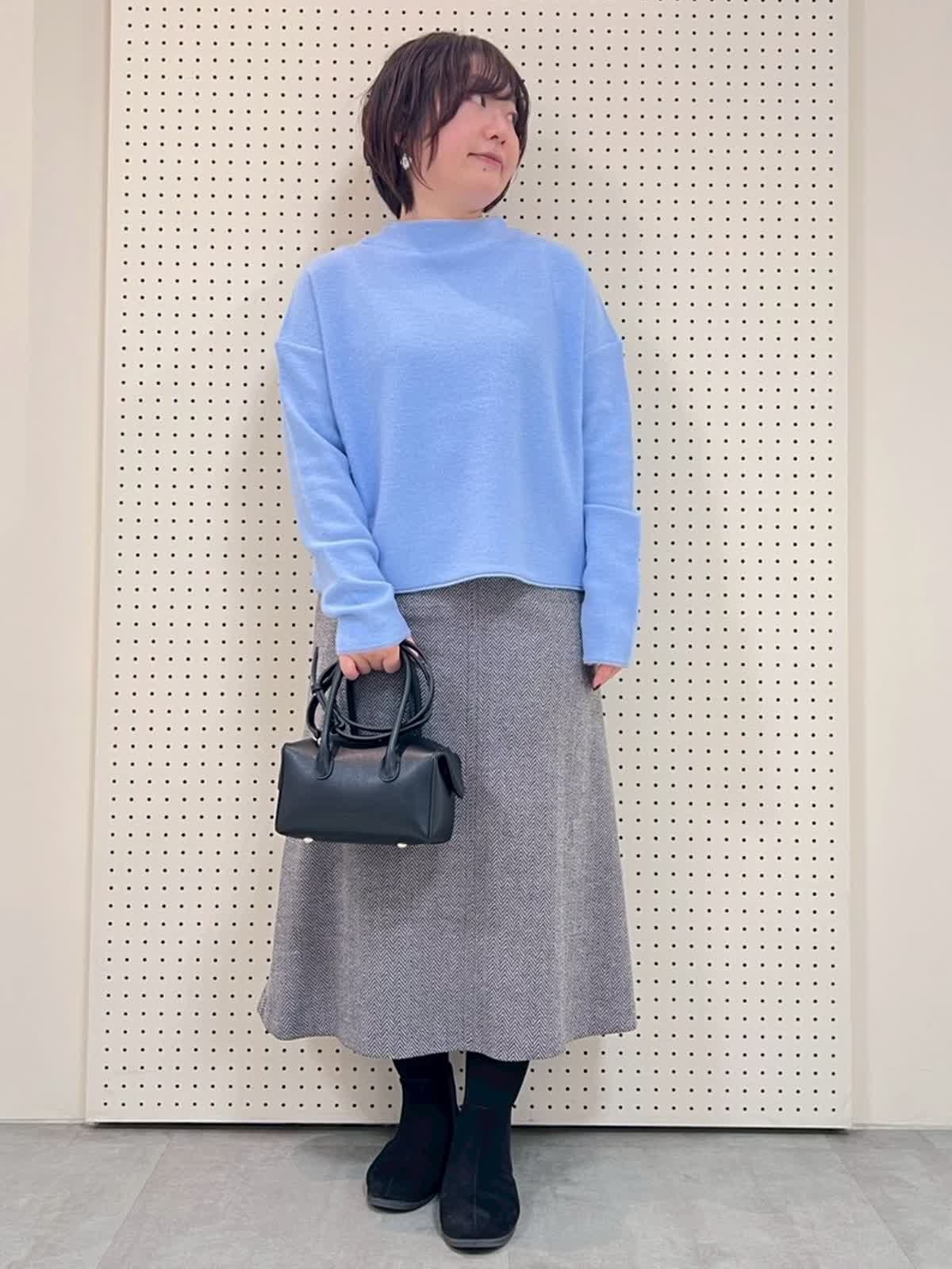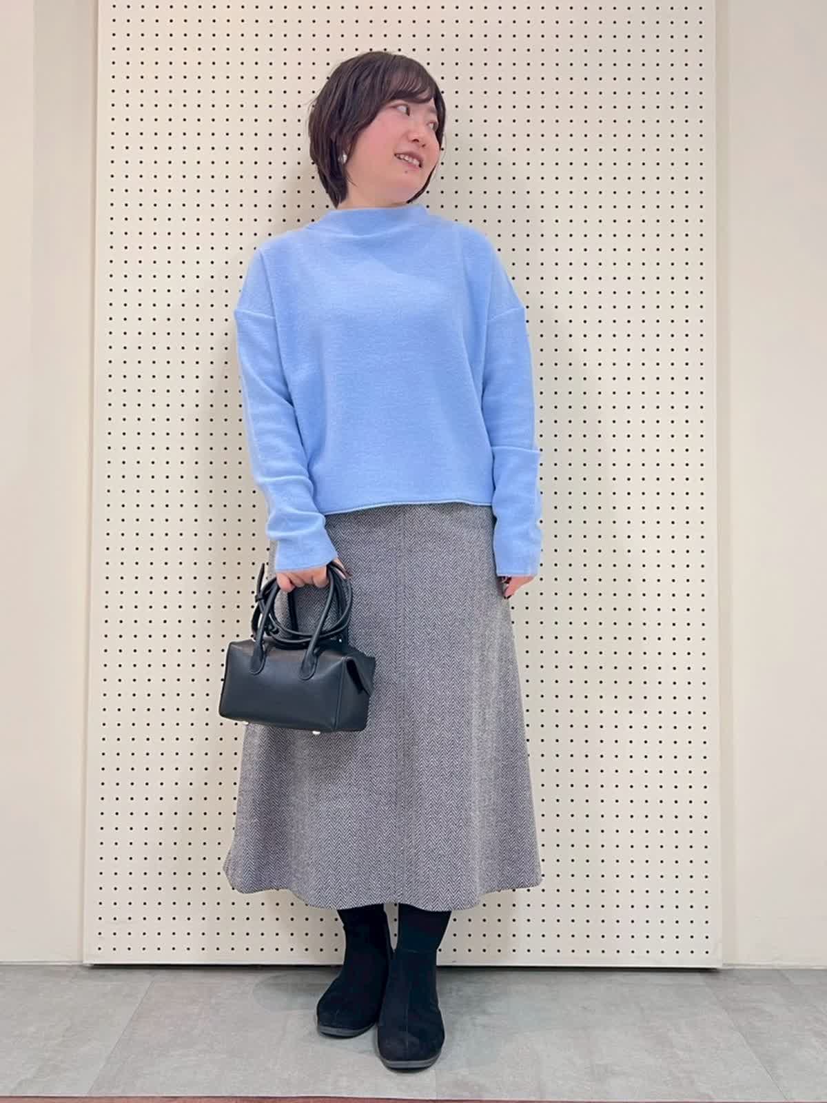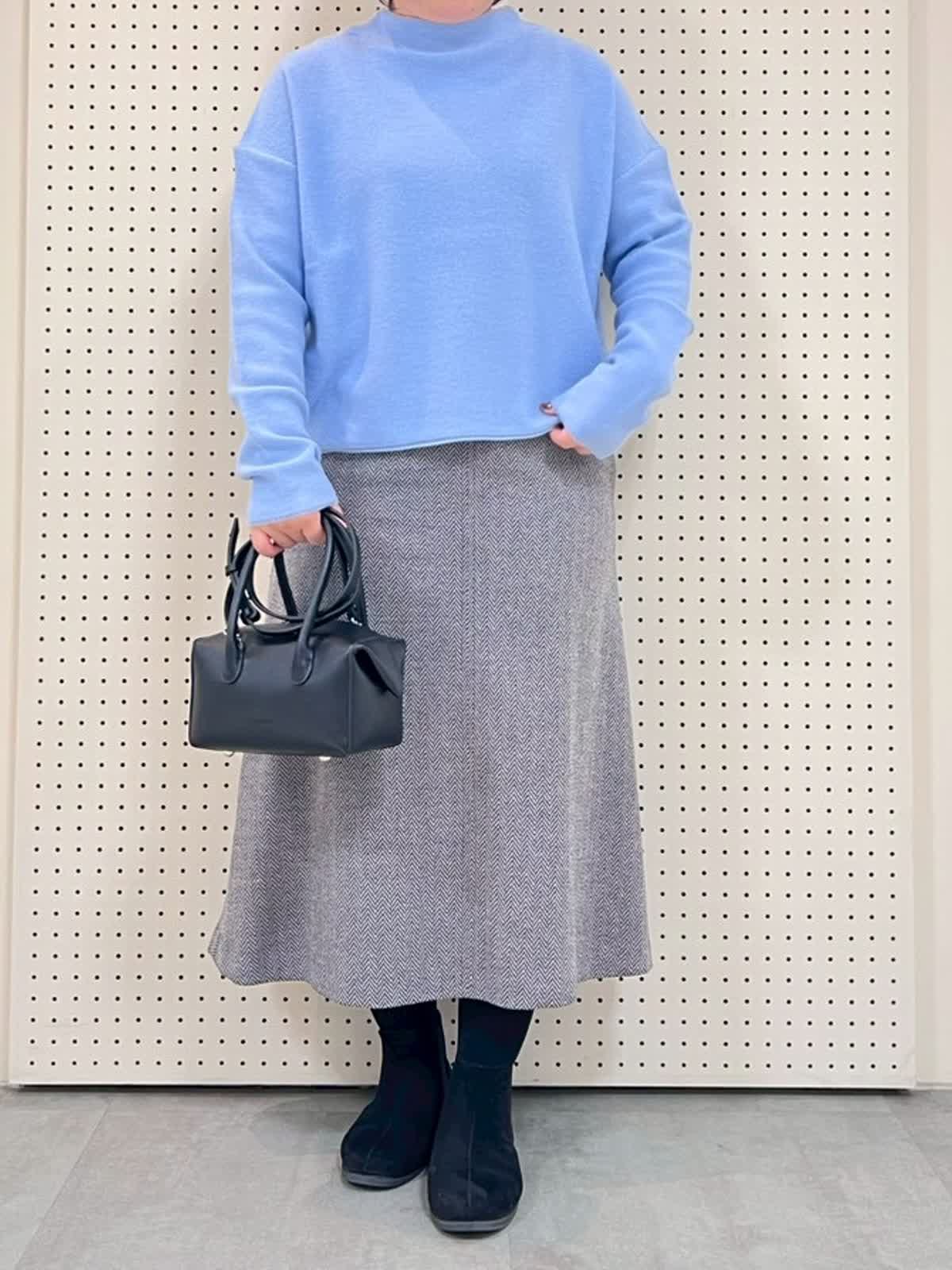 【着用サイズ】全て9号 【着用カラー】ニット:サックス スカート:ブラック 綺麗色ニットコーディネート。ニットは袖周りもゆったりで、薄手ですが暖かいです。身長149pで、腰あたりの長さですっきりしているので、スカートと相性抜群。スカートはウエストゴムで履きやすいです。丈も長すぎずちょうど良くタイツやブーツ合わせがおすすめです。