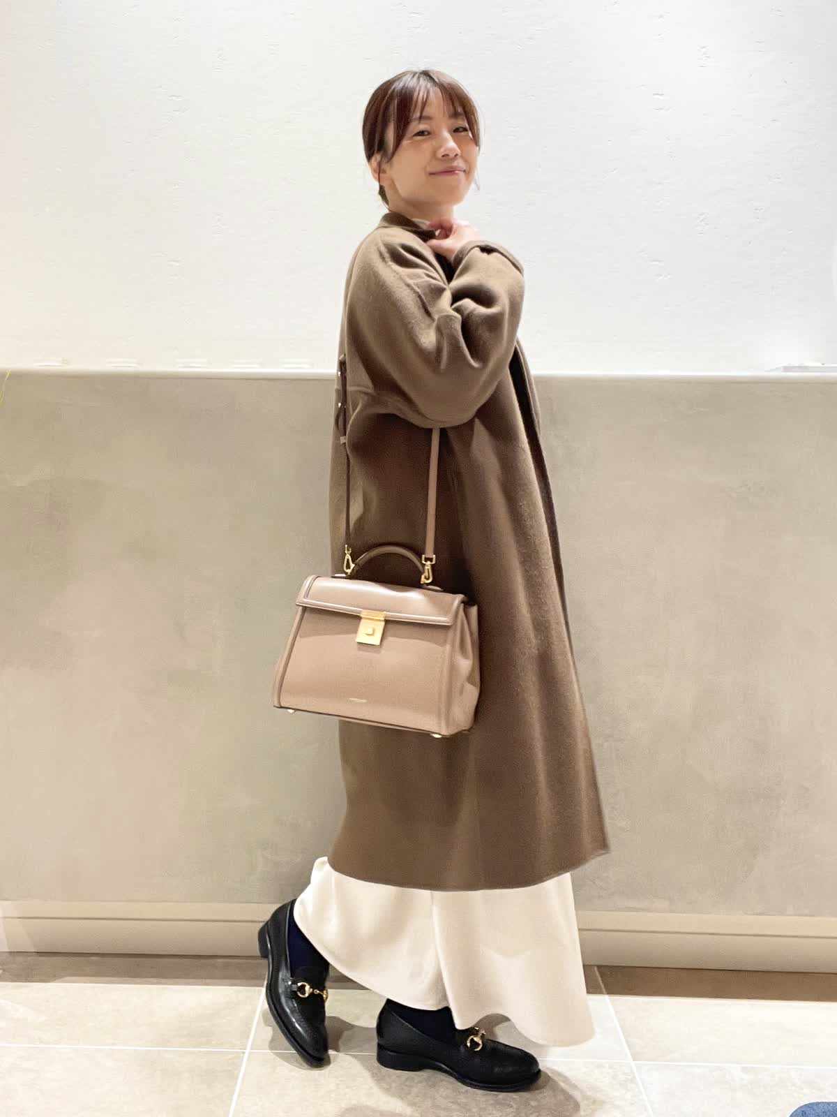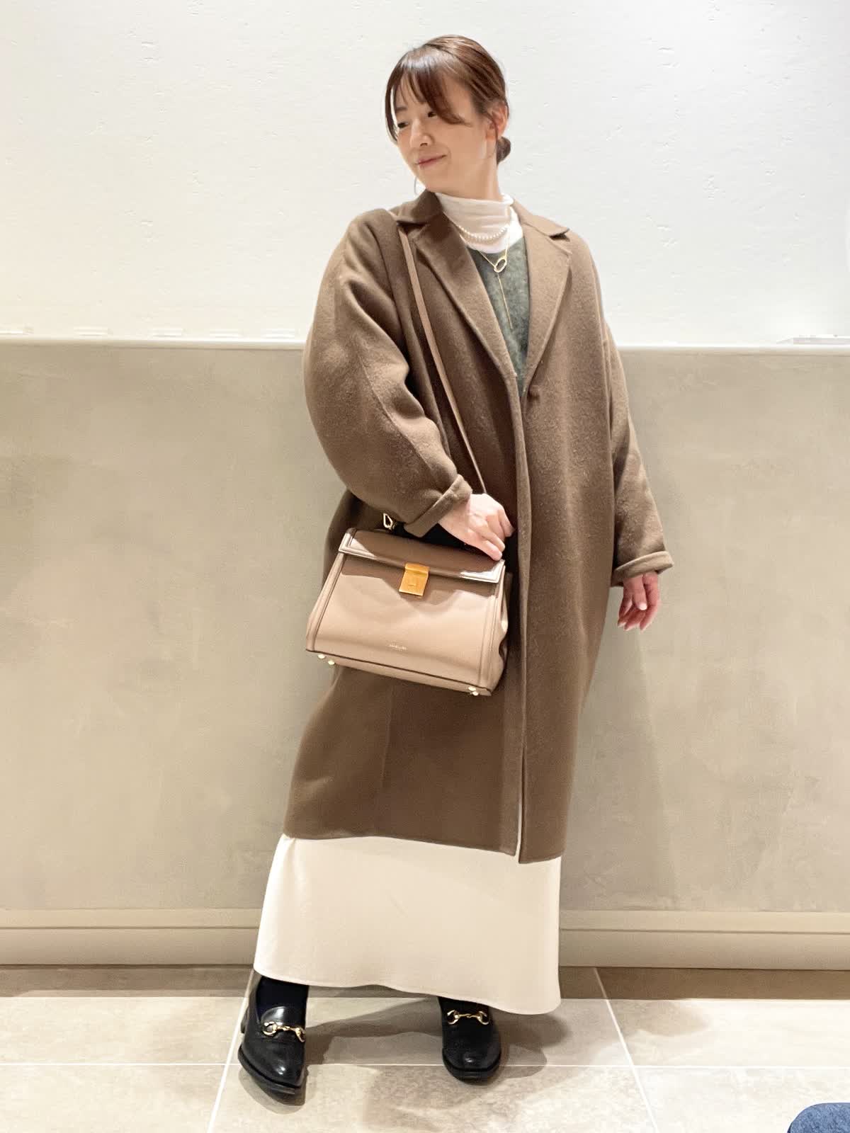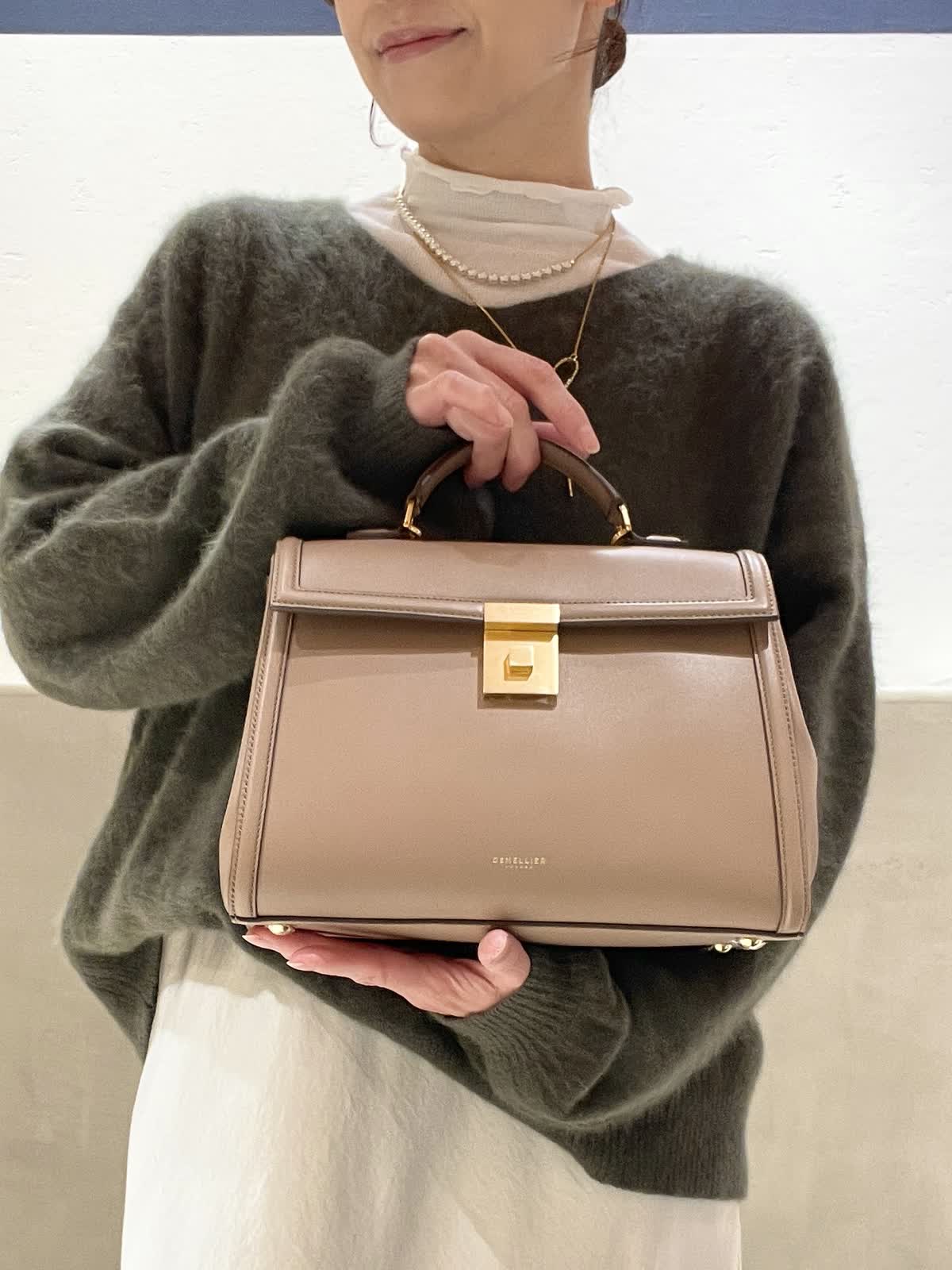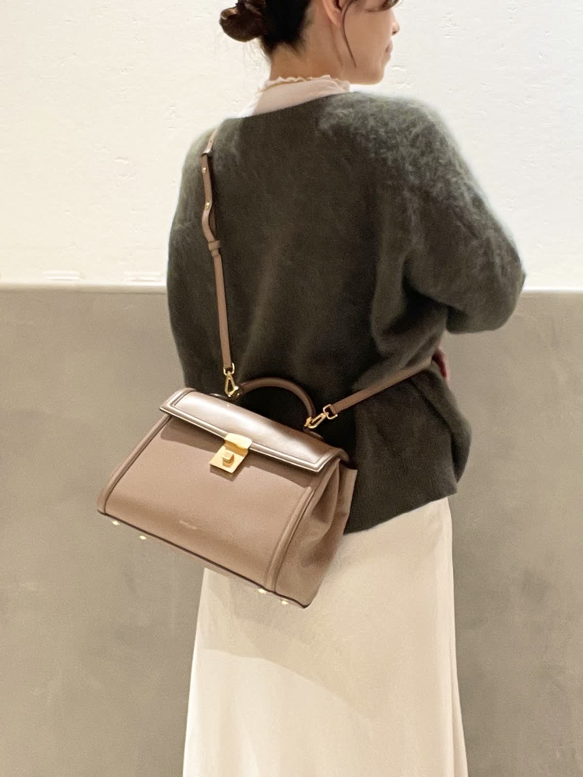 【着用アイテム:カラー/サイズ】 ハイネックカットソー:オフホワイト/9号 バッグ:ベージュ ラリエット:ゴールド DEMELLIERのThe Midi Paris はきちんと感がありながら、フェミニンなスタイリングにも合わせやすいデザイン。中は仕切りがあるので、沢山入れても取り出しやすいです。ショルダーベルト付きで、アウターの上からも肩掛けがスムーズです。
