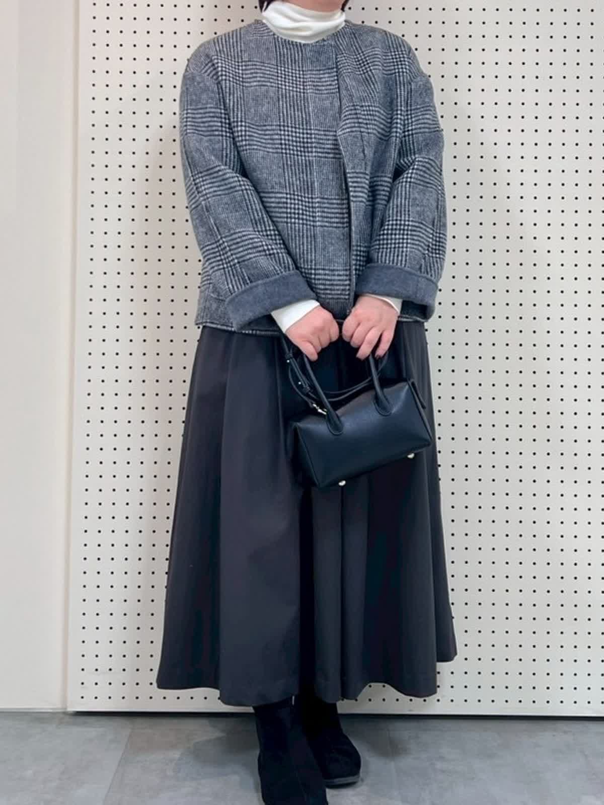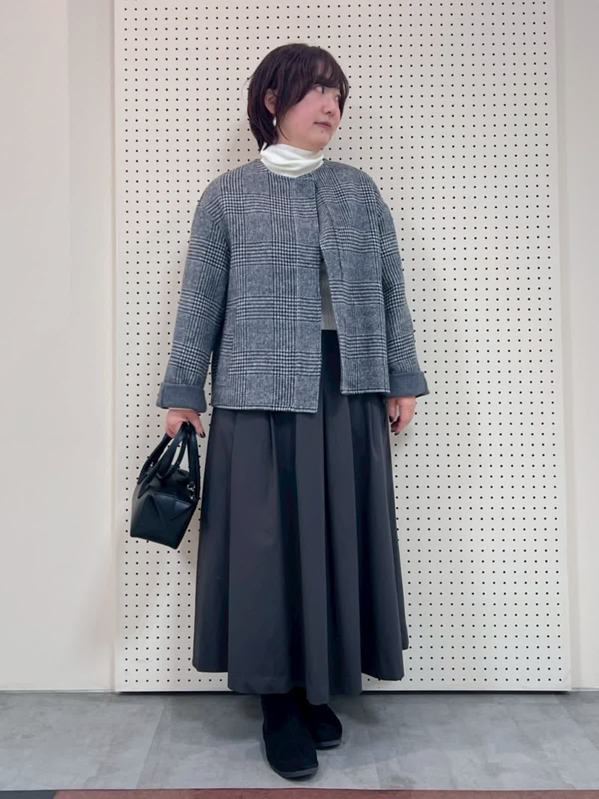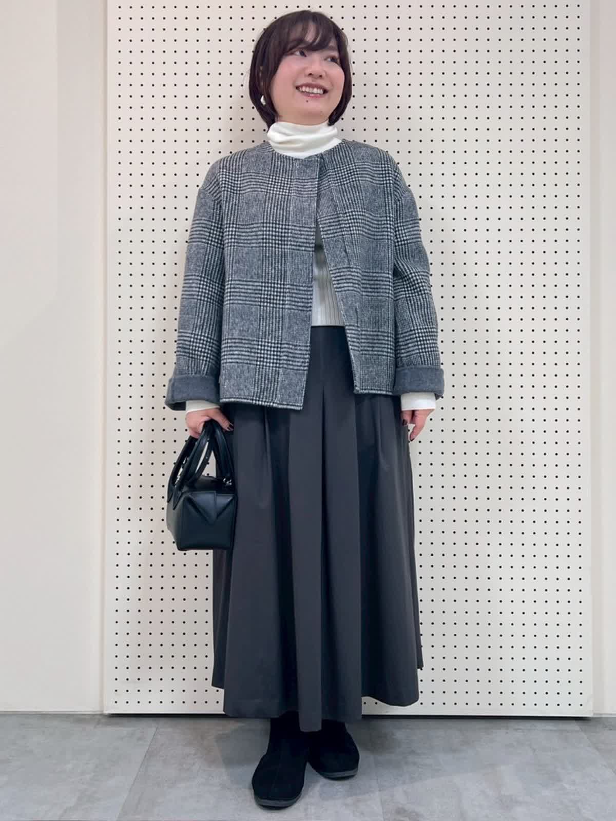 【着用サイズ】全て9号、フリー【着用カラー】コート:チャコールグレー ニット:グレーベージュ スカート:チャコールグレー 冬のコートコーディネート。ショートコートは、(149p)9号着用で腰下の長さ。スカートとの相性抜群です。とても軽くて暖かいので、寒くなってきた今の季節にぴったりです。オンオフ問わず羽織っていただけます。