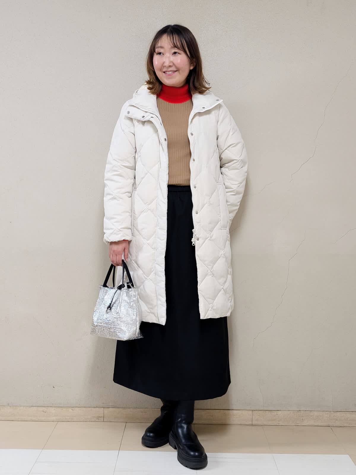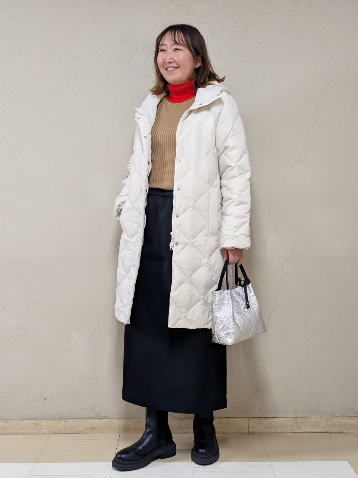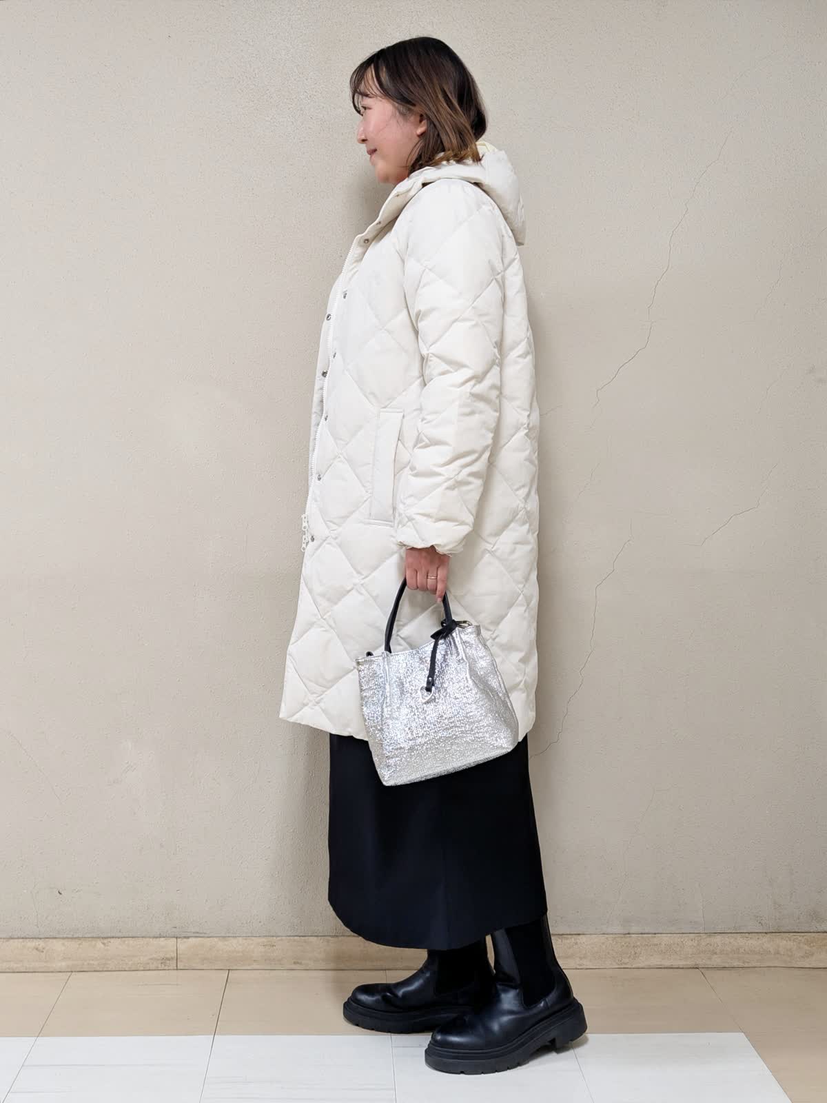 【着用サイズ】全て:11号【着用カラー】ダウン:グレーベージュ ニット:モカチャ スカート:ブラック バッグ:シルバー 冬のお出掛けコーディネートです。TAIONコラボのダウンは軽くて暖かく、着膨れせずスッキリ着られます。真っ白過ぎないグレーベージュなので、インナーとの馴染みも良く合わせやすいです。バイカラーのタートルニットを合わせて差し色にしました。合わせたスカートは程よいハリ感が素敵で、ボリュームを抑えたシルエットです。きれいめにもカジュアルにも着回しできるデザインです。
