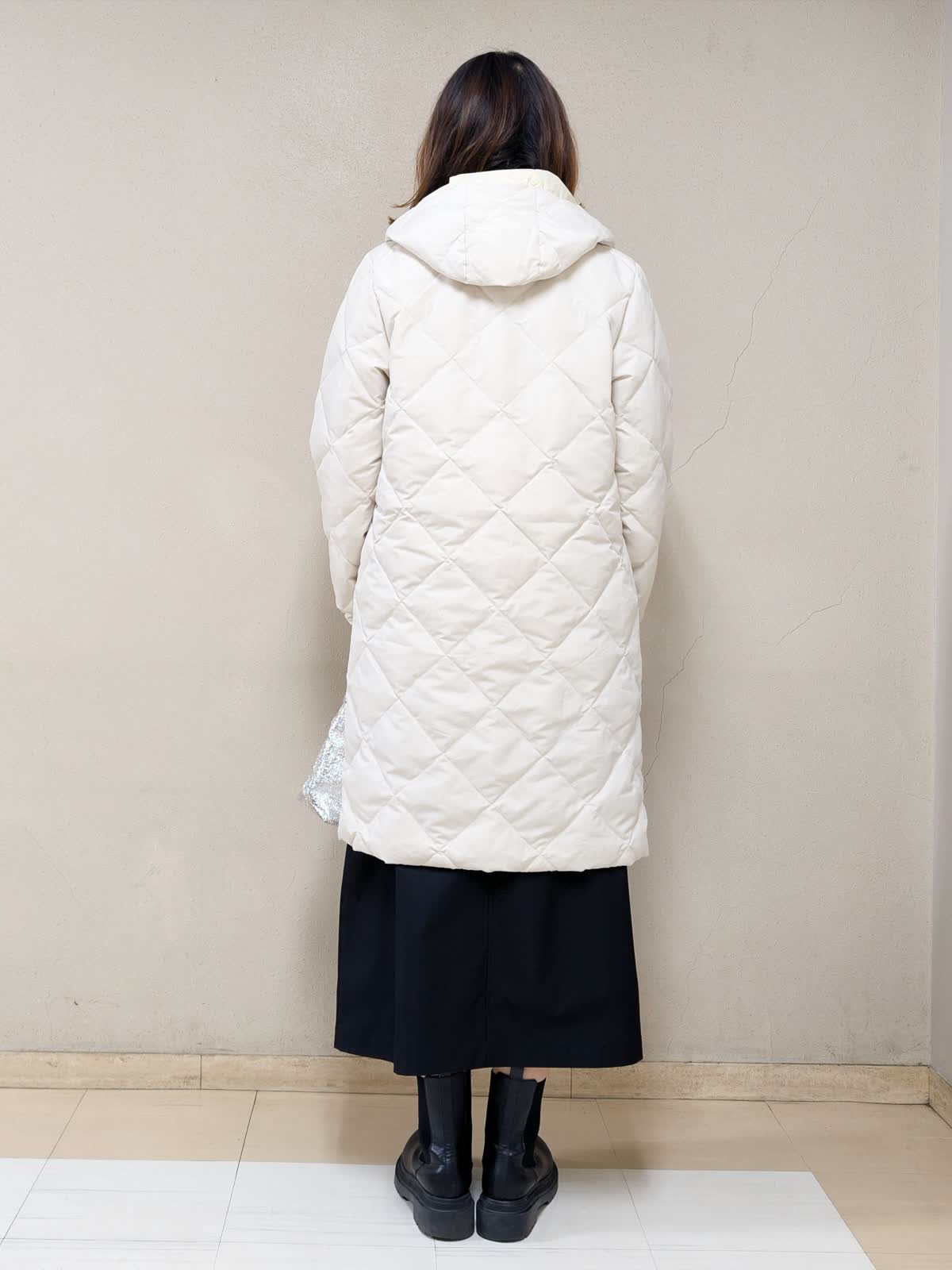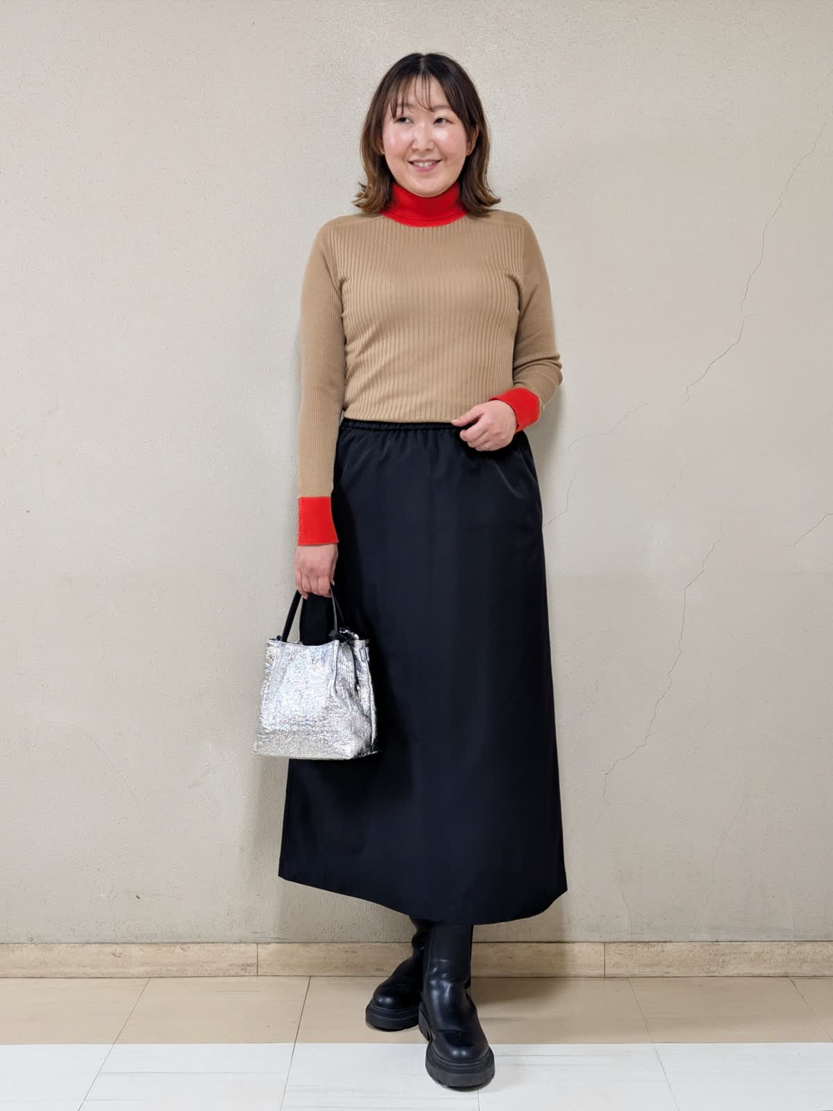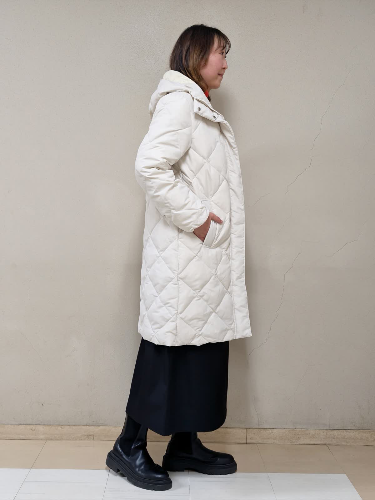 【着用サイズ】全て:11号【着用カラー】ダウン:グレーベージュ ニット:モカチャ スカート:ブラック バッグ:シルバー 冬のお出掛けコーディネートです。TAIONコラボのダウンは軽くて暖かく、着膨れせずスッキリ着られます。真っ白過ぎないグレーベージュなので、インナーとの馴染みも良く合わせやすいです。バイカラーのタートルニットを合わせて差し色にしました。合わせたスカートは程よいハリ感が素敵で、ボリュームを抑えたシルエットです。きれいめにもカジュアルにも着回しできるデザインです。