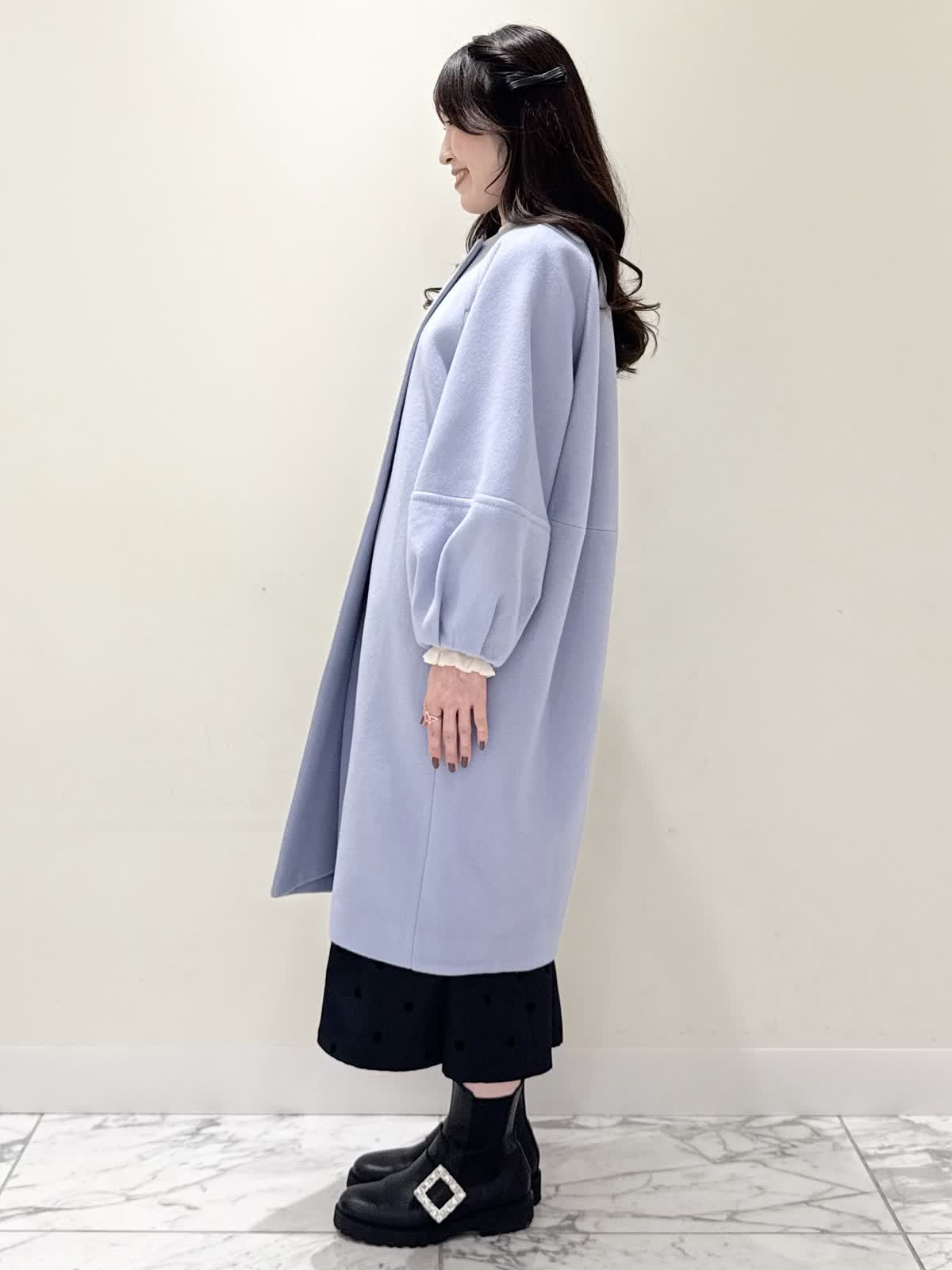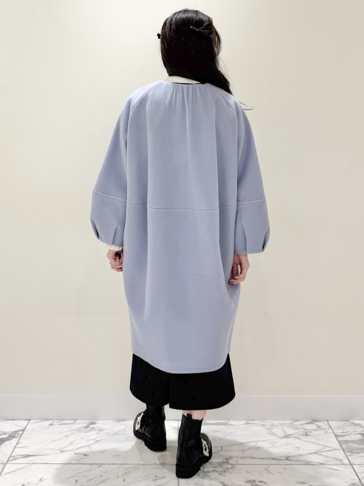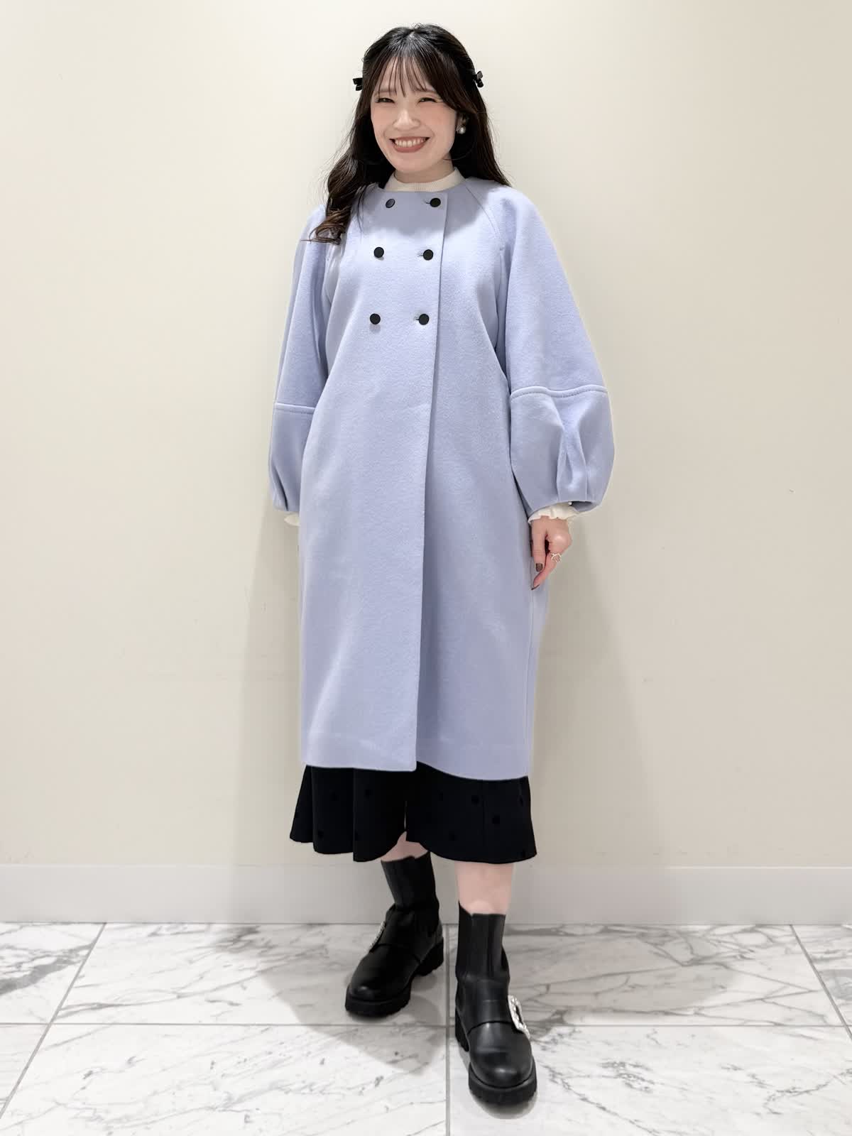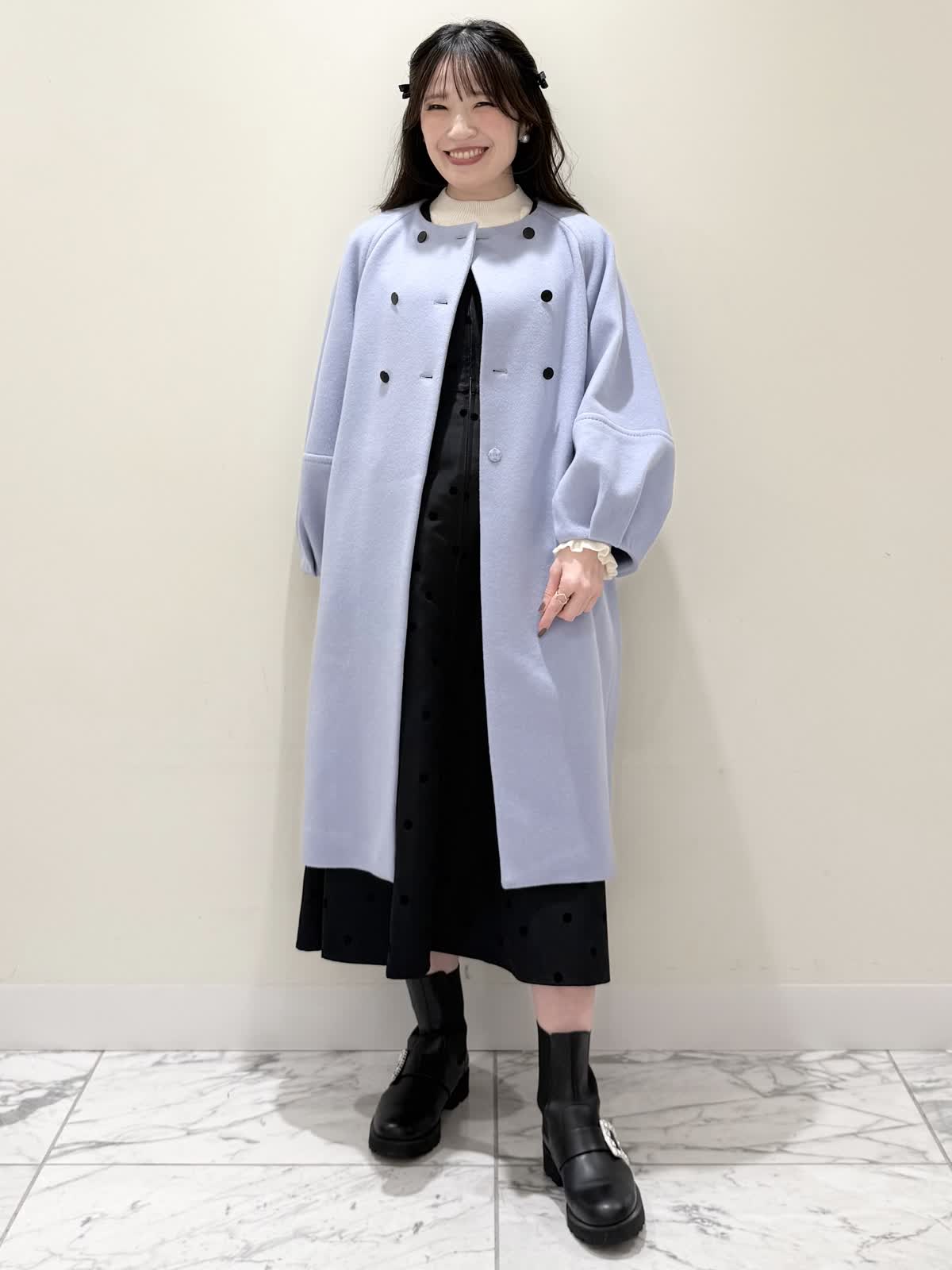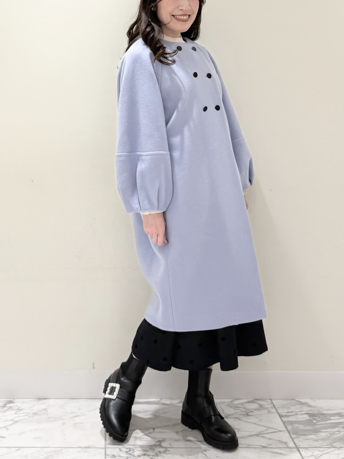 【着用サイズ/カラー】コート:7号/サックス ワンピース:5号/ブラック ニット:9号/アイボリー ブーツ:24.0cm/ブラック イベントシーズンに映えるカラーコートコーディネート♪カラーが綺麗なダブルボタンコートはボタンはブラック、ポワン袖がポイントのコートは袖はややスッキリとした手首が見える袖丈。アームホール、身幅共にゆったりし、裾にいくにつれてつぼまるバルーンシルエットが可愛いです。小柄な方でもバランス良く着られる膝下丈。すっきり着たい方は1サイズ小さめでも◯。合わせは切り替え高めからのフィット&フレアのシルエットのジャンスカ。アームホールはコンパクトめなので、今までのジャンスカに比べるとコンパクトに感じるかと思います。伸びる生地ではないので、程よいゆとりが欲しい方は1サイズ大きめで、ピッタリ着たい方はいつものサイズで◯とても軽い生地なので着心地◎インナーには大人気シリーズの今季バージョン♪柔らかいリブなので、ネックライン、見頃共に窮屈感なく、ノンウール生地なので肌あたり優しくとても着やすいので色違いでおすすめです。