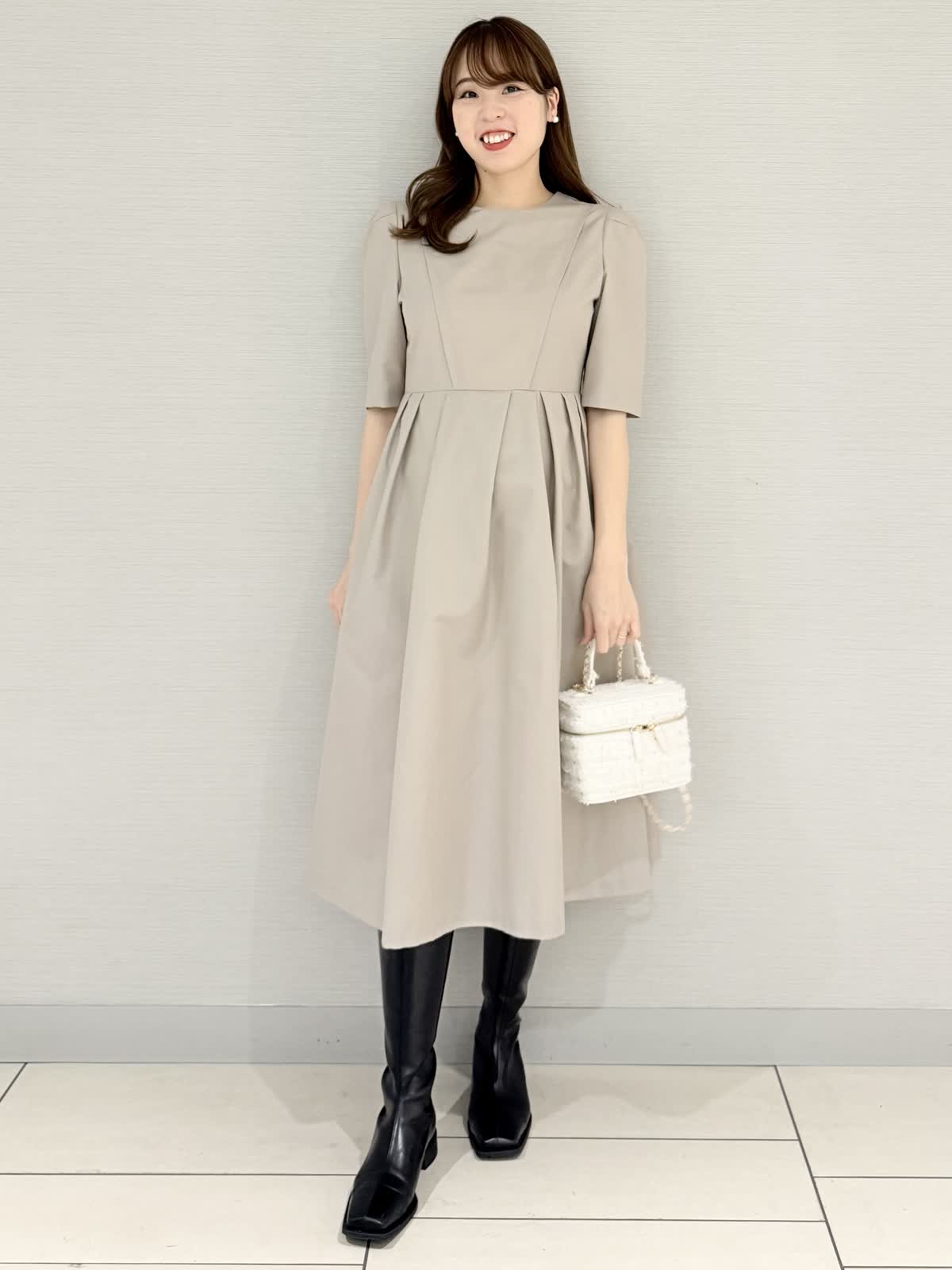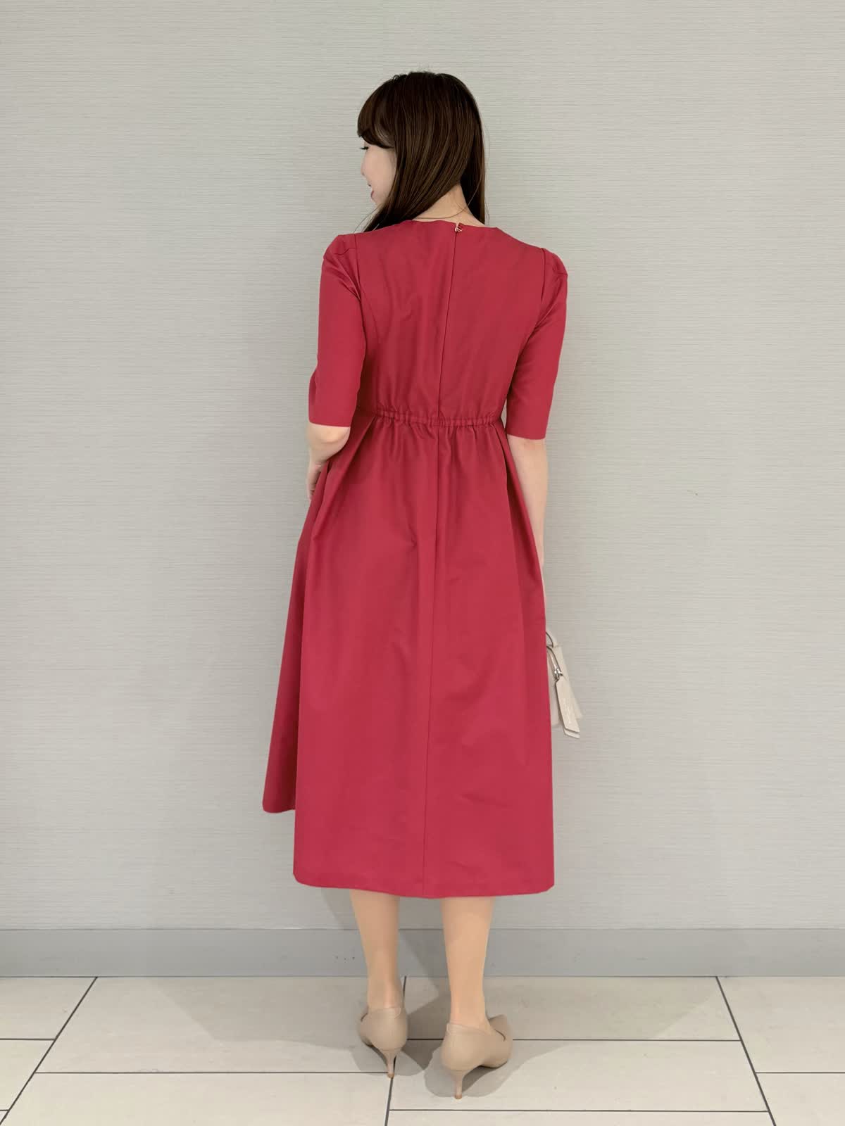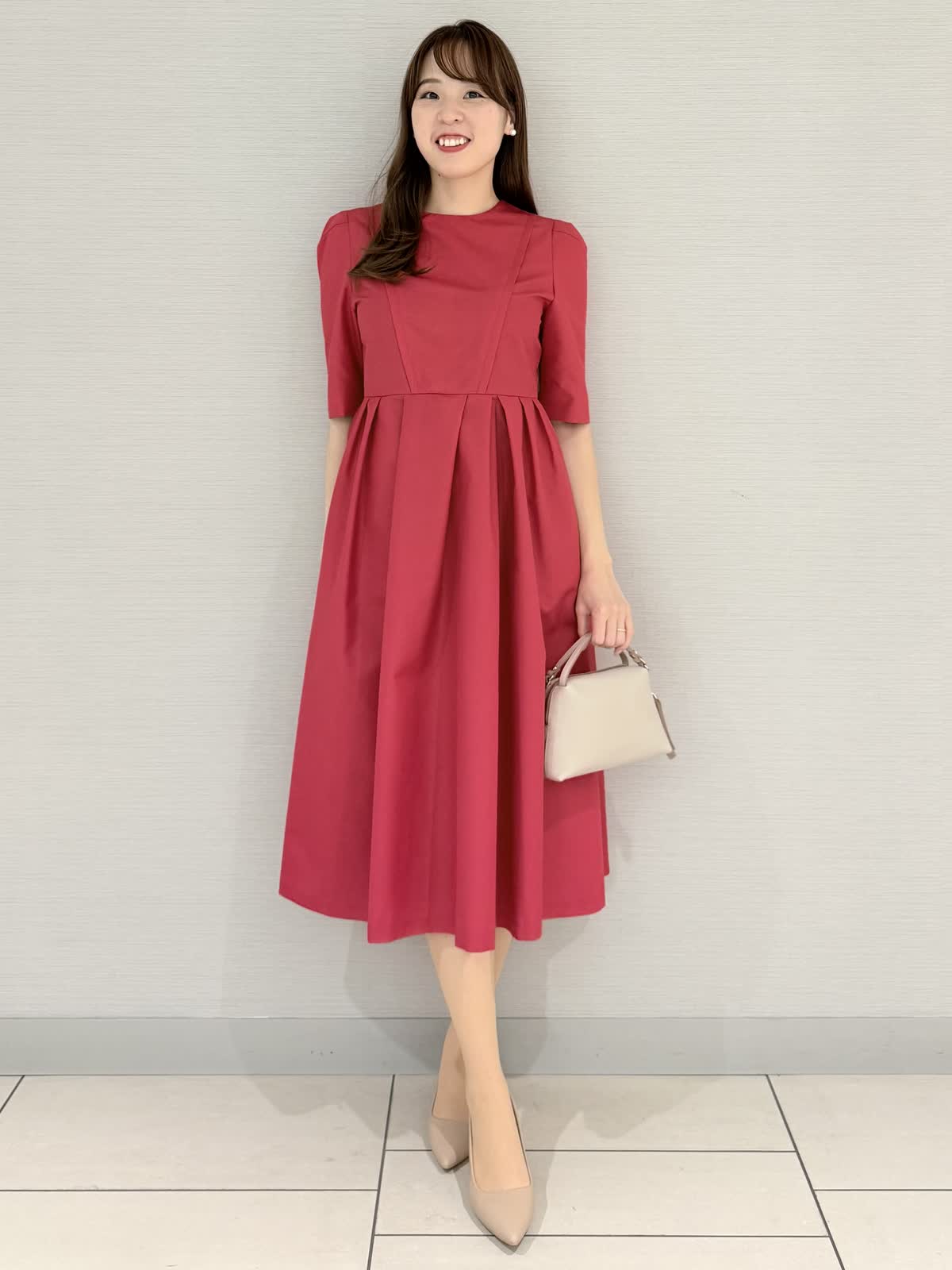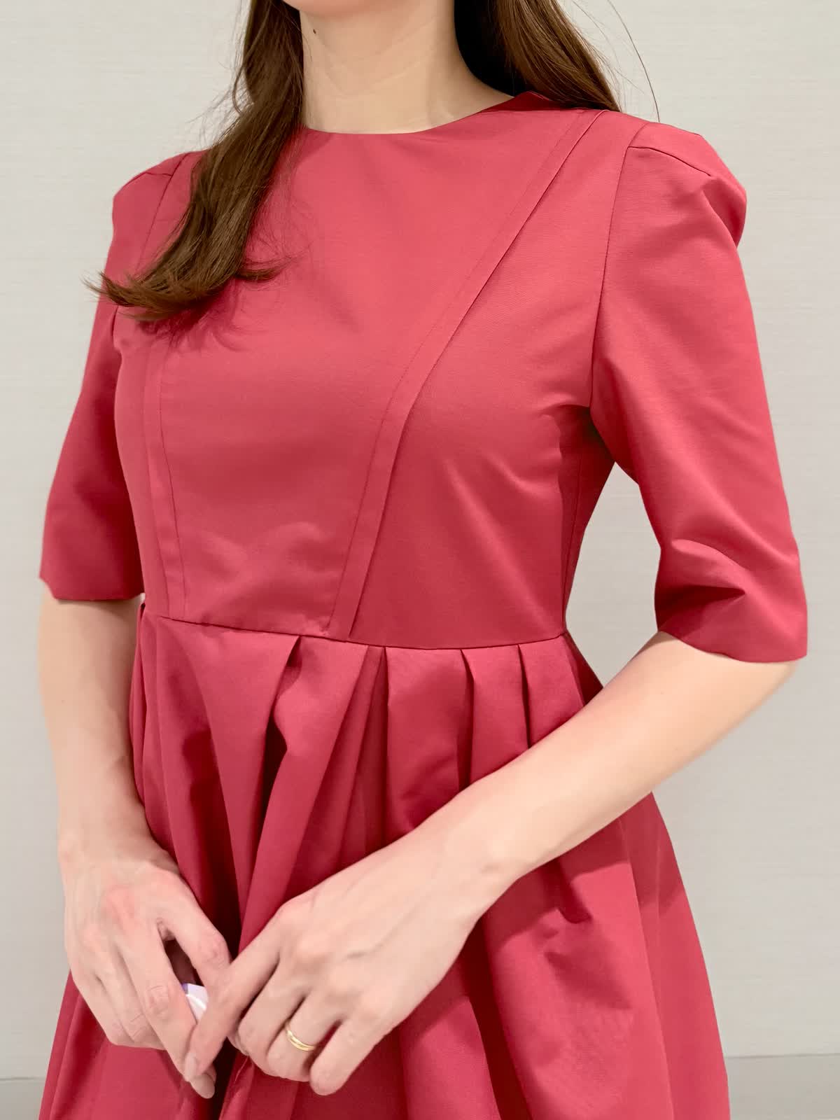 【着用サイズ/カラー】ワンピース:9号《デイリーから会食など様々なシーンに活躍するワンピース。袖付きなのが安心。ランダムタックのシンプルなデザインなのでトレンドに左右されず長くお召しいただけます。オールシーズン着られるのも◎場所を選ばすならベーシックカラー、華やかならチェリーピンクがオススメです♪》【サイズ感】いつものサイズでちょうどよかったですが、アームが内側からのデザインなので、肩が気になる方や普段サイズを迷う方で着心地重視の方は1サイズ上を選んでもよろしいかと思います。
