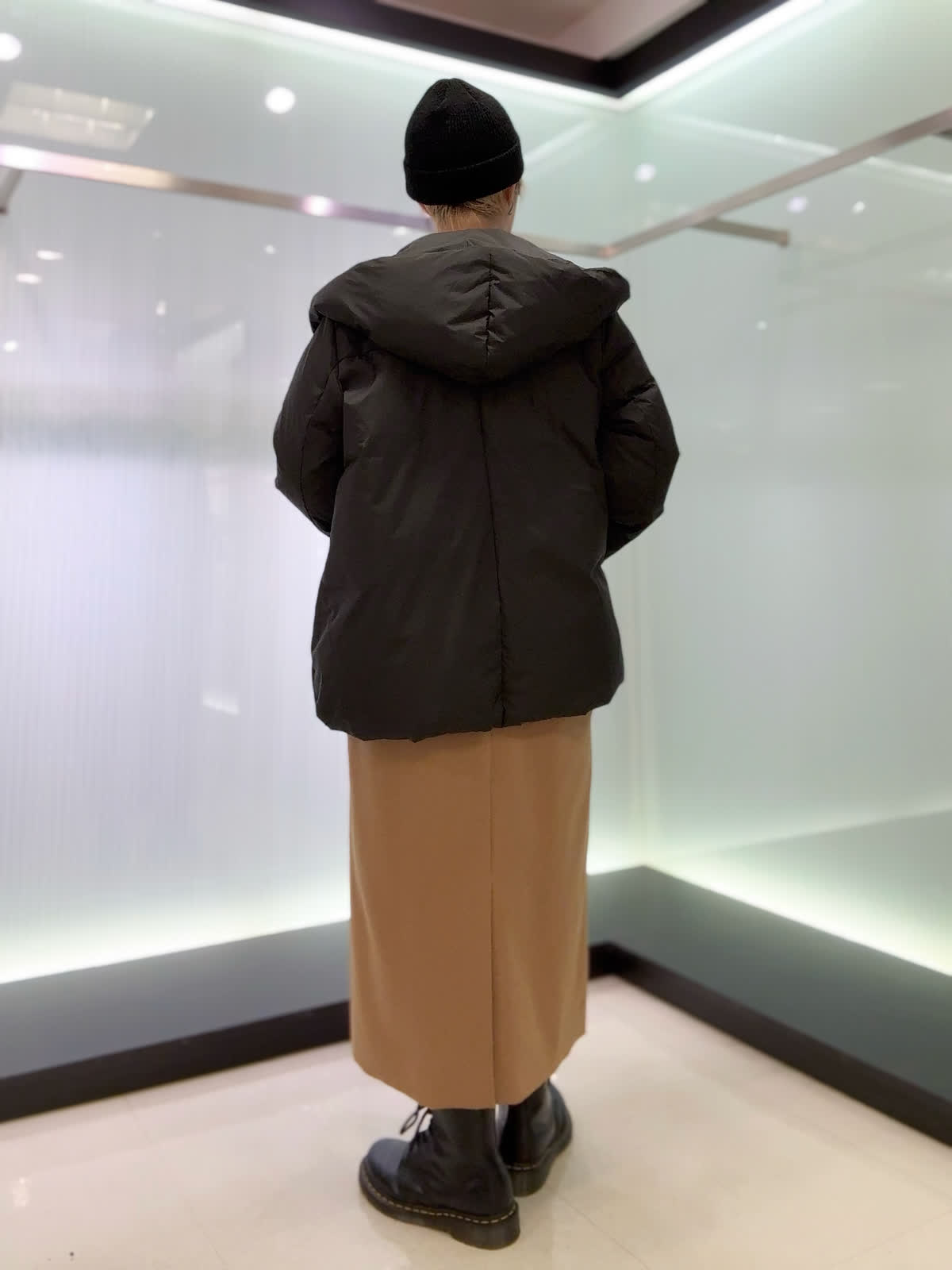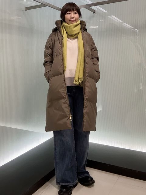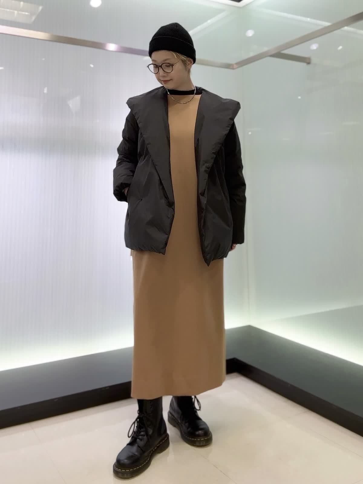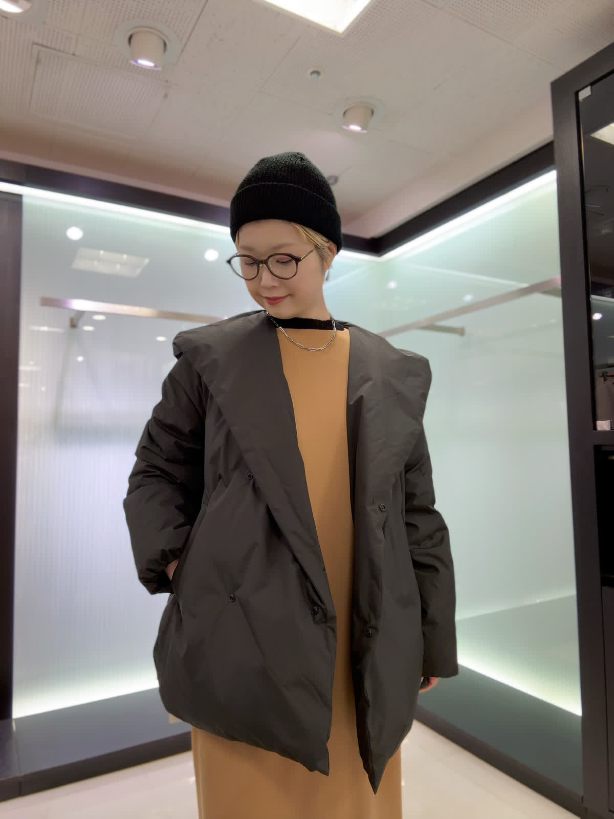 【着用サイズ】アウター・ニット : ブラック/9号 ワンピース : キャメル/9号 軽くて温かいダウンコート♪大きめのショールカラーが上品な印象です。ゆったりとしたサイズ感なので厚手のニットも着られますよ♪パーツ毎にダウンの分量を変えているので着ぶくれして見えないのが嬉しいポイント!