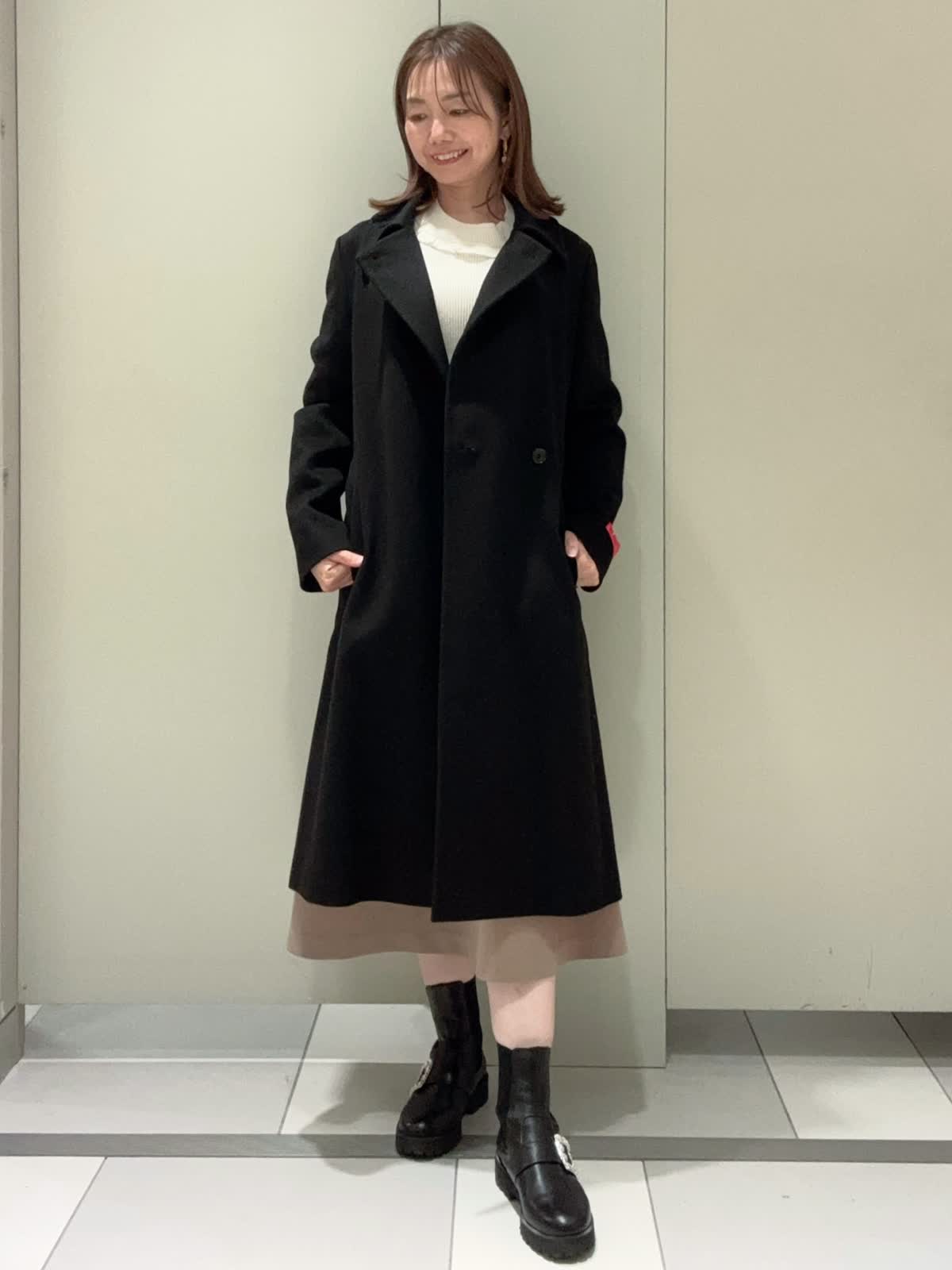 【着用サイズ/カラー】コート:9号/ブラック ニット:9号/アイボリー スカート:9号/モカチャ ベーシックデザインで飽きのこないカシミヤコート ブラックは様々なシーンでお召しいただけます。今回はスカートスタイリングで合わせましたがパンツスタイルでも◯ サイズはいつものサイズかジャケットなど着られる方はワンサイズ上げられても良いかと思います。
