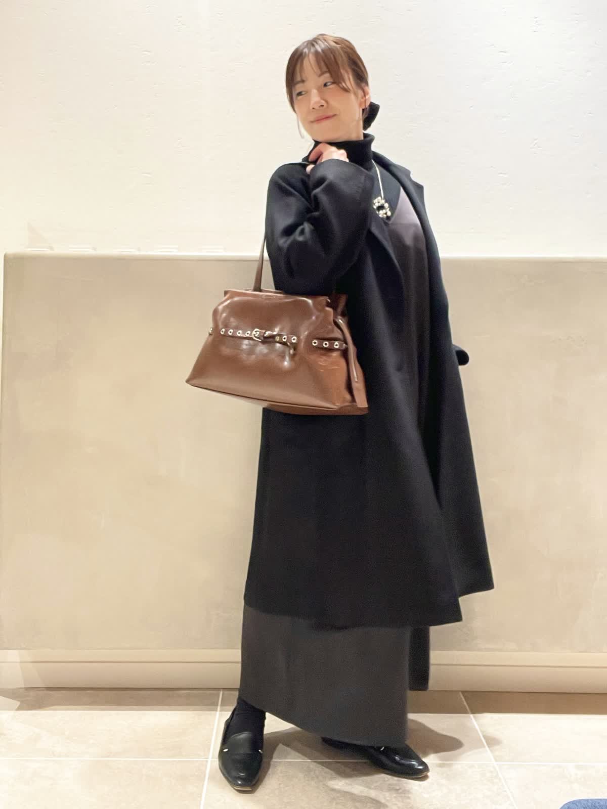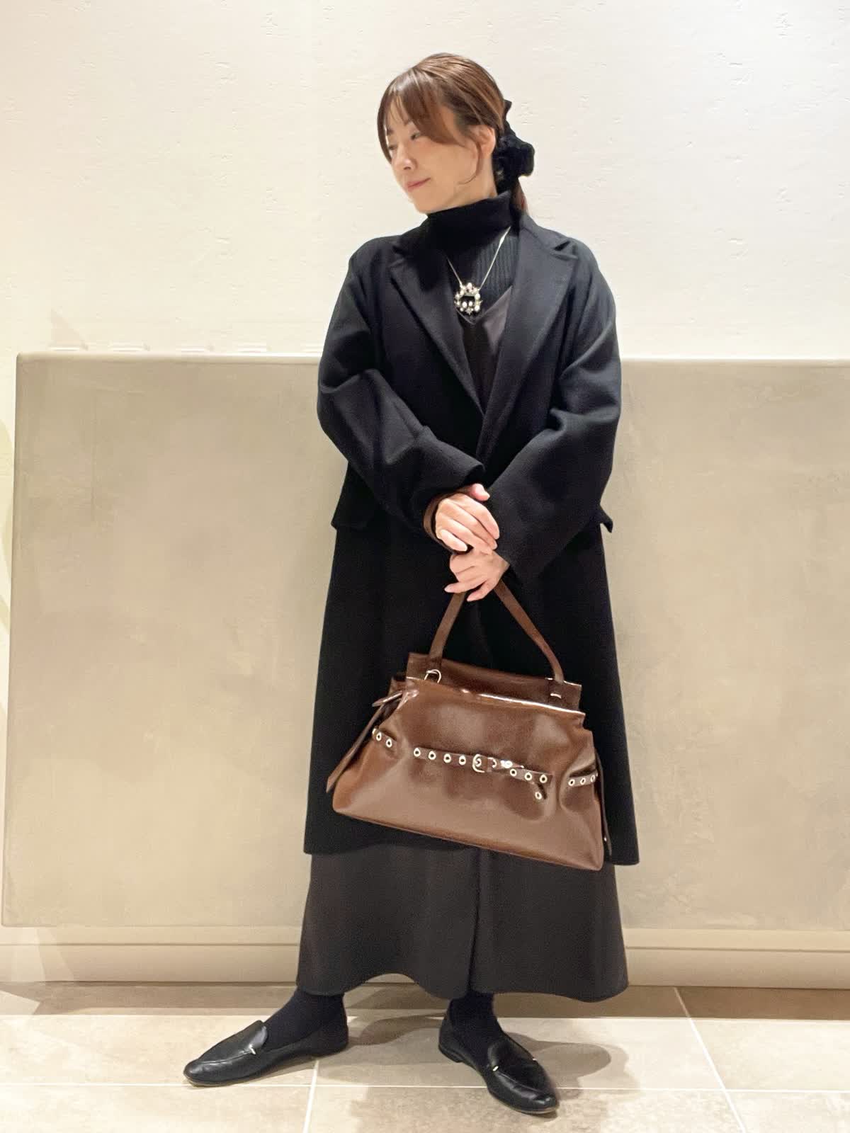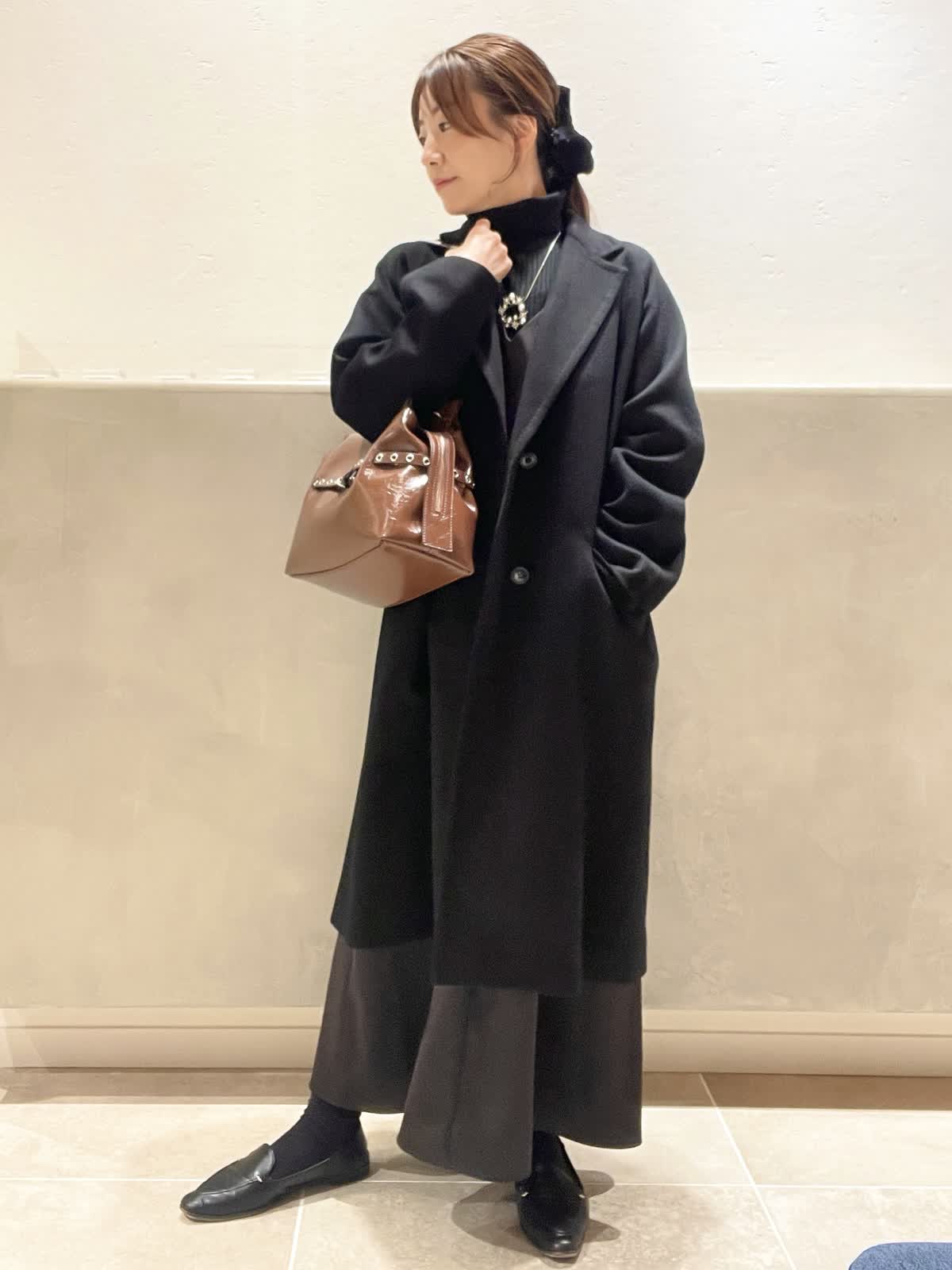 【着用アイテム:カラー/サイズ】 カシミヤコート:ブラック/9号 タートル:ブラック/9号 ワンピース:ブラック/7号 バッグ:ブラウン ネックレス:シルバー ヘアクリップ:ブラック COLOMBOのカシミヤコートはしっかりした素材でありながら、落ち感もあり着膨れしません。上品な光沢は肌色を綺麗に見せてくれます。DELL'ESTのバッグでトレンドをプラスしてみました。