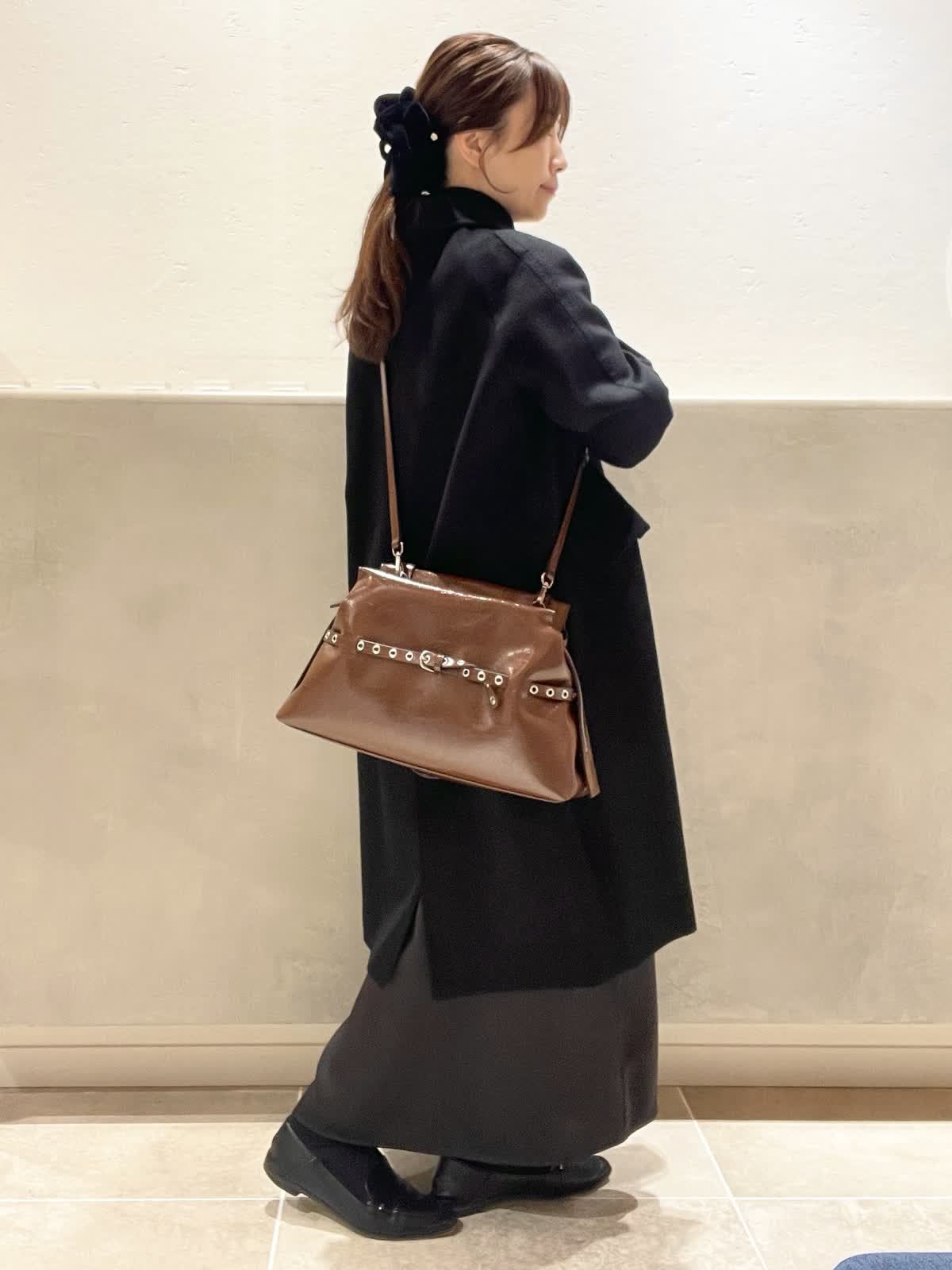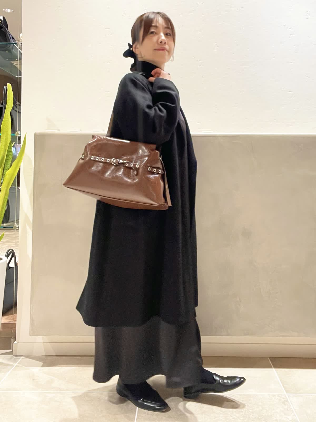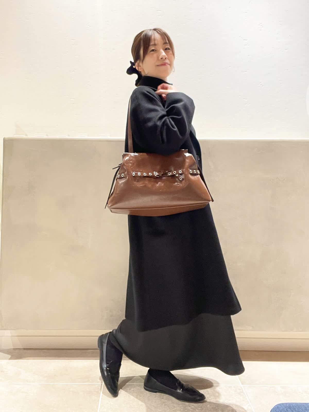 【着用アイテム:カラー/サイズ】 カシミヤコート:ブラック/9号 タートル:ブラック/9号 ワンピース:ブラック/7号 バッグ:ブラウン ネックレス:シルバー ヘアクリップ:ブラック COLOMBOのカシミヤコートはしっかりした素材でありながら、落ち感もあり着膨れしません。上品な光沢は肌色を綺麗に見せてくれます。DELL'ESTのバッグでトレンドをプラスしてみました。