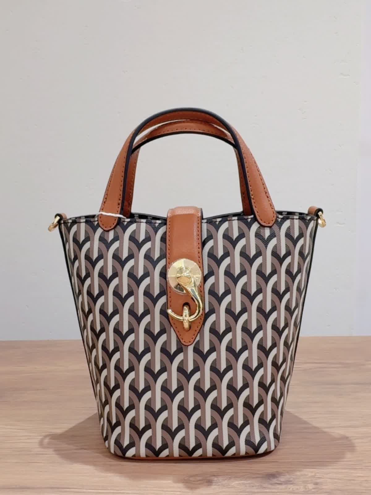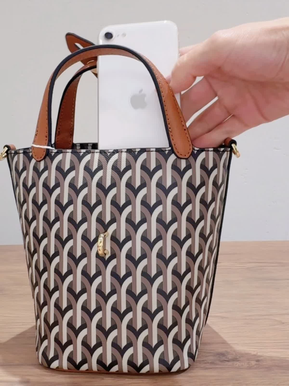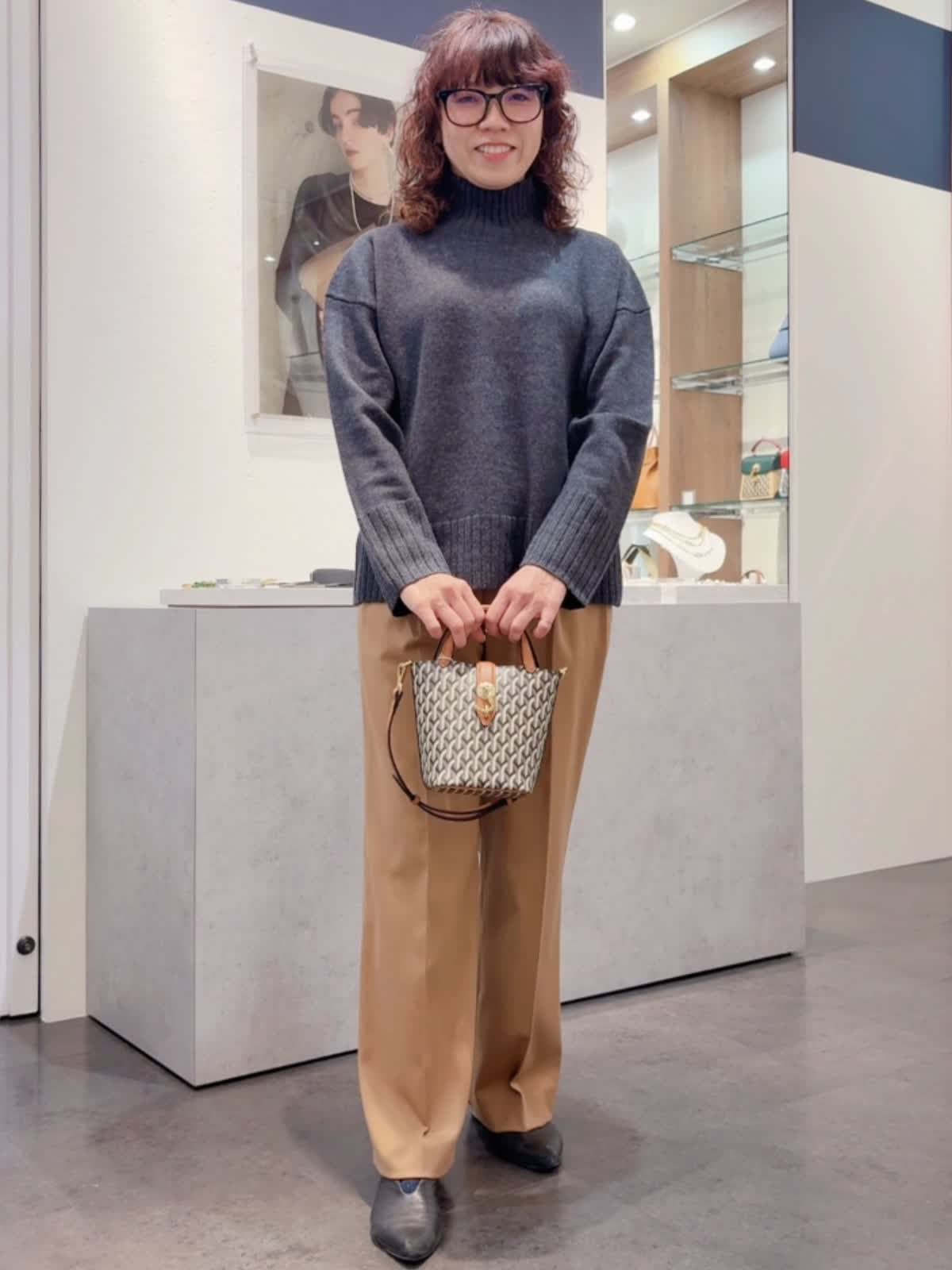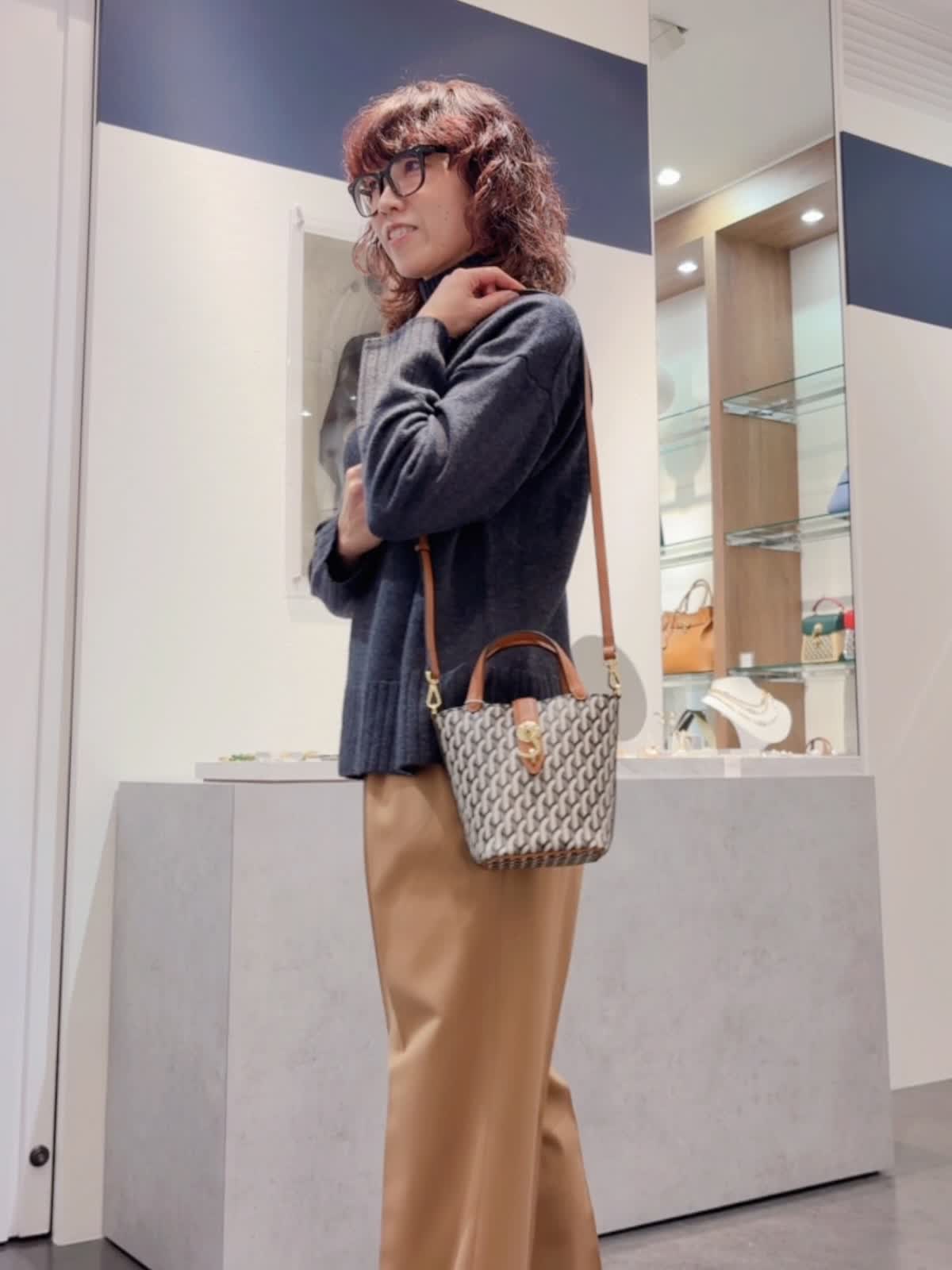《DELL’EST/デルエスト》GLINDA BAG SMALLハンドバッグ バッグ:キャメル 【着用サイズ】全て11号 【着用カラー】ニット:チャコールグレー パンツ:キャメル イタリアミラノ発のとってもオシャレなバケツ型バッグ。 フックが角度によってキラリとします。コンパクトながらもマチが広いので、スリムな水筒やペットボトルでしたらお財布とスマートフォンと一緒に収納可能です。ショルダーストラップは取り外しできるのでいろんなコーディネートに合わせられます!