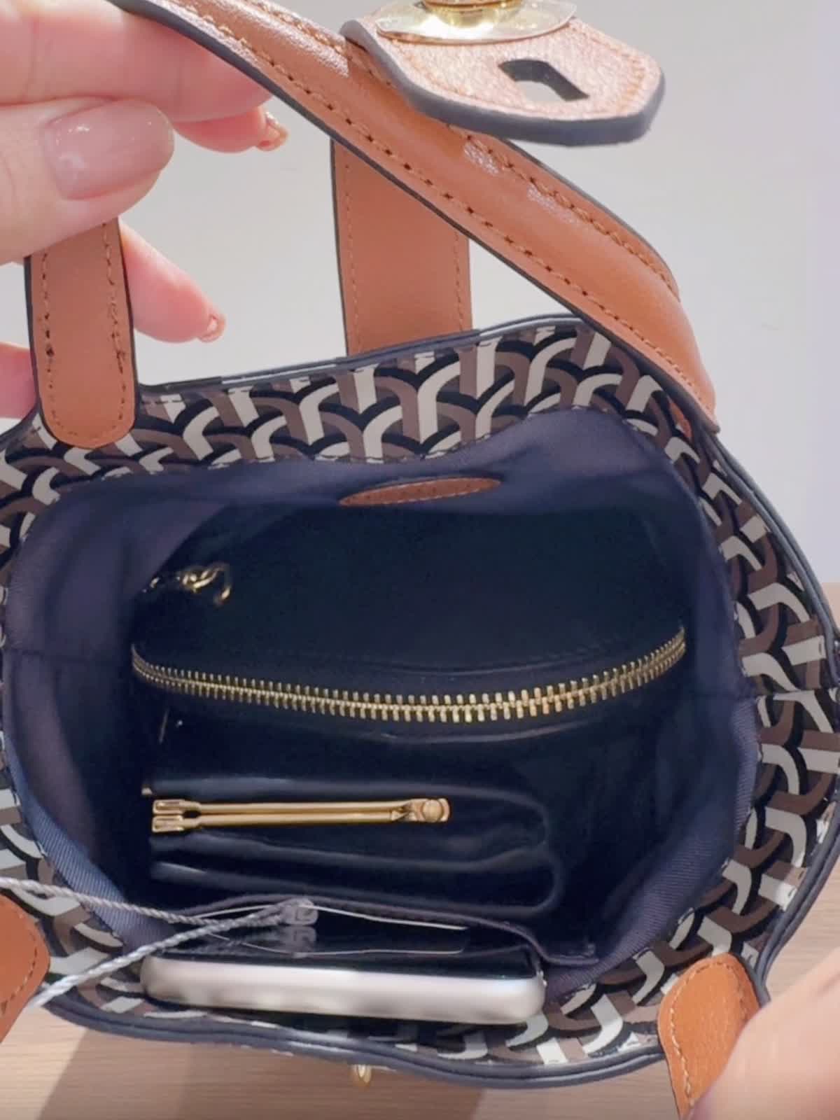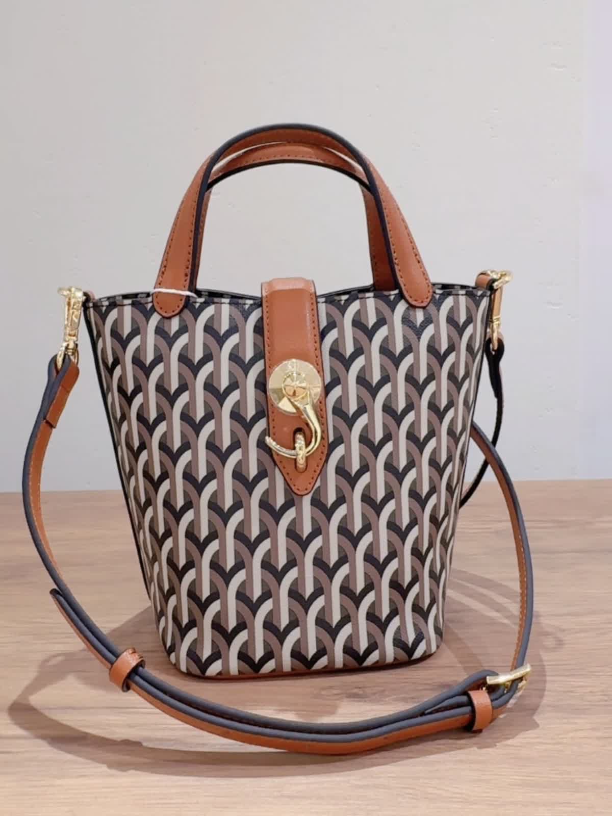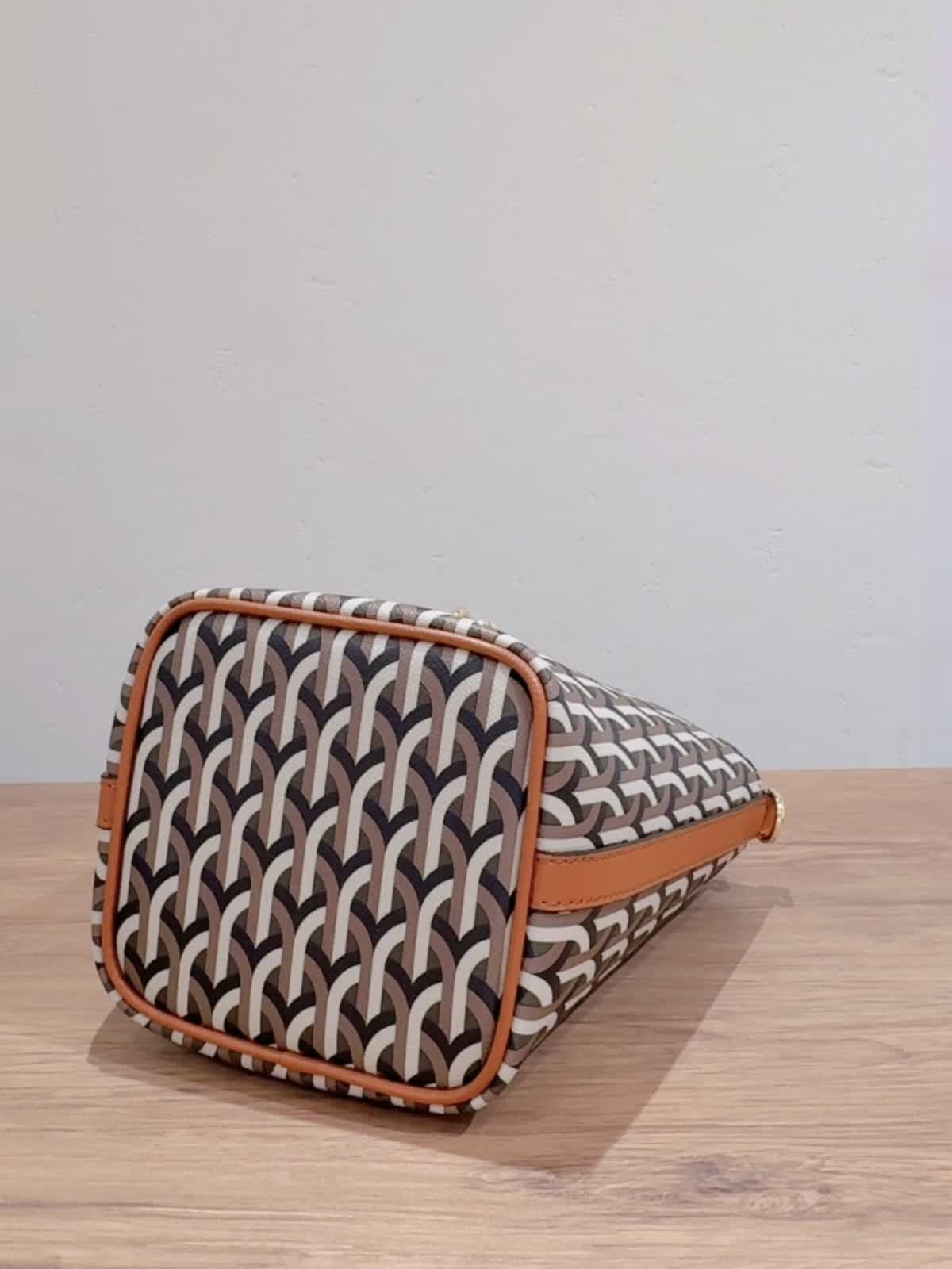 《DELL’EST/デルエスト》GLINDA BAG SMALLハンドバッグ バッグ:キャメル 【着用サイズ】全て11号 【着用カラー】ニット:チャコールグレー パンツ:キャメル イタリアミラノ発のとってもオシャレなバケツ型バッグ。 フックが角度によってキラリとします。コンパクトながらもマチが広いので、スリムな水筒やペットボトルでしたらお財布とスマートフォンと一緒に収納可能です。ショルダーストラップは取り外しできるのでいろんなコーディネートに合わせられます!