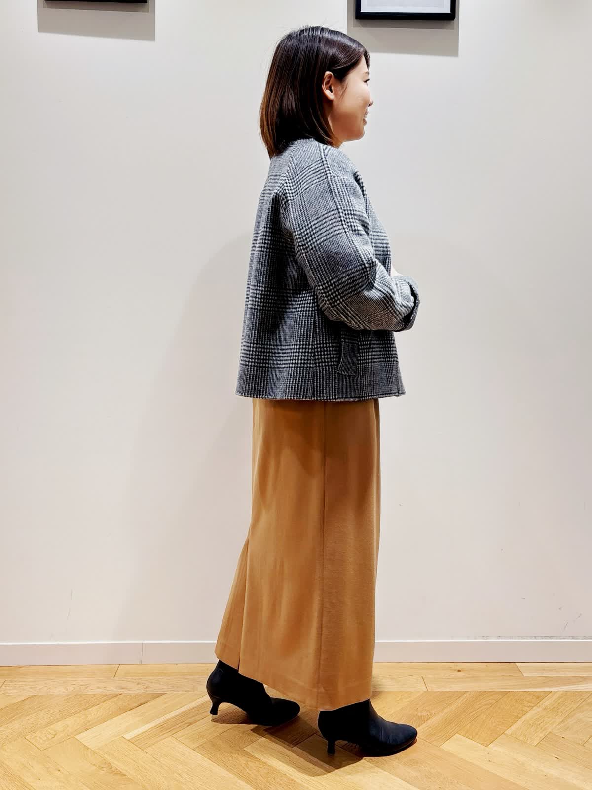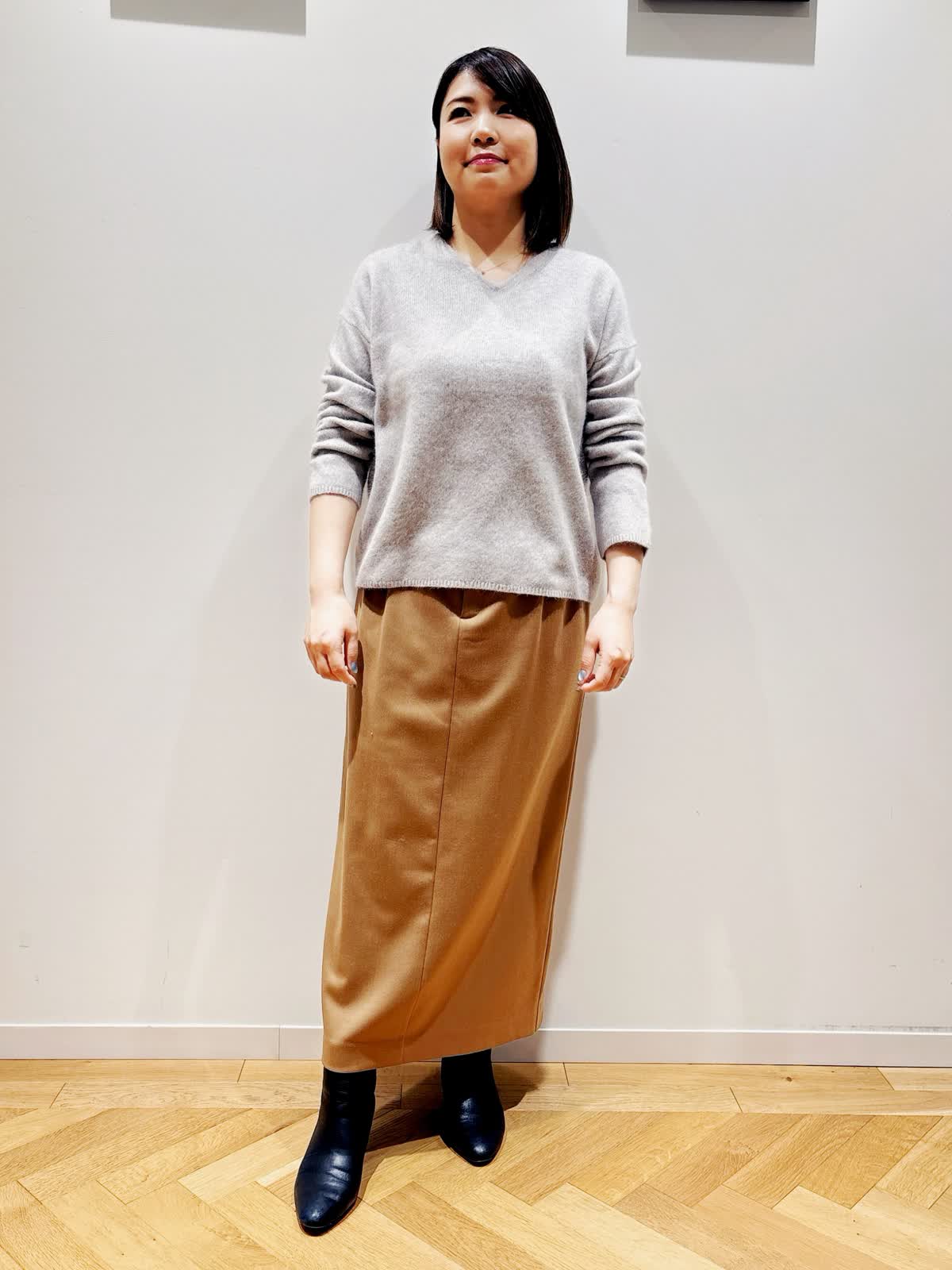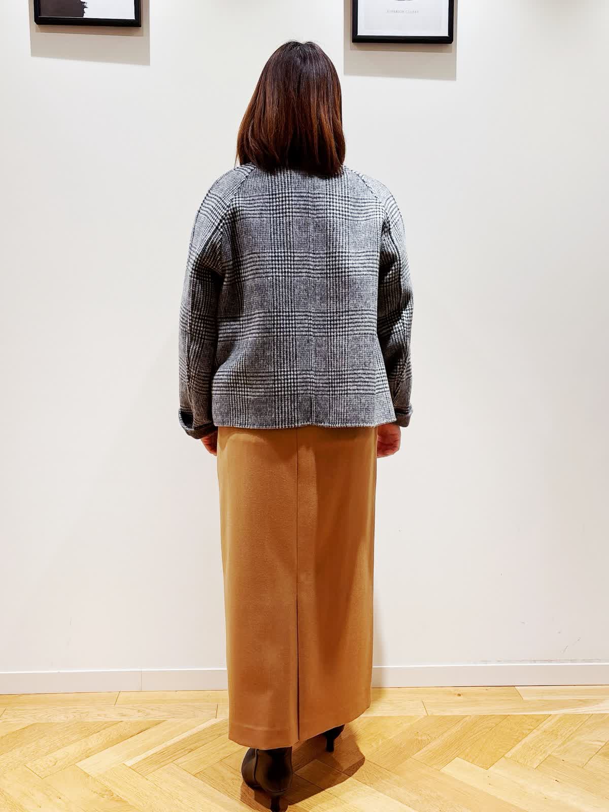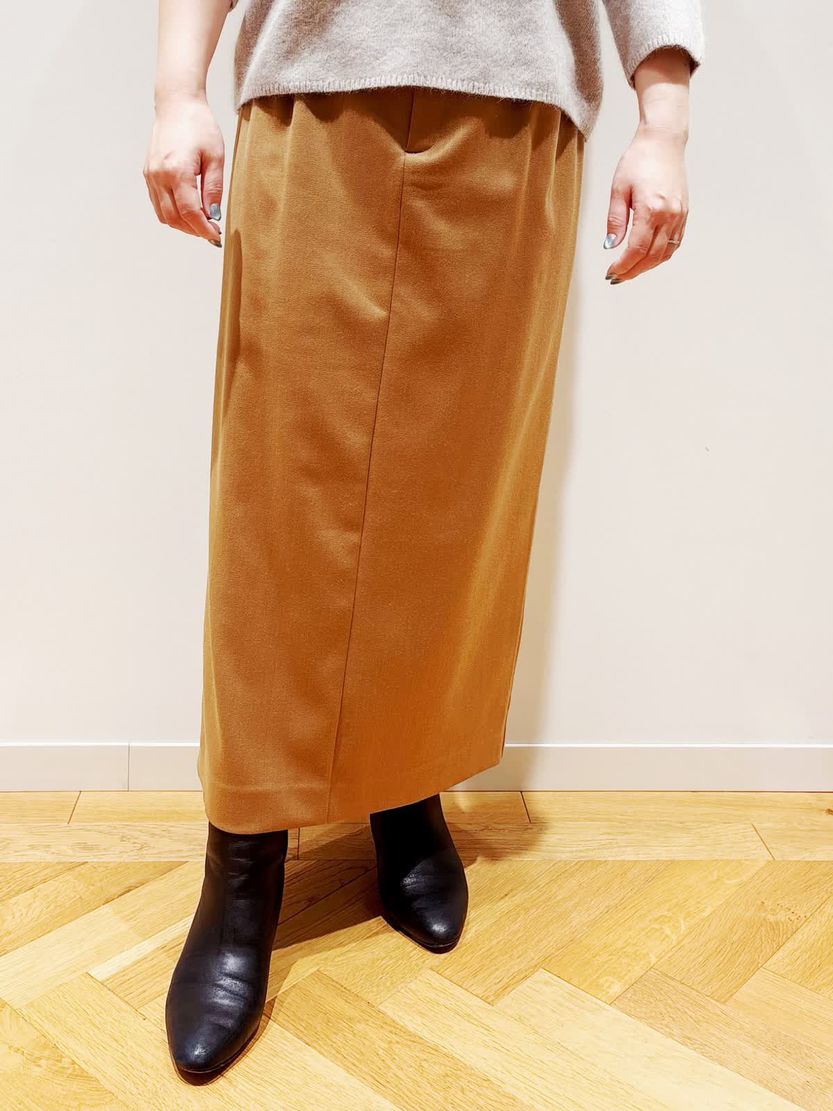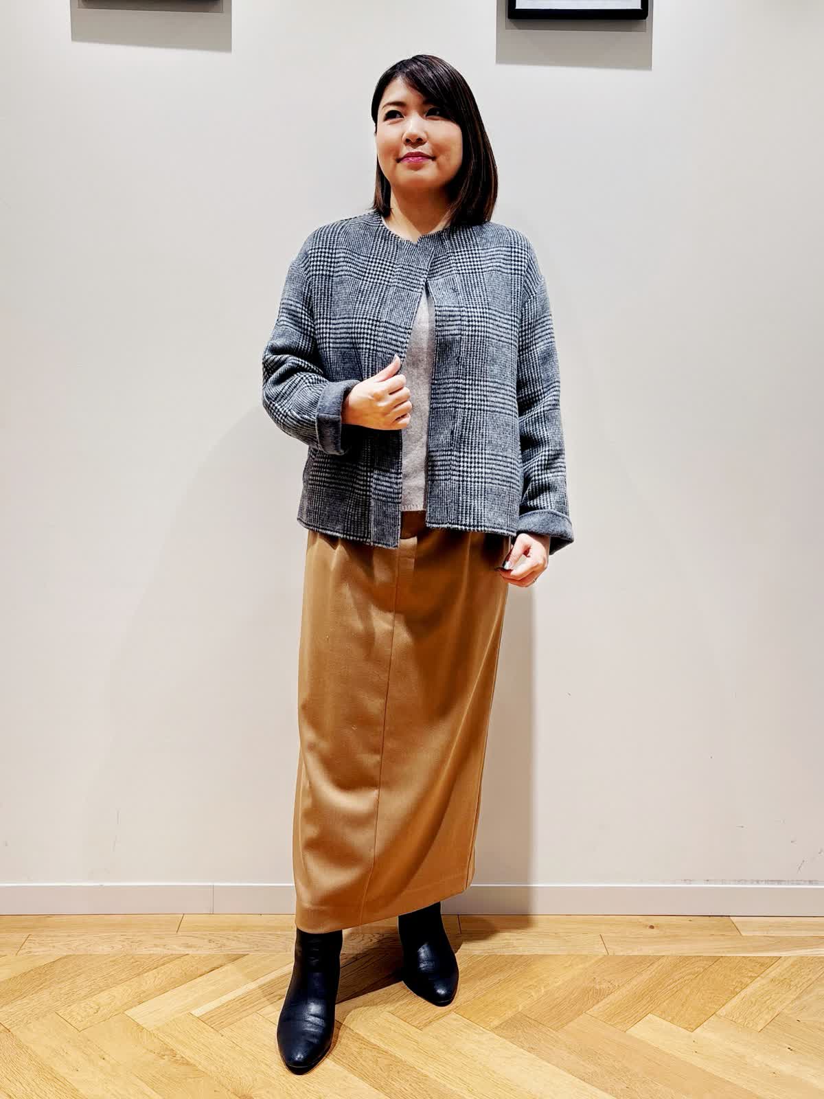 【着用サイズ】全て9号 【着用カラー】コート:チャコールグレー ニット:グレーベージュ スカート:キャメル 冬のお出掛けコーディネート。コートは軽くサラッと羽織れる1着です。どんなボトムスともバランスの取りやすい丈感がポイントです。低身長の方でも幅広くコーディネートを楽しめます。ニットも軽くて暖かいラクーンニットです。Vネックが首元をすっきりみせてくれます。スカートは体のラインを拾わないタイトスカートです。サイドのバックルでウエスト調整も可能です。