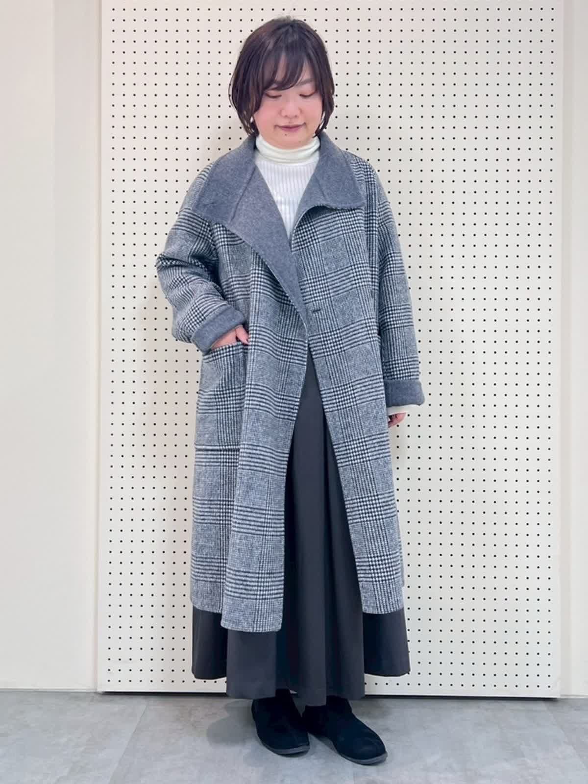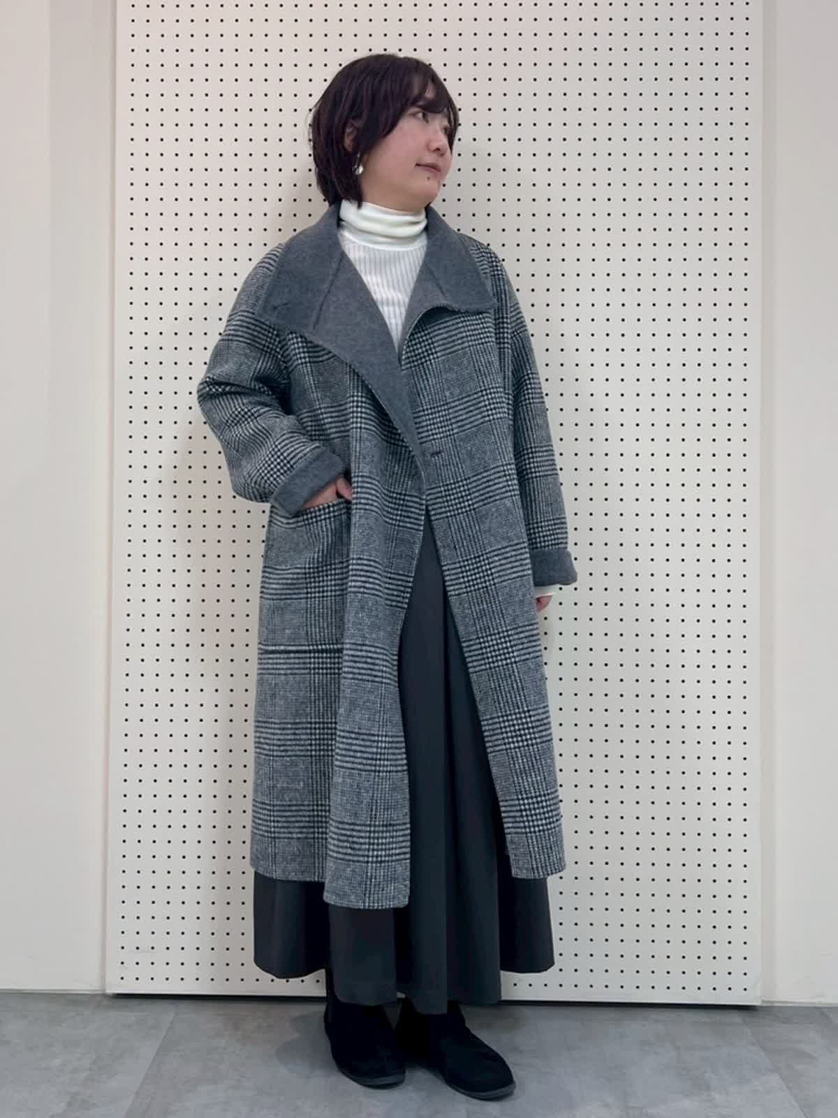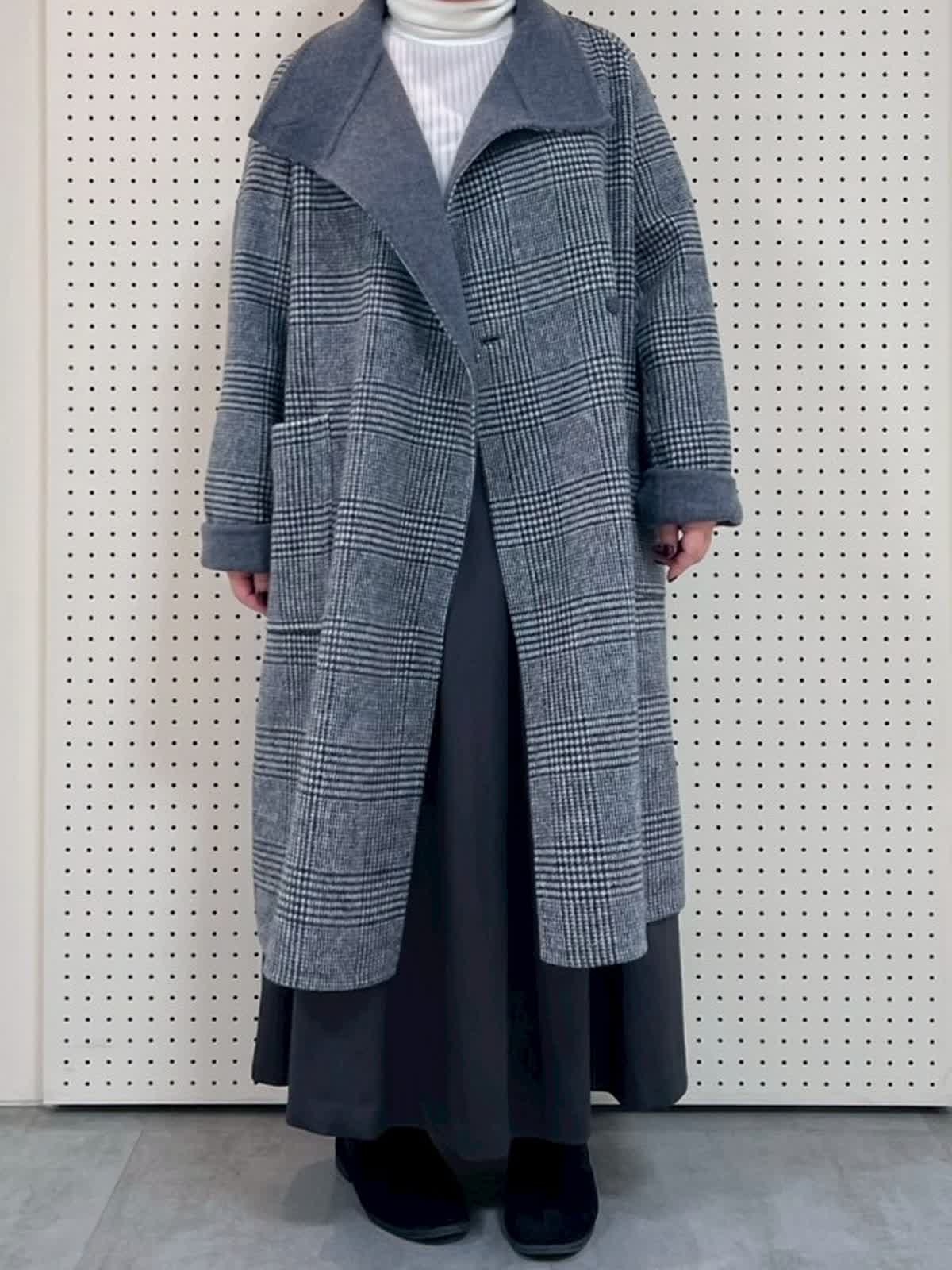 【着用サイズ】全て9号 【着用カラー】コート:チャコールグレー ニット:グレーベージュ スカート:チャコールグレー 冬のコートコーディネート。ロングコートは、(149p)9号着用でふくらはぎが隠れる長さ。スカートとの相性抜群ですが、パンツ合わせも素敵です。とても軽くて暖かいので、これからの季節にぴったりです。オンオフ問わず羽織っていただけます。