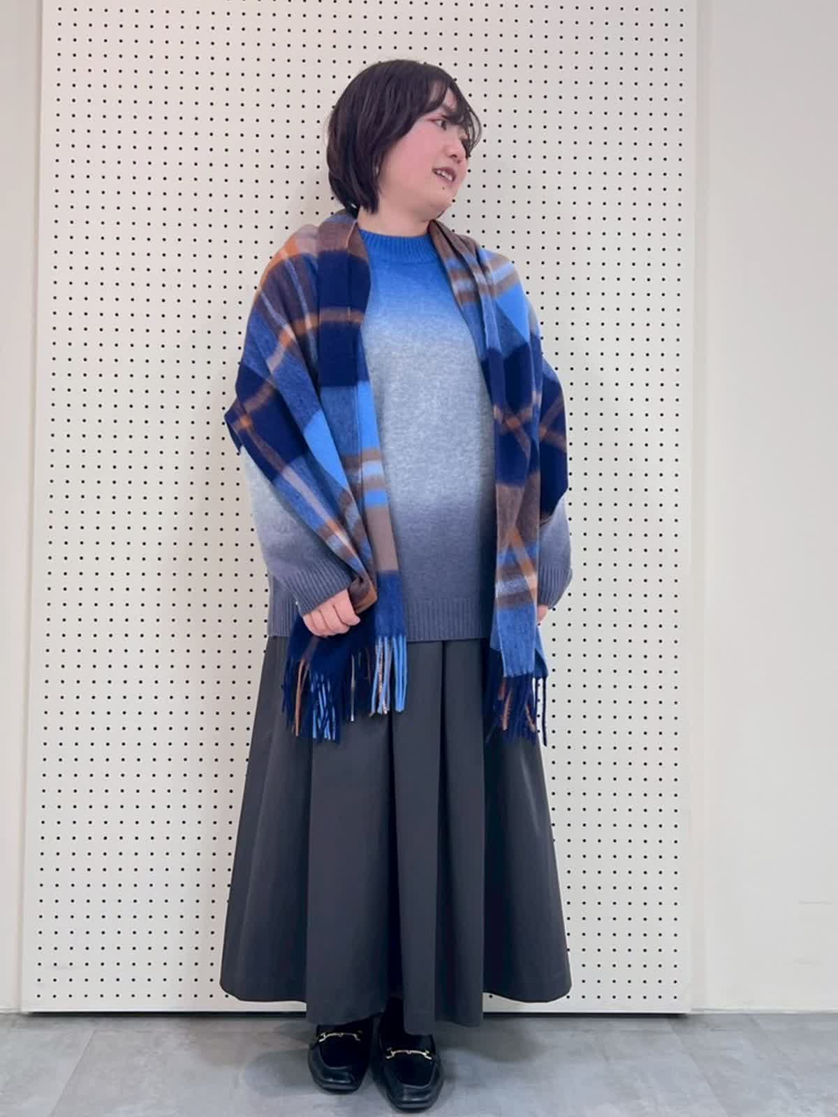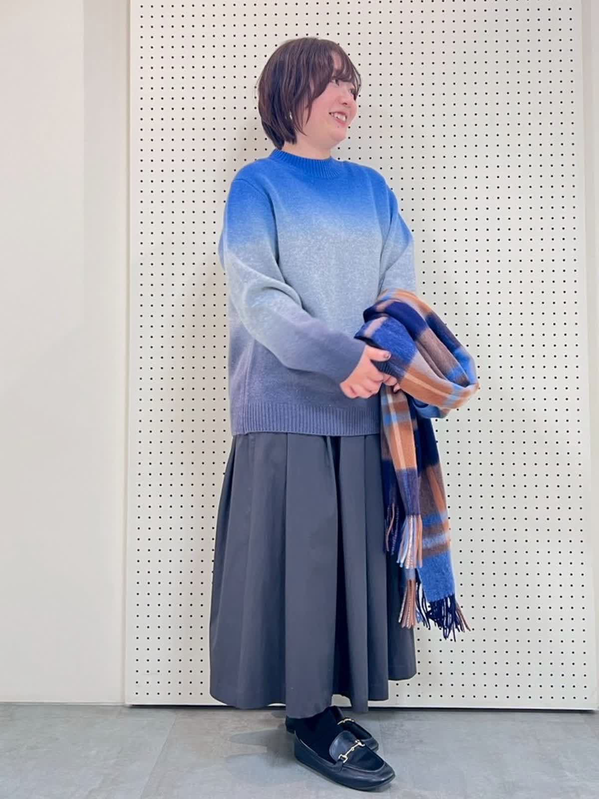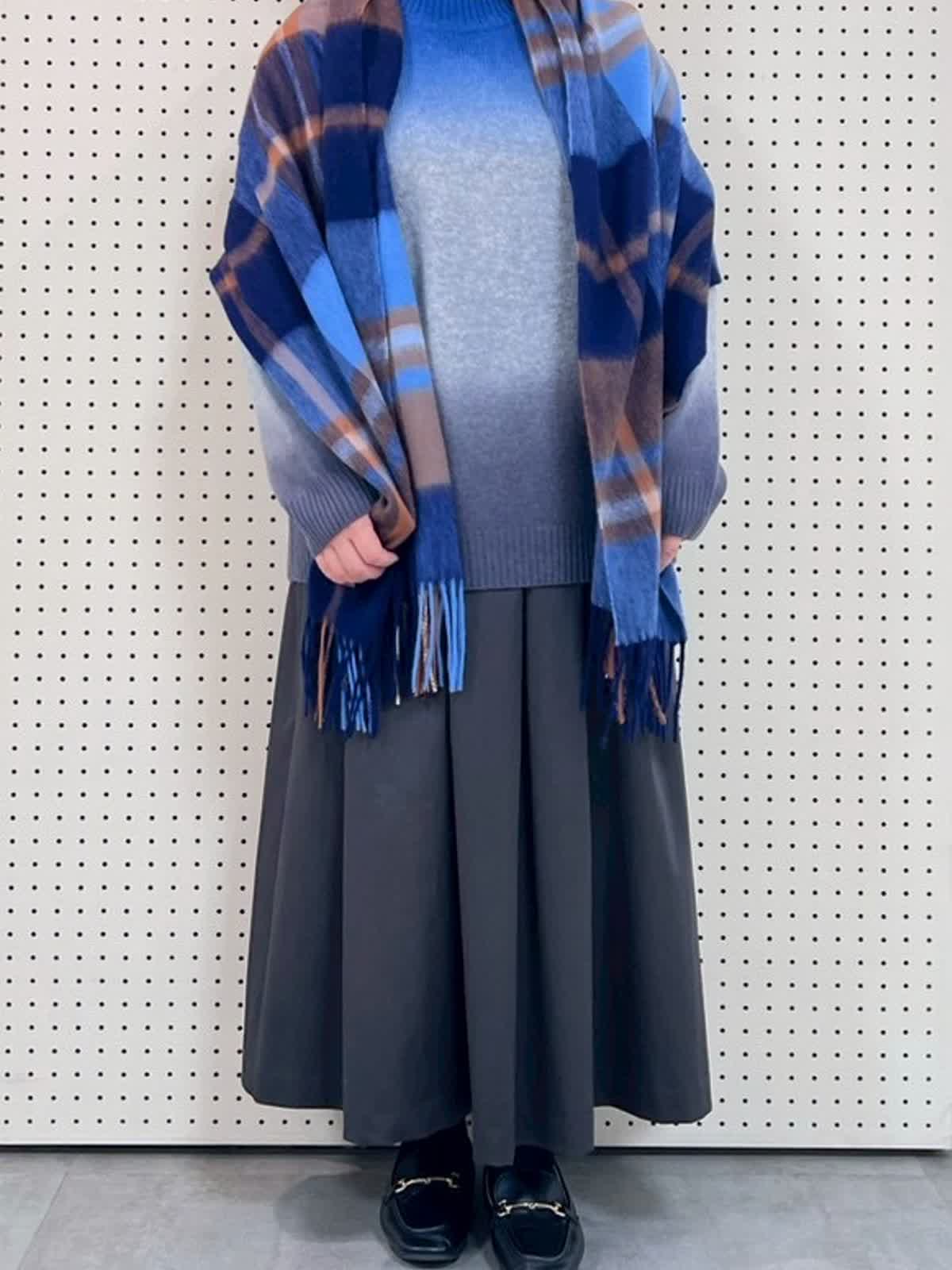 【着用サイズ】全て9号 【着用カラー】ニット:ブルー スカート:チャコールグレー ストール:ブルー グラデーションニットコーディネート。ニットは袖周りもゆったりで、とても暖かいです。149pでヒップがすっぽり隠れる長さで、スカートと相性抜群。スカートはウエストゴムで履きやすいです。丈も長すぎずちょうど良く、タイツやブーツ合わせがおすすめです。