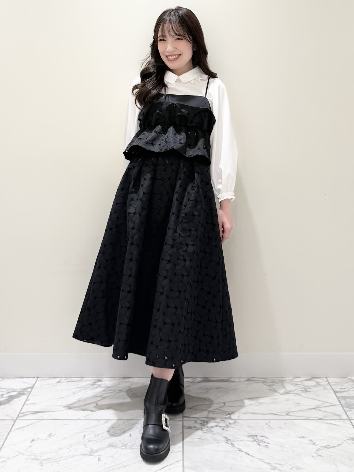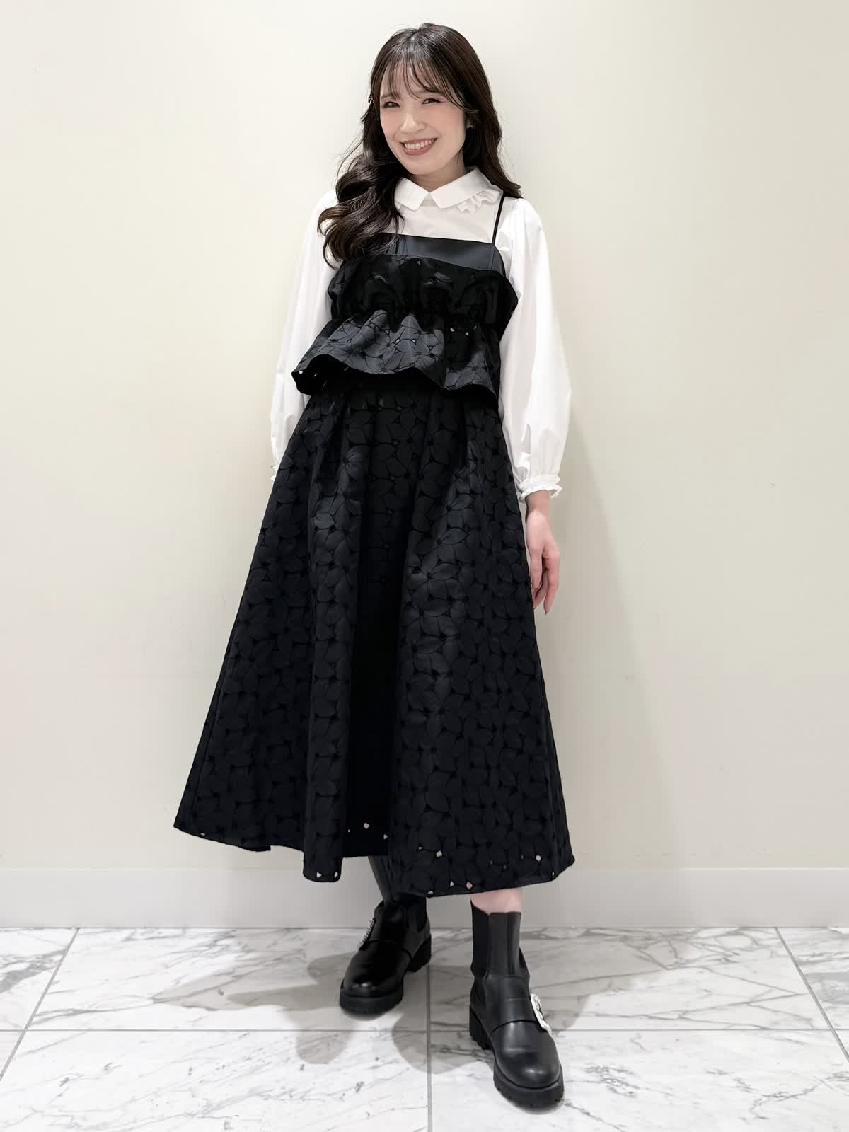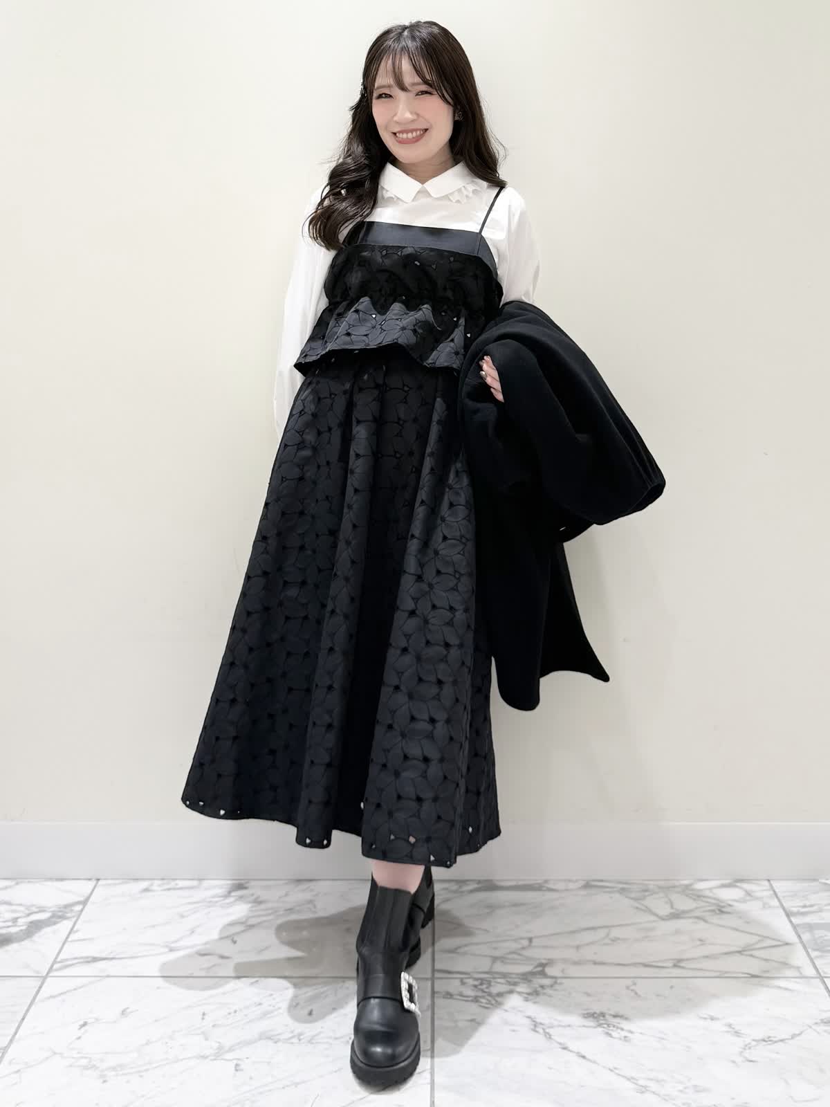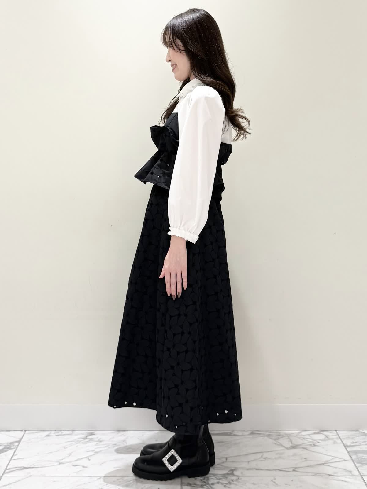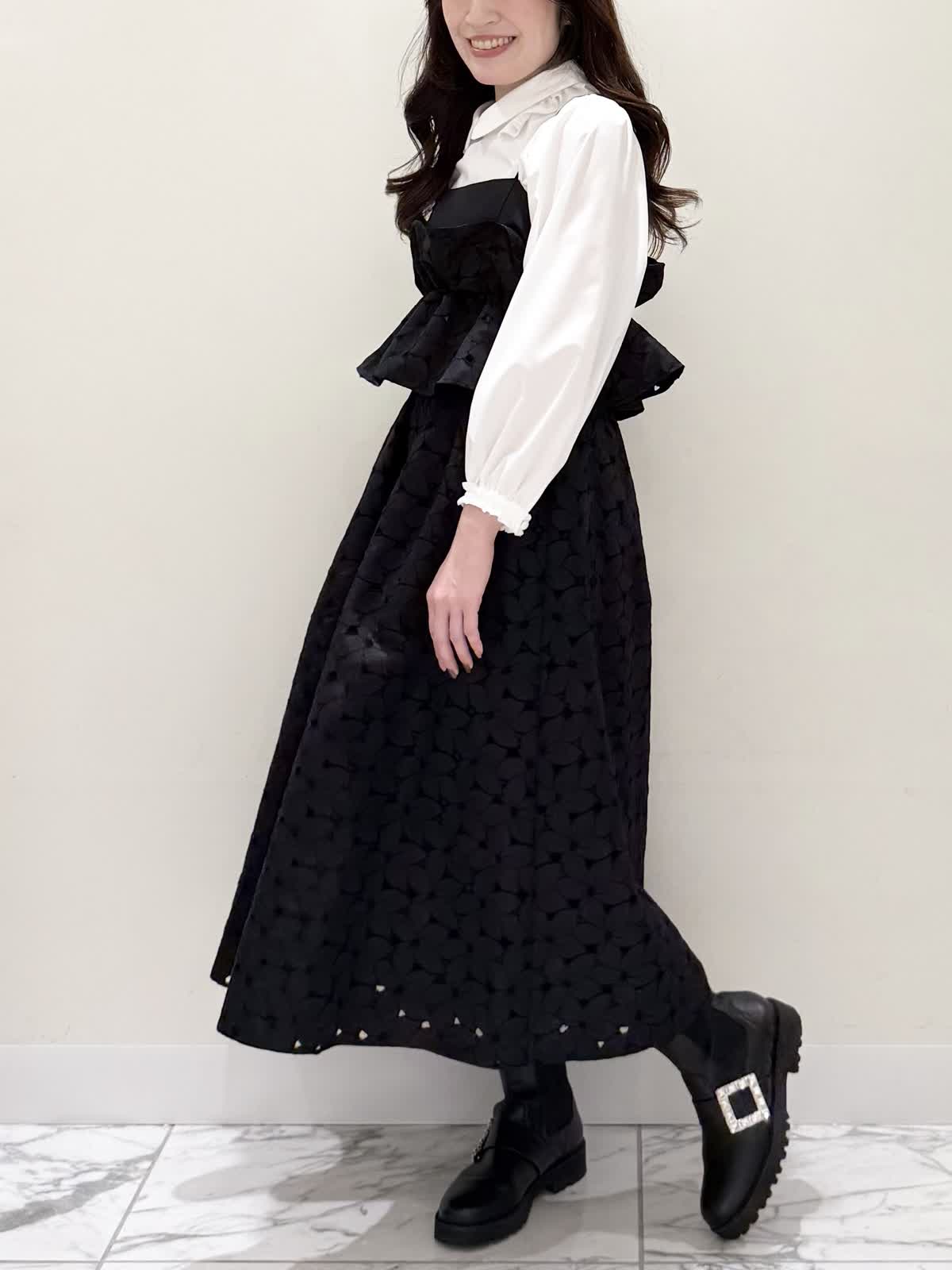 【着用サイズ/カラー】ビスチェ:9号/ブラック ブラウス:9号/オフホワイト スカート:7号/ブラック コート:7号/ブラック ブブーツ:24.0cm/ブラックワンピース風に見えるビスチェコーディネート♪程よいハリ感のあるブラックでも暗くなく着られるグログラン生地のツーピース。ビスチェは1サイズで紐が調節できたり、胸下にゴムが入っているので内側から調節できる仕様。インナーに衿フリルがポイントのブラウスを合わせました。サラサラとした袖通りが良く、シワになりにくい生地です。ビスチェと同生地のスカートはタック入りのふんわりシルエットが可愛いです。後ろゴム仕様で履き心地◎いつものサイズで大丈夫ですが、程よいゆとりが欲しい方は1サイズ大きめでも◯コートはコクーンシルエット。衿元がクルーネックなのでブラウスの衿を出して着ると可愛さUPです♪
