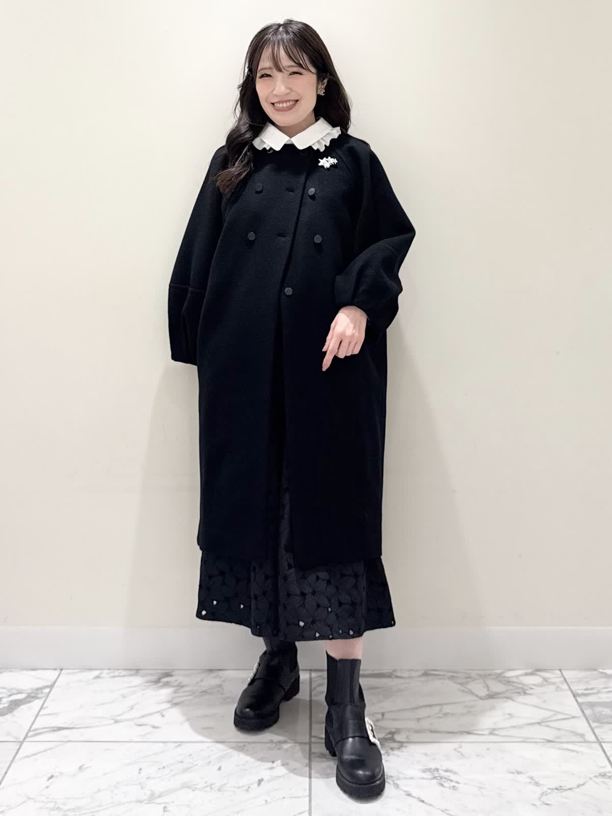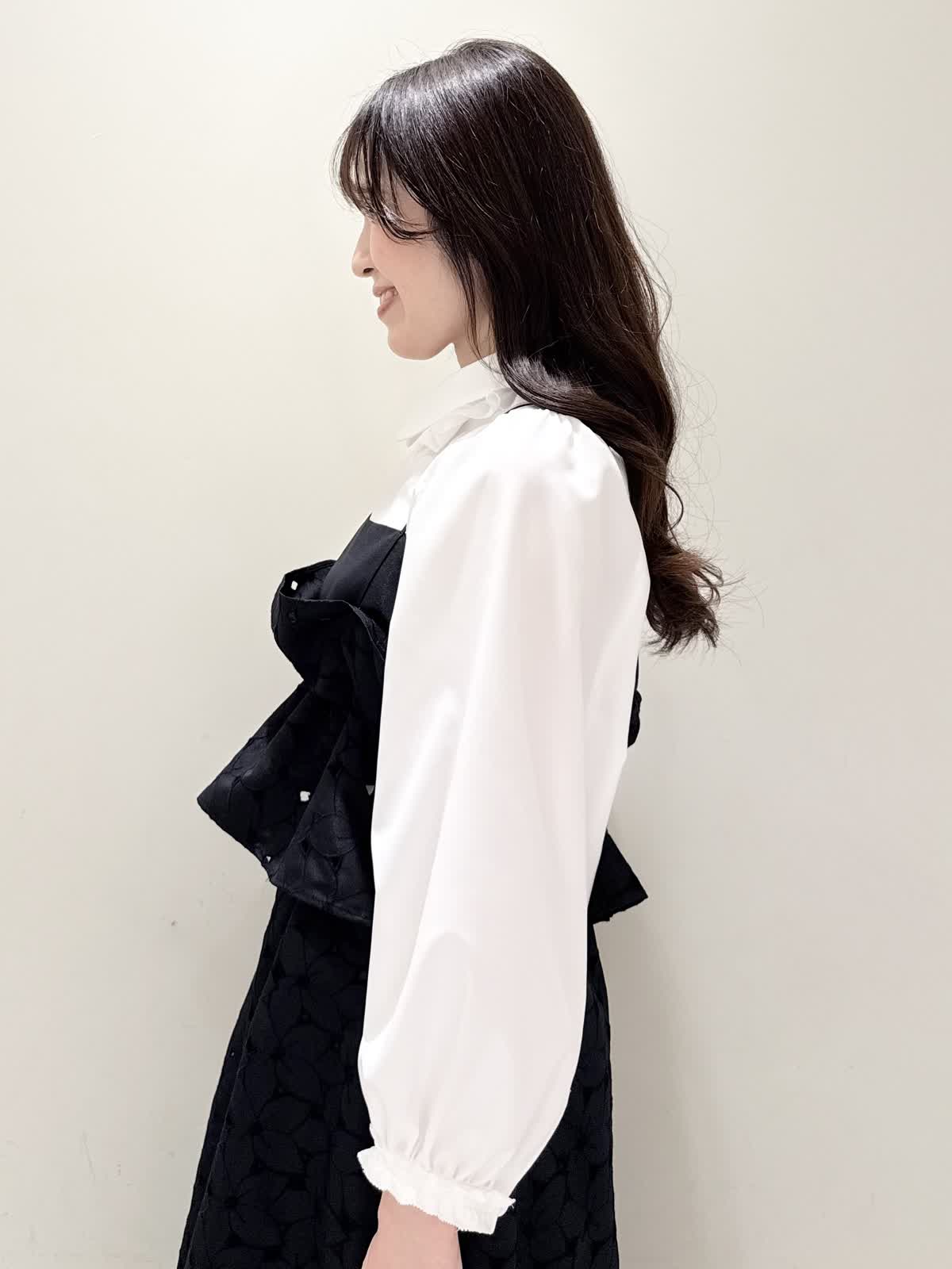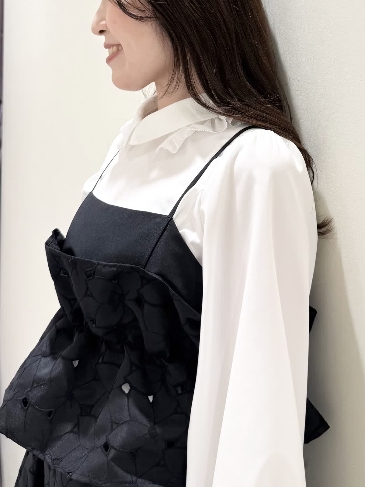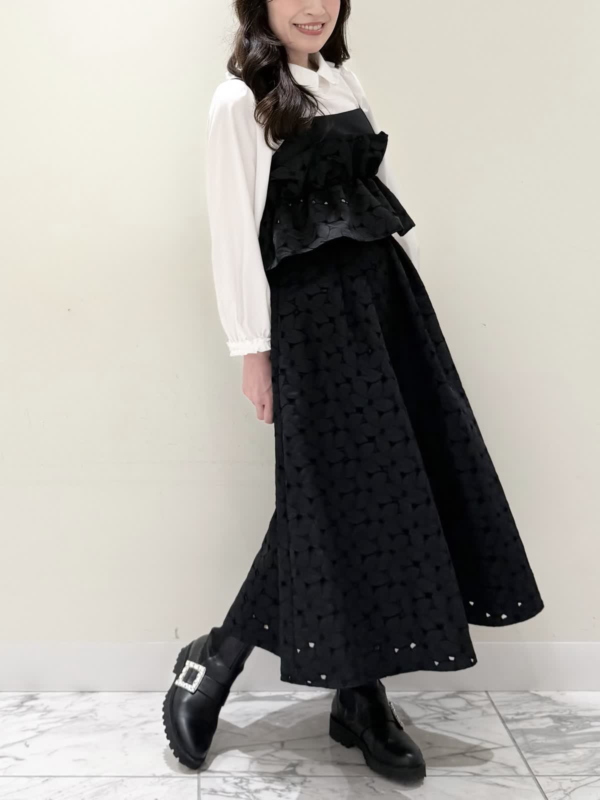 【着用サイズ/カラー】ビスチェ:9号/ブラック ブラウス:9号/オフホワイト スカート:7号/ブラック コート:7号/ブラック ブブーツ:24.0cm/ブラックワンピース風に見えるビスチェコーディネート♪程よいハリ感のあるブラックでも暗くなく着られるグログラン生地のツーピース。ビスチェは1サイズで紐が調節できたり、胸下にゴムが入っているので内側から調節できる仕様。インナーに衿フリルがポイントのブラウスを合わせました。サラサラとした袖通りが良く、シワになりにくい生地です。ビスチェと同生地のスカートはタック入りのふんわりシルエットが可愛いです。後ろゴム仕様で履き心地◎いつものサイズで大丈夫ですが、程よいゆとりが欲しい方は1サイズ大きめでも◯コートはコクーンシルエット。衿元がクルーネックなのでブラウスの衿を出して着ると可愛さUPです♪