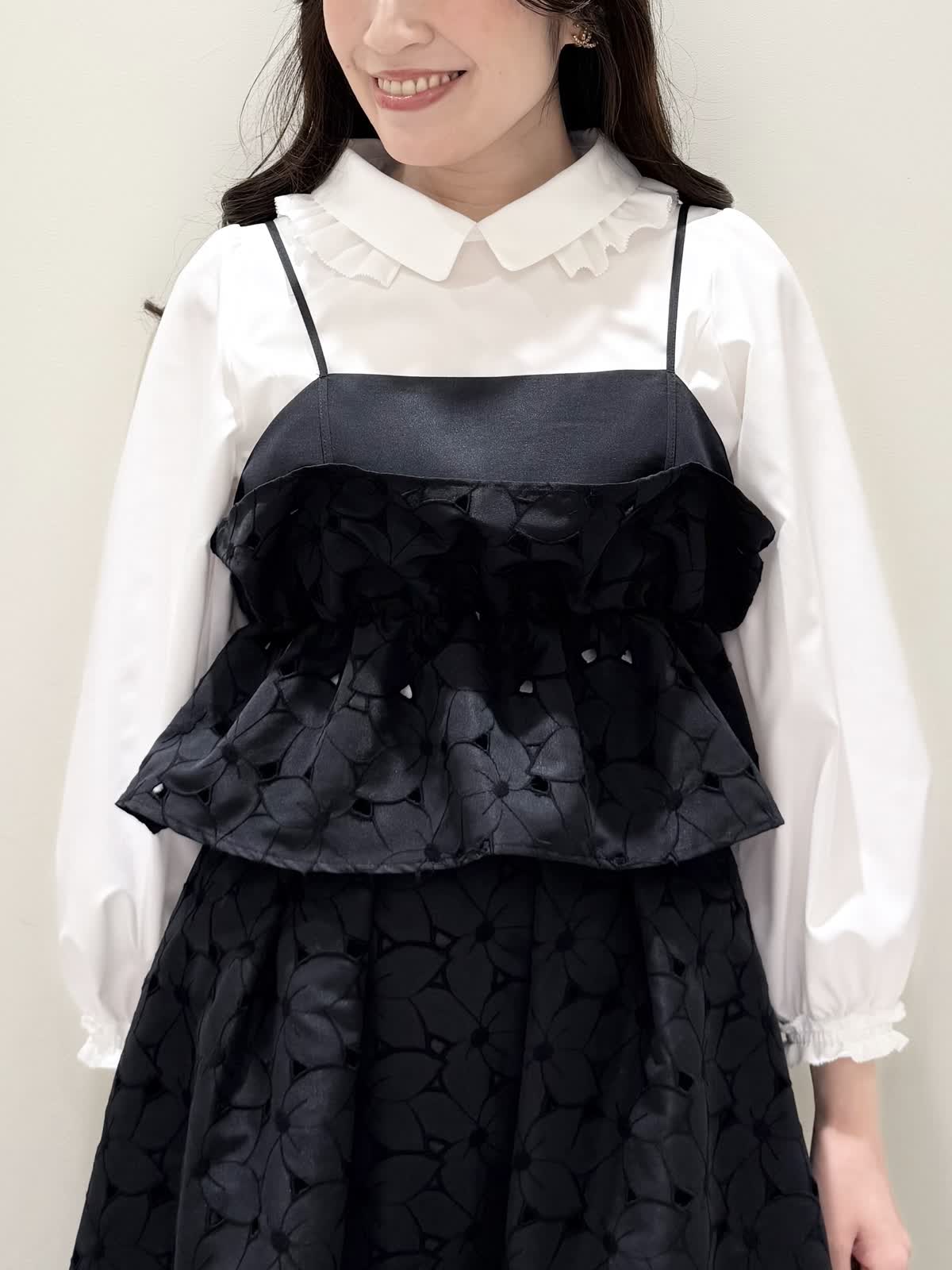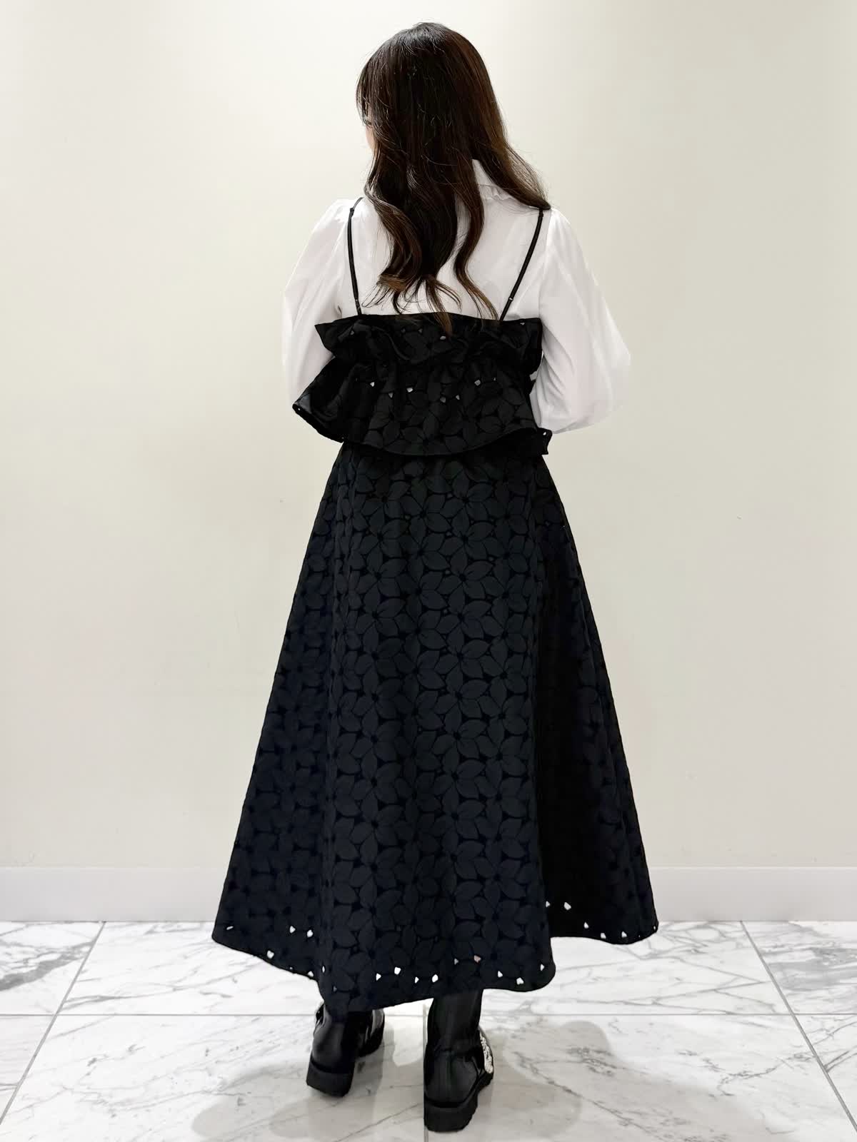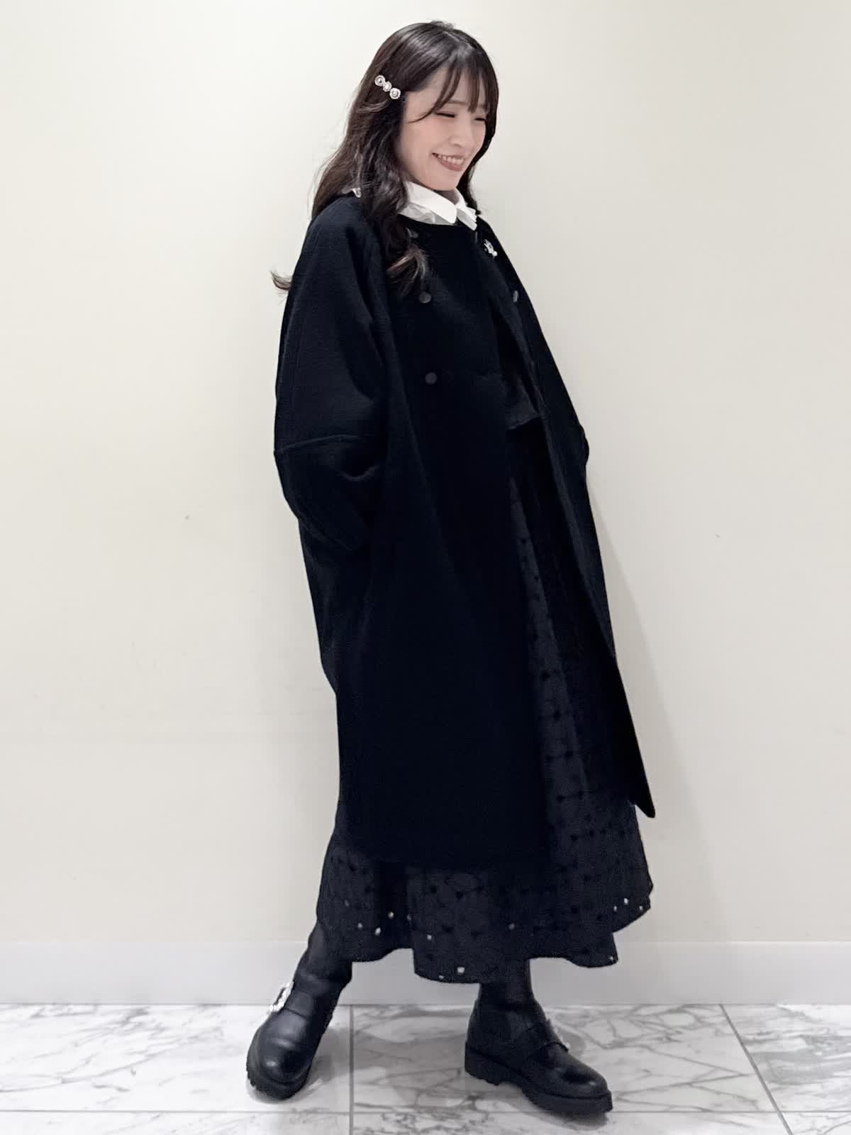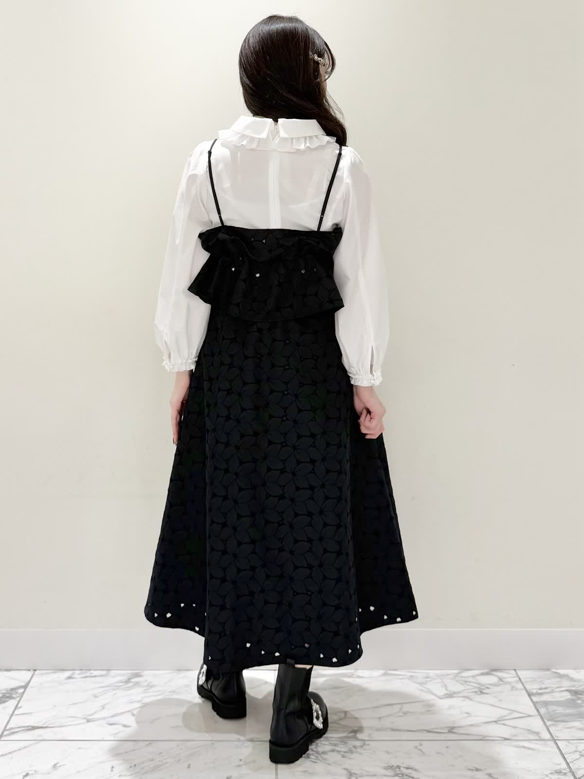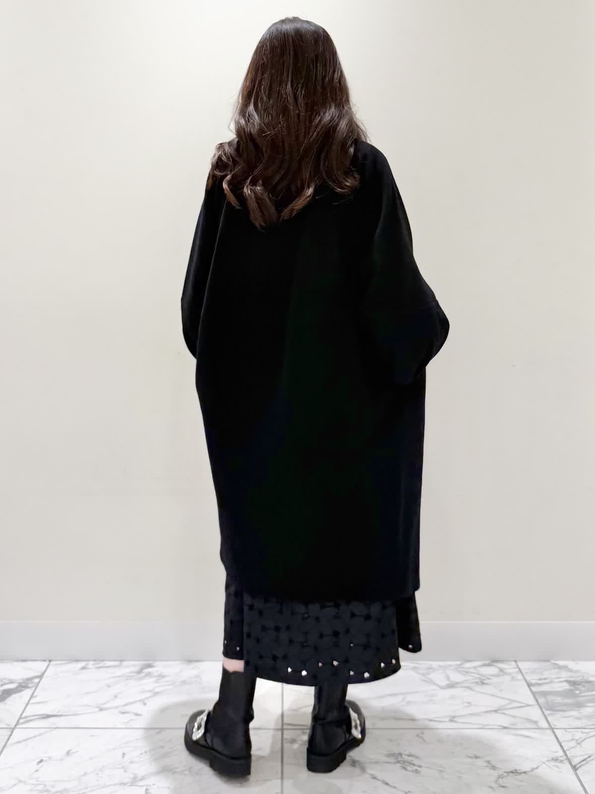 【着用サイズ/カラー】ビスチェ:9号/ブラック ブラウス:9号/オフホワイト スカート:7号/ブラック コート:7号/ブラック ブブーツ:24.0cm/ブラックワンピース風に見えるビスチェコーディネート♪程よいハリ感のあるブラックでも暗くなく着られるグログラン生地のツーピース。ビスチェは1サイズで紐が調節できたり、胸下にゴムが入っているので内側から調節できる仕様。インナーに衿フリルがポイントのブラウスを合わせました。サラサラとした袖通りが良く、シワになりにくい生地です。ビスチェと同生地のスカートはタック入りのふんわりシルエットが可愛いです。後ろゴム仕様で履き心地◎いつものサイズで大丈夫ですが、程よいゆとりが欲しい方は1サイズ大きめでも◯コートはコクーンシルエット。衿元がクルーネックなのでブラウスの衿を出して着ると可愛さUPです♪