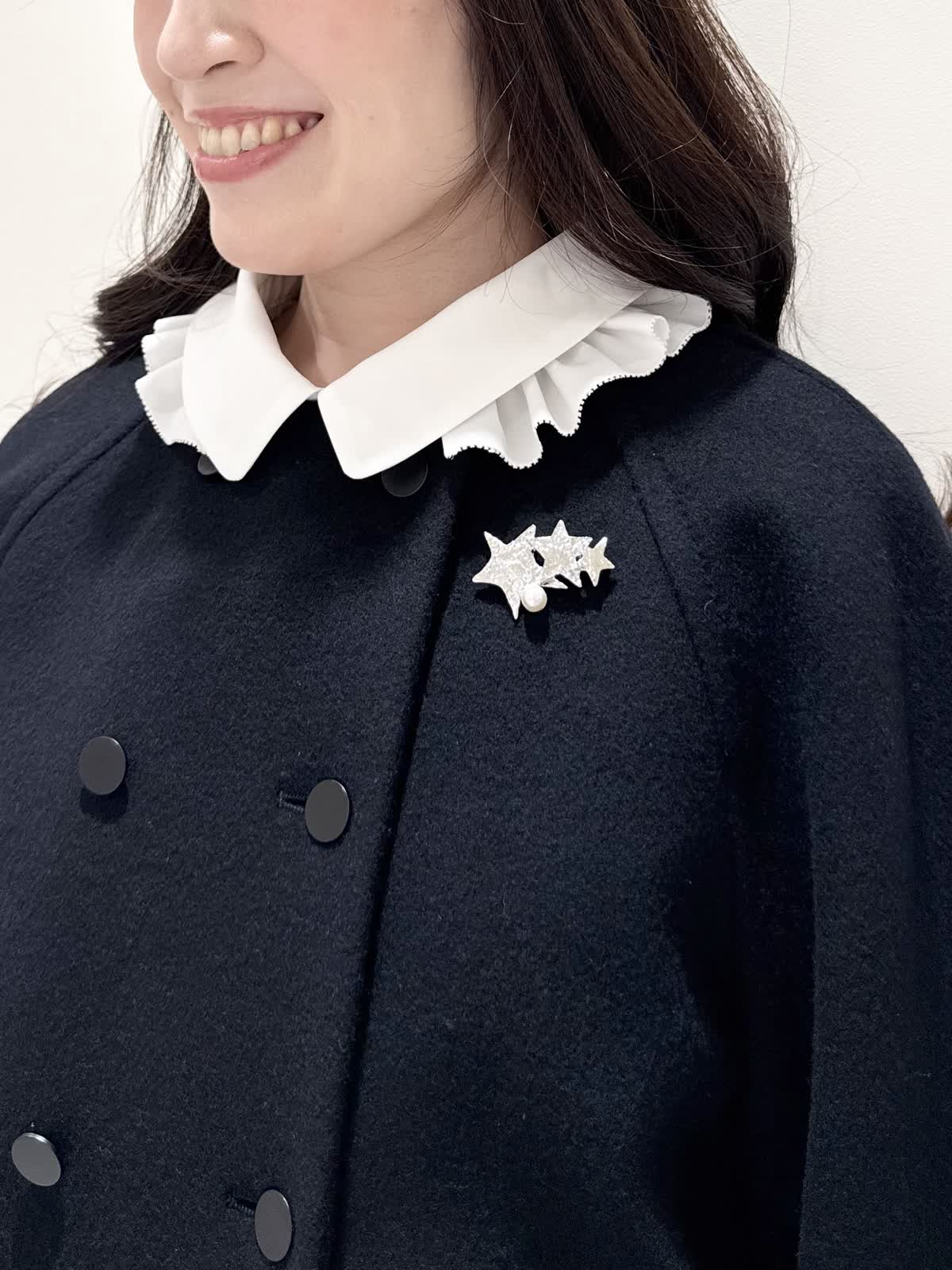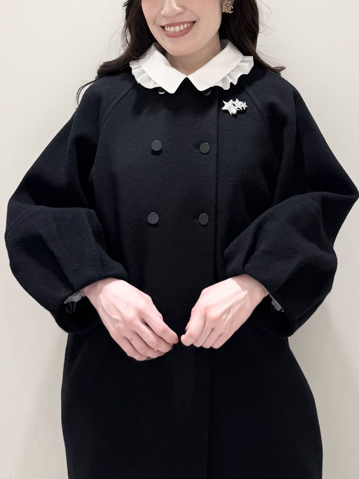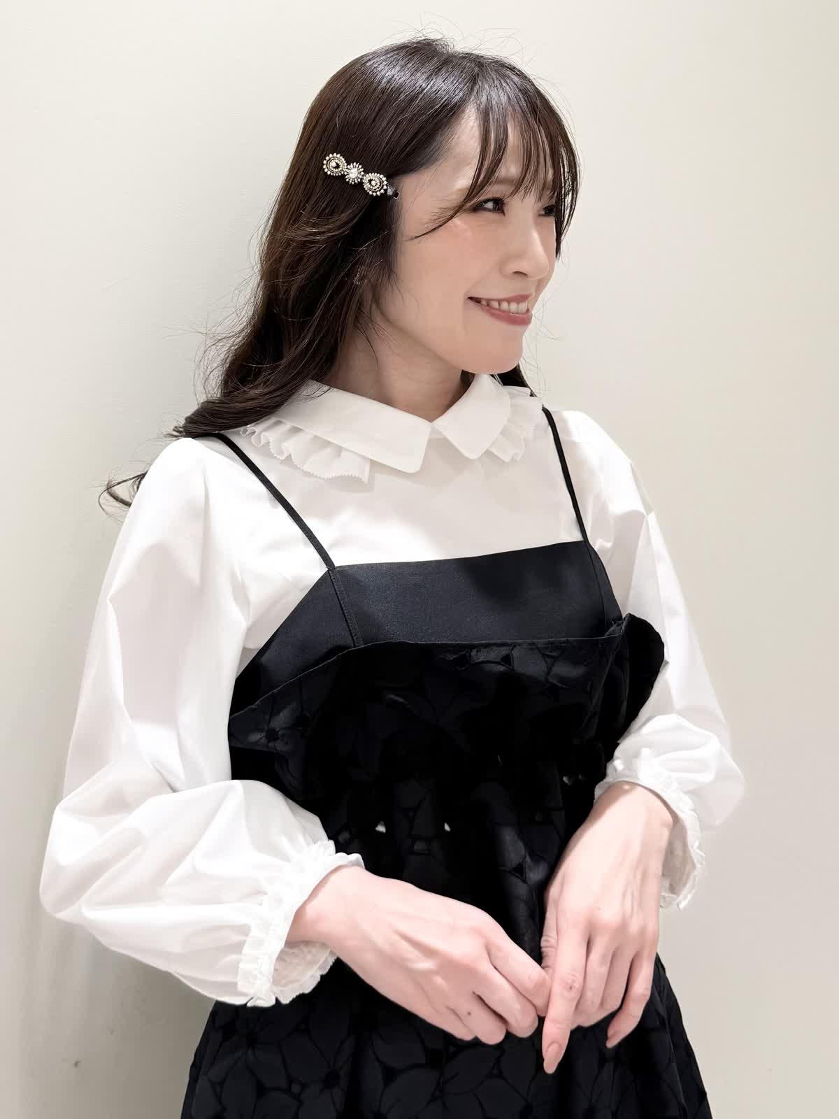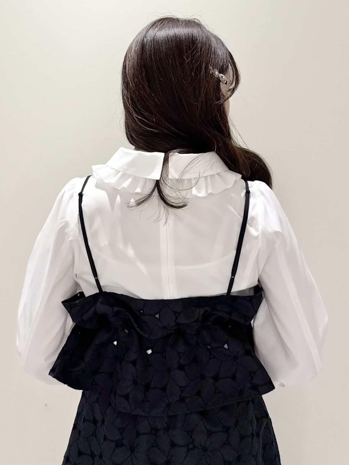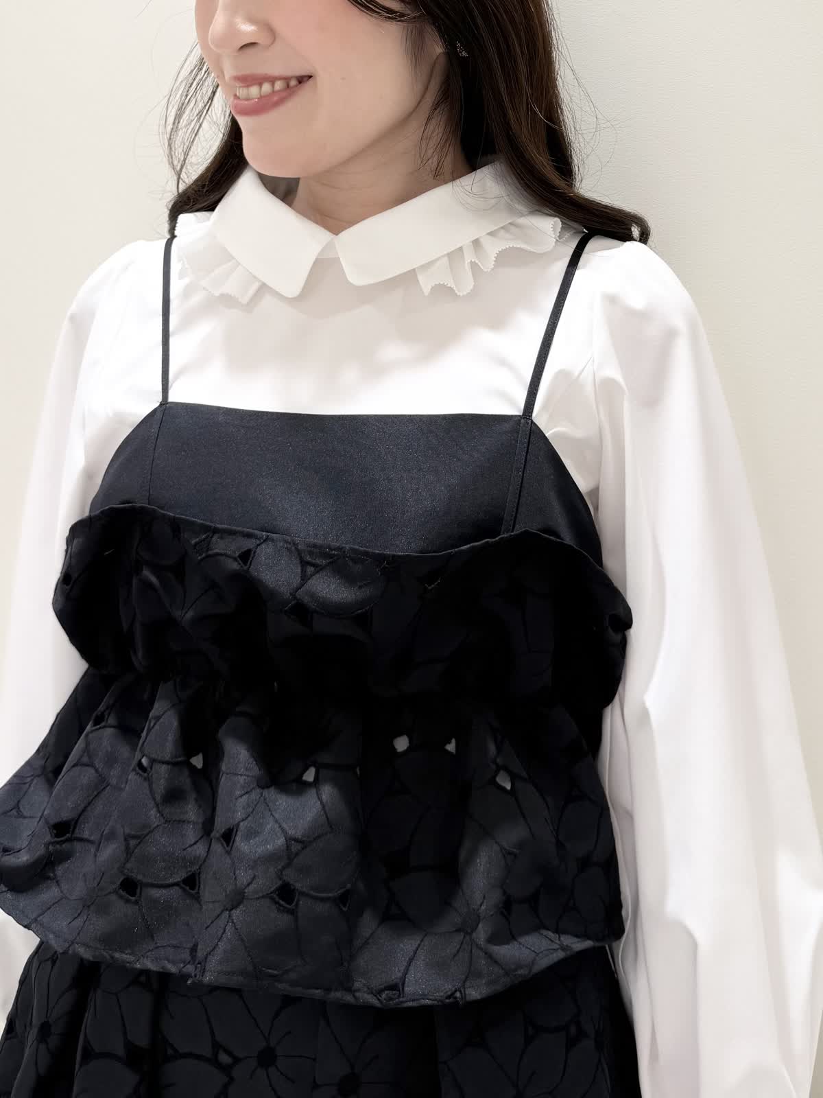 【着用サイズ/カラー】ビスチェ:9号/ブラック ブラウス:9号/オフホワイト スカート:7号/ブラック コート:7号/ブラック ブブーツ:24.0cm/ブラックワンピース風に見えるビスチェコーディネート♪程よいハリ感のあるブラックでも暗くなく着られるグログラン生地のツーピース。ビスチェは1サイズで紐が調節できたり、胸下にゴムが入っているので内側から調節できる仕様。インナーに衿フリルがポイントのブラウスを合わせました。サラサラとした袖通りが良く、シワになりにくい生地です。ビスチェと同生地のスカートはタック入りのふんわりシルエットが可愛いです。後ろゴム仕様で履き心地◎いつものサイズで大丈夫ですが、程よいゆとりが欲しい方は1サイズ大きめでも◯コートはコクーンシルエット。衿元がクルーネックなのでブラウスの衿を出して着ると可愛さUPです♪