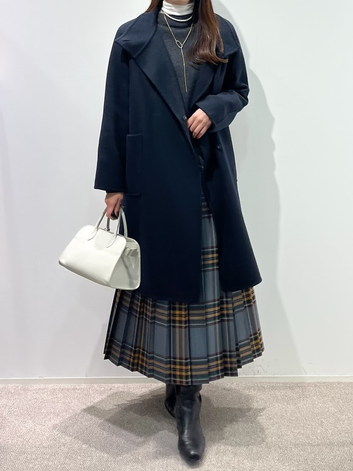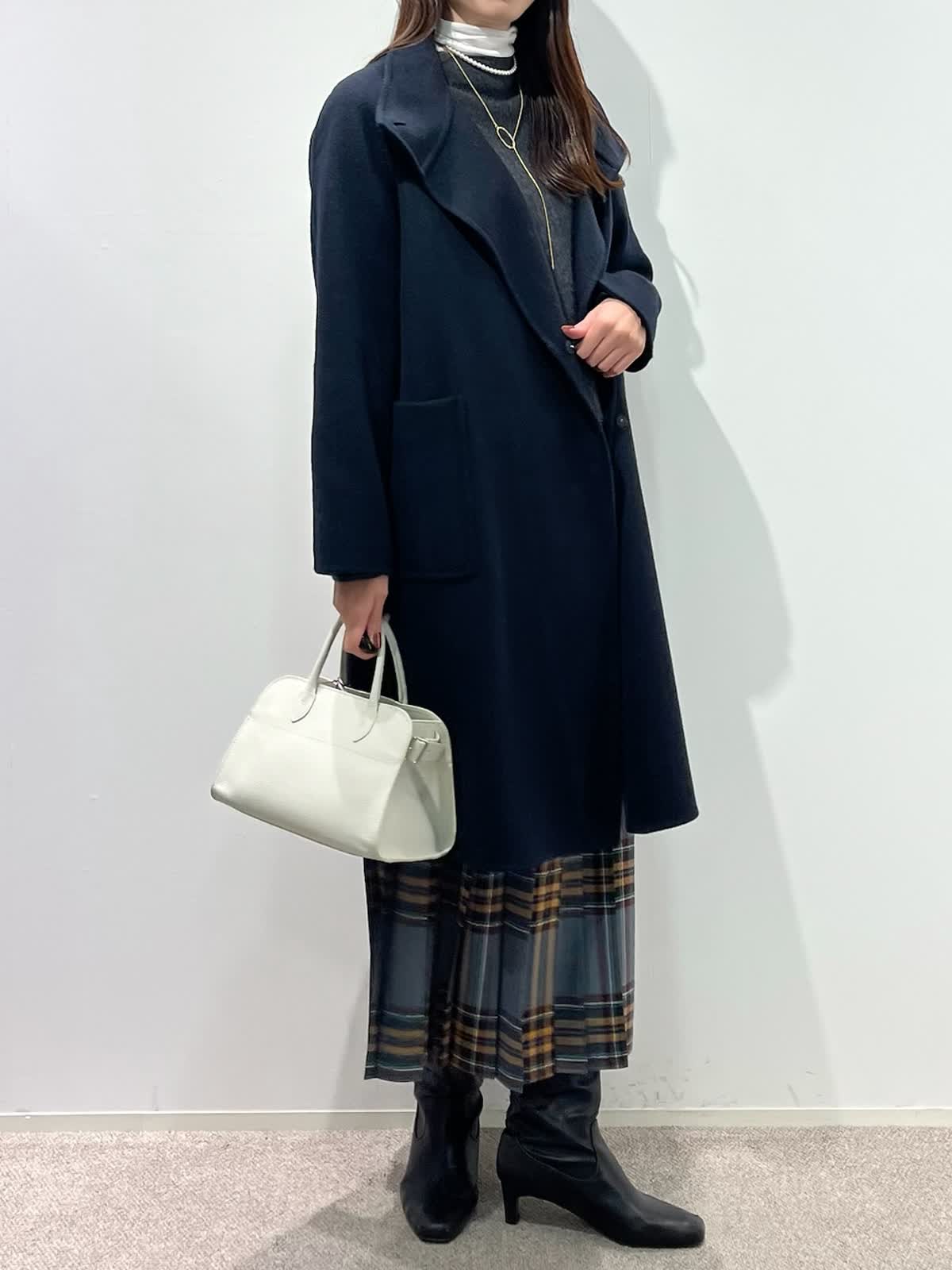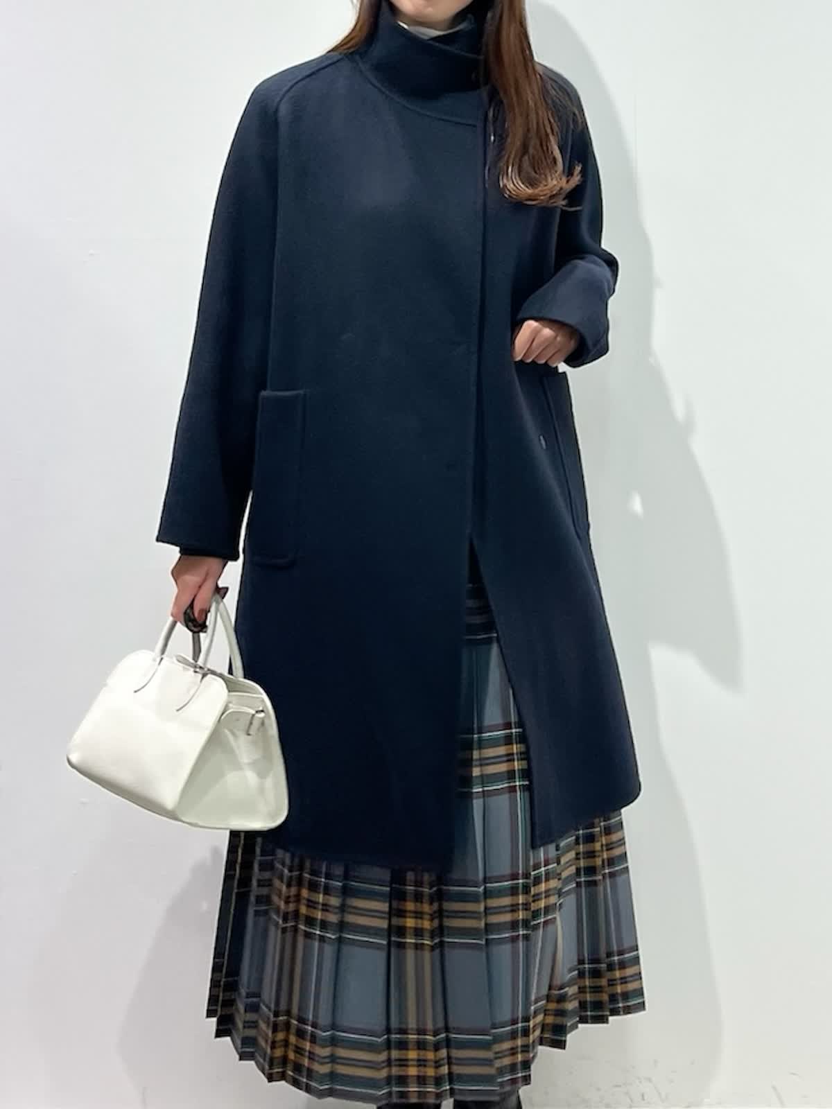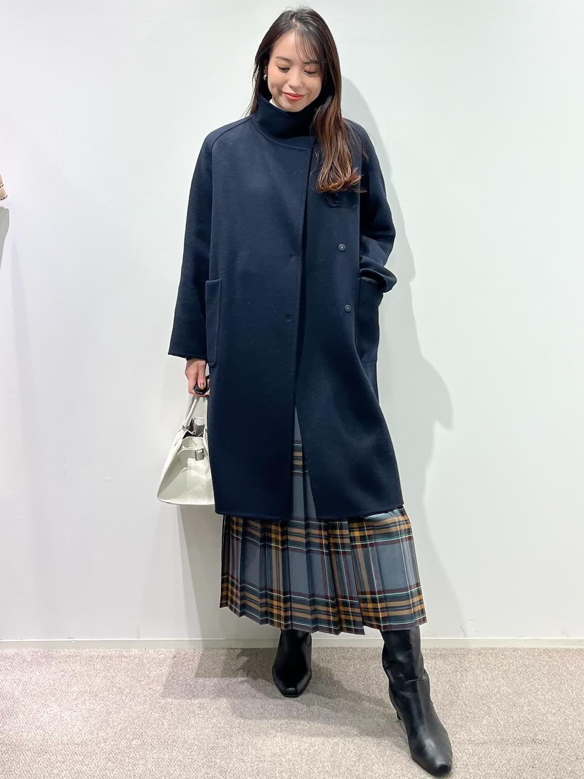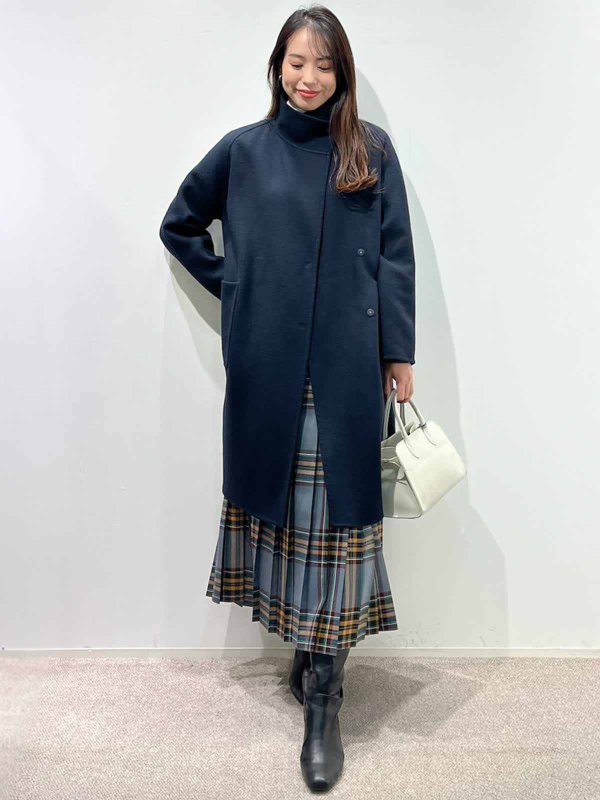 【着用サイズ】コート:9号 ニット:9号 カットソー:9号 スカート:9号 【着用カラー】コート:ネイビー ニット:チャコールグレー カットソー:オフホワイト スカート:ブルーグレー バッグ:グレー 「上品ネイビーコートで映える冬のクラシックお出かけコーデ」 スタンドカラーのコートは、リバー仕立てで、とても軽くてあたたかい素材が魅力。ハンドステッチがアクセントで、衿元は2WAYタイプで着こなしの印象が変わるデザイン。袖と背中部分に裏地が付いているので、袖通りの良さと、摩擦が起きづらく、着崩れしないのもポイント。スタイリングは、モックネックニットとシアータートルのレイヤードスタイル。クラシカルなチェックスカートを合わせた、年末年始の帰省や冬のイベントにぴったりなお出かけコーデの完成。