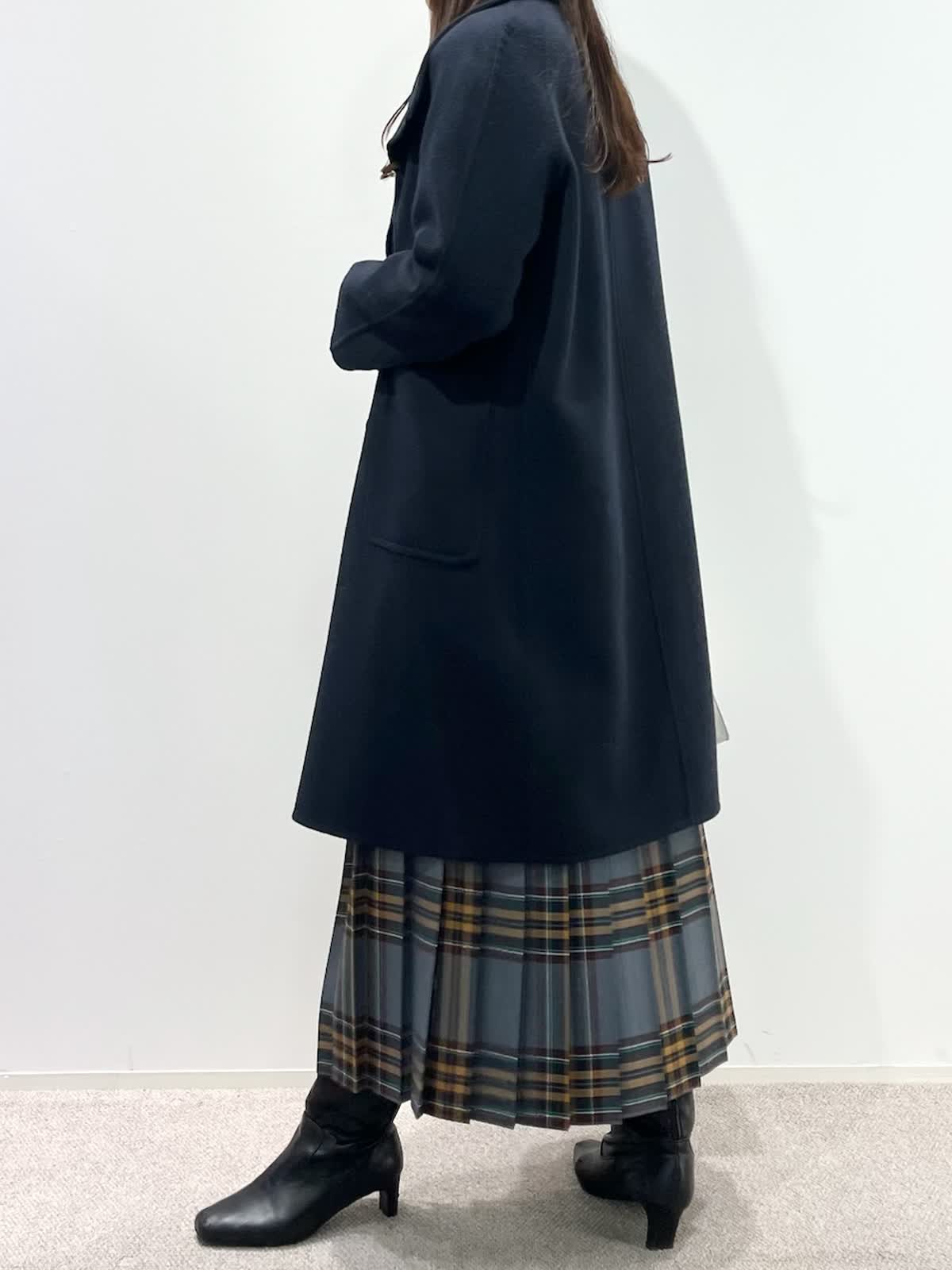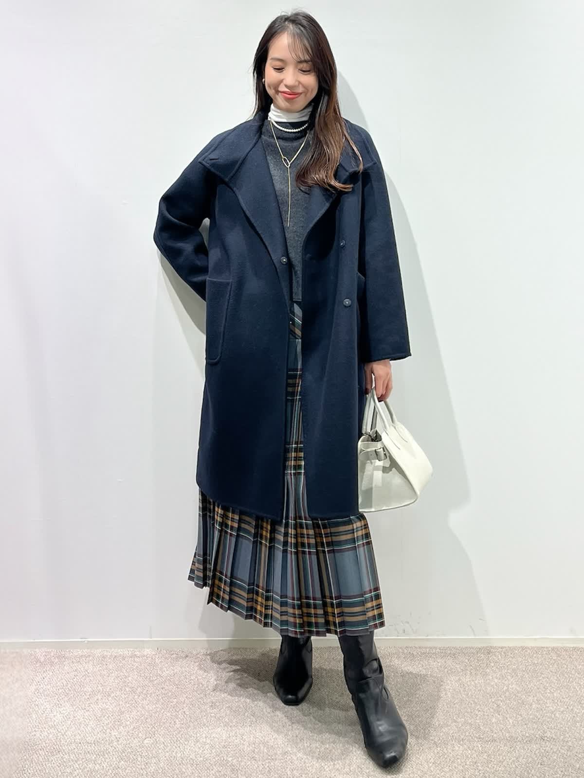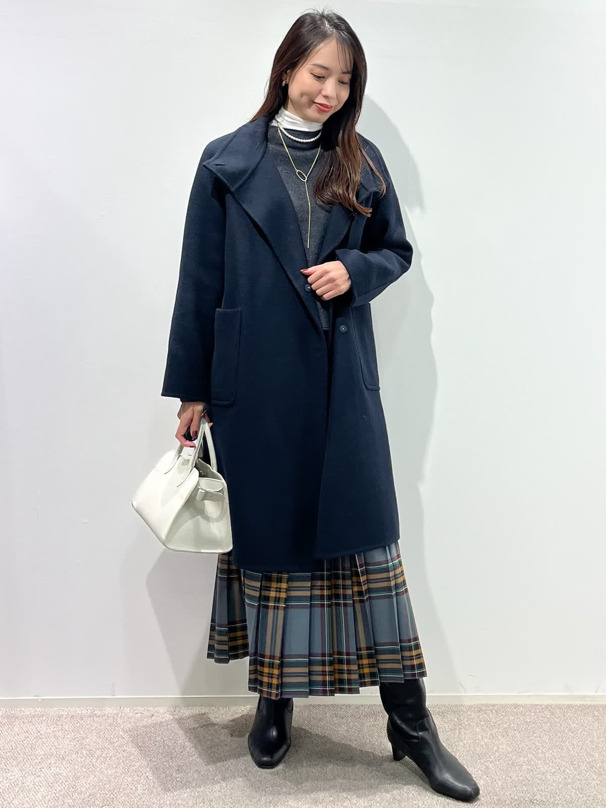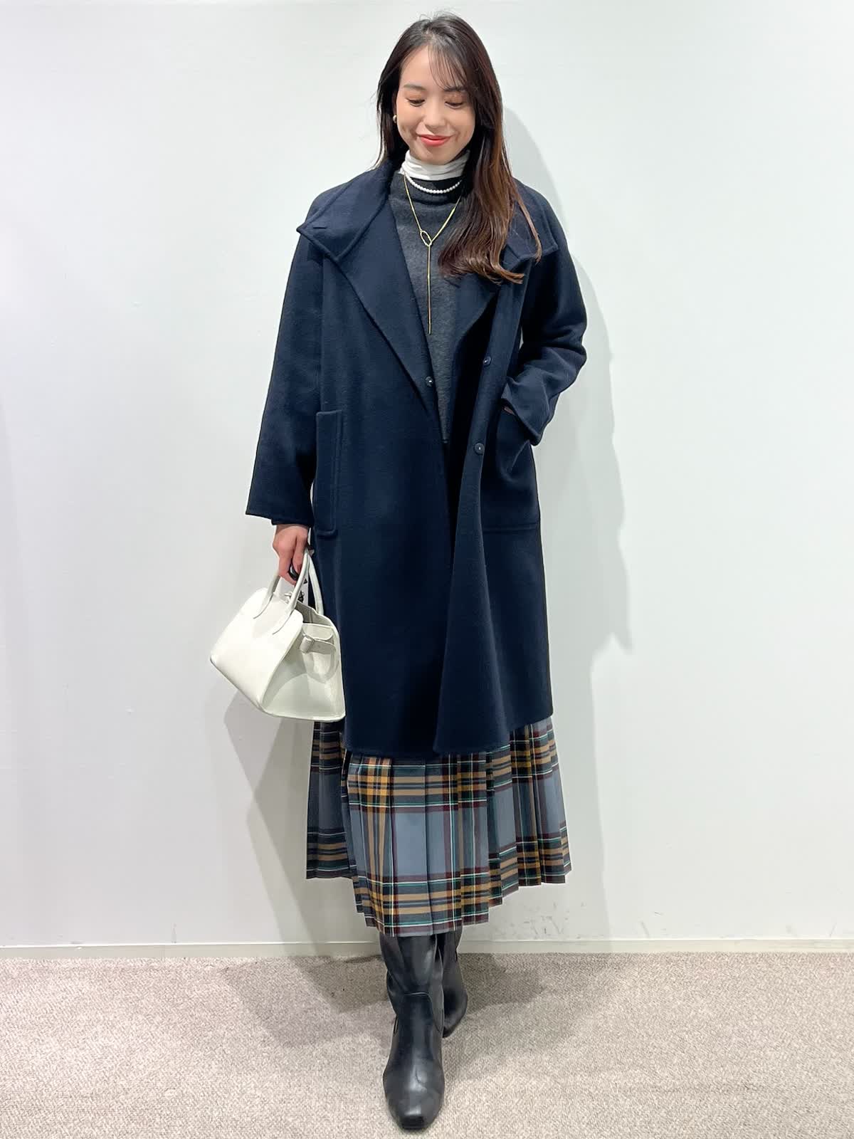 【着用サイズ】コート:9号 ニット:9号 カットソー:9号 スカート:9号 【着用カラー】コート:ネイビー ニット:チャコールグレー カットソー:オフホワイト スカート:ブルーグレー バッグ:グレー 「上品ネイビーコートで映える冬のクラシックお出かけコーデ」 スタンドカラーのコートは、リバー仕立てで、とても軽くてあたたかい素材が魅力。ハンドステッチがアクセントで、衿元は2WAYタイプで着こなしの印象が変わるデザイン。袖と背中部分に裏地が付いているので、袖通りの良さと、摩擦が起きづらく、着崩れしないのもポイント。スタイリングは、モックネックニットとシアータートルのレイヤードスタイル。クラシカルなチェックスカートを合わせた、年末年始の帰省や冬のイベントにぴったりなお出かけコーデの完成。
