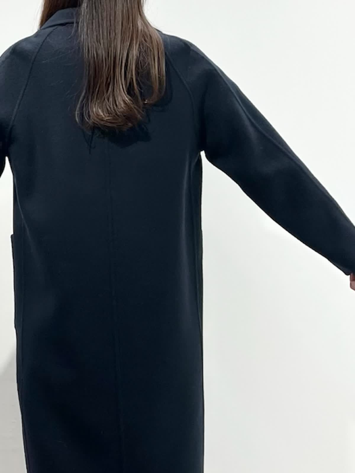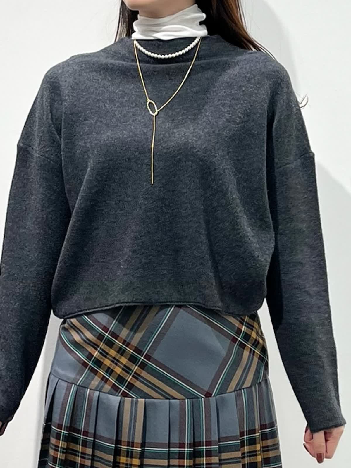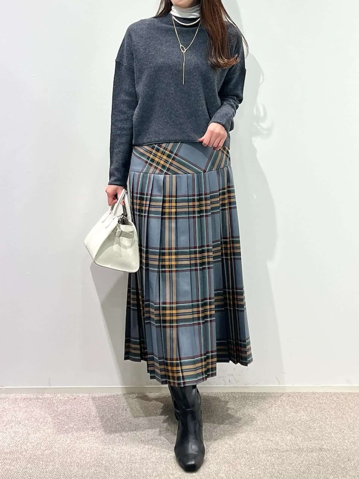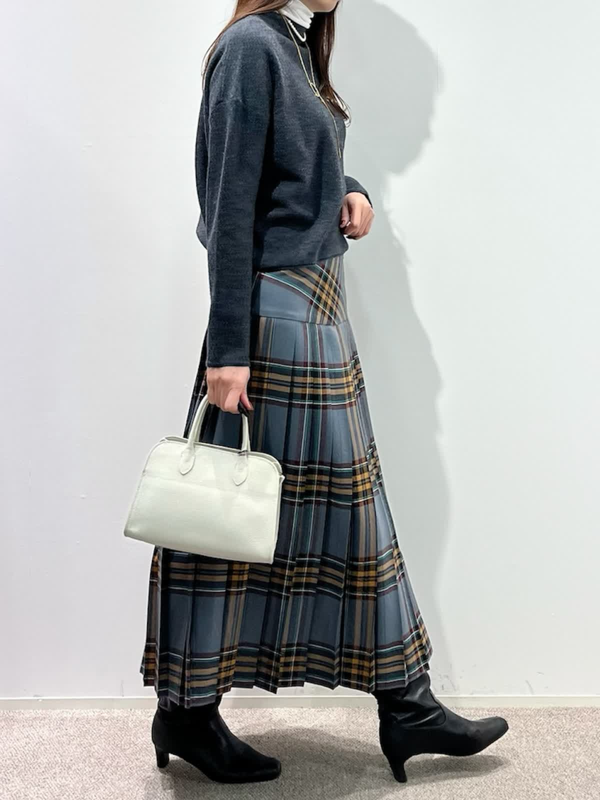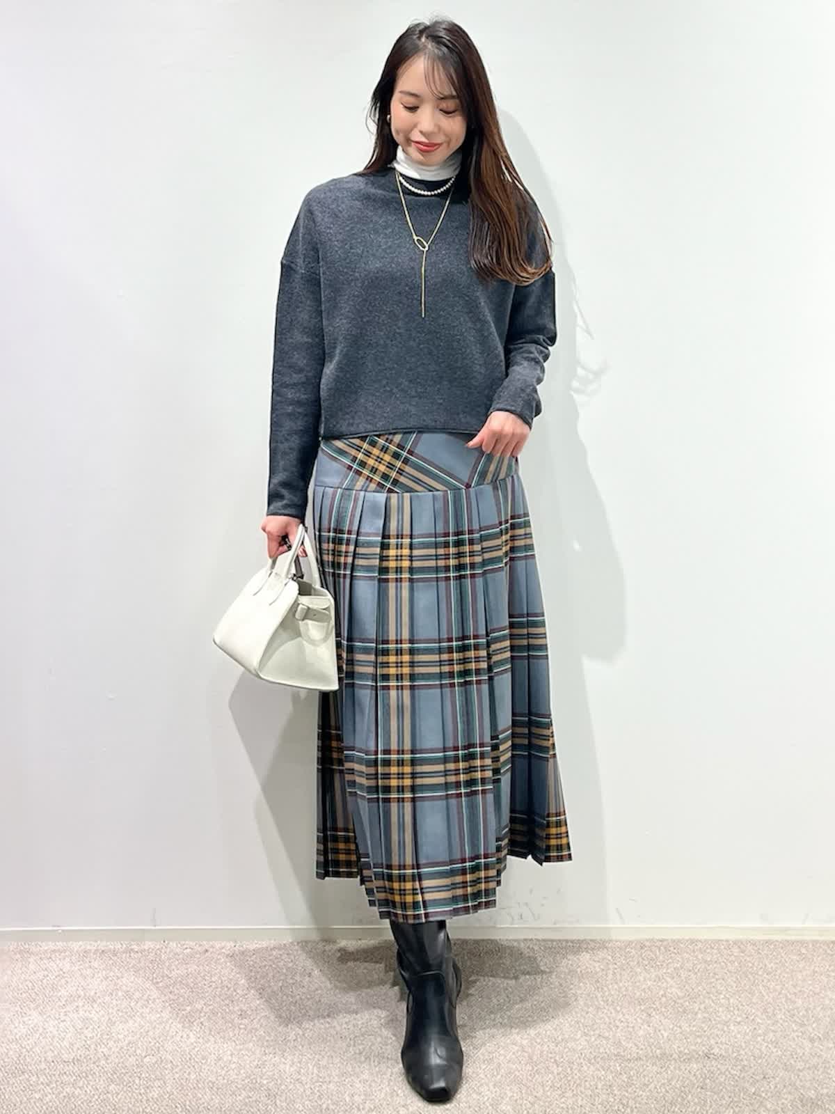 【着用サイズ】コート:9号 ニット:9号 カットソー:9号 スカート:9号 【着用カラー】コート:ネイビー ニット:チャコールグレー カットソー:オフホワイト スカート:ブルーグレー バッグ:グレー 「上品ネイビーコートで映える冬のクラシックお出かけコーデ」 スタンドカラーのコートは、リバー仕立てで、とても軽くてあたたかい素材が魅力。ハンドステッチがアクセントで、衿元は2WAYタイプで着こなしの印象が変わるデザイン。袖と背中部分に裏地が付いているので、袖通りの良さと、摩擦が起きづらく、着崩れしないのもポイント。スタイリングは、モックネックニットとシアータートルのレイヤードスタイル。クラシカルなチェックスカートを合わせた、年末年始の帰省や冬のイベントにぴったりなお出かけコーデの完成。